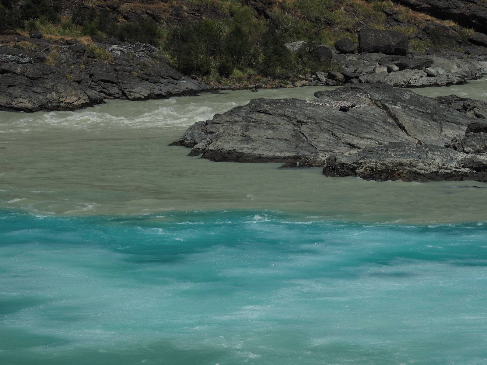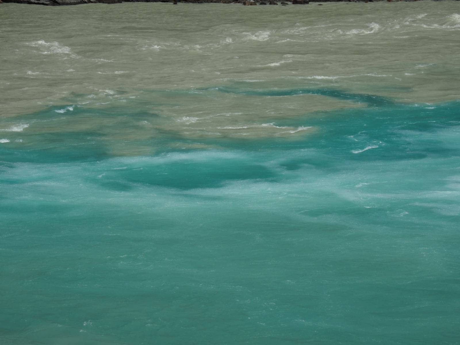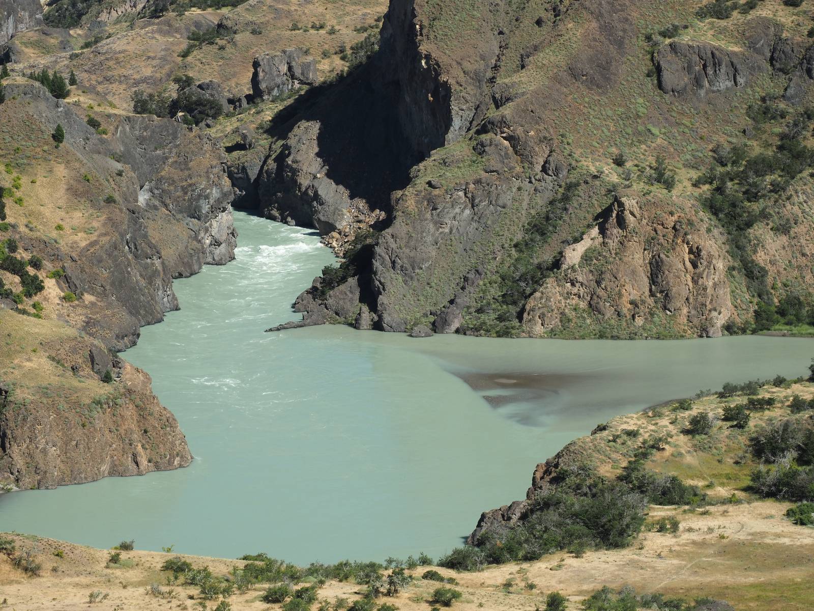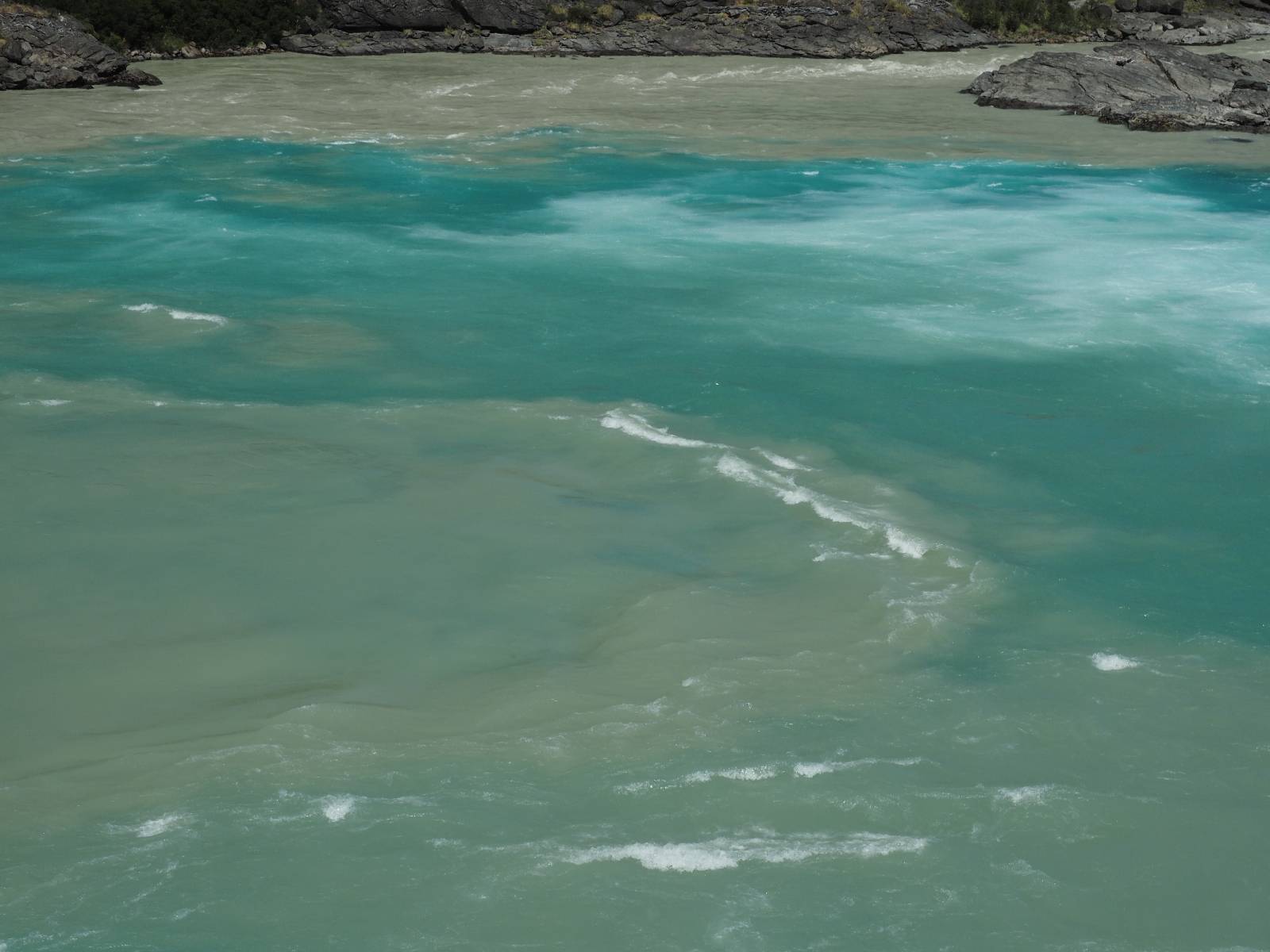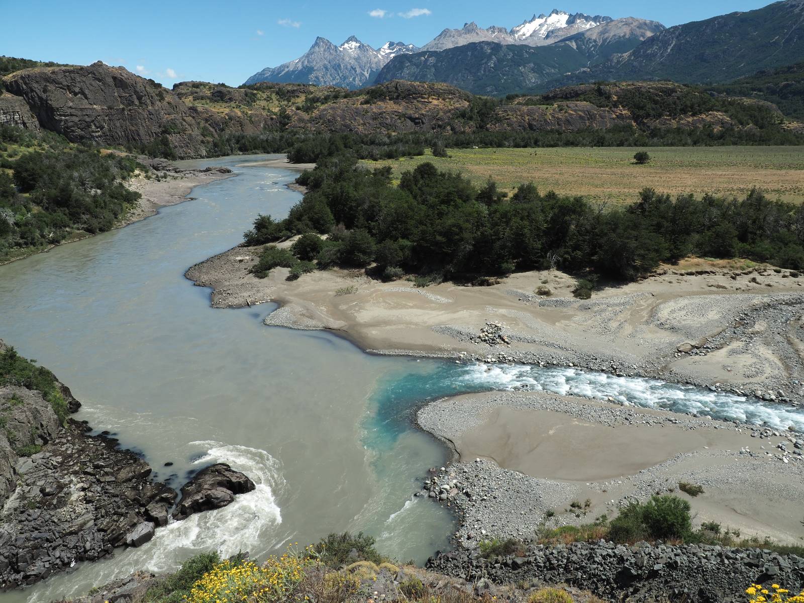 Allerdings nur, vielleicht einen Kilometer, zwei? Die nächste Aussicht auf die nächste viel größere Confluencia. Ein weiterer Zusammenfluß von zwei Flüssen und wieder von unterschiedlicher Farbe. Hier nicht so rauschend aber über eine größere Fläche im Tal verteilt und wunderschön anzusehen, wie sich die Farben in einer Art kleinem Delta mischen und das Grün und die Berge ihren Kontrast dazu geben. Eine schöne Steigerung zur ersten und es ärgert mich sehr, daß ich nicht mal drüber fliegen kann und mir das ganze von oben ansehen kann. Das wäre sicher spektakulär!!