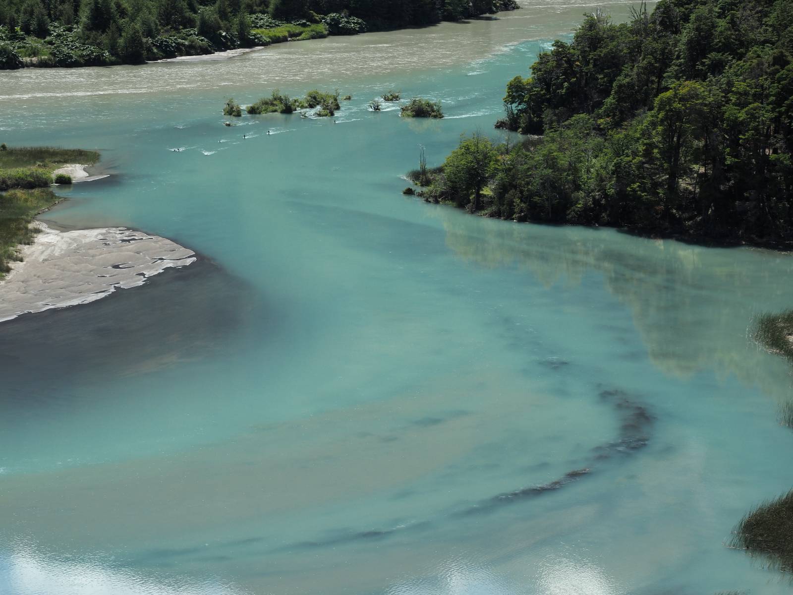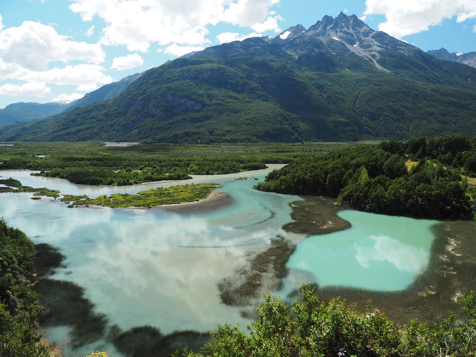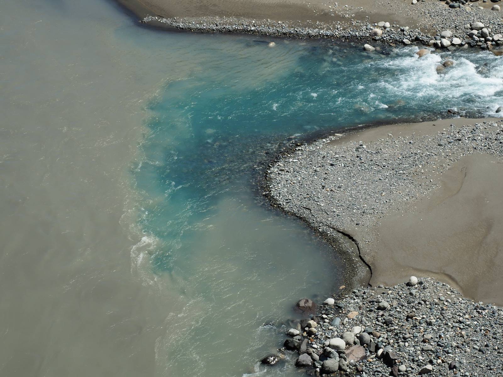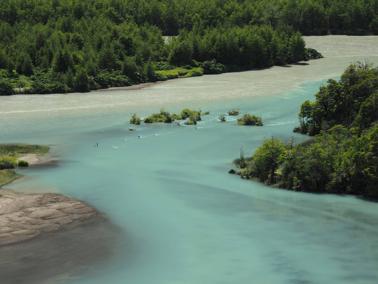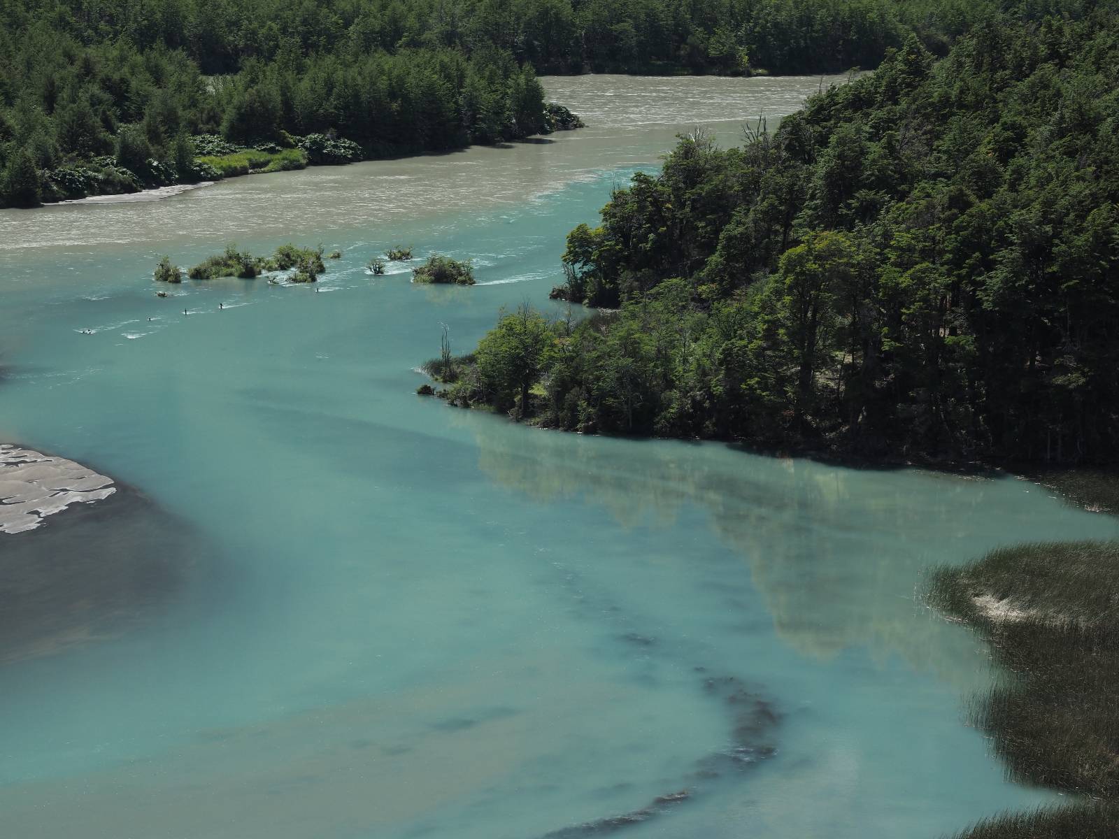 Allerdings nur, vielleicht einen Kilometer, zwei? Die nächste Aussicht auf die nächste viel größere Confluencia. Ein weiterer Zusammenfluß von zwei Flüssen und wieder von unterschiedlicher Farbe. Hier nicht so rauschend aber über eine größere Fläche im Tal verteilt und wunderschön anzusehen, wie sich die Farben in einer Art kleinem Delta mischen und das Grün und die Berge ihren Kontrast dazu geben. Eine schöne Steigerung zur ersten und es ärgert mich sehr, daß ich nicht mal drüber fliegen kann und mir das ganze von oben ansehen kann. Das wäre sicher spektakulär!!