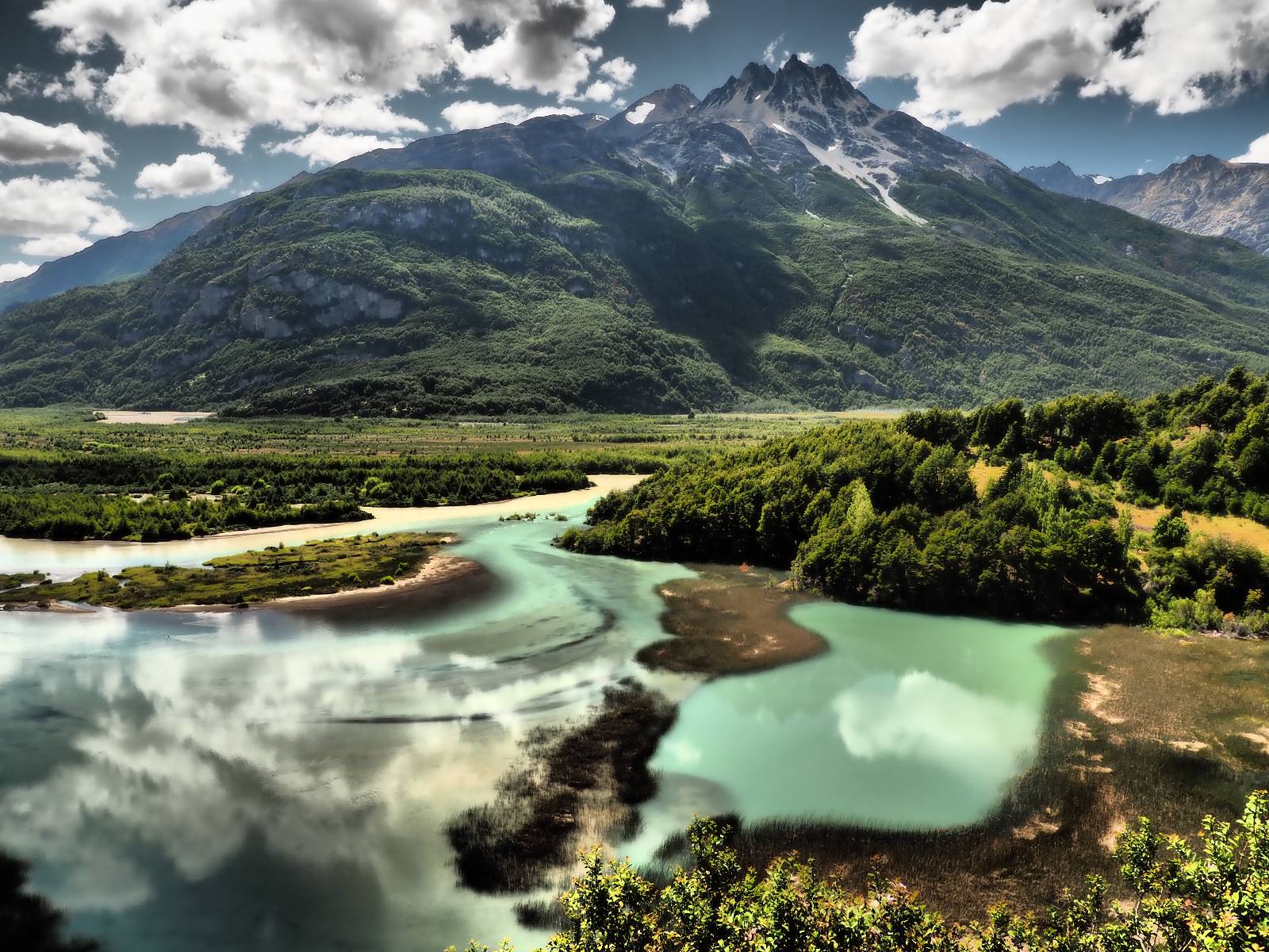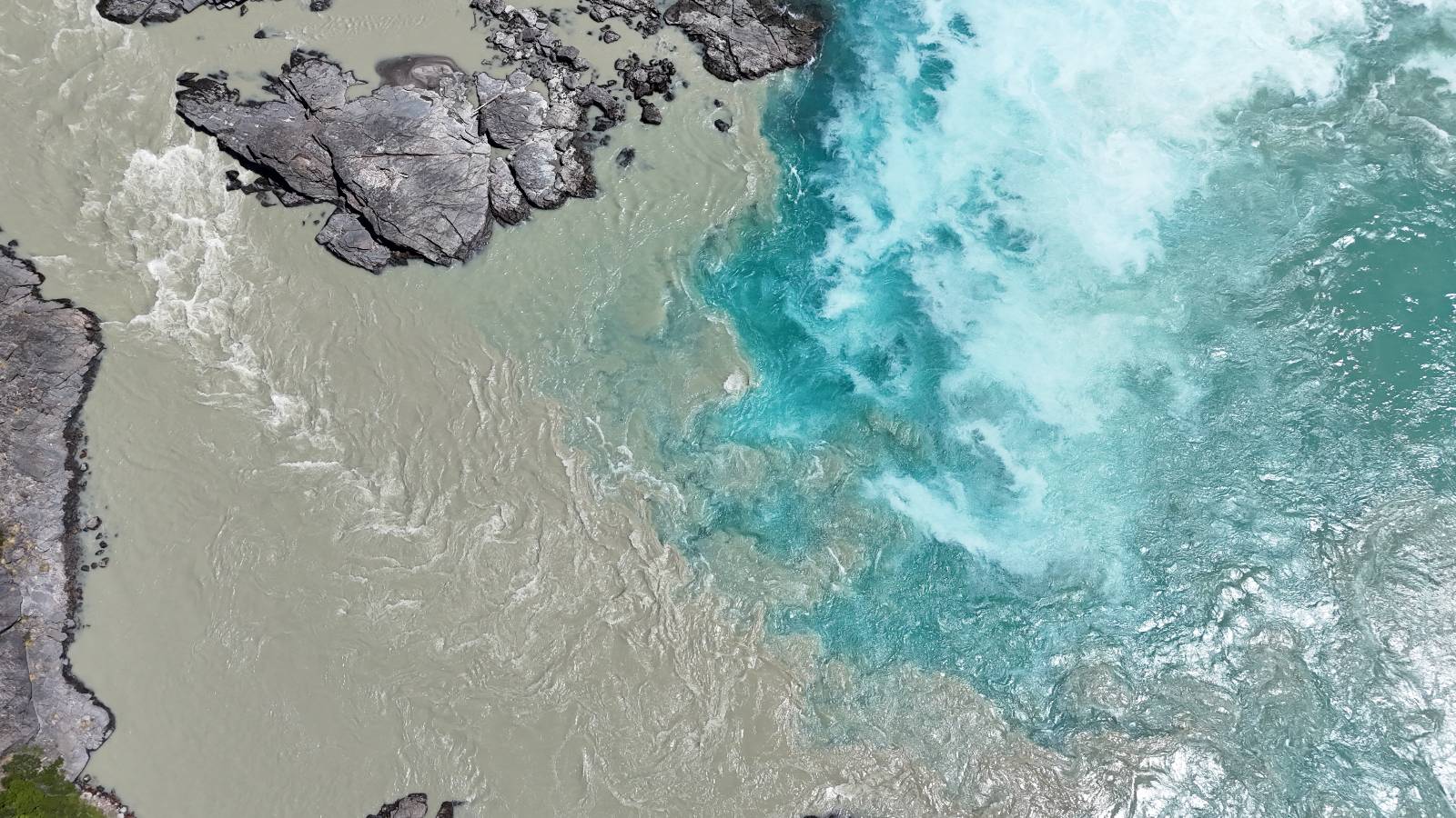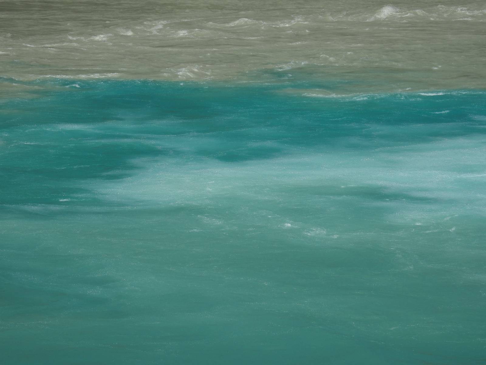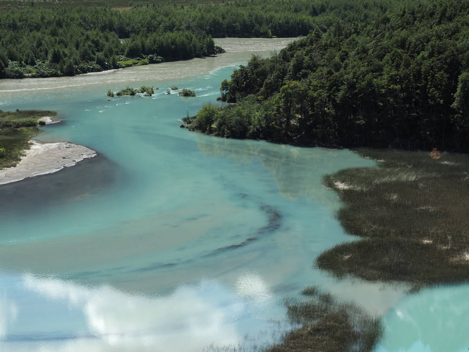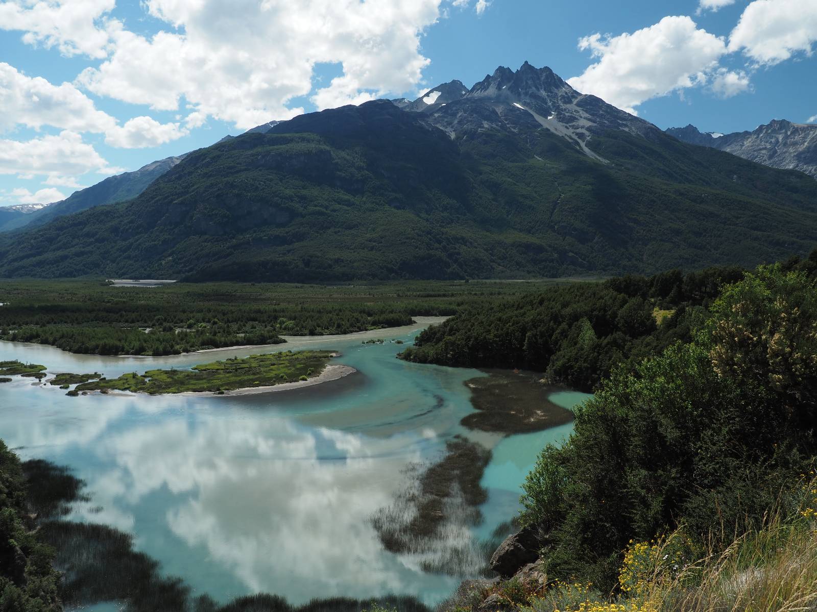 Allerdings nur, vielleicht einen Kilometer, zwei? Die nächste Aussicht auf die nächste viel größere Confluencia. Ein weiterer Zusammenfluß von zwei Flüssen und wieder von unterschiedlicher Farbe. Hier nicht so rauschend aber über eine größere Fläche im Tal verteilt und wunderschön anzusehen, wie sich die Farben in einer Art kleinem Delta mischen und das Grün und die Berge ihren Kontrast dazu geben. Eine schöne Steigerung zur ersten und es ärgert mich sehr, daß ich nicht mal drüber fliegen kann und mir das ganze von oben ansehen kann. Das wäre sicher spektakulär!!