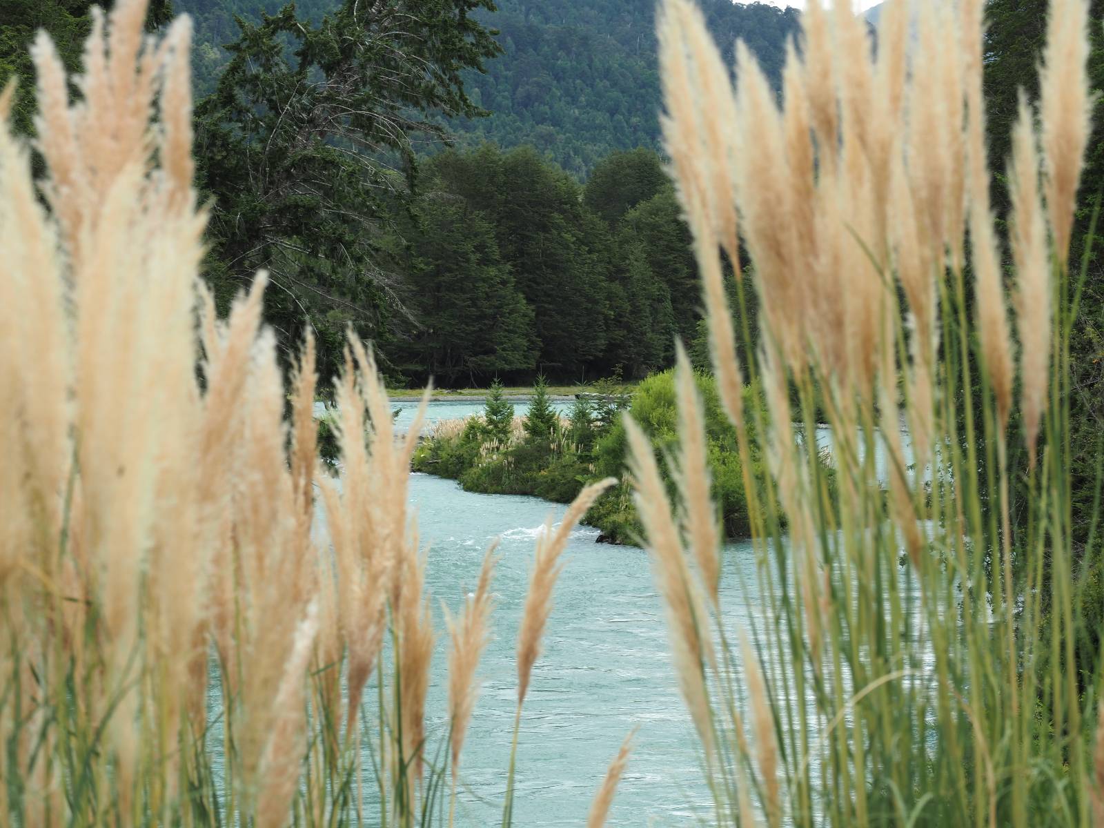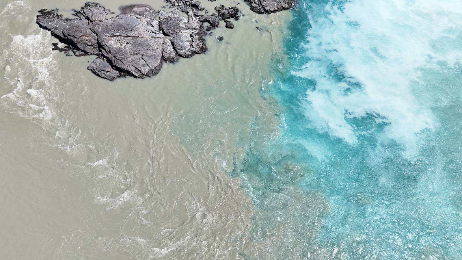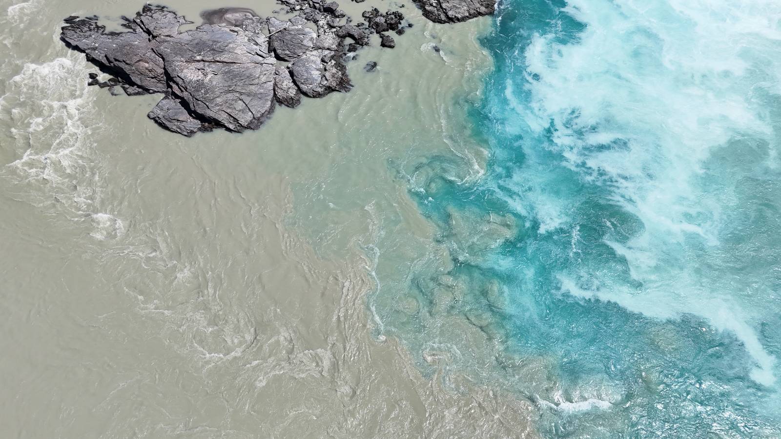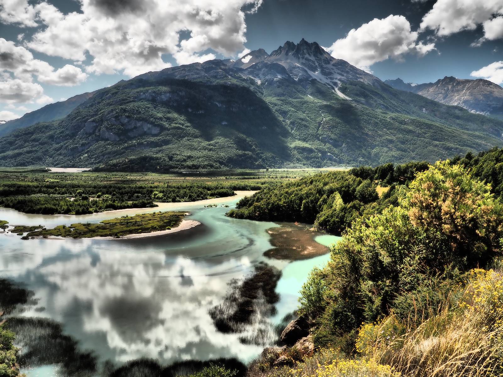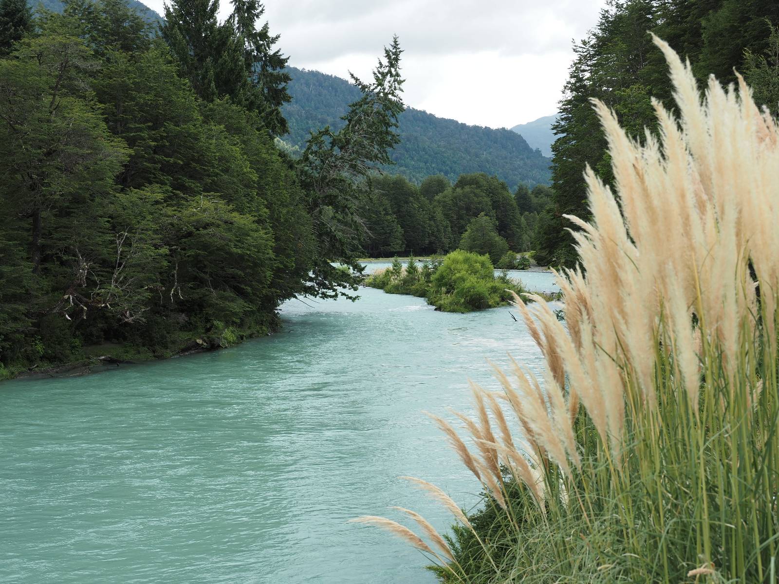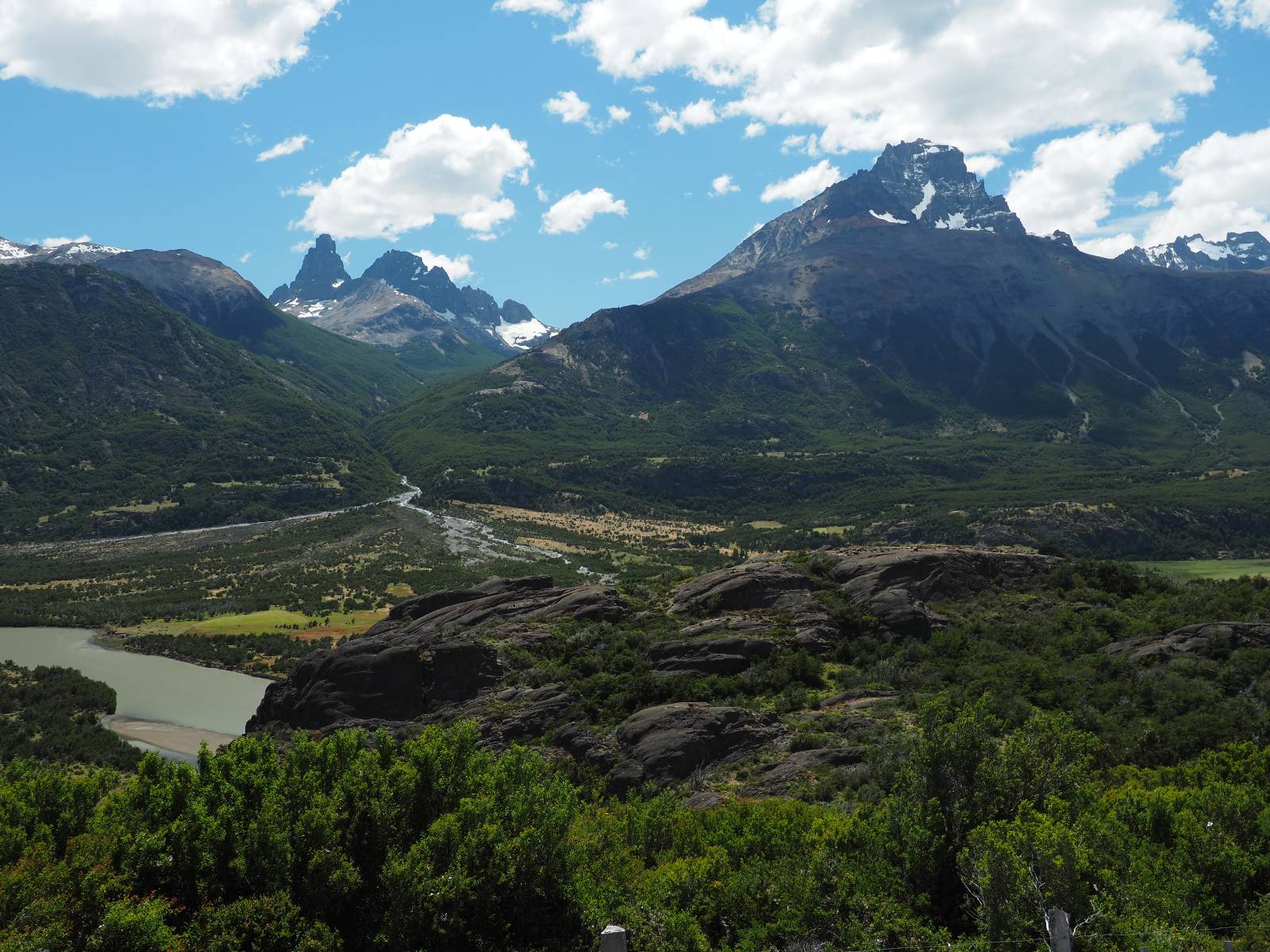 Allerdings nur, vielleicht einen Kilometer, zwei? Die nächste Aussicht auf die nächste viel größere Confluencia. Ein weiterer Zusammenfluß von zwei Flüssen und wieder von unterschiedlicher Farbe. Hier nicht so rauschend aber über eine größere Fläche im Tal verteilt und wunderschön anzusehen, wie sich die Farben in einer Art kleinem Delta mischen und das Grün und die Berge ihren Kontrast dazu geben. Eine schöne Steigerung zur ersten und es ärgert mich sehr, daß ich nicht mal drüber fliegen kann und mir das ganze von oben ansehen kann. Das wäre sicher spektakulär!!