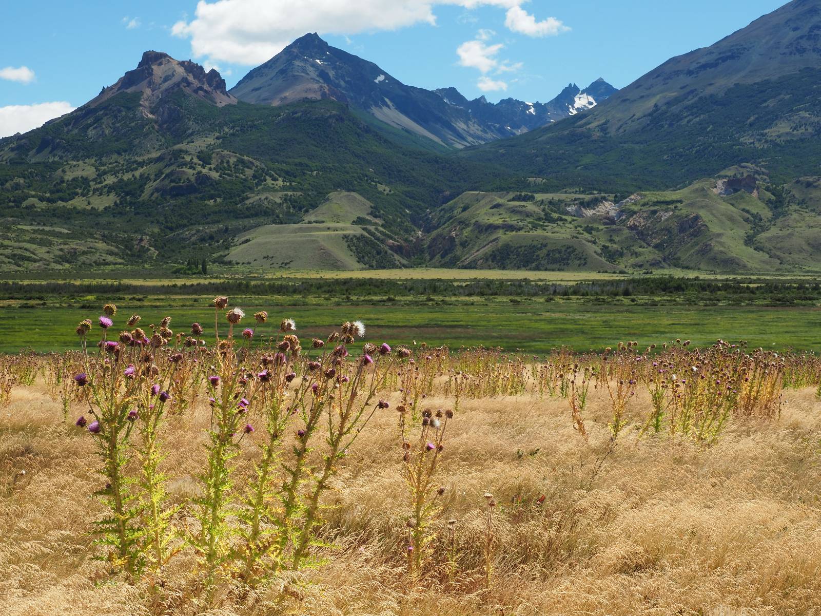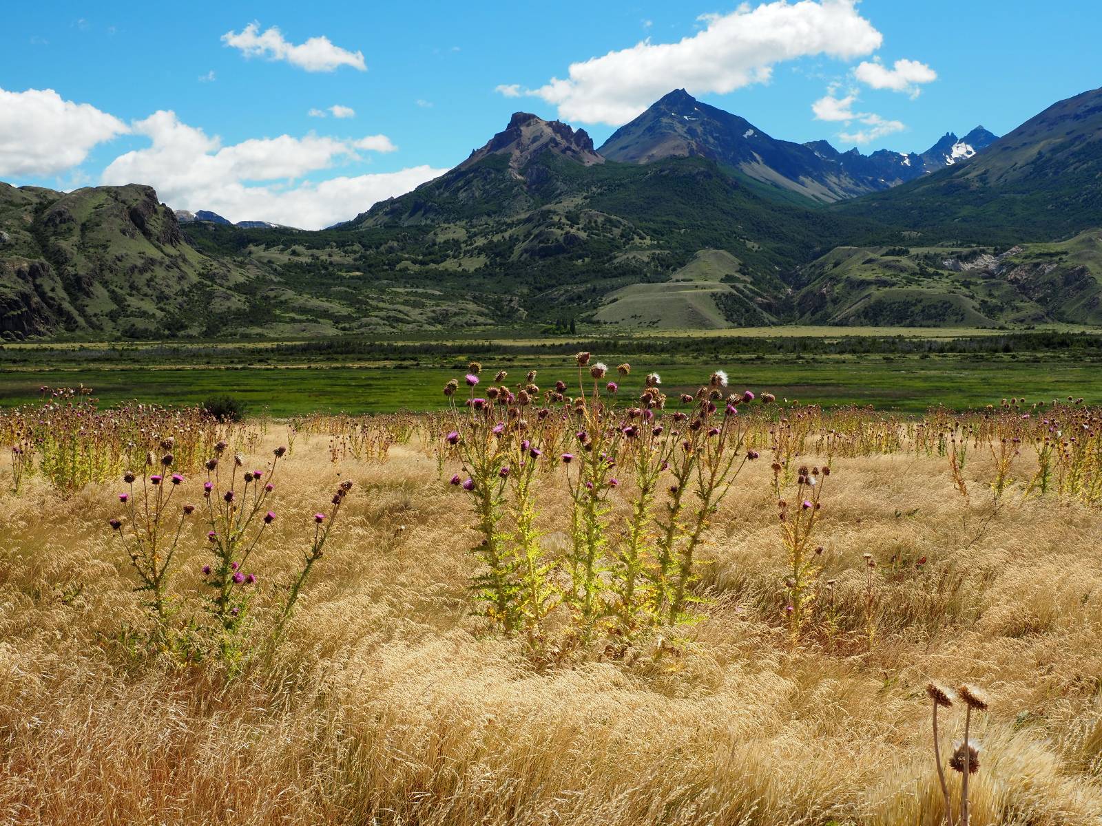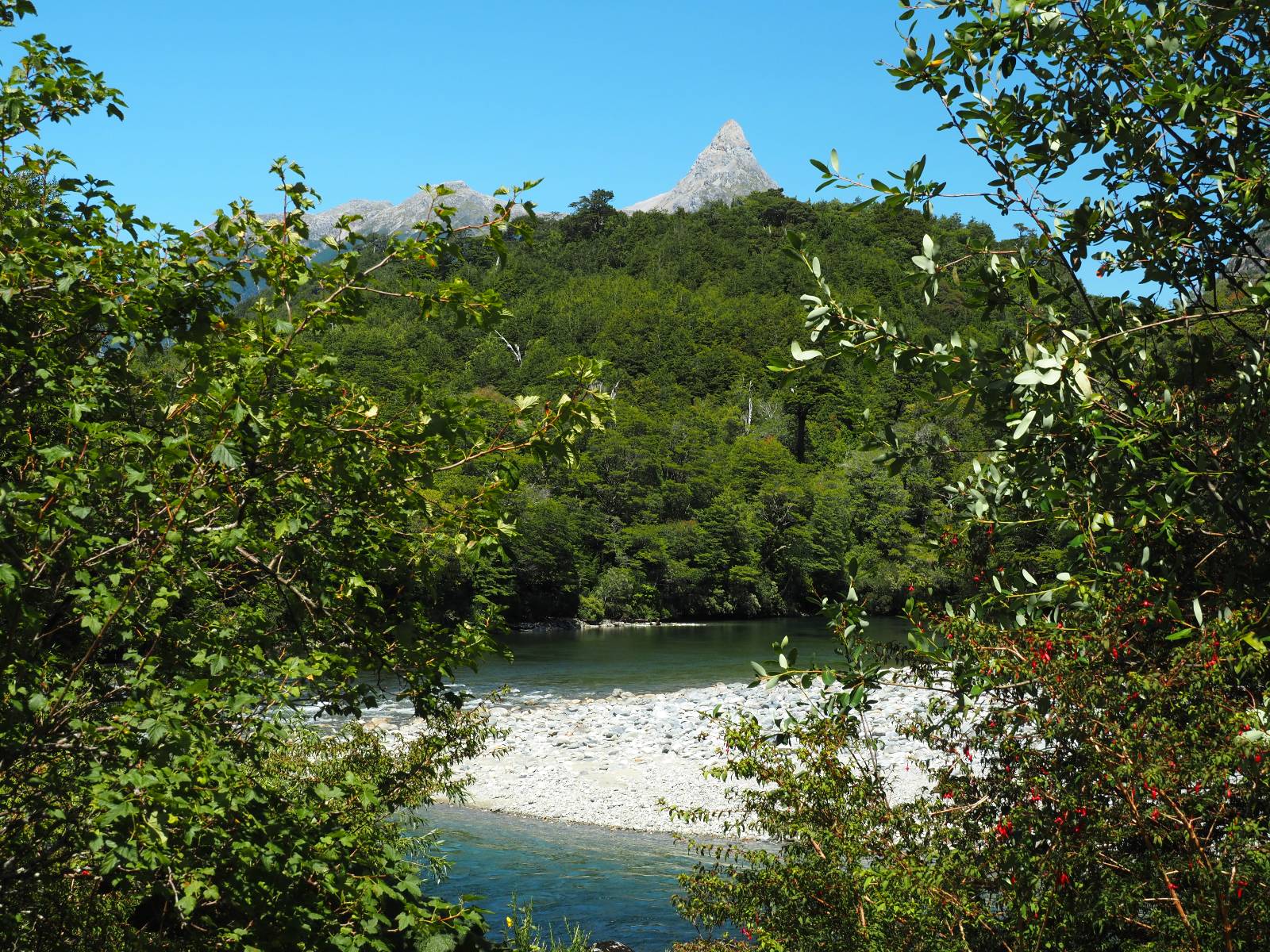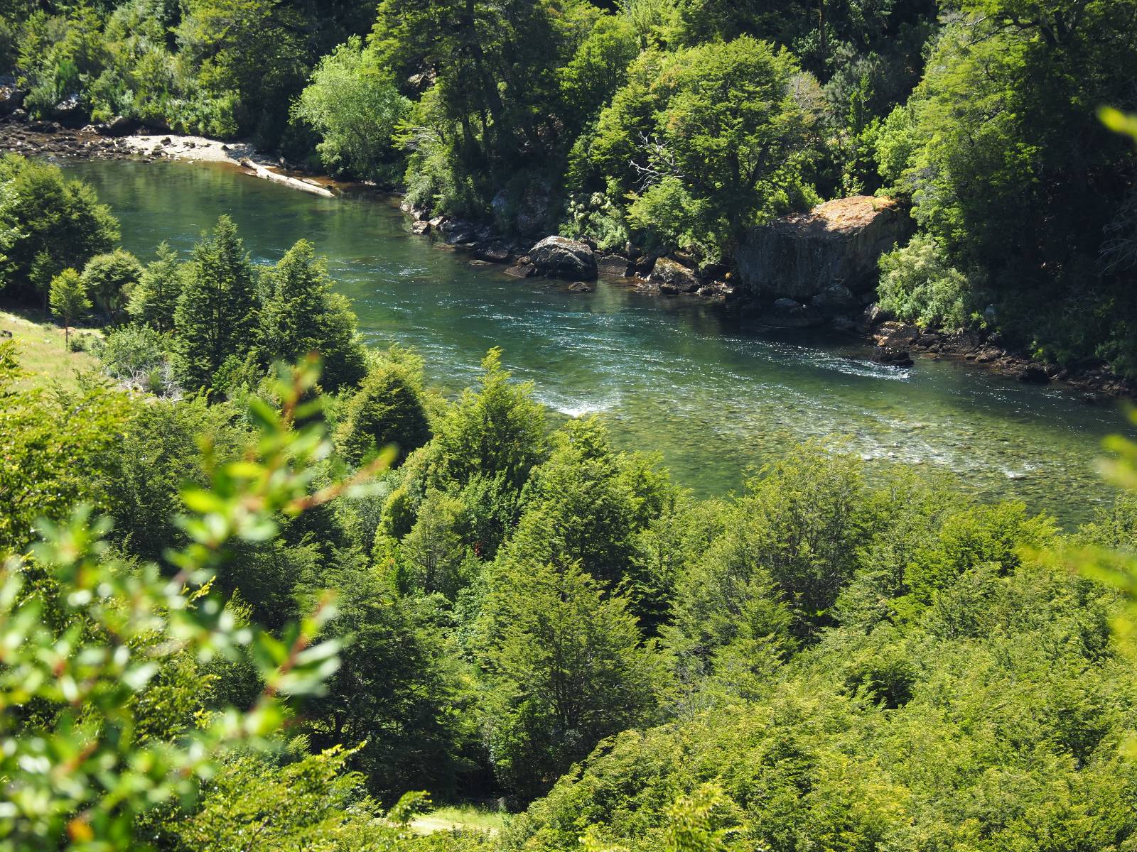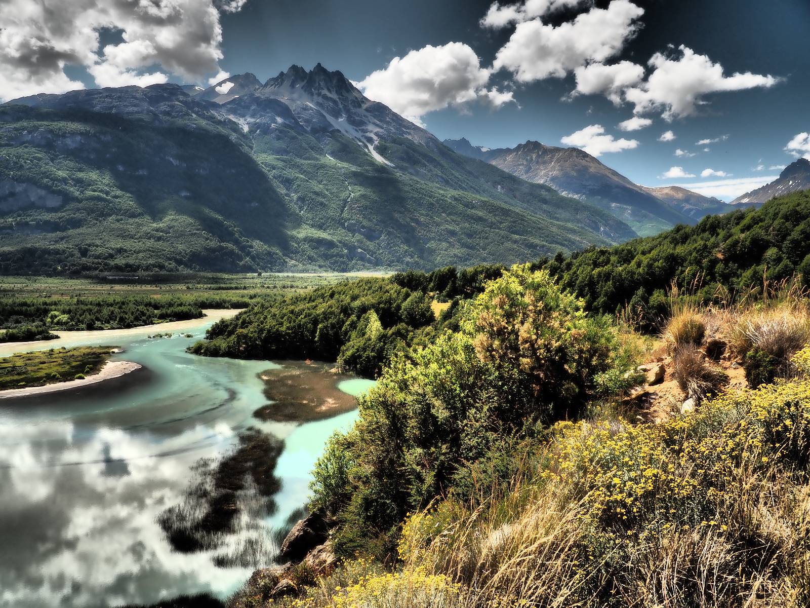 Allerdings nur, vielleicht einen Kilometer, zwei? Die nächste Aussicht auf die nächste viel größere Confluencia. Ein weiterer Zusammenfluß von zwei Flüssen und wieder von unterschiedlicher Farbe. Hier nicht so rauschend aber über eine größere Fläche im Tal verteilt und wunderschön anzusehen, wie sich die Farben in einer Art kleinem Delta mischen und das Grün und die Berge ihren Kontrast dazu geben. Eine schöne Steigerung zur ersten und es ärgert mich sehr, daß ich nicht mal drüber fliegen kann und mir das ganze von oben ansehen kann. Das wäre sicher spektakulär!!