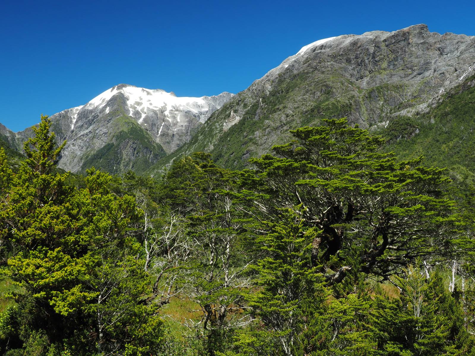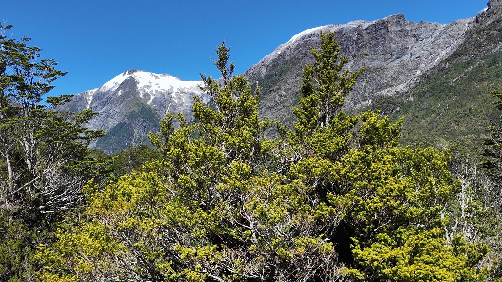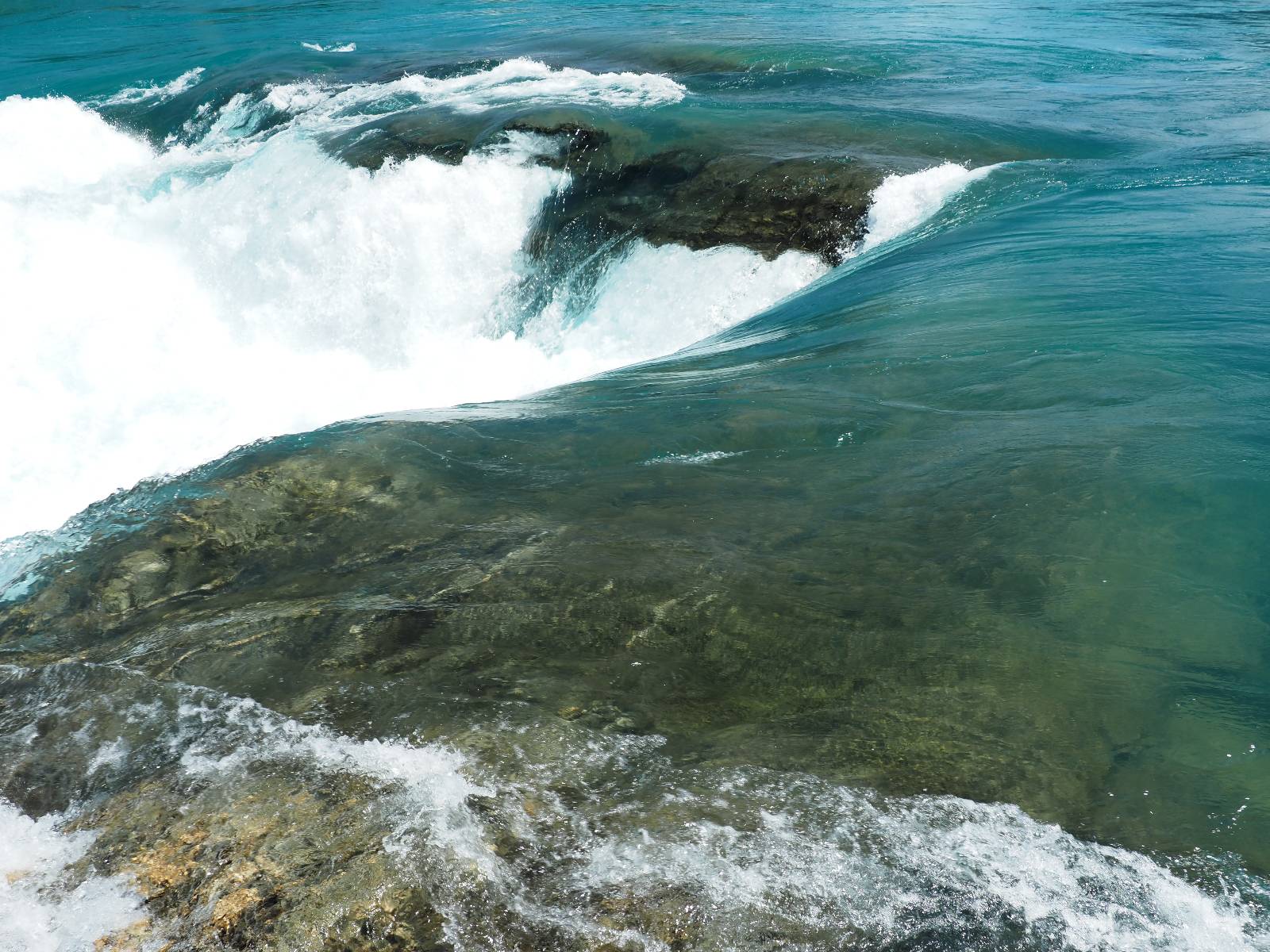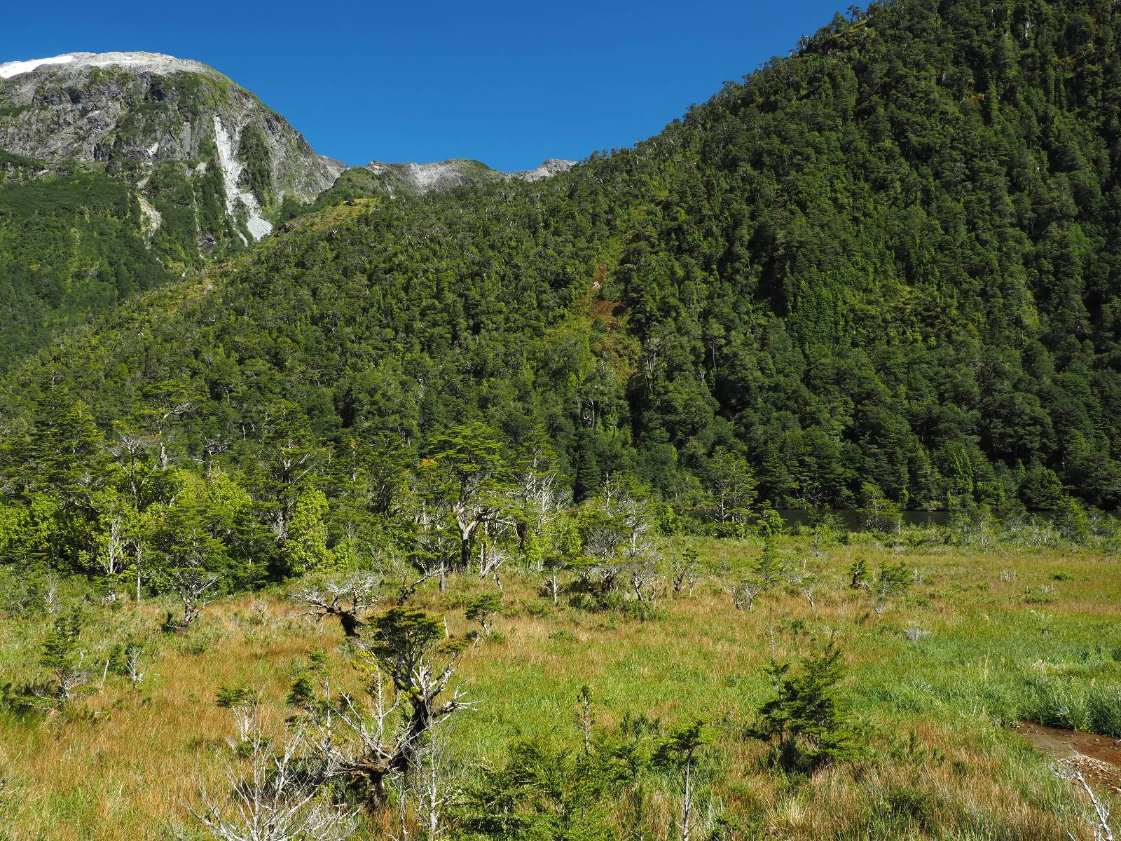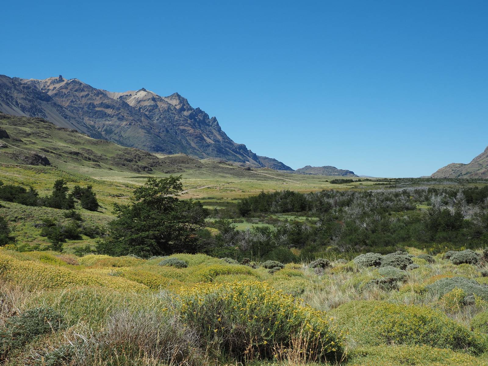 Allerdings nur, vielleicht einen Kilometer, zwei? Die nächste Aussicht auf die nächste viel größere Confluencia. Ein weiterer Zusammenfluß von zwei Flüssen und wieder von unterschiedlicher Farbe. Hier nicht so rauschend aber über eine größere Fläche im Tal verteilt und wunderschön anzusehen, wie sich die Farben in einer Art kleinem Delta mischen und das Grün und die Berge ihren Kontrast dazu geben. Eine schöne Steigerung zur ersten und es ärgert mich sehr, daß ich nicht mal drüber fliegen kann und mir das ganze von oben ansehen kann. Das wäre sicher spektakulär!!