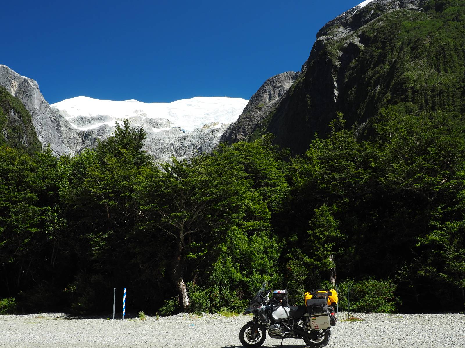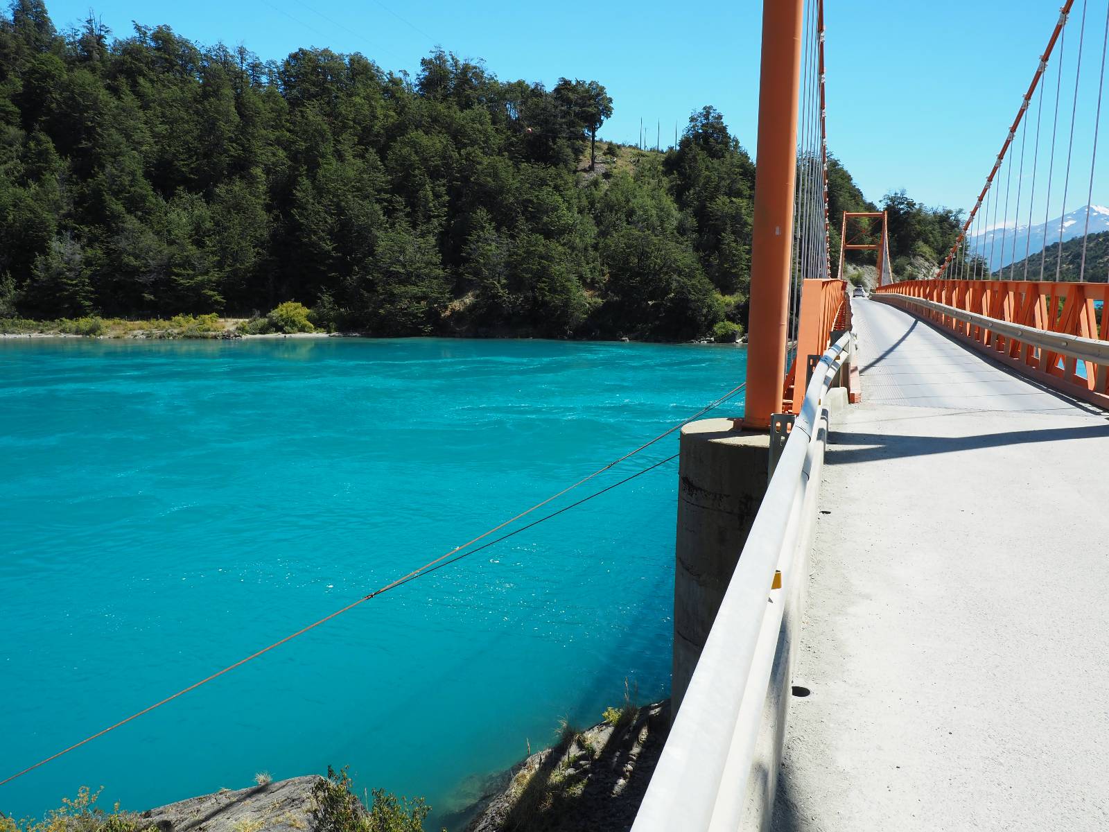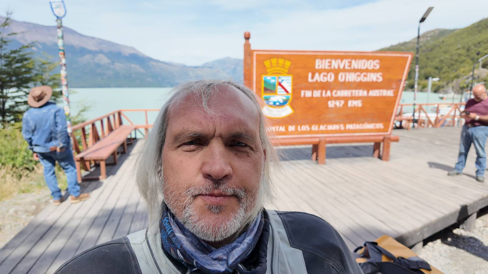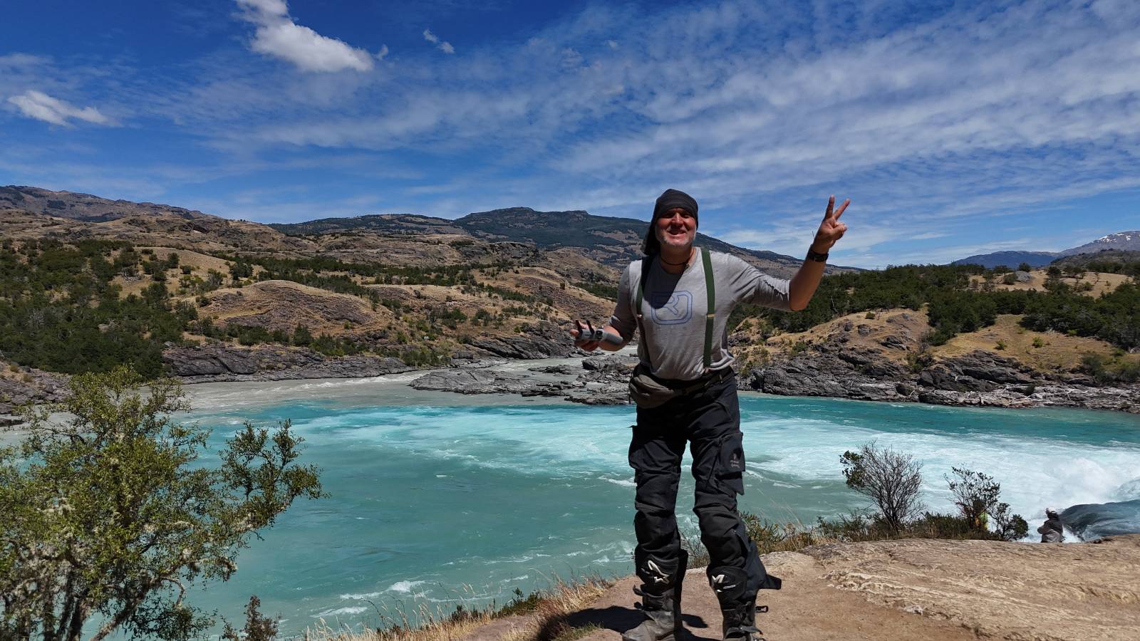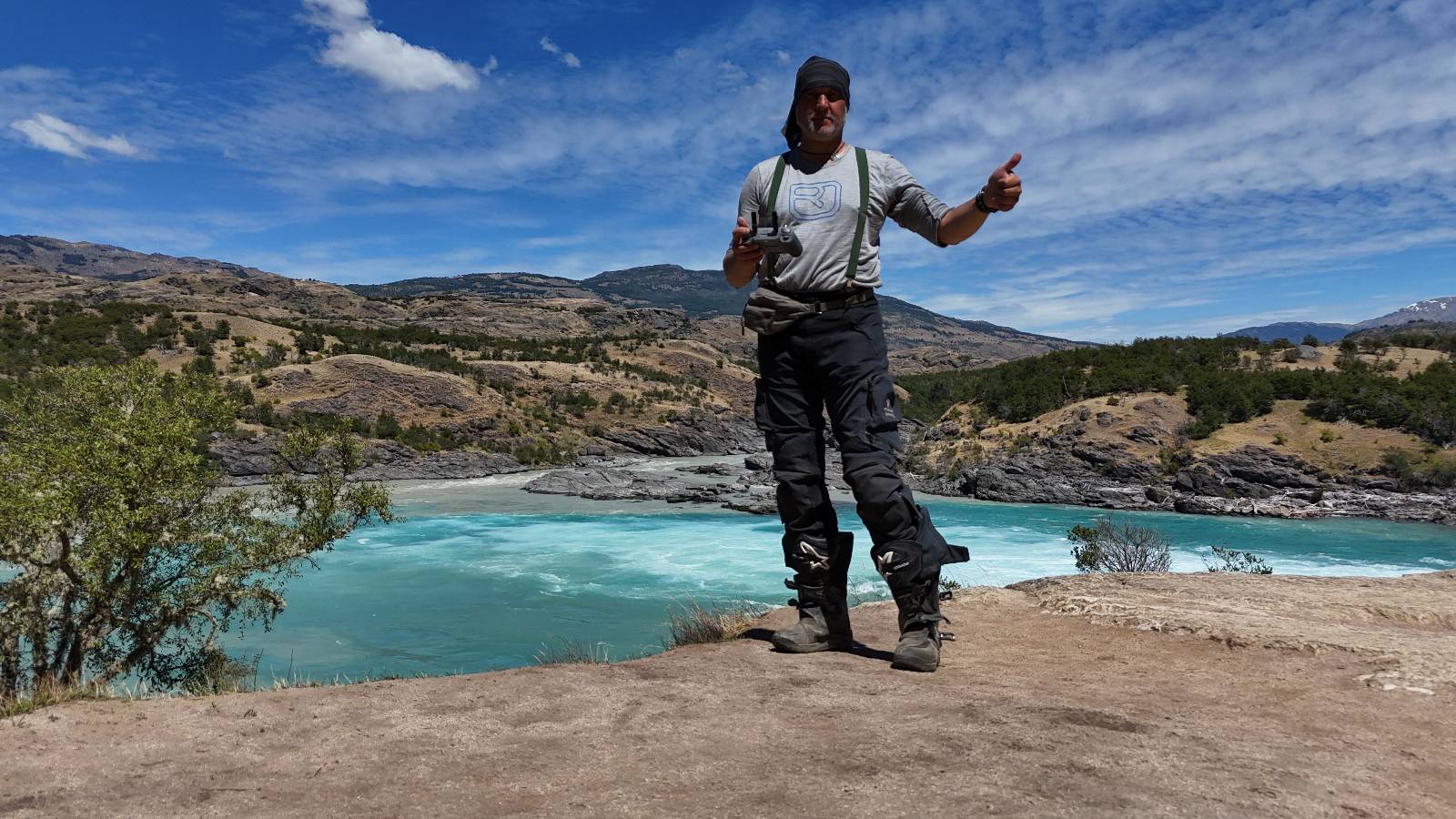Das Wetter bleibt verdammt schön! Nach einem Minifrühstück an einer Panaderia fahre ich noch an die Tankstelle. Doch bevor ich an der Panaderia loskomme, fährt Wolfgang ran. Lustigerweise hat er genau denselben Anzug wie ich an! Sein Kennzeichen wundert mich! Ich hatte ihn schon am Tag zuvor an der Tanke gesehen aber anhand des Kennzeichens nicht als Deutschen identifiziert. Er erklärt mir, dass er sich hat ein Art Mini-Chilenisches-Kennzeichen machen lassen und damit das Reguläre ersetzt. Auch wir haben mehr oder weniger die selbe Richtung, mal davon abgesehen, dass es bis Villa O’Higgins auch nicht so viel mehr gibt, es sei denn man biegt nach Argentinien ab. Ich lasse meinen Tank voll machen und als ich bezahlen will heißt es Systemausfall! Es kann nicht mehr bezahlt werden! Ist mir ja fast erstmal egal, der Tank ist ja voll. Der Kollege meint Bar geht auch nicht, da er keinen Beleg ausdrucken kann. Hm, also warten…, bis ein etwas jüngerer Tankwart vorbeikommt und der akzeptiert Bares! Das verschafft mir einen Vorsprung zu allen anderen, die noch tanken müssen und in die selbe Richtung wollen und bedeutet hoffentlich auch weniger Staub! Am blauen See entlang geht es weiter Richtung Süden und an einer ganz netten Stelle mit Aussicht steht Wolfgang und macht Frühstück! Recht hat er irgendwie! Aber trotzdem wirbeln einige die aus der anderen Richtung kommen wieder Staub auf! Schon bald komme ich über eine Brücke und das ist ja irre!! Der Fluß darunter ist blau! Ich bin schon drüber aber drehe nochmal um, um mir das ganz genau anzusehen! Es ist nicht so das übliche schöne blau, sondern blau blau! So richtig, als ob da einer einen riesiegen Topf blaue Farbe reingekippt hat. Irre faszinierend! Ich filme und mache Fotos und bin wirklich beeindruckt. Es hält auch jeder an, um sich diese Schauspiel anzuschauen! Ein Däne mit seine Argentinischen Freundin lässt die Drohne fliegen. Wir schnakken kurz und dann gehts weiter.