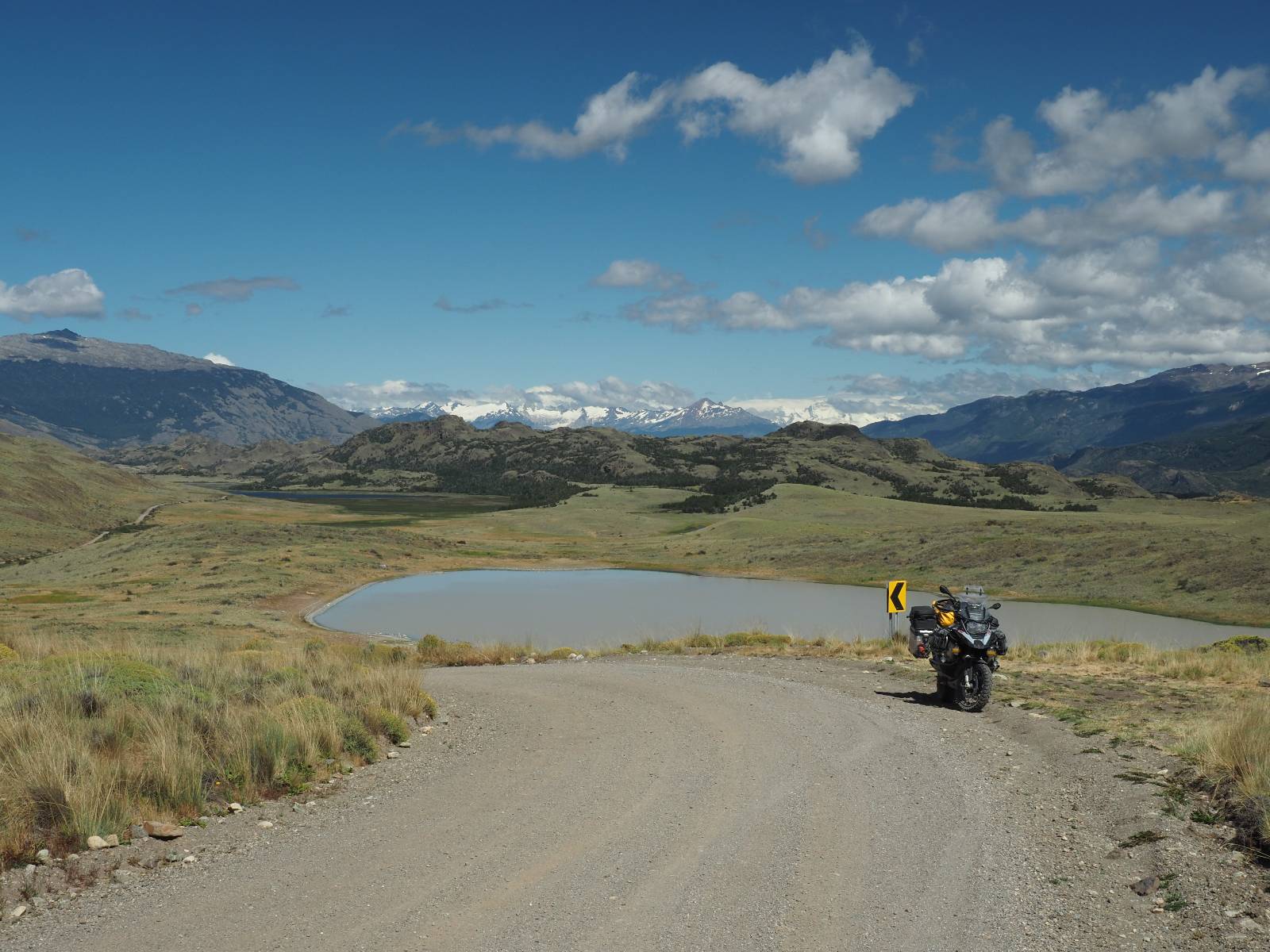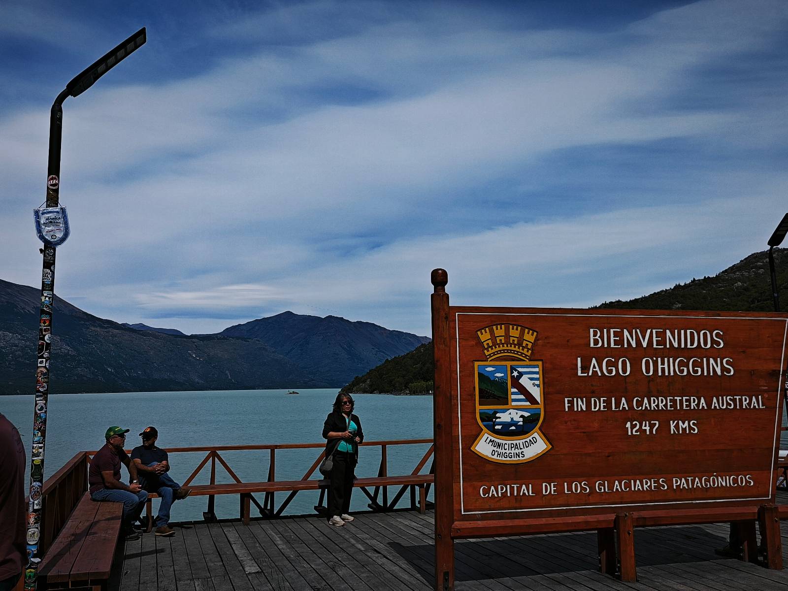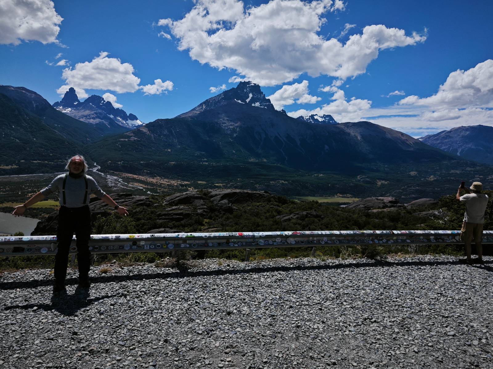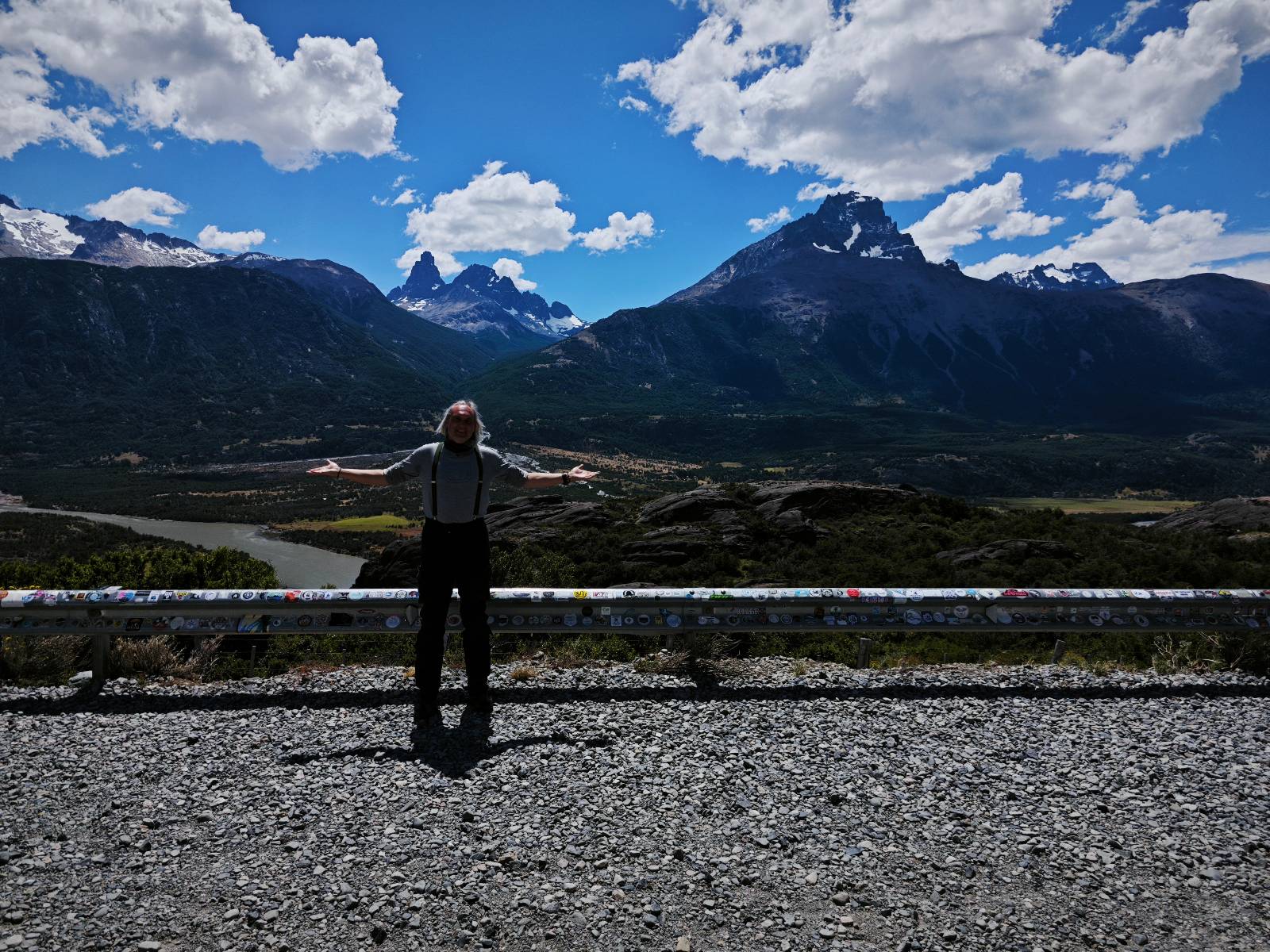 Das Wetter bleibt verdammt schön! Nach einem Minifrühstück an einer Panaderia fahre ich noch an die Tankstelle. Doch bevor ich an der Panaderia loskomme, fährt Wolfgang ran. Lustigerweise hat er genau denselben Anzug wie ich an! Sein Kennzeichen wundert mich! Ich hatte ihn schon am Tag zuvor an der Tanke gesehen aber anhand des Kennzeichens nicht als Deutschen identifiziert. Er erklärt mir, dass er sich hat ein Art Mini-Chilenisches-Kennzeichen machen lassen und damit das Reguläre ersetzt. Auch wir haben mehr oder weniger die selbe Richtung, mal davon abgesehen, dass es bis Villa O’Higgins auch nicht so viel mehr gibt, es sei denn man biegt nach Argentinien ab. Ich lasse meinen Tank voll machen und als ich bezahlen will heißt es Systemausfall! Es kann nicht mehr bezahlt werden! Ist mir ja fast erstmal egal, der Tank ist ja voll. Der Kollege meint Bar geht auch nicht, da er keinen Beleg ausdrucken kann. Hm, also warten…, bis ein etwas jüngerer Tankwart vorbeikommt und der akzeptiert Bares! Das verschafft mir einen Vorsprung zu allen anderen, die noch tanken müssen und in die selbe Richtung wollen und bedeutet hoffentlich auch weniger Staub! Am blauen See entlang geht es weiter Richtung Süden und an einer ganz netten Stelle mit Aussicht steht Wolfgang und macht Frühstück! Recht hat er irgendwie! Aber trotzdem wirbeln einige die aus der anderen Richtung kommen wieder Staub auf! Schon bald komme ich über eine Brücke und das ist ja irre!! Der Fluß darunter ist blau! Ich bin schon drüber aber drehe nochmal um, um mir das ganz genau anzusehen! Es ist nicht so das übliche schöne blau, sondern blau blau! So richtig, als ob da einer einen riesiegen Topf blaue Farbe reingekippt hat. Irre faszinierend! Ich filme und mache Fotos und bin wirklich beeindruckt. Es hält auch jeder an, um sich diese Schauspiel anzuschauen! Ein Däne mit seine Argentinischen Freundin lässt die Drohne fliegen. Wir schnakken kurz und dann gehts weiter.