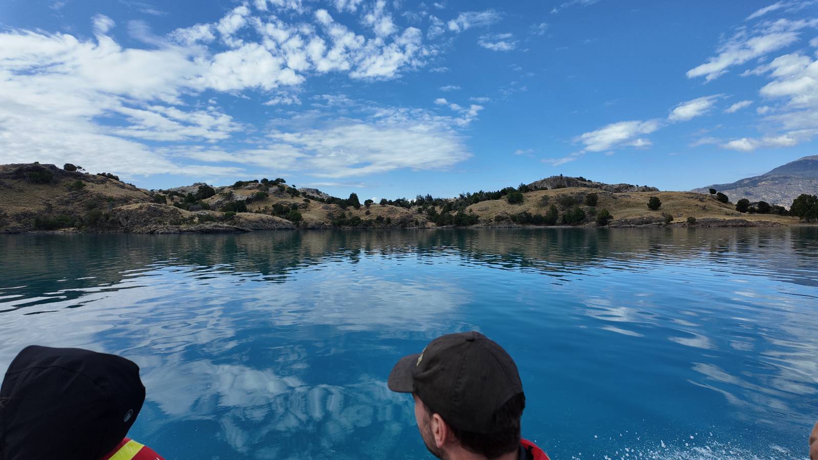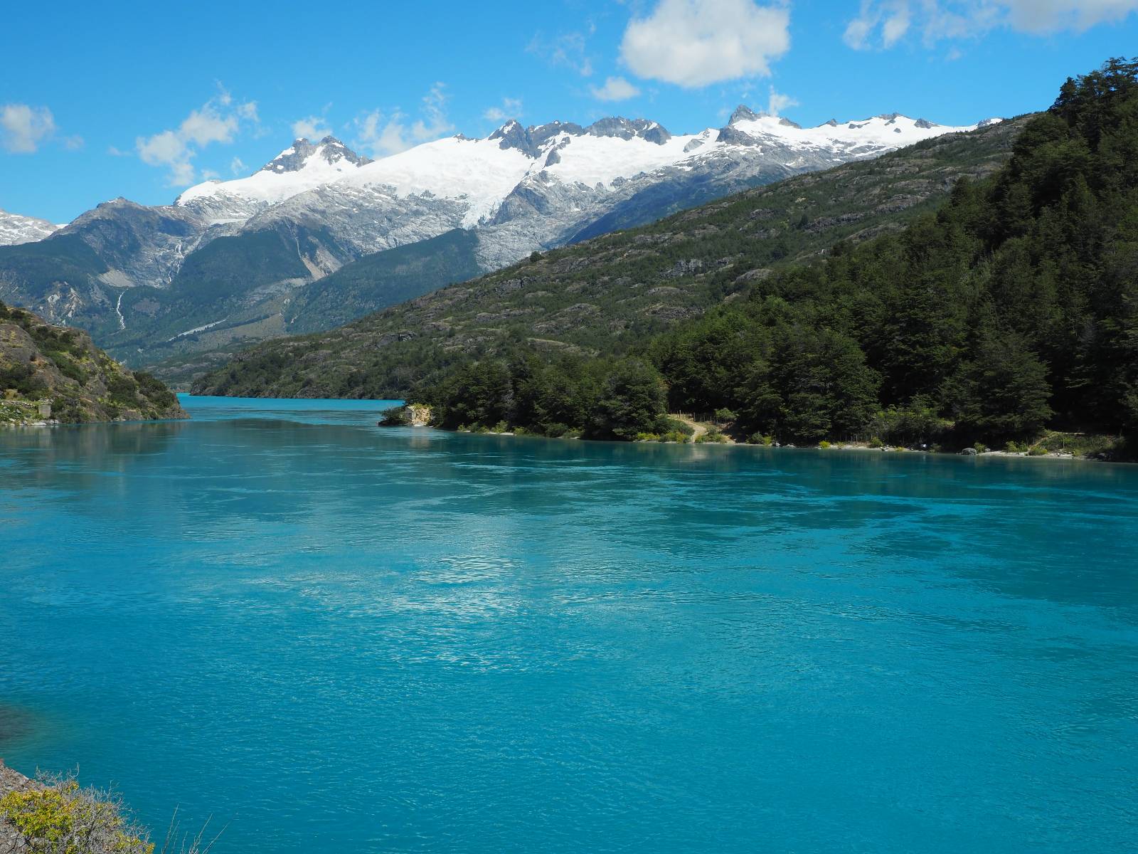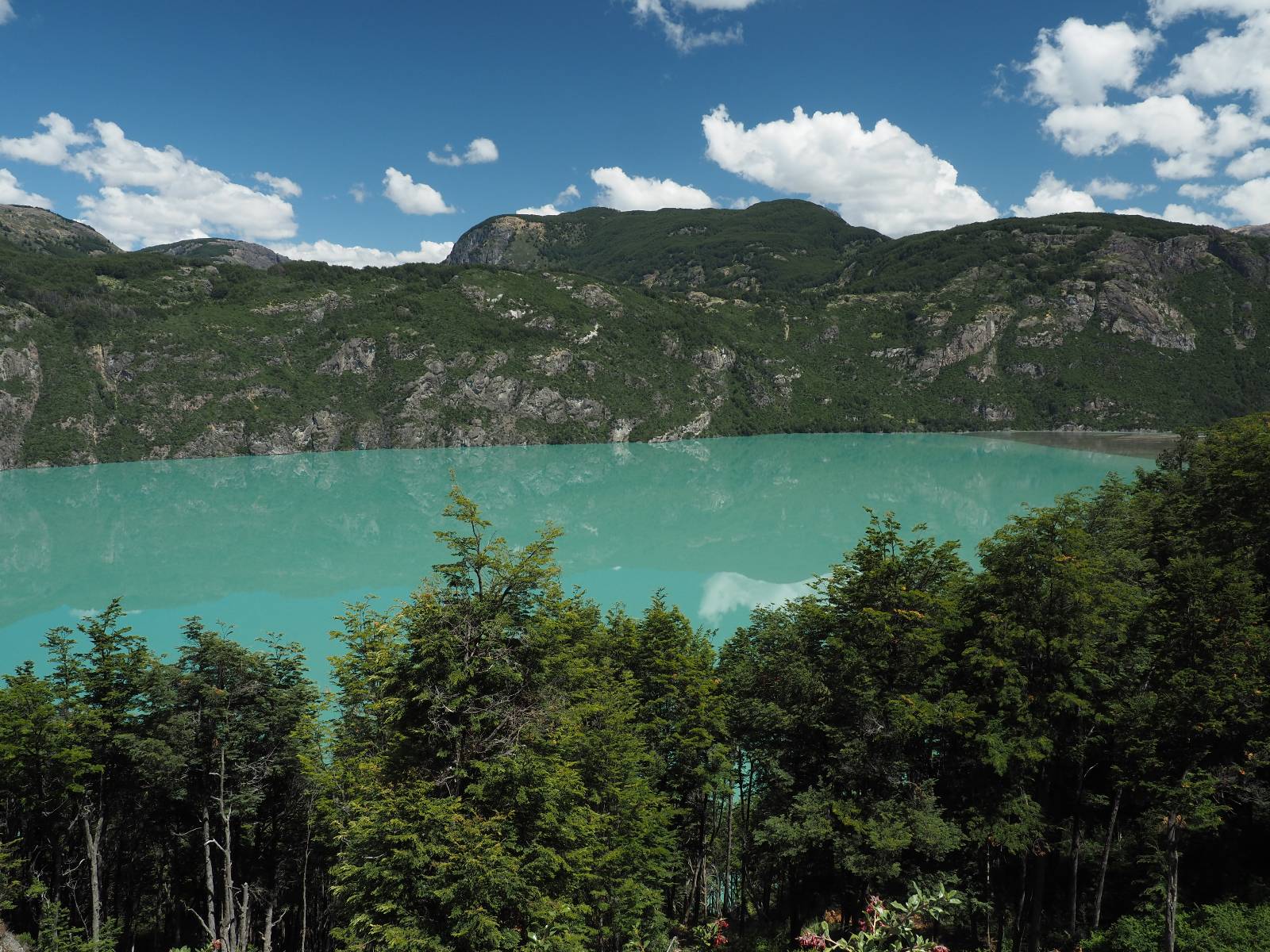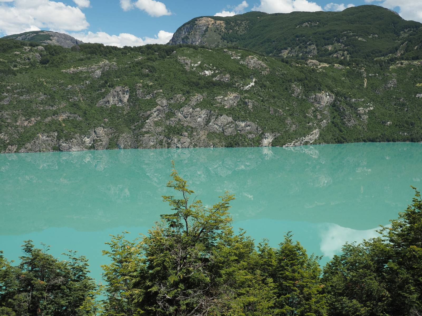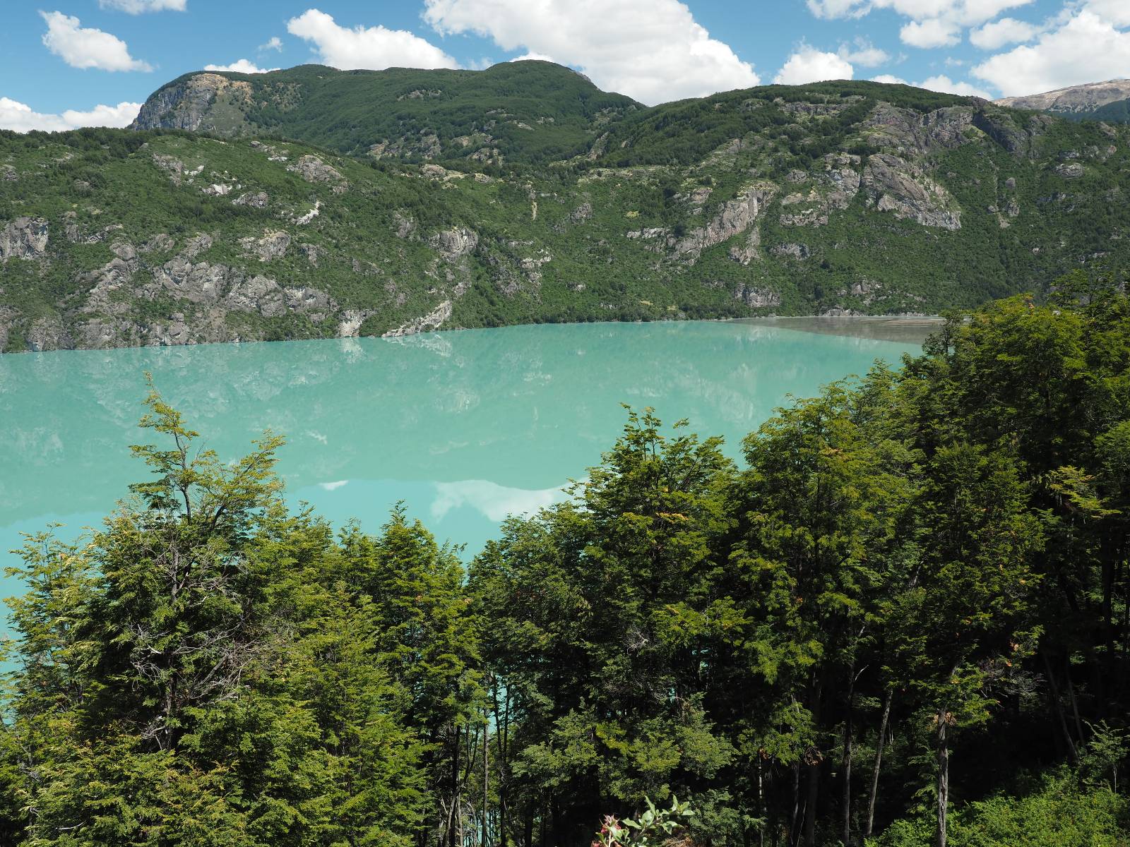 Das Wetter bleibt verdammt schön! Nach einem Minifrühstück an einer Panaderia fahre ich noch an die Tankstelle. Doch bevor ich an der Panaderia loskomme, fährt Wolfgang ran. Lustigerweise hat er genau denselben Anzug wie ich an! Sein Kennzeichen wundert mich! Ich hatte ihn schon am Tag zuvor an der Tanke gesehen aber anhand des Kennzeichens nicht als Deutschen identifiziert. Er erklärt mir, dass er sich hat ein Art Mini-Chilenisches-Kennzeichen machen lassen und damit das Reguläre ersetzt. Auch wir haben mehr oder weniger die selbe Richtung, mal davon abgesehen, dass es bis Villa O’Higgins auch nicht so viel mehr gibt, es sei denn man biegt nach Argentinien ab. Ich lasse meinen Tank voll machen und als ich bezahlen will heißt es Systemausfall! Es kann nicht mehr bezahlt werden! Ist mir ja fast erstmal egal, der Tank ist ja voll. Der Kollege meint Bar geht auch nicht, da er keinen Beleg ausdrucken kann. Hm, also warten…, bis ein etwas jüngerer Tankwart vorbeikommt und der akzeptiert Bares! Das verschafft mir einen Vorsprung zu allen anderen, die noch tanken müssen und in die selbe Richtung wollen und bedeutet hoffentlich auch weniger Staub! Am blauen See entlang geht es weiter Richtung Süden und an einer ganz netten Stelle mit Aussicht steht Wolfgang und macht Frühstück! Recht hat er irgendwie! Aber trotzdem wirbeln einige die aus der anderen Richtung kommen wieder Staub auf! Schon bald komme ich über eine Brücke und das ist ja irre!! Der Fluß darunter ist blau! Ich bin schon drüber aber drehe nochmal um, um mir das ganz genau anzusehen! Es ist nicht so das übliche schöne blau, sondern blau blau! So richtig, als ob da einer einen riesiegen Topf blaue Farbe reingekippt hat. Irre faszinierend! Ich filme und mache Fotos und bin wirklich beeindruckt. Es hält auch jeder an, um sich diese Schauspiel anzuschauen! Ein Däne mit seine Argentinischen Freundin lässt die Drohne fliegen. Wir schnakken kurz und dann gehts weiter.