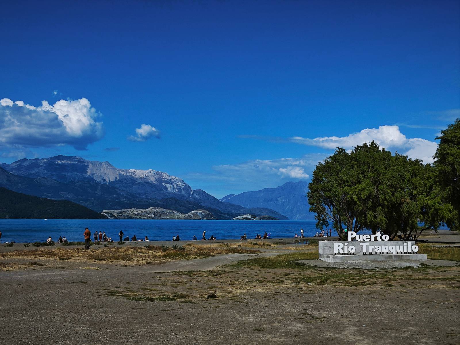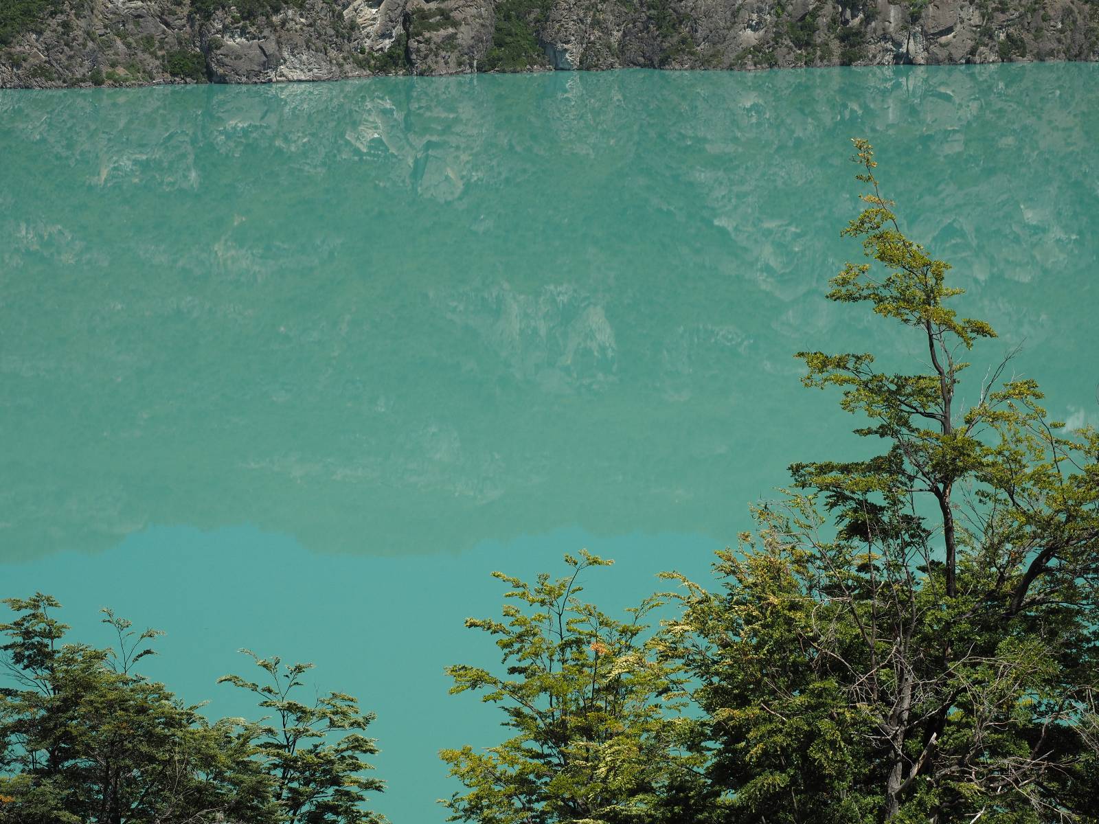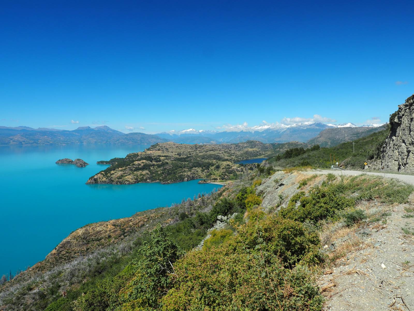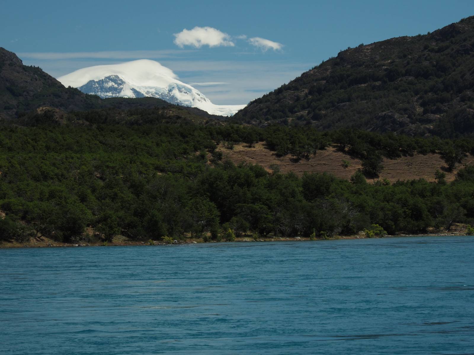 Das Wetter bleibt verdammt schön! Nach einem Minifrühstück an einer Panaderia fahre ich noch an die Tankstelle. Doch bevor ich an der Panaderia loskomme, fährt Wolfgang ran. Lustigerweise hat er genau denselben Anzug wie ich an! Sein Kennzeichen wundert mich! Ich hatte ihn schon am Tag zuvor an der Tanke gesehen aber anhand des Kennzeichens nicht als Deutschen identifiziert. Er erklärt mir, dass er sich hat ein Art Mini-Chilenisches-Kennzeichen machen lassen und damit das Reguläre ersetzt. Auch wir haben mehr oder weniger die selbe Richtung, mal davon abgesehen, dass es bis Villa O’Higgins auch nicht so viel mehr gibt, es sei denn man biegt nach Argentinien ab. Ich lasse meinen Tank voll machen und als ich bezahlen will heißt es Systemausfall! Es kann nicht mehr bezahlt werden! Ist mir ja fast erstmal egal, der Tank ist ja voll. Der Kollege meint Bar geht auch nicht, da er keinen Beleg ausdrucken kann. Hm, also warten…, bis ein etwas jüngerer Tankwart vorbeikommt und der akzeptiert Bares! Das verschafft mir einen Vorsprung zu allen anderen, die noch tanken müssen und in die selbe Richtung wollen und bedeutet hoffentlich auch weniger Staub! Am blauen See entlang geht es weiter Richtung Süden und an einer ganz netten Stelle mit Aussicht steht Wolfgang und macht Frühstück! Recht hat er irgendwie! Aber trotzdem wirbeln einige die aus der anderen Richtung kommen wieder Staub auf! Schon bald komme ich über eine Brücke und das ist ja irre!! Der Fluß darunter ist blau! Ich bin schon drüber aber drehe nochmal um, um mir das ganz genau anzusehen! Es ist nicht so das übliche schöne blau, sondern blau blau! So richtig, als ob da einer einen riesiegen Topf blaue Farbe reingekippt hat. Irre faszinierend! Ich filme und mache Fotos und bin wirklich beeindruckt. Es hält auch jeder an, um sich diese Schauspiel anzuschauen! Ein Däne mit seine Argentinischen Freundin lässt die Drohne fliegen. Wir schnakken kurz und dann gehts weiter.