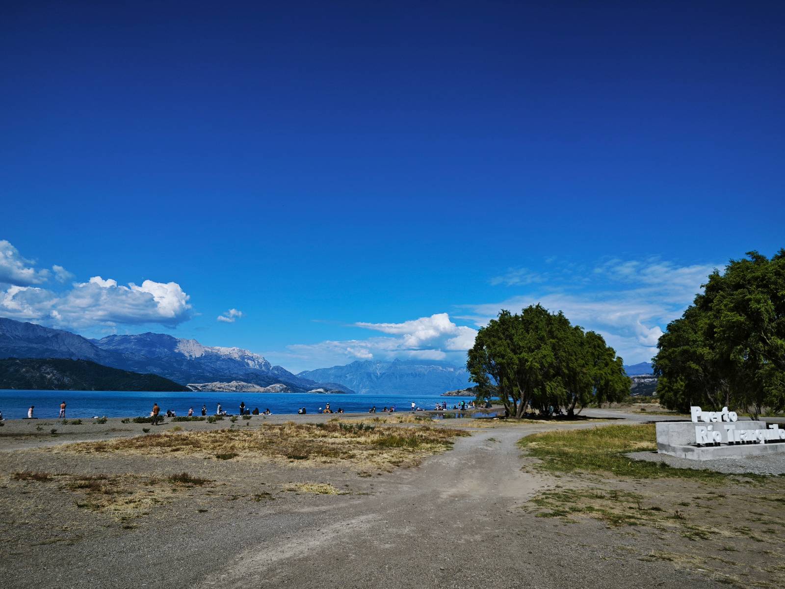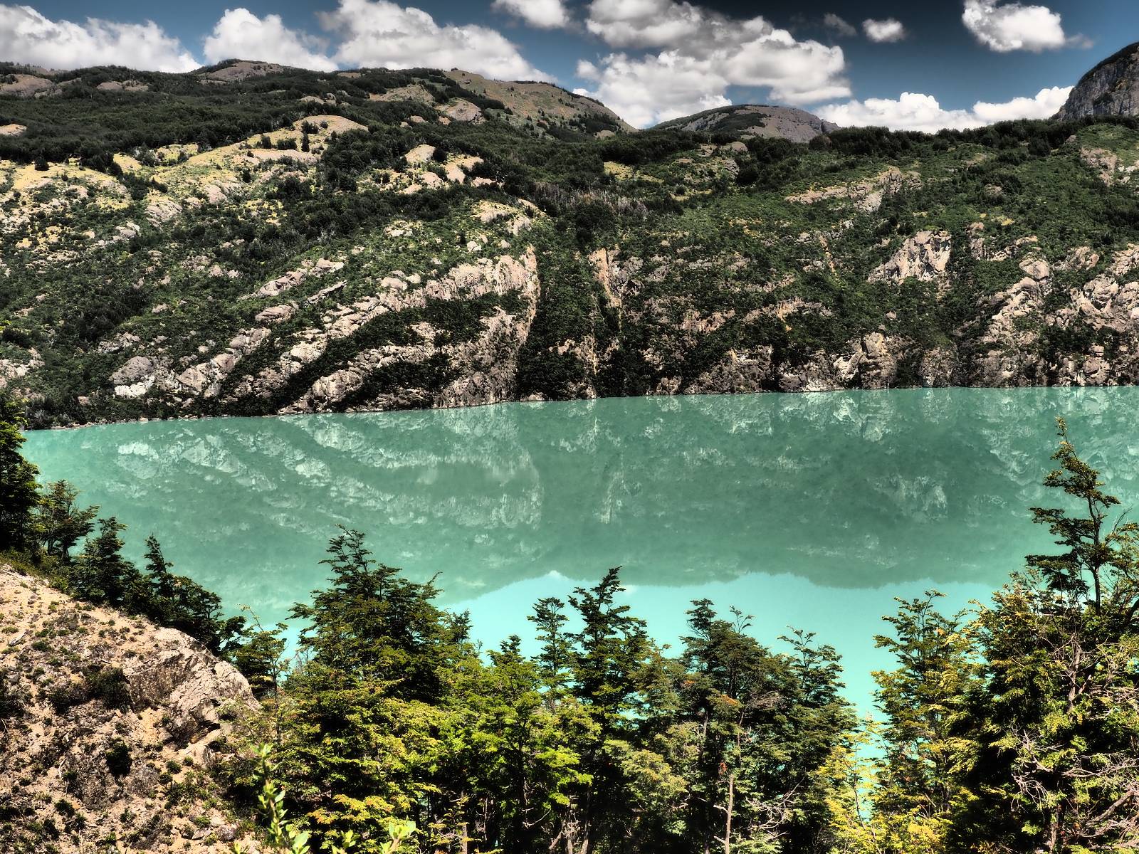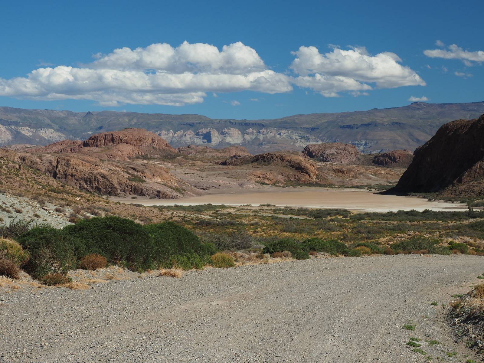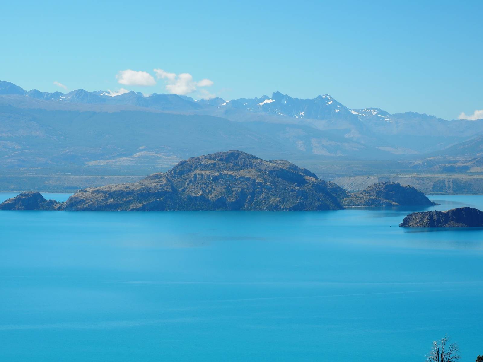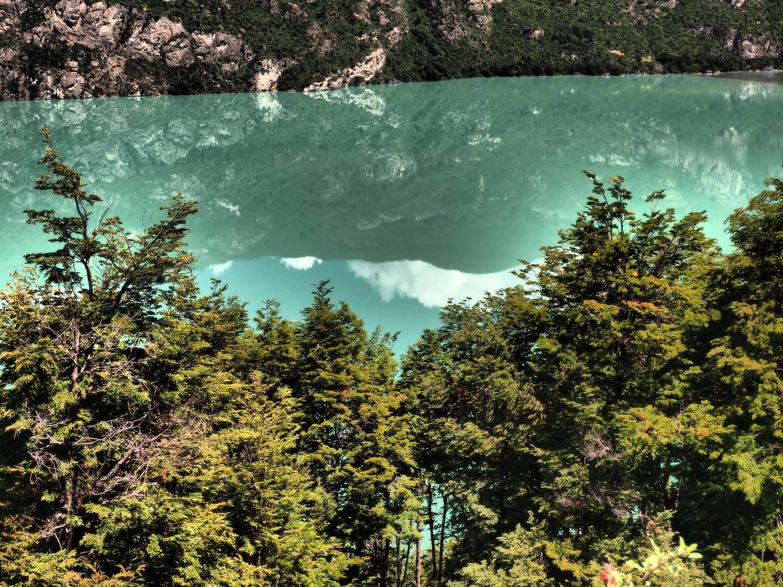 Das Wetter bleibt verdammt schön! Nach einem Minifrühstück an einer Panaderia fahre ich noch an die Tankstelle. Doch bevor ich an der Panaderia loskomme, fährt Wolfgang ran. Lustigerweise hat er genau denselben Anzug wie ich an! Sein Kennzeichen wundert mich! Ich hatte ihn schon am Tag zuvor an der Tanke gesehen aber anhand des Kennzeichens nicht als Deutschen identifiziert. Er erklärt mir, dass er sich hat ein Art Mini-Chilenisches-Kennzeichen machen lassen und damit das Reguläre ersetzt. Auch wir haben mehr oder weniger die selbe Richtung, mal davon abgesehen, dass es bis Villa O’Higgins auch nicht so viel mehr gibt, es sei denn man biegt nach Argentinien ab. Ich lasse meinen Tank voll machen und als ich bezahlen will heißt es Systemausfall! Es kann nicht mehr bezahlt werden! Ist mir ja fast erstmal egal, der Tank ist ja voll. Der Kollege meint Bar geht auch nicht, da er keinen Beleg ausdrucken kann. Hm, also warten…, bis ein etwas jüngerer Tankwart vorbeikommt und der akzeptiert Bares! Das verschafft mir einen Vorsprung zu allen anderen, die noch tanken müssen und in die selbe Richtung wollen und bedeutet hoffentlich auch weniger Staub! Am blauen See entlang geht es weiter Richtung Süden und an einer ganz netten Stelle mit Aussicht steht Wolfgang und macht Frühstück! Recht hat er irgendwie! Aber trotzdem wirbeln einige die aus der anderen Richtung kommen wieder Staub auf! Schon bald komme ich über eine Brücke und das ist ja irre!! Der Fluß darunter ist blau! Ich bin schon drüber aber drehe nochmal um, um mir das ganz genau anzusehen! Es ist nicht so das übliche schöne blau, sondern blau blau! So richtig, als ob da einer einen riesiegen Topf blaue Farbe reingekippt hat. Irre faszinierend! Ich filme und mache Fotos und bin wirklich beeindruckt. Es hält auch jeder an, um sich diese Schauspiel anzuschauen! Ein Däne mit seine Argentinischen Freundin lässt die Drohne fliegen. Wir schnakken kurz und dann gehts weiter.
