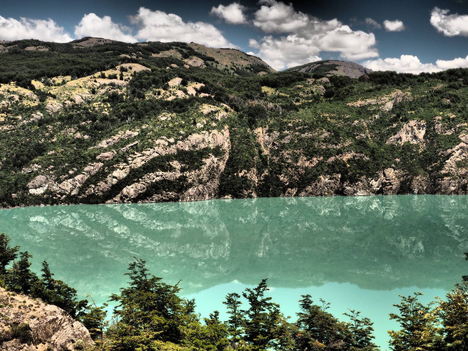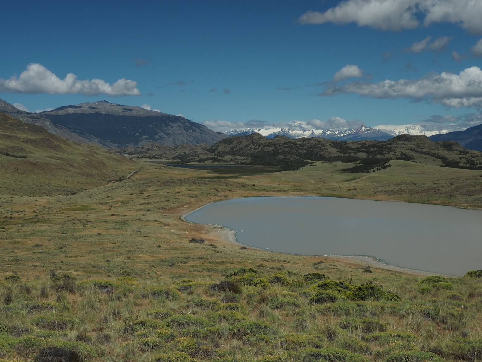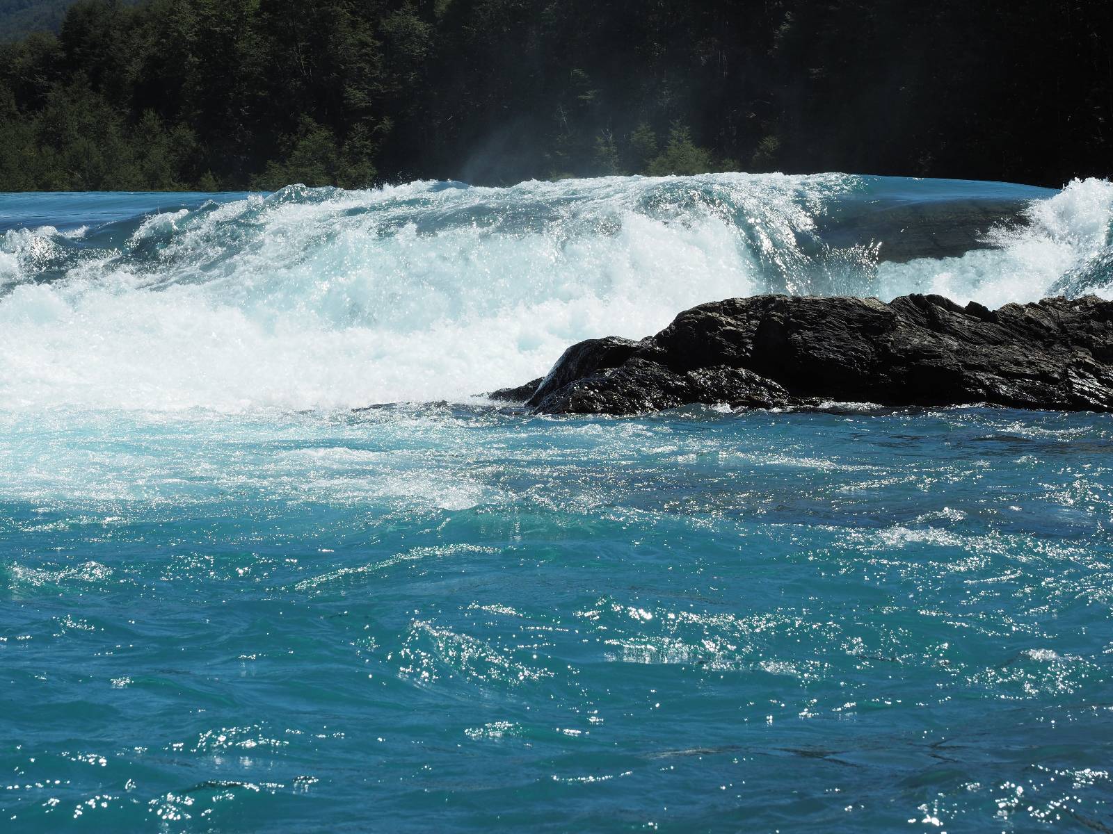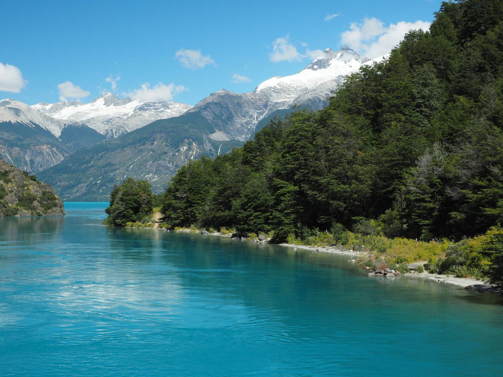 Das Wetter bleibt verdammt schön! Nach einem Minifrühstück an einer Panaderia fahre ich noch an die Tankstelle. Doch bevor ich an der Panaderia loskomme, fährt Wolfgang ran. Lustigerweise hat er genau denselben Anzug wie ich an! Sein Kennzeichen wundert mich! Ich hatte ihn schon am Tag zuvor an der Tanke gesehen aber anhand des Kennzeichens nicht als Deutschen identifiziert. Er erklärt mir, dass er sich hat ein Art Mini-Chilenisches-Kennzeichen machen lassen und damit das Reguläre ersetzt. Auch wir haben mehr oder weniger die selbe Richtung, mal davon abgesehen, dass es bis Villa O’Higgins auch nicht so viel mehr gibt, es sei denn man biegt nach Argentinien ab. Ich lasse meinen Tank voll machen und als ich bezahlen will heißt es Systemausfall! Es kann nicht mehr bezahlt werden! Ist mir ja fast erstmal egal, der Tank ist ja voll. Der Kollege meint Bar geht auch nicht, da er keinen Beleg ausdrucken kann. Hm, also warten…, bis ein etwas jüngerer Tankwart vorbeikommt und der akzeptiert Bares! Das verschafft mir einen Vorsprung zu allen anderen, die noch tanken müssen und in die selbe Richtung wollen und bedeutet hoffentlich auch weniger Staub! Am blauen See entlang geht es weiter Richtung Süden und an einer ganz netten Stelle mit Aussicht steht Wolfgang und macht Frühstück! Recht hat er irgendwie! Aber trotzdem wirbeln einige die aus der anderen Richtung kommen wieder Staub auf! Schon bald komme ich über eine Brücke und das ist ja irre!! Der Fluß darunter ist blau! Ich bin schon drüber aber drehe nochmal um, um mir das ganz genau anzusehen! Es ist nicht so das übliche schöne blau, sondern blau blau! So richtig, als ob da einer einen riesiegen Topf blaue Farbe reingekippt hat. Irre faszinierend! Ich filme und mache Fotos und bin wirklich beeindruckt. Es hält auch jeder an, um sich diese Schauspiel anzuschauen! Ein Däne mit seine Argentinischen Freundin lässt die Drohne fliegen. Wir schnakken kurz und dann gehts weiter.