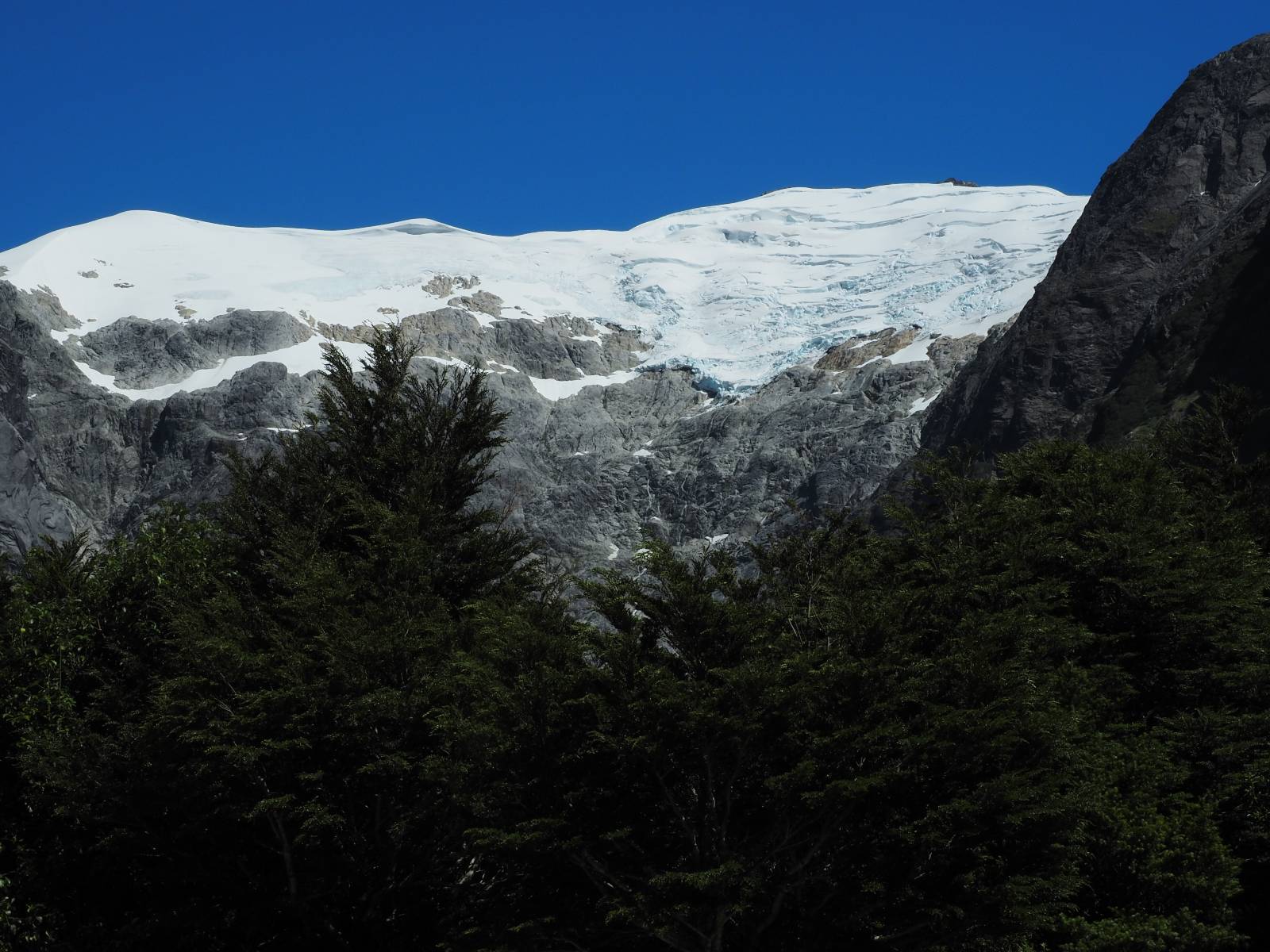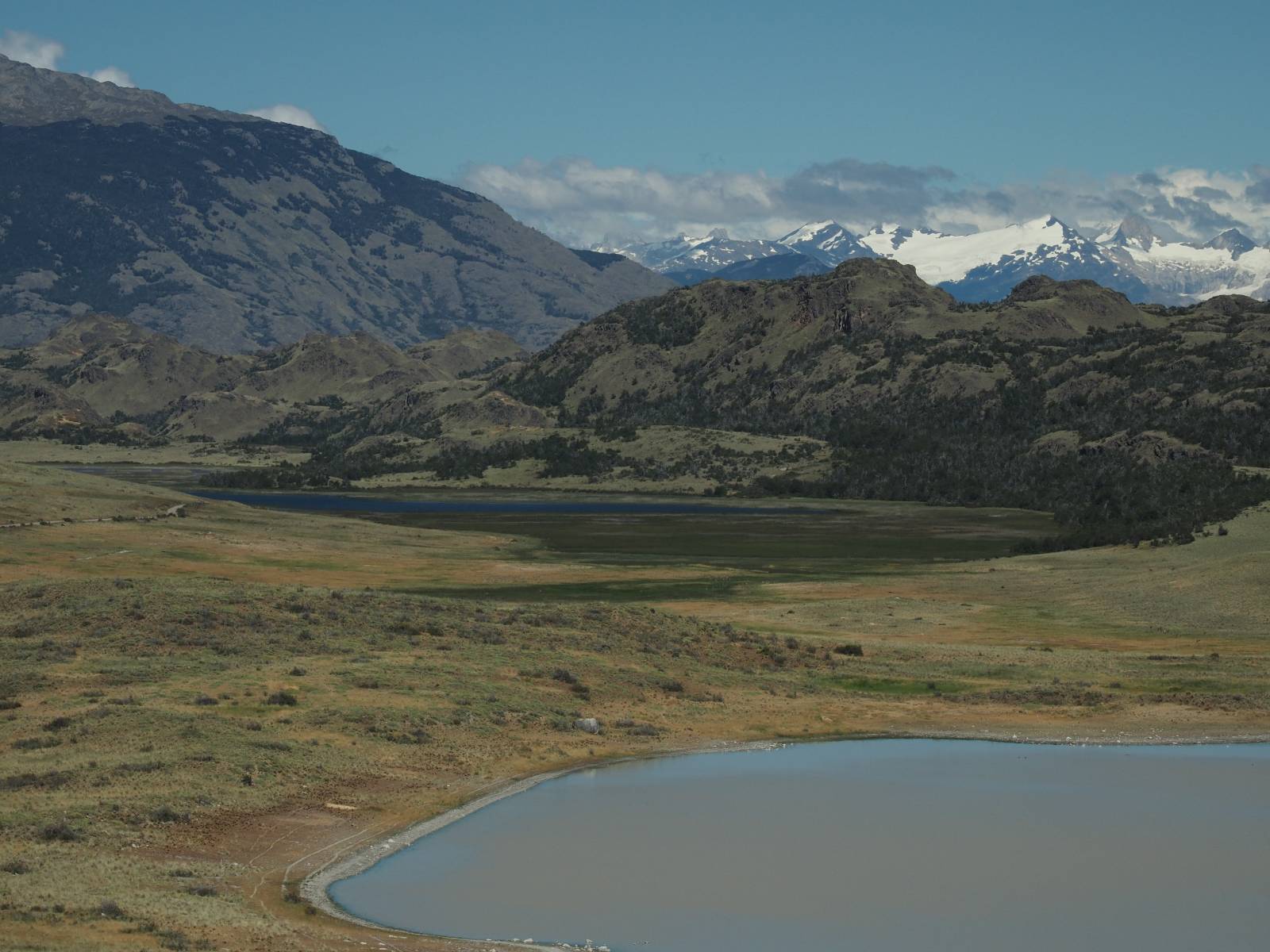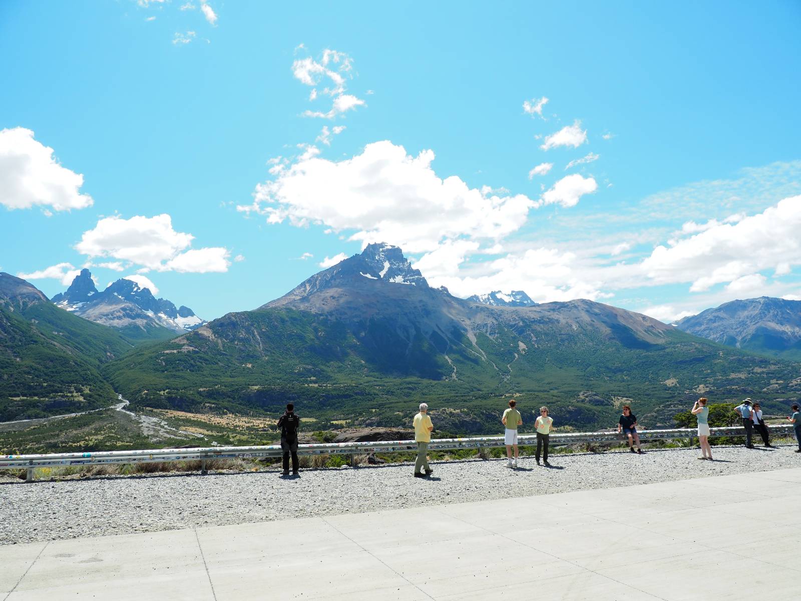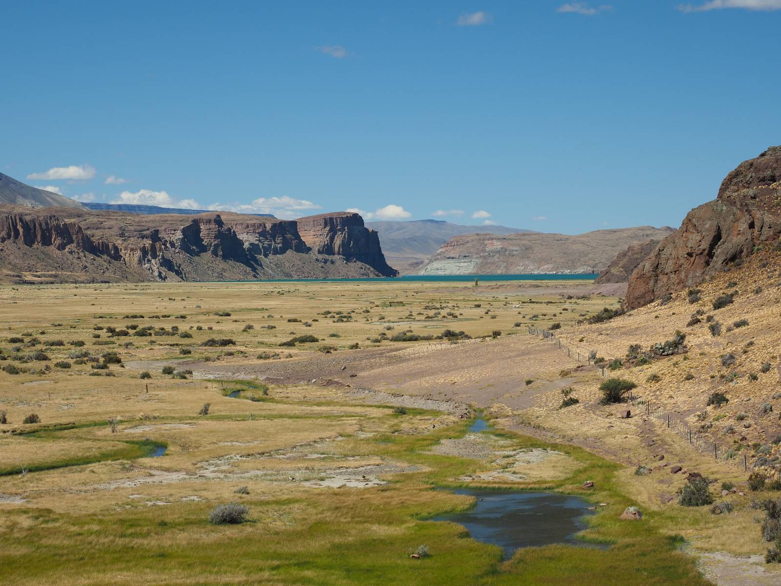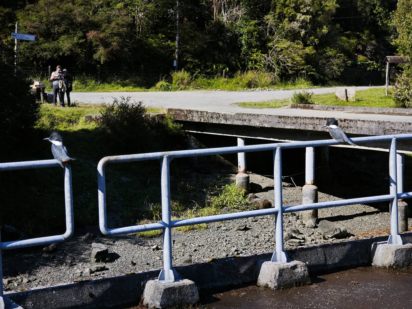Das Wetter bleibt verdammt schön! Nach einem Minifrühstück an einer Panaderia fahre ich noch an die Tankstelle. Doch bevor ich an der Panaderia loskomme, fährt Wolfgang ran. Lustigerweise hat er genau denselben Anzug wie ich an! Sein Kennzeichen wundert mich! Ich hatte ihn schon am Tag zuvor an der Tanke gesehen aber anhand des Kennzeichens nicht als Deutschen identifiziert. Er erklärt mir, dass er sich hat ein Art Mini-Chilenisches-Kennzeichen machen lassen und damit das Reguläre ersetzt. Auch wir haben mehr oder weniger die selbe Richtung, mal davon abgesehen, dass es bis Villa O’Higgins auch nicht so viel mehr gibt, es sei denn man biegt nach Argentinien ab. Ich lasse meinen Tank voll machen und als ich bezahlen will heißt es Systemausfall! Es kann nicht mehr bezahlt werden! Ist mir ja fast erstmal egal, der Tank ist ja voll. Der Kollege meint Bar geht auch nicht, da er keinen Beleg ausdrucken kann. Hm, also warten…, bis ein etwas jüngerer Tankwart vorbeikommt und der akzeptiert Bares! Das verschafft mir einen Vorsprung zu allen anderen, die noch tanken müssen und in die selbe Richtung wollen und bedeutet hoffentlich auch weniger Staub! Am blauen See entlang geht es weiter Richtung Süden und an einer ganz netten Stelle mit Aussicht steht Wolfgang und macht Frühstück! Recht hat er irgendwie! Aber trotzdem wirbeln einige die aus der anderen Richtung kommen wieder Staub auf! Schon bald komme ich über eine Brücke und das ist ja irre!! Der Fluß darunter ist blau! Ich bin schon drüber aber drehe nochmal um, um mir das ganz genau anzusehen! Es ist nicht so das übliche schöne blau, sondern blau blau! So richtig, als ob da einer einen riesiegen Topf blaue Farbe reingekippt hat. Irre faszinierend! Ich filme und mache Fotos und bin wirklich beeindruckt. Es hält auch jeder an, um sich diese Schauspiel anzuschauen! Ein Däne mit seine Argentinischen Freundin lässt die Drohne fliegen. Wir schnakken kurz und dann gehts weiter.