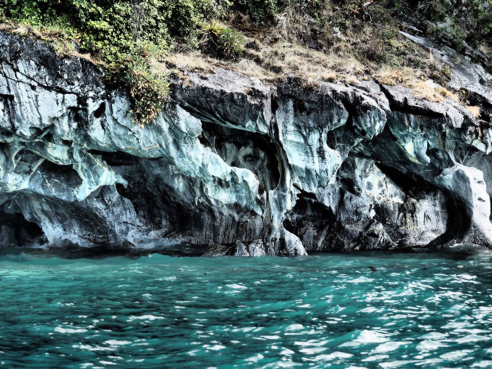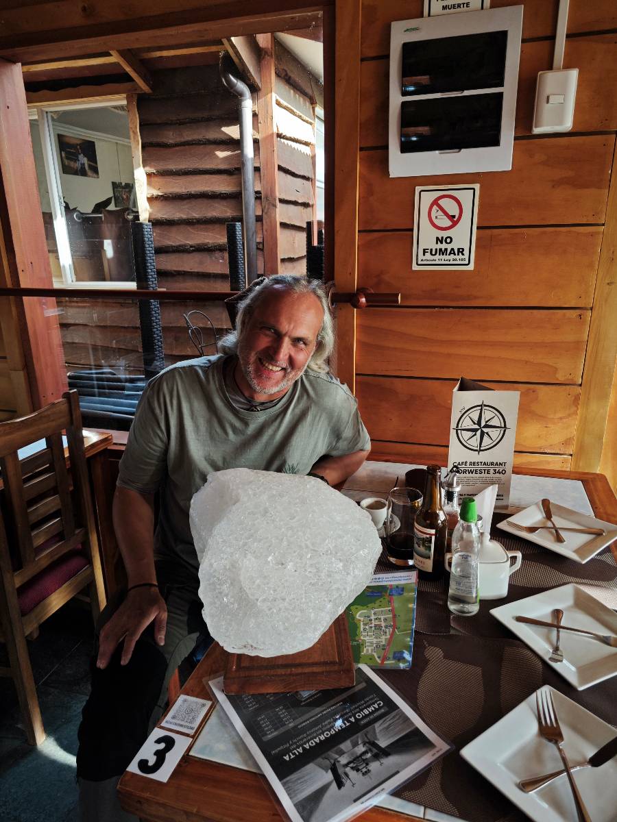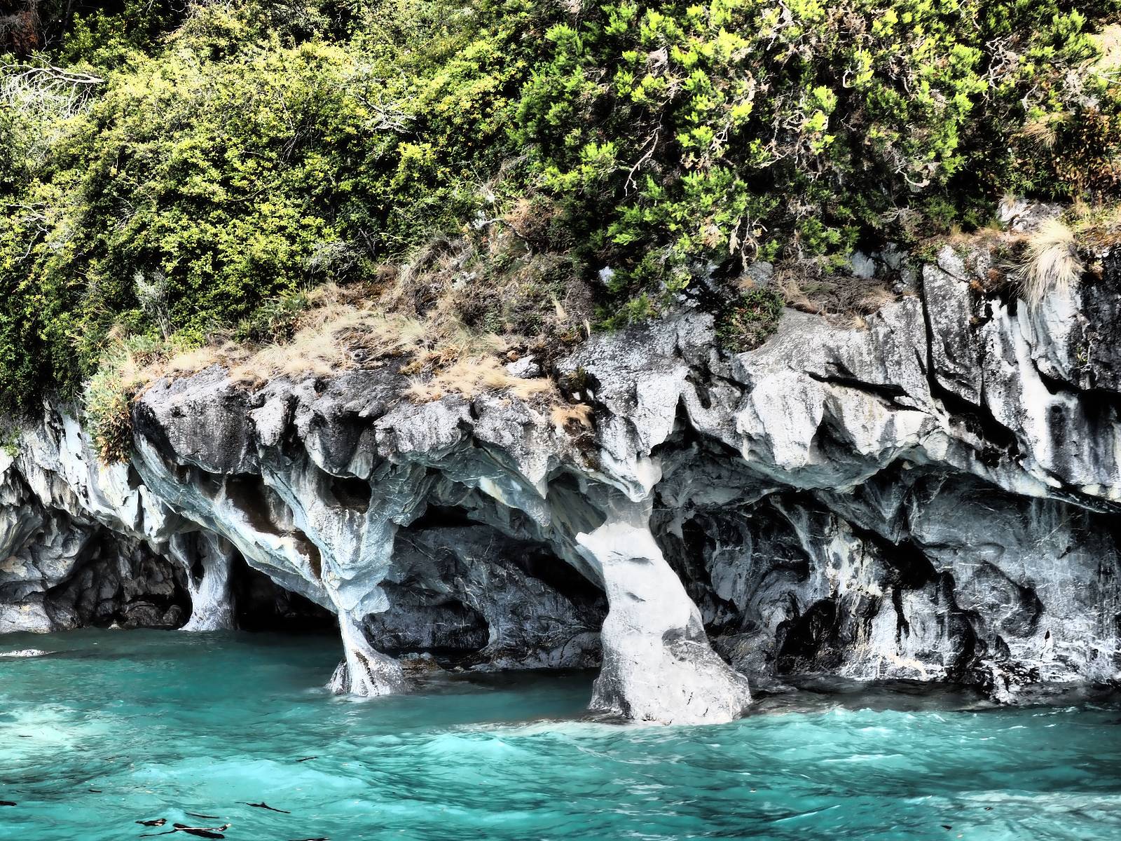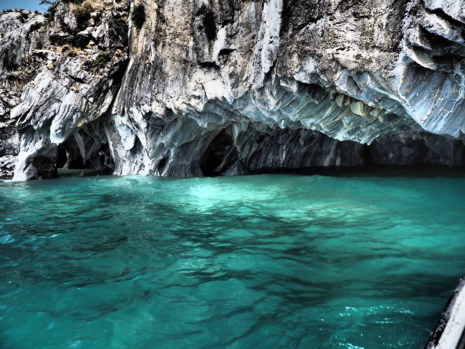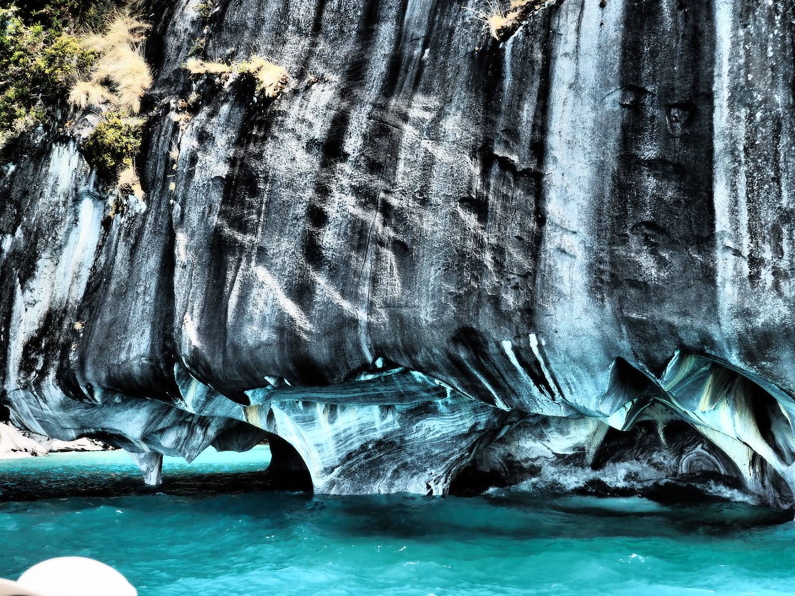 Auf gehts weiter nach Rio Tranquillo! Alles Schotter, der Wind steht fast und es staubt heftig! So manch Pickup ist wie immer schneller und die die ich einhole, denen folge ich in ihrer Wolke, bis sich die Chance zum überholen bietet! Ich hole Matthias ein und die jungen Columbianer auch und erreiche Rio Tranquillo. Aber nix Tranquillo! Hier tummelt sich mal wieder alles, was es so an Touristen zu geben scheint! Eijeijei, das wird schwierig! Das erste Hostal was ich anfahre, geführt von einem Deutschen Paar, dessen Dialekt mir vertraut scheint, nuwa, ist leider völlig ausgebucht! Sie geben mir zwar einen Tip aber auch da ist nichts zu bekommen. Mal wieder hängen auch diverse „keine Zimmer“ Schilder draußen. In einem kleinen Hostal könnte ich etwas für eine Nacht bekommen aber ich brauche zwei. Ich treffe auf der Straße Matthias wieder, bei ihm sieht es nicht viel besser aus und wir entscheiden, den Campingplatz auszuprobieren. Da bekommen wir gut Platz mit diversen Hühnern, die mit ihren Küken das Graß klein halten! Duschen und WC sind ok aber auch das habe ich schon besser erlebt! Aber das passt schon. Nachdem der Staub abgespühlt ist, geht es über den Stoppelacker von Fußballplatz direkt gegenüber ins Restaurant. Bier und Staek sind lecker und der Kellner sehr freundlich! Nach ein bisschen Schnak gibt er mir eine Karte, um evtl. noch eine geführte Tour in die Berge zu einem Gletscher zu machen. Ein junger Amerikaner bekommt das mit und fragt, ob er das abfotografieren darf. Ich erwähne es, weil er zumindest für uns alle Klischees eines „Amis“ erfüllt. Jung, kräftig, gut aussehend, lockiges Haar etwas versnobt, wie aus einer Soap Opera! 😉 Gut, ich gebe zu, um meinen Bauch müsste ich mich auch mal kümmern. 😂 Der Verdauungsspazierganz fürht uns an den See, um auszuloten was uns die Bootsfahrt zu den Marmolhölen kosten würde. Es kostet eigentlich bei jedem Anbieter das selbe und die eine Bude hat noch auf. Die Jungs sind geschäftstüchtig und bieten uns, wenn wir jetzt in Bar zahlen 10% Rabatt. Wahrscheinlich ist das ohnehin der normale Preis aber wir akzeptieren und haben somit die große Runde mit ein paar Inseln und den Marmorhölen in Sack und Tüten. Ich glaube wir hatten die 10:00 Uhr Tour genommen, so ein bisschen ausschlafen muss schon sein. Mit einer ordentlichen Geschwindigkeit geht es über den größten Binnensee Chiles zu erst zu ein paar Inseln mit Schiffswrack und wo ein Herzchirurg aus Coyhaique sein Wochenendhäuschen auf einer der Inseln stehen hat und dann weiter an den Inselkanten vorbei, die wunderbar ausgehölhte Marmorhölen bilden. Hier und da kann sogar unser Boot ein Stückchen reinfahren. Das sieht in dem blauen Wasser und dem Sonnenschein schon sehr fantastisch aus! Die Strukturen unterschiedlichen Grautöne, Streifen, Hölen und Säulen sind durchaus beeindruckend. Es geht nochmal für gute 10min im Highspeedtempo zur Catedral de Marmol und die ist noch einmal wirklich ein paar Nummern schöner anzusehen! Einige Kajakfahrer tummel sich da. Der Bursche aus New York ist auch dabei, natürlich Oberkörper frei, nur mit Schwimmweste, wäre ja auch nicht anders gegangen. Aber wie wir erfahren alles geführte Touren und wirklich nahe ran oder durchfahren darf man nicht. Sie passen zumindest sehr darauf auf, dass niemand etwas kaputt macht. Ein paar Idioten haben wohl vor ein paar Jahren angefangen sich mit ihren Namen verewigen zu wollen… Ich schieße unmengen an Fotos, mal sehen was davon was taugt. Also evtl. bekommt ihr viel zum Schauen, wenn ich nicht ordentlich aussortiere. Schließlich wir der Tag noch richtig angenehm warm und ich entschließe mich nach einem Spazierganz mit Kaffee und Kuchen, doch noch die Badehose zu holen. Am Strand treffe ich „Pi“ Paolo wieder der unterwegs Rowan mit seiner Triumpf Scrambler aufgegabelt hat. Rowan ist Ami, ebenfalls aus New York und er rückt mein Bild wieder gerade. Ich springe…, naja gehe langsam ins Wasser. Die oberen 20cm sind ja okay-frisch aber tiefer merkt man, dass das Wasser wohl auch von den Gletscherflüssen gespeist wird. Zumindes hat es nicht die Temperatur, um unbedingt eine halbe Stunde drin bleiben zu müssen!