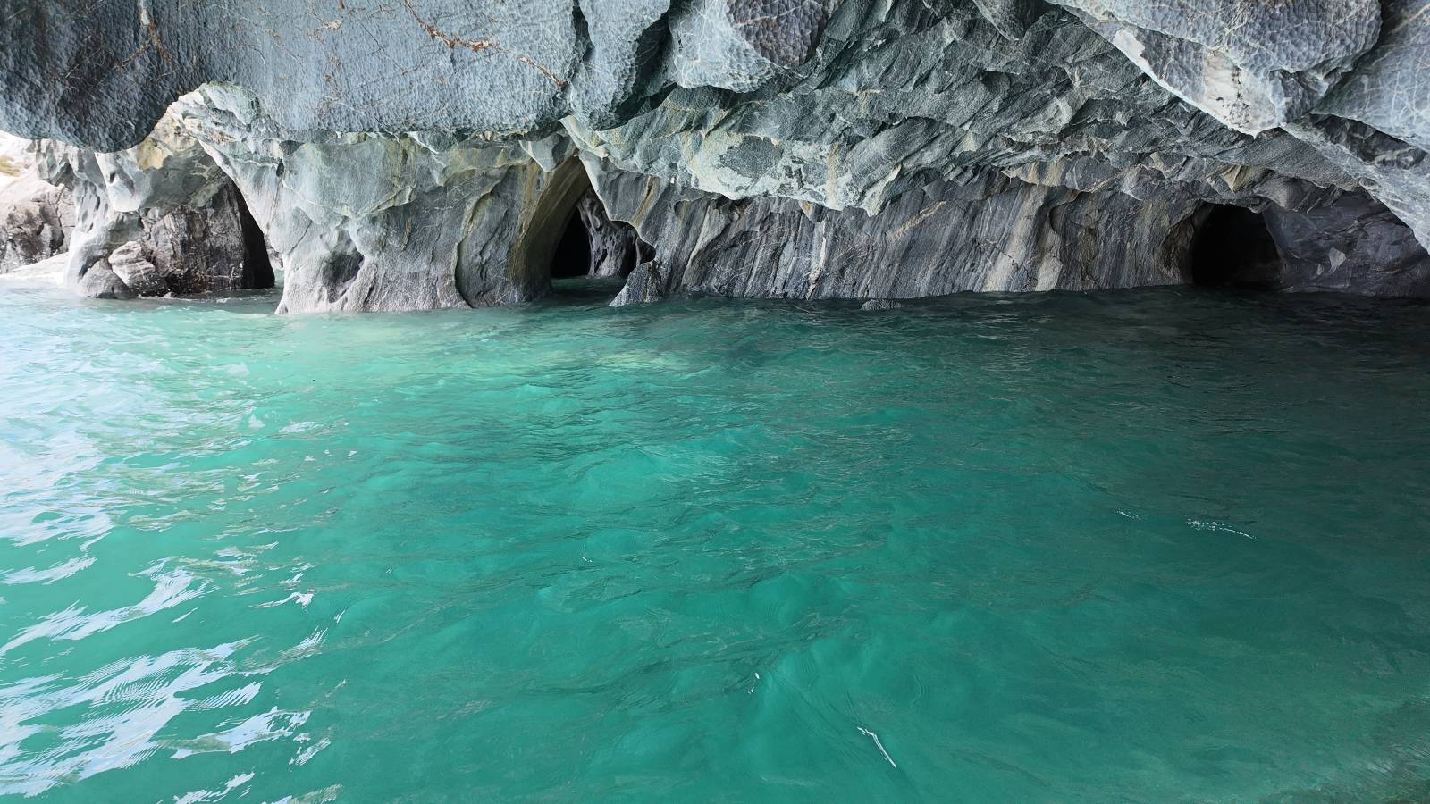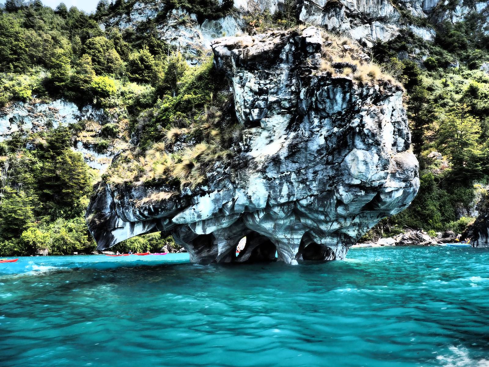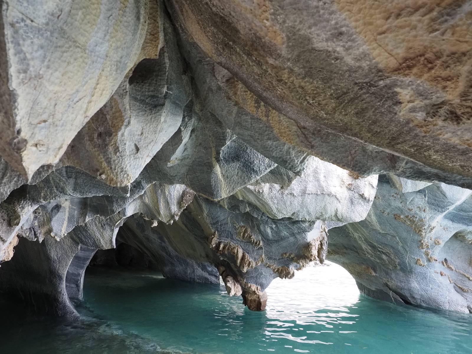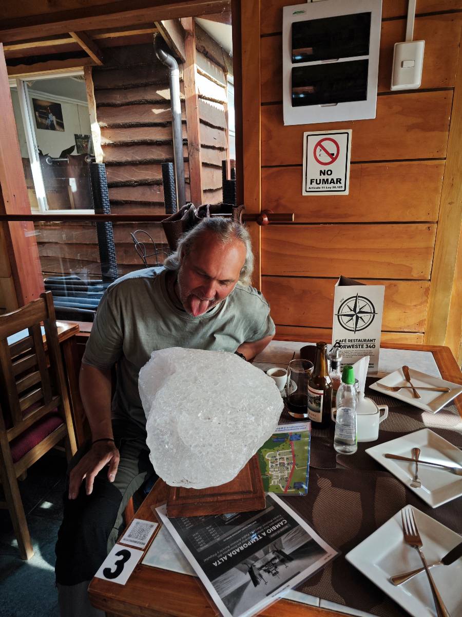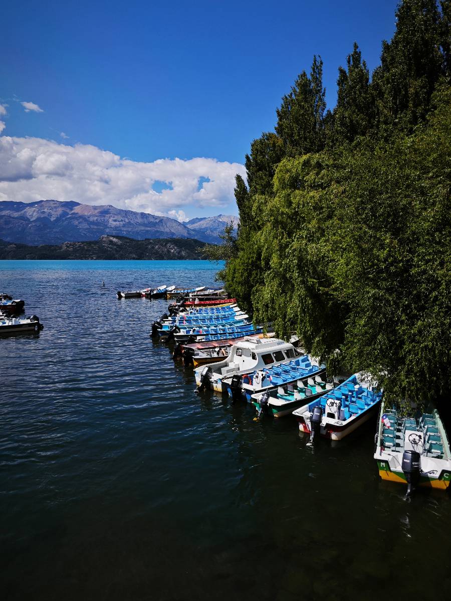 Auf gehts weiter nach Rio Tranquillo! Alles Schotter, der Wind steht fast und es staubt heftig! So manch Pickup ist wie immer schneller und die die ich einhole, denen folge ich in ihrer Wolke, bis sich die Chance zum überholen bietet! Ich hole Matthias ein und die jungen Columbianer auch und erreiche Rio Tranquillo. Aber nix Tranquillo! Hier tummelt sich mal wieder alles, was es so an Touristen zu geben scheint! Eijeijei, das wird schwierig! Das erste Hostal was ich anfahre, geführt von einem Deutschen Paar, dessen Dialekt mir vertraut scheint, nuwa, ist leider völlig ausgebucht! Sie geben mir zwar einen Tip aber auch da ist nichts zu bekommen. Mal wieder hängen auch diverse „keine Zimmer“ Schilder draußen. In einem kleinen Hostal könnte ich etwas für eine Nacht bekommen aber ich brauche zwei. Ich treffe auf der Straße Matthias wieder, bei ihm sieht es nicht viel besser aus und wir entscheiden, den Campingplatz auszuprobieren. Da bekommen wir gut Platz mit diversen Hühnern, die mit ihren Küken das Graß klein halten! Duschen und WC sind ok aber auch das habe ich schon besser erlebt! Aber das passt schon. Nachdem der Staub abgespühlt ist, geht es über den Stoppelacker von Fußballplatz direkt gegenüber ins Restaurant. Bier und Staek sind lecker und der Kellner sehr freundlich! Nach ein bisschen Schnak gibt er mir eine Karte, um evtl. noch eine geführte Tour in die Berge zu einem Gletscher zu machen. Ein junger Amerikaner bekommt das mit und fragt, ob er das abfotografieren darf. Ich erwähne es, weil er zumindest für uns alle Klischees eines „Amis“ erfüllt. Jung, kräftig, gut aussehend, lockiges Haar etwas versnobt, wie aus einer Soap Opera! 😉 Gut, ich gebe zu, um meinen Bauch müsste ich mich auch mal kümmern. 😂 Der Verdauungsspazierganz fürht uns an den See, um auszuloten was uns die Bootsfahrt zu den Marmolhölen kosten würde. Es kostet eigentlich bei jedem Anbieter das selbe und die eine Bude hat noch auf. Die Jungs sind geschäftstüchtig und bieten uns, wenn wir jetzt in Bar zahlen 10% Rabatt. Wahrscheinlich ist das ohnehin der normale Preis aber wir akzeptieren und haben somit die große Runde mit ein paar Inseln und den Marmorhölen in Sack und Tüten. Ich glaube wir hatten die 10:00 Uhr Tour genommen, so ein bisschen ausschlafen muss schon sein. Mit einer ordentlichen Geschwindigkeit geht es über den größten Binnensee Chiles zu erst zu ein paar Inseln mit Schiffswrack und wo ein Herzchirurg aus Coyhaique sein Wochenendhäuschen auf einer der Inseln stehen hat und dann weiter an den Inselkanten vorbei, die wunderbar ausgehölhte Marmorhölen bilden. Hier und da kann sogar unser Boot ein Stückchen reinfahren. Das sieht in dem blauen Wasser und dem Sonnenschein schon sehr fantastisch aus! Die Strukturen unterschiedlichen Grautöne, Streifen, Hölen und Säulen sind durchaus beeindruckend. Es geht nochmal für gute 10min im Highspeedtempo zur Catedral de Marmol und die ist noch einmal wirklich ein paar Nummern schöner anzusehen! Einige Kajakfahrer tummel sich da. Der Bursche aus New York ist auch dabei, natürlich Oberkörper frei, nur mit Schwimmweste, wäre ja auch nicht anders gegangen. Aber wie wir erfahren alles geführte Touren und wirklich nahe ran oder durchfahren darf man nicht. Sie passen zumindest sehr darauf auf, dass niemand etwas kaputt macht. Ein paar Idioten haben wohl vor ein paar Jahren angefangen sich mit ihren Namen verewigen zu wollen… Ich schieße unmengen an Fotos, mal sehen was davon was taugt. Also evtl. bekommt ihr viel zum Schauen, wenn ich nicht ordentlich aussortiere. Schließlich wir der Tag noch richtig angenehm warm und ich entschließe mich nach einem Spazierganz mit Kaffee und Kuchen, doch noch die Badehose zu holen. Am Strand treffe ich „Pi“ Paolo wieder der unterwegs Rowan mit seiner Triumpf Scrambler aufgegabelt hat. Rowan ist Ami, ebenfalls aus New York und er rückt mein Bild wieder gerade. Ich springe…, naja gehe langsam ins Wasser. Die oberen 20cm sind ja okay-frisch aber tiefer merkt man, dass das Wasser wohl auch von den Gletscherflüssen gespeist wird. Zumindes hat es nicht die Temperatur, um unbedingt eine halbe Stunde drin bleiben zu müssen!
