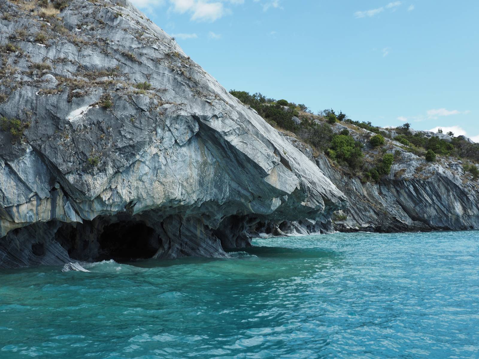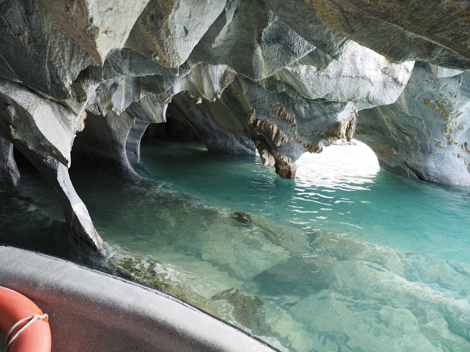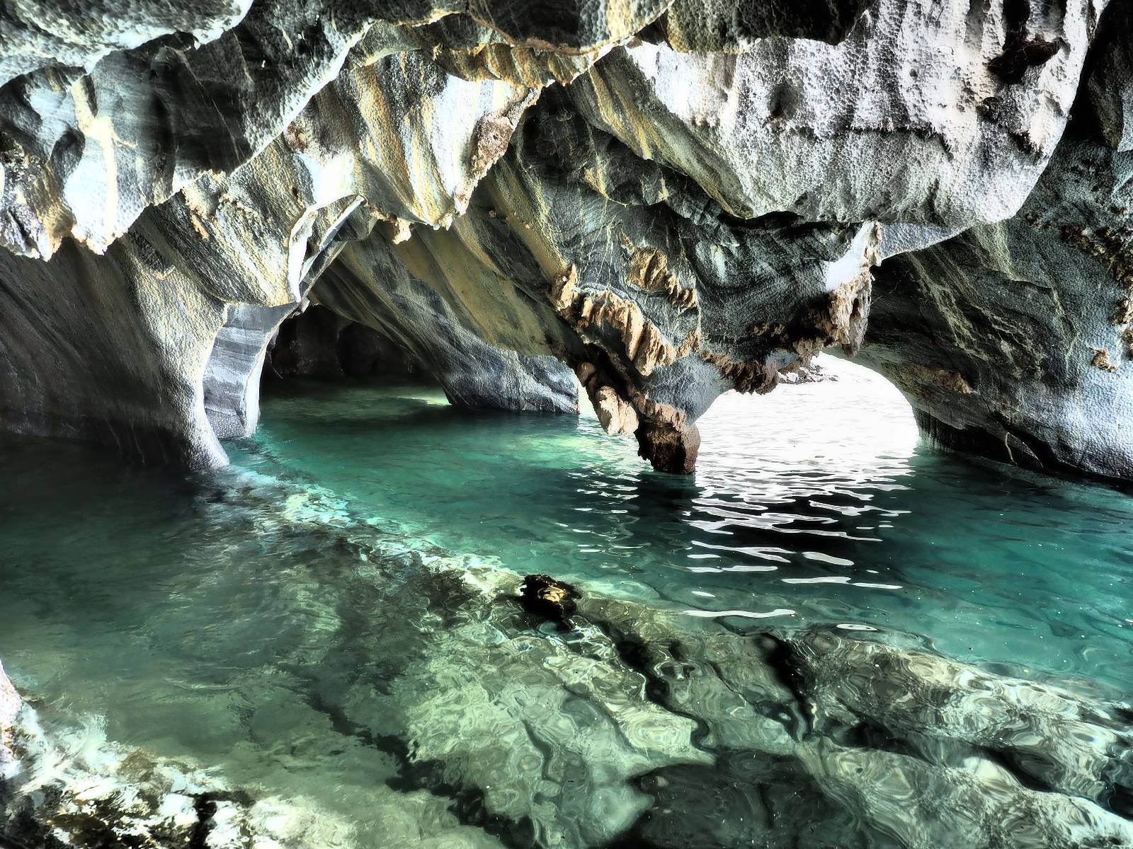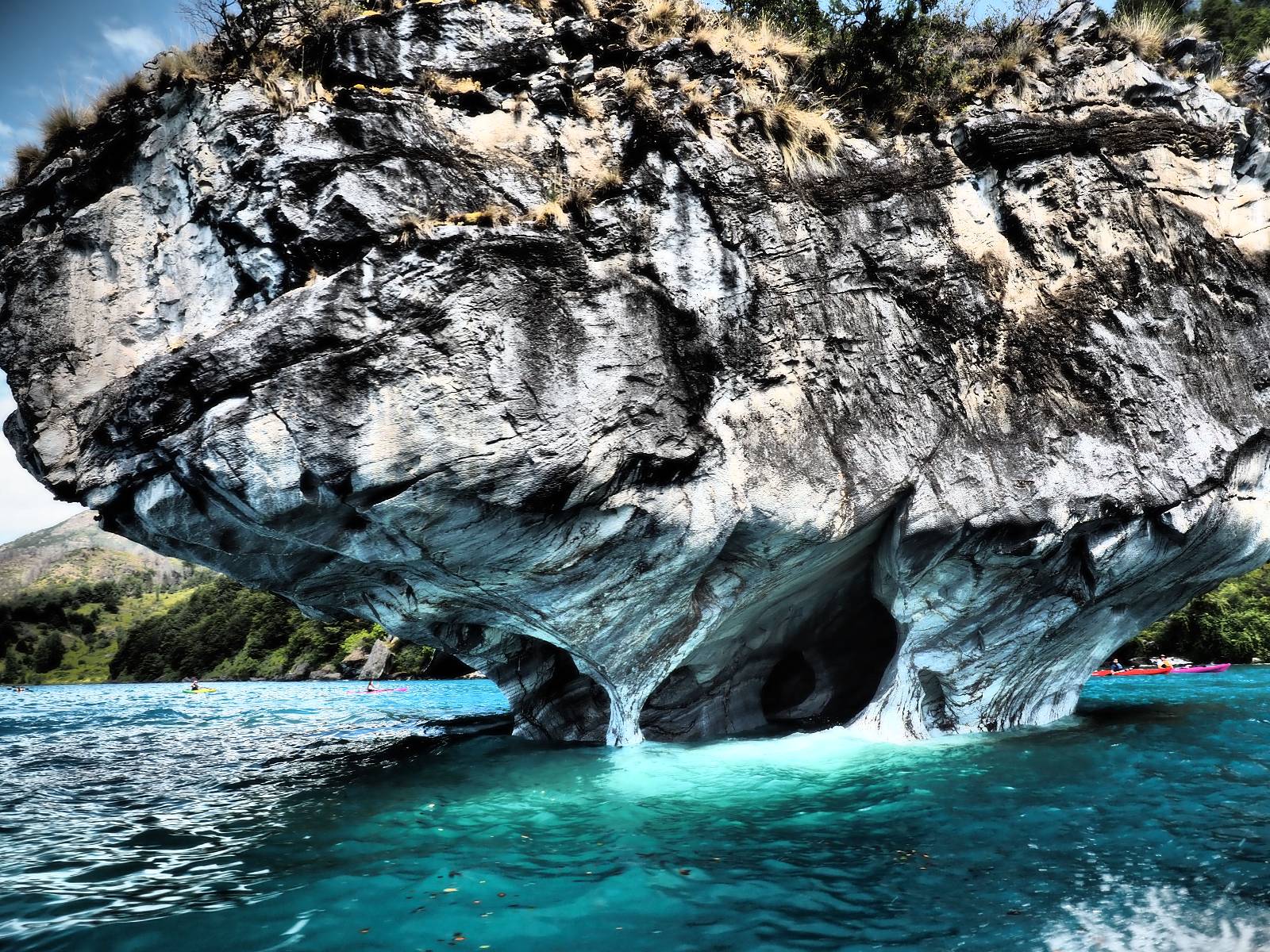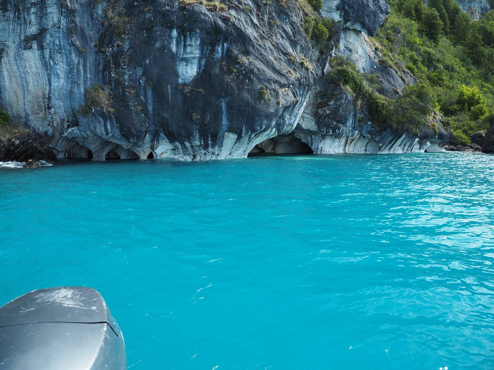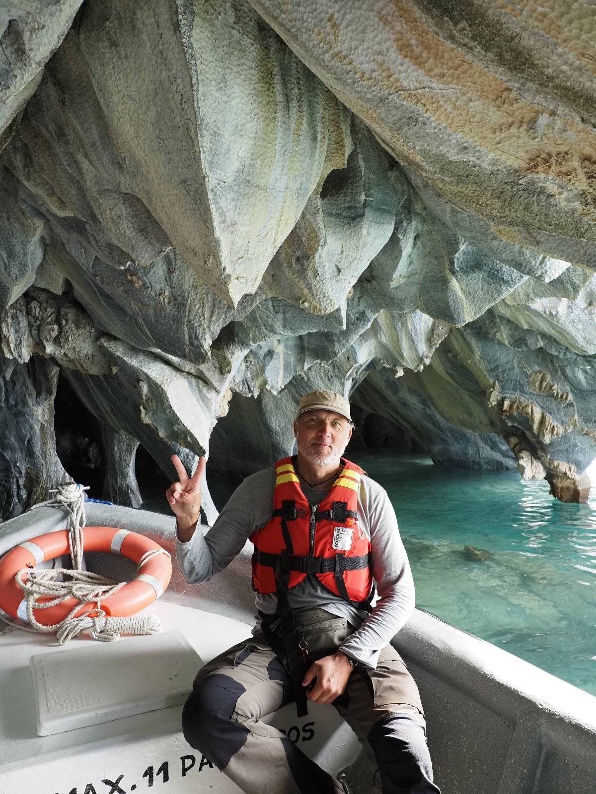 Auf gehts weiter nach Rio Tranquillo! Alles Schotter, der Wind steht fast und es staubt heftig! So manch Pickup ist wie immer schneller und die die ich einhole, denen folge ich in ihrer Wolke, bis sich die Chance zum überholen bietet! Ich hole Matthias ein und die jungen Columbianer auch und erreiche Rio Tranquillo. Aber nix Tranquillo! Hier tummelt sich mal wieder alles, was es so an Touristen zu geben scheint! Eijeijei, das wird schwierig! Das erste Hostal was ich anfahre, geführt von einem Deutschen Paar, dessen Dialekt mir vertraut scheint, nuwa, ist leider völlig ausgebucht! Sie geben mir zwar einen Tip aber auch da ist nichts zu bekommen. Mal wieder hängen auch diverse „keine Zimmer“ Schilder draußen. In einem kleinen Hostal könnte ich etwas für eine Nacht bekommen aber ich brauche zwei. Ich treffe auf der Straße Matthias wieder, bei ihm sieht es nicht viel besser aus und wir entscheiden, den Campingplatz auszuprobieren. Da bekommen wir gut Platz mit diversen Hühnern, die mit ihren Küken das Graß klein halten! Duschen und WC sind ok aber auch das habe ich schon besser erlebt! Aber das passt schon. Nachdem der Staub abgespühlt ist, geht es über den Stoppelacker von Fußballplatz direkt gegenüber ins Restaurant. Bier und Staek sind lecker und der Kellner sehr freundlich! Nach ein bisschen Schnak gibt er mir eine Karte, um evtl. noch eine geführte Tour in die Berge zu einem Gletscher zu machen. Ein junger Amerikaner bekommt das mit und fragt, ob er das abfotografieren darf. Ich erwähne es, weil er zumindest für uns alle Klischees eines „Amis“ erfüllt. Jung, kräftig, gut aussehend, lockiges Haar etwas versnobt, wie aus einer Soap Opera! 😉 Gut, ich gebe zu, um meinen Bauch müsste ich mich auch mal kümmern. 😂 Der Verdauungsspazierganz fürht uns an den See, um auszuloten was uns die Bootsfahrt zu den Marmolhölen kosten würde. Es kostet eigentlich bei jedem Anbieter das selbe und die eine Bude hat noch auf. Die Jungs sind geschäftstüchtig und bieten uns, wenn wir jetzt in Bar zahlen 10% Rabatt. Wahrscheinlich ist das ohnehin der normale Preis aber wir akzeptieren und haben somit die große Runde mit ein paar Inseln und den Marmorhölen in Sack und Tüten. Ich glaube wir hatten die 10:00 Uhr Tour genommen, so ein bisschen ausschlafen muss schon sein. Mit einer ordentlichen Geschwindigkeit geht es über den größten Binnensee Chiles zu erst zu ein paar Inseln mit Schiffswrack und wo ein Herzchirurg aus Coyhaique sein Wochenendhäuschen auf einer der Inseln stehen hat und dann weiter an den Inselkanten vorbei, die wunderbar ausgehölhte Marmorhölen bilden. Hier und da kann sogar unser Boot ein Stückchen reinfahren. Das sieht in dem blauen Wasser und dem Sonnenschein schon sehr fantastisch aus! Die Strukturen unterschiedlichen Grautöne, Streifen, Hölen und Säulen sind durchaus beeindruckend. Es geht nochmal für gute 10min im Highspeedtempo zur Catedral de Marmol und die ist noch einmal wirklich ein paar Nummern schöner anzusehen! Einige Kajakfahrer tummel sich da. Der Bursche aus New York ist auch dabei, natürlich Oberkörper frei, nur mit Schwimmweste, wäre ja auch nicht anders gegangen. Aber wie wir erfahren alles geführte Touren und wirklich nahe ran oder durchfahren darf man nicht. Sie passen zumindest sehr darauf auf, dass niemand etwas kaputt macht. Ein paar Idioten haben wohl vor ein paar Jahren angefangen sich mit ihren Namen verewigen zu wollen… Ich schieße unmengen an Fotos, mal sehen was davon was taugt. Also evtl. bekommt ihr viel zum Schauen, wenn ich nicht ordentlich aussortiere. Schließlich wir der Tag noch richtig angenehm warm und ich entschließe mich nach einem Spazierganz mit Kaffee und Kuchen, doch noch die Badehose zu holen. Am Strand treffe ich „Pi“ Paolo wieder der unterwegs Rowan mit seiner Triumpf Scrambler aufgegabelt hat. Rowan ist Ami, ebenfalls aus New York und er rückt mein Bild wieder gerade. Ich springe…, naja gehe langsam ins Wasser. Die oberen 20cm sind ja okay-frisch aber tiefer merkt man, dass das Wasser wohl auch von den Gletscherflüssen gespeist wird. Zumindes hat es nicht die Temperatur, um unbedingt eine halbe Stunde drin bleiben zu müssen!