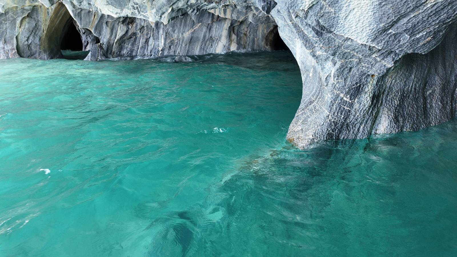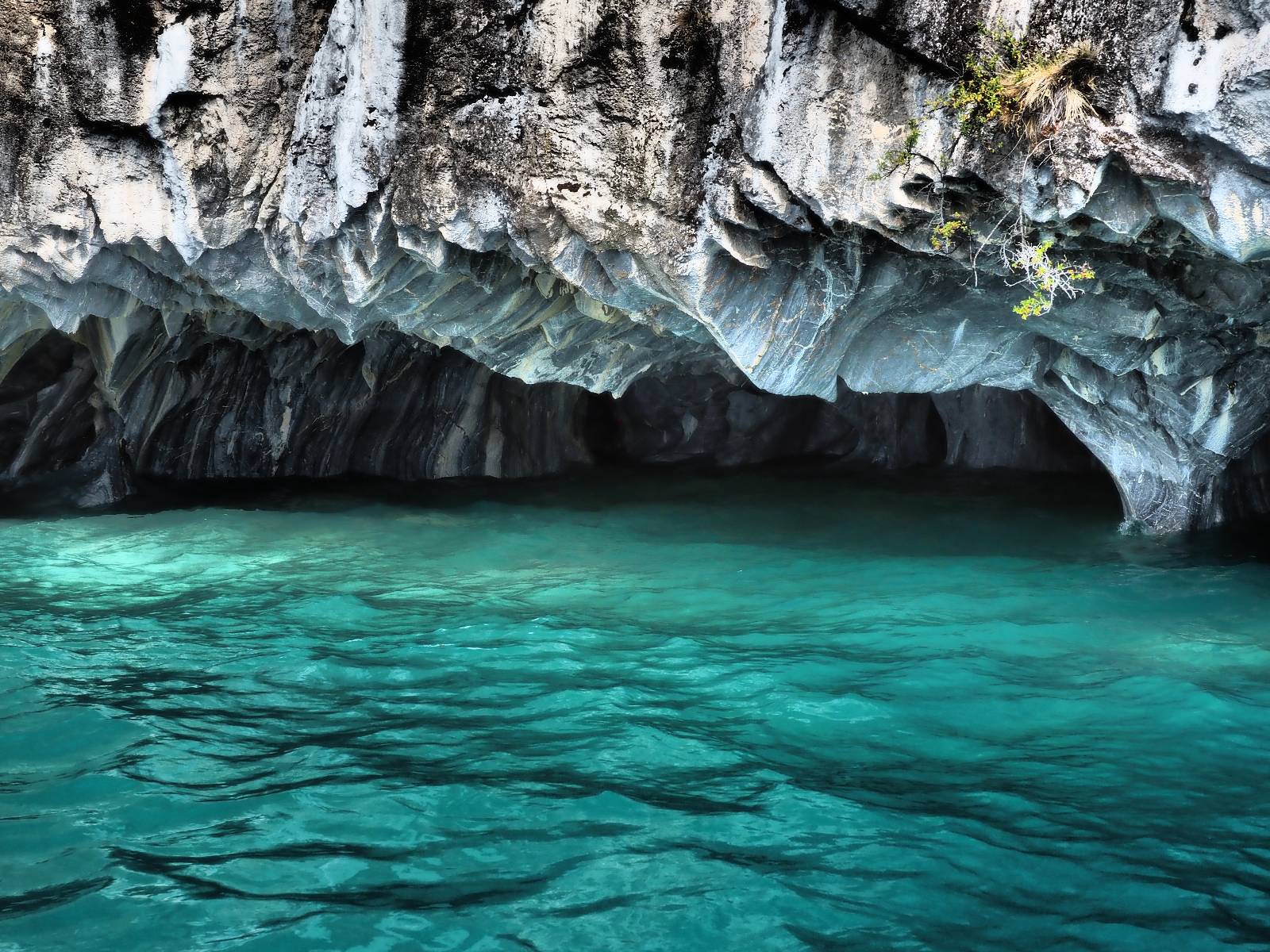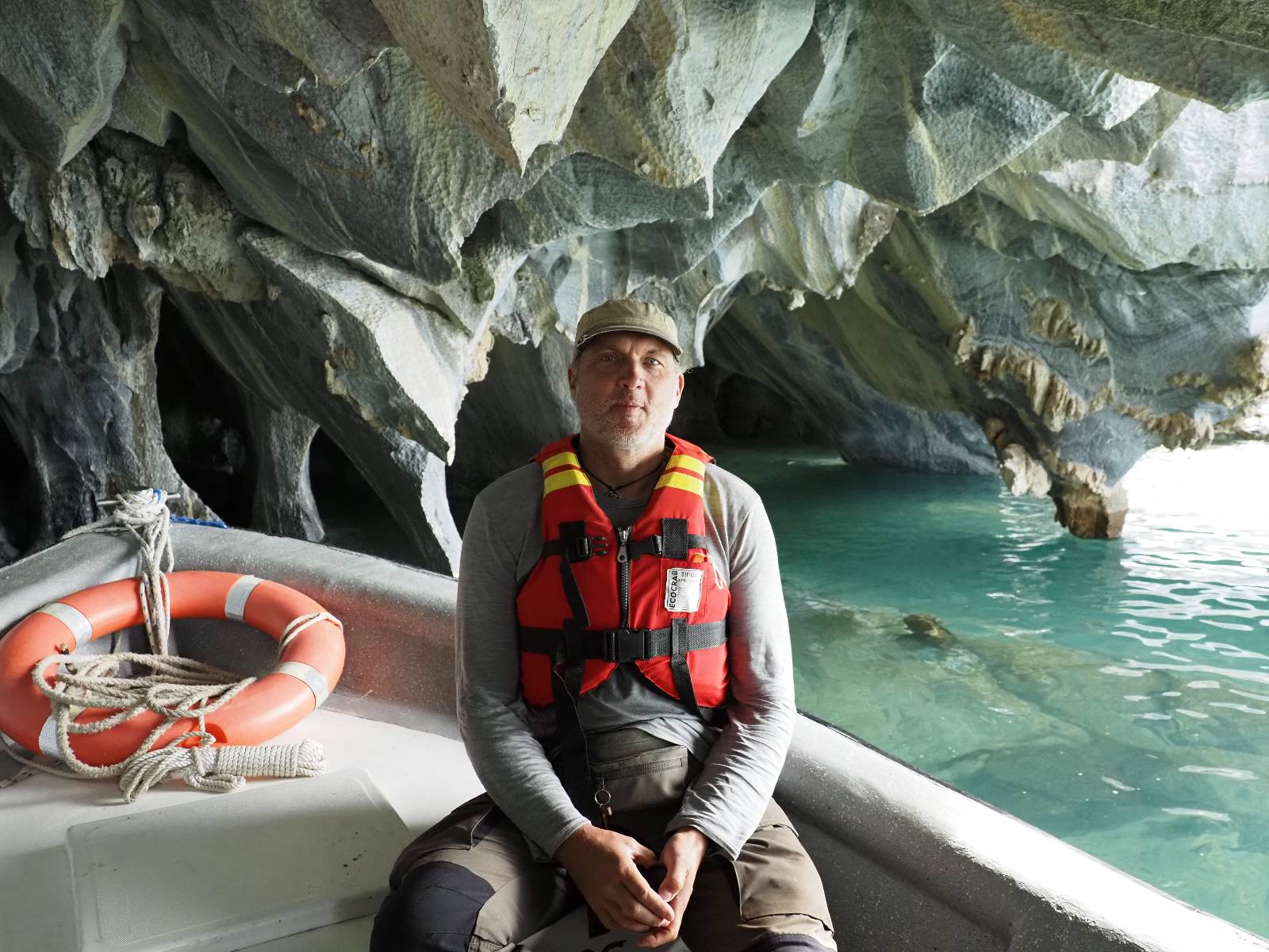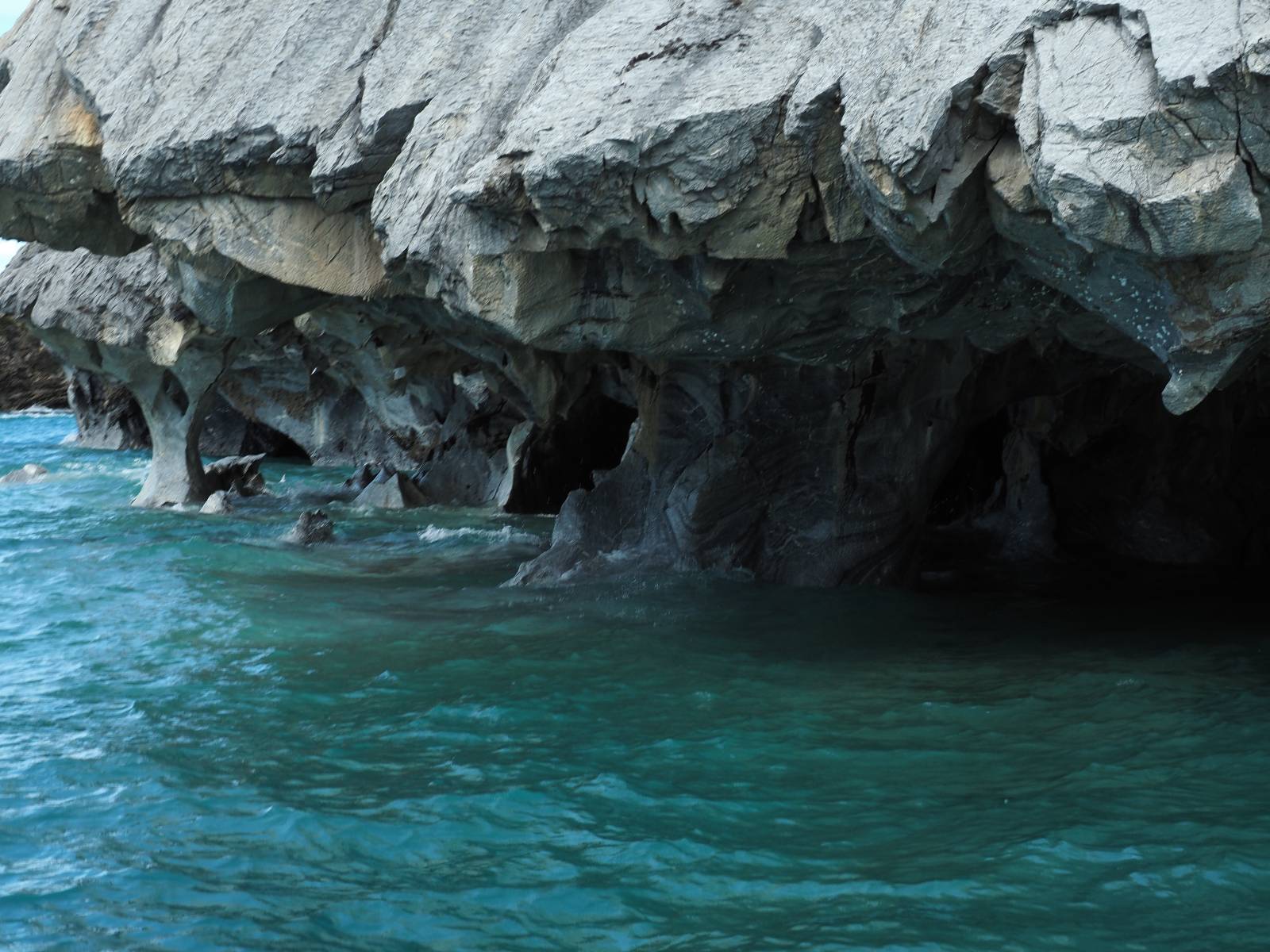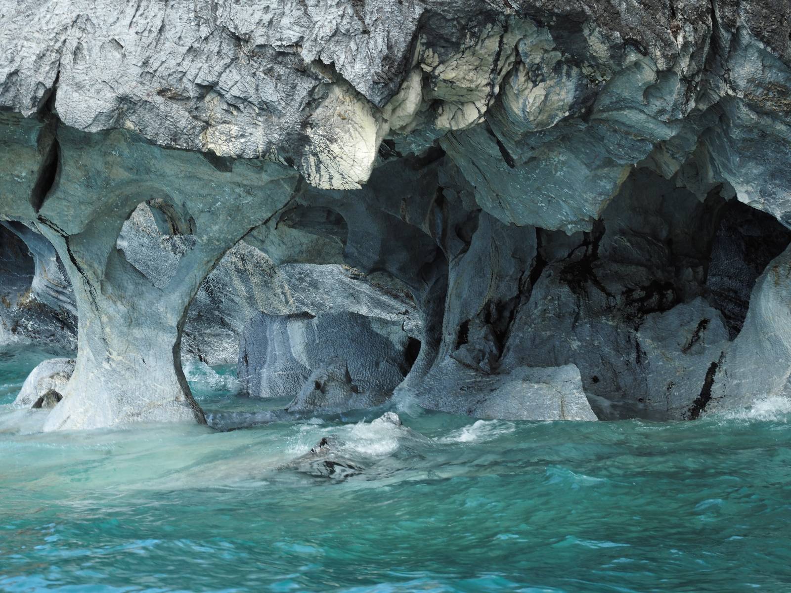 Auf gehts weiter nach Rio Tranquillo! Alles Schotter, der Wind steht fast und es staubt heftig! So manch Pickup ist wie immer schneller und die die ich einhole, denen folge ich in ihrer Wolke, bis sich die Chance zum überholen bietet! Ich hole Matthias ein und die jungen Columbianer auch und erreiche Rio Tranquillo. Aber nix Tranquillo! Hier tummelt sich mal wieder alles, was es so an Touristen zu geben scheint! Eijeijei, das wird schwierig! Das erste Hostal was ich anfahre, geführt von einem Deutschen Paar, dessen Dialekt mir vertraut scheint, nuwa, ist leider völlig ausgebucht! Sie geben mir zwar einen Tip aber auch da ist nichts zu bekommen. Mal wieder hängen auch diverse „keine Zimmer“ Schilder draußen. In einem kleinen Hostal könnte ich etwas für eine Nacht bekommen aber ich brauche zwei. Ich treffe auf der Straße Matthias wieder, bei ihm sieht es nicht viel besser aus und wir entscheiden, den Campingplatz auszuprobieren. Da bekommen wir gut Platz mit diversen Hühnern, die mit ihren Küken das Graß klein halten! Duschen und WC sind ok aber auch das habe ich schon besser erlebt! Aber das passt schon. Nachdem der Staub abgespühlt ist, geht es über den Stoppelacker von Fußballplatz direkt gegenüber ins Restaurant. Bier und Staek sind lecker und der Kellner sehr freundlich! Nach ein bisschen Schnak gibt er mir eine Karte, um evtl. noch eine geführte Tour in die Berge zu einem Gletscher zu machen. Ein junger Amerikaner bekommt das mit und fragt, ob er das abfotografieren darf. Ich erwähne es, weil er zumindest für uns alle Klischees eines „Amis“ erfüllt. Jung, kräftig, gut aussehend, lockiges Haar etwas versnobt, wie aus einer Soap Opera! 😉 Gut, ich gebe zu, um meinen Bauch müsste ich mich auch mal kümmern. 😂 Der Verdauungsspazierganz fürht uns an den See, um auszuloten was uns die Bootsfahrt zu den Marmolhölen kosten würde. Es kostet eigentlich bei jedem Anbieter das selbe und die eine Bude hat noch auf. Die Jungs sind geschäftstüchtig und bieten uns, wenn wir jetzt in Bar zahlen 10% Rabatt. Wahrscheinlich ist das ohnehin der normale Preis aber wir akzeptieren und haben somit die große Runde mit ein paar Inseln und den Marmorhölen in Sack und Tüten. Ich glaube wir hatten die 10:00 Uhr Tour genommen, so ein bisschen ausschlafen muss schon sein. Mit einer ordentlichen Geschwindigkeit geht es über den größten Binnensee Chiles zu erst zu ein paar Inseln mit Schiffswrack und wo ein Herzchirurg aus Coyhaique sein Wochenendhäuschen auf einer der Inseln stehen hat und dann weiter an den Inselkanten vorbei, die wunderbar ausgehölhte Marmorhölen bilden. Hier und da kann sogar unser Boot ein Stückchen reinfahren. Das sieht in dem blauen Wasser und dem Sonnenschein schon sehr fantastisch aus! Die Strukturen unterschiedlichen Grautöne, Streifen, Hölen und Säulen sind durchaus beeindruckend. Es geht nochmal für gute 10min im Highspeedtempo zur Catedral de Marmol und die ist noch einmal wirklich ein paar Nummern schöner anzusehen! Einige Kajakfahrer tummel sich da. Der Bursche aus New York ist auch dabei, natürlich Oberkörper frei, nur mit Schwimmweste, wäre ja auch nicht anders gegangen. Aber wie wir erfahren alles geführte Touren und wirklich nahe ran oder durchfahren darf man nicht. Sie passen zumindest sehr darauf auf, dass niemand etwas kaputt macht. Ein paar Idioten haben wohl vor ein paar Jahren angefangen sich mit ihren Namen verewigen zu wollen… Ich schieße unmengen an Fotos, mal sehen was davon was taugt. Also evtl. bekommt ihr viel zum Schauen, wenn ich nicht ordentlich aussortiere. Schließlich wir der Tag noch richtig angenehm warm und ich entschließe mich nach einem Spazierganz mit Kaffee und Kuchen, doch noch die Badehose zu holen. Am Strand treffe ich „Pi“ Paolo wieder der unterwegs Rowan mit seiner Triumpf Scrambler aufgegabelt hat. Rowan ist Ami, ebenfalls aus New York und er rückt mein Bild wieder gerade. Ich springe…, naja gehe langsam ins Wasser. Die oberen 20cm sind ja okay-frisch aber tiefer merkt man, dass das Wasser wohl auch von den Gletscherflüssen gespeist wird. Zumindes hat es nicht die Temperatur, um unbedingt eine halbe Stunde drin bleiben zu müssen!