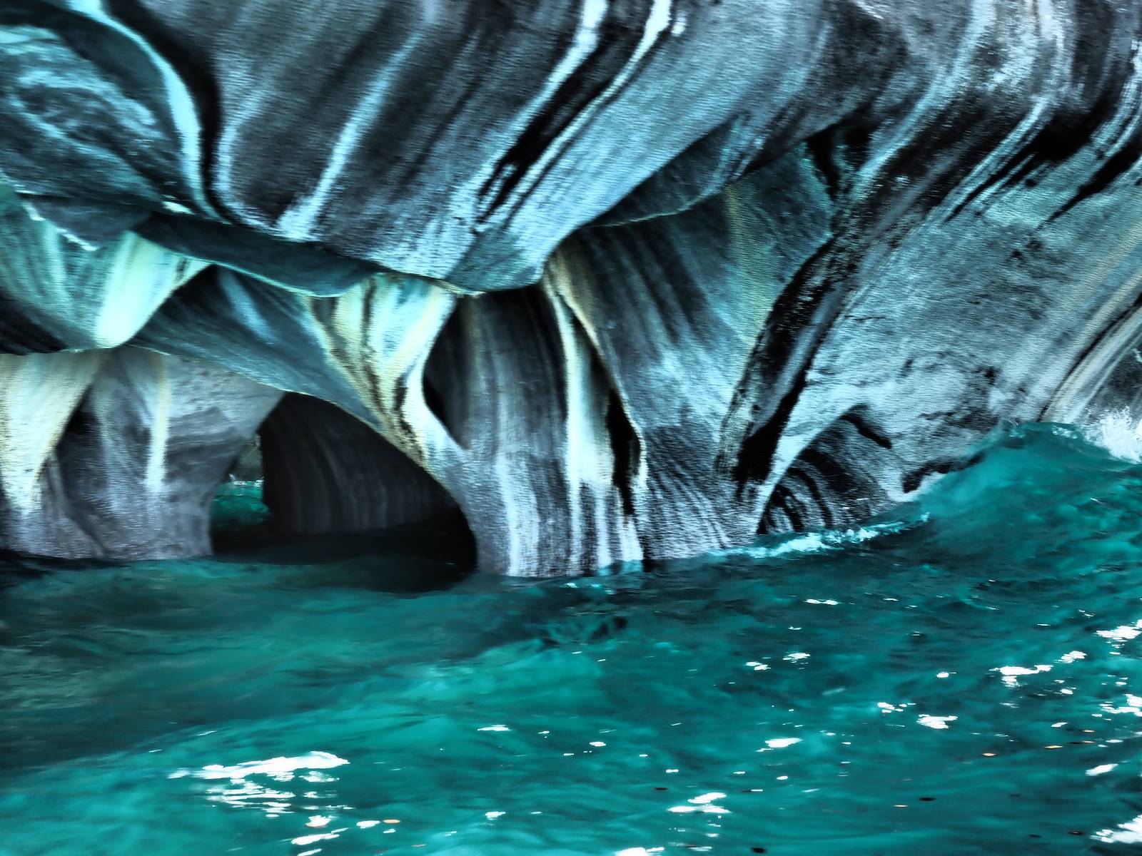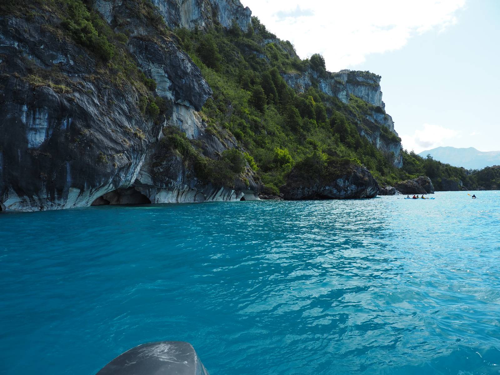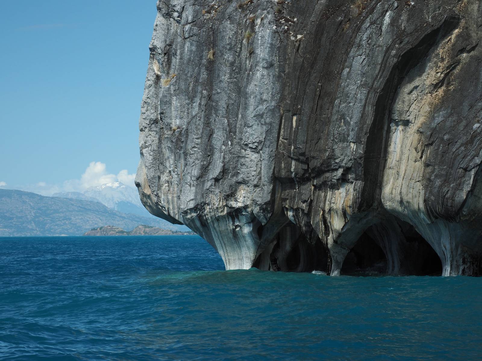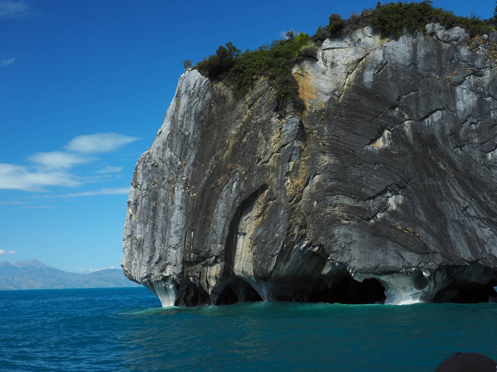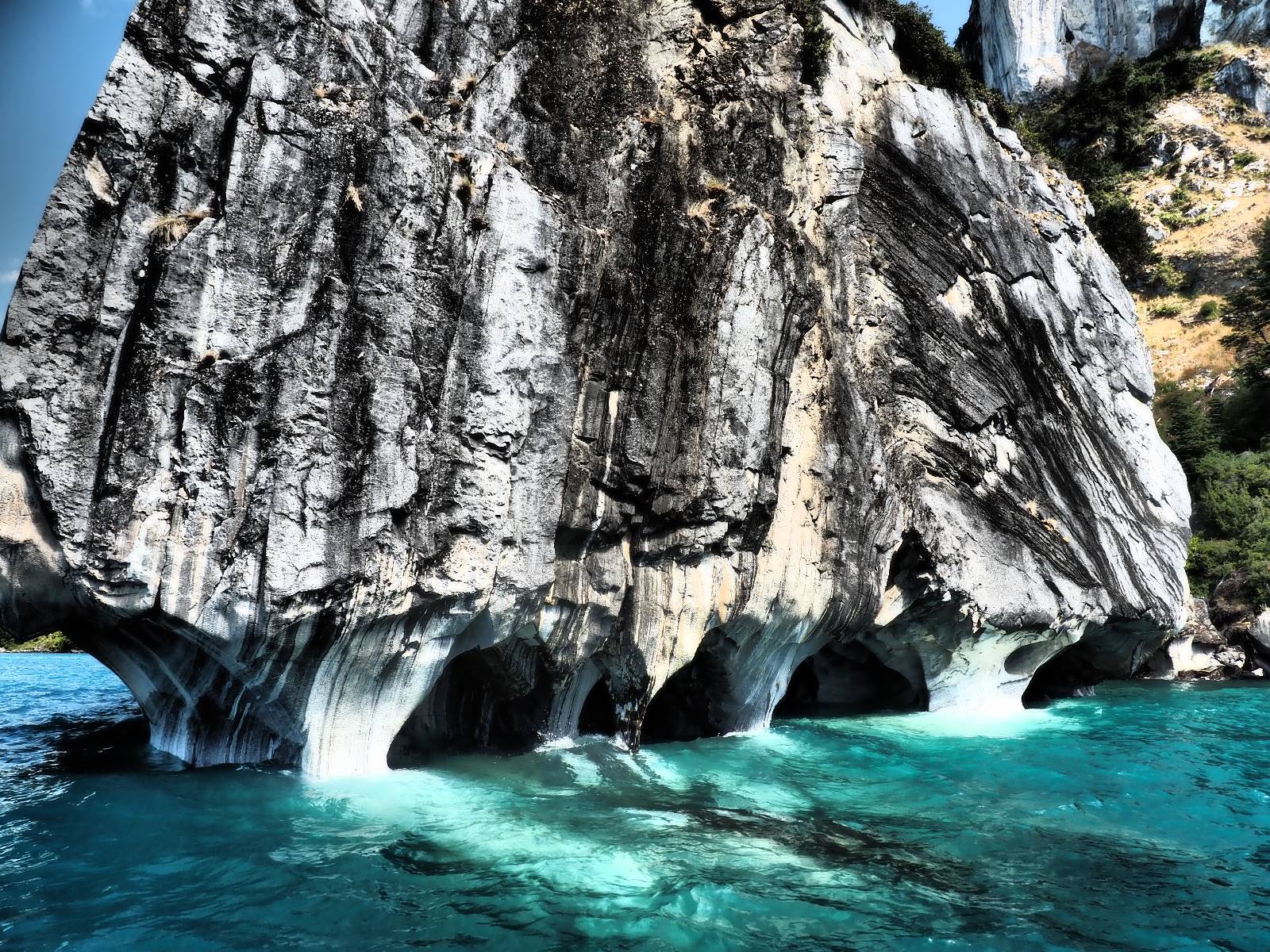 Auf gehts weiter nach Rio Tranquillo! Alles Schotter, der Wind steht fast und es staubt heftig! So manch Pickup ist wie immer schneller und die die ich einhole, denen folge ich in ihrer Wolke, bis sich die Chance zum überholen bietet! Ich hole Matthias ein und die jungen Columbianer auch und erreiche Rio Tranquillo. Aber nix Tranquillo! Hier tummelt sich mal wieder alles, was es so an Touristen zu geben scheint! Eijeijei, das wird schwierig! Das erste Hostal was ich anfahre, geführt von einem Deutschen Paar, dessen Dialekt mir vertraut scheint, nuwa, ist leider völlig ausgebucht! Sie geben mir zwar einen Tip aber auch da ist nichts zu bekommen. Mal wieder hängen auch diverse „keine Zimmer“ Schilder draußen. In einem kleinen Hostal könnte ich etwas für eine Nacht bekommen aber ich brauche zwei. Ich treffe auf der Straße Matthias wieder, bei ihm sieht es nicht viel besser aus und wir entscheiden, den Campingplatz auszuprobieren. Da bekommen wir gut Platz mit diversen Hühnern, die mit ihren Küken das Graß klein halten! Duschen und WC sind ok aber auch das habe ich schon besser erlebt! Aber das passt schon. Nachdem der Staub abgespühlt ist, geht es über den Stoppelacker von Fußballplatz direkt gegenüber ins Restaurant. Bier und Staek sind lecker und der Kellner sehr freundlich! Nach ein bisschen Schnak gibt er mir eine Karte, um evtl. noch eine geführte Tour in die Berge zu einem Gletscher zu machen. Ein junger Amerikaner bekommt das mit und fragt, ob er das abfotografieren darf. Ich erwähne es, weil er zumindest für uns alle Klischees eines „Amis“ erfüllt. Jung, kräftig, gut aussehend, lockiges Haar etwas versnobt, wie aus einer Soap Opera! 😉 Gut, ich gebe zu, um meinen Bauch müsste ich mich auch mal kümmern. 😂 Der Verdauungsspazierganz fürht uns an den See, um auszuloten was uns die Bootsfahrt zu den Marmolhölen kosten würde. Es kostet eigentlich bei jedem Anbieter das selbe und die eine Bude hat noch auf. Die Jungs sind geschäftstüchtig und bieten uns, wenn wir jetzt in Bar zahlen 10% Rabatt. Wahrscheinlich ist das ohnehin der normale Preis aber wir akzeptieren und haben somit die große Runde mit ein paar Inseln und den Marmorhölen in Sack und Tüten. Ich glaube wir hatten die 10:00 Uhr Tour genommen, so ein bisschen ausschlafen muss schon sein. Mit einer ordentlichen Geschwindigkeit geht es über den größten Binnensee Chiles zu erst zu ein paar Inseln mit Schiffswrack und wo ein Herzchirurg aus Coyhaique sein Wochenendhäuschen auf einer der Inseln stehen hat und dann weiter an den Inselkanten vorbei, die wunderbar ausgehölhte Marmorhölen bilden. Hier und da kann sogar unser Boot ein Stückchen reinfahren. Das sieht in dem blauen Wasser und dem Sonnenschein schon sehr fantastisch aus! Die Strukturen unterschiedlichen Grautöne, Streifen, Hölen und Säulen sind durchaus beeindruckend. Es geht nochmal für gute 10min im Highspeedtempo zur Catedral de Marmol und die ist noch einmal wirklich ein paar Nummern schöner anzusehen! Einige Kajakfahrer tummel sich da. Der Bursche aus New York ist auch dabei, natürlich Oberkörper frei, nur mit Schwimmweste, wäre ja auch nicht anders gegangen. Aber wie wir erfahren alles geführte Touren und wirklich nahe ran oder durchfahren darf man nicht. Sie passen zumindest sehr darauf auf, dass niemand etwas kaputt macht. Ein paar Idioten haben wohl vor ein paar Jahren angefangen sich mit ihren Namen verewigen zu wollen… Ich schieße unmengen an Fotos, mal sehen was davon was taugt. Also evtl. bekommt ihr viel zum Schauen, wenn ich nicht ordentlich aussortiere. Schließlich wir der Tag noch richtig angenehm warm und ich entschließe mich nach einem Spazierganz mit Kaffee und Kuchen, doch noch die Badehose zu holen. Am Strand treffe ich „Pi“ Paolo wieder der unterwegs Rowan mit seiner Triumpf Scrambler aufgegabelt hat. Rowan ist Ami, ebenfalls aus New York und er rückt mein Bild wieder gerade. Ich springe…, naja gehe langsam ins Wasser. Die oberen 20cm sind ja okay-frisch aber tiefer merkt man, dass das Wasser wohl auch von den Gletscherflüssen gespeist wird. Zumindes hat es nicht die Temperatur, um unbedingt eine halbe Stunde drin bleiben zu müssen!