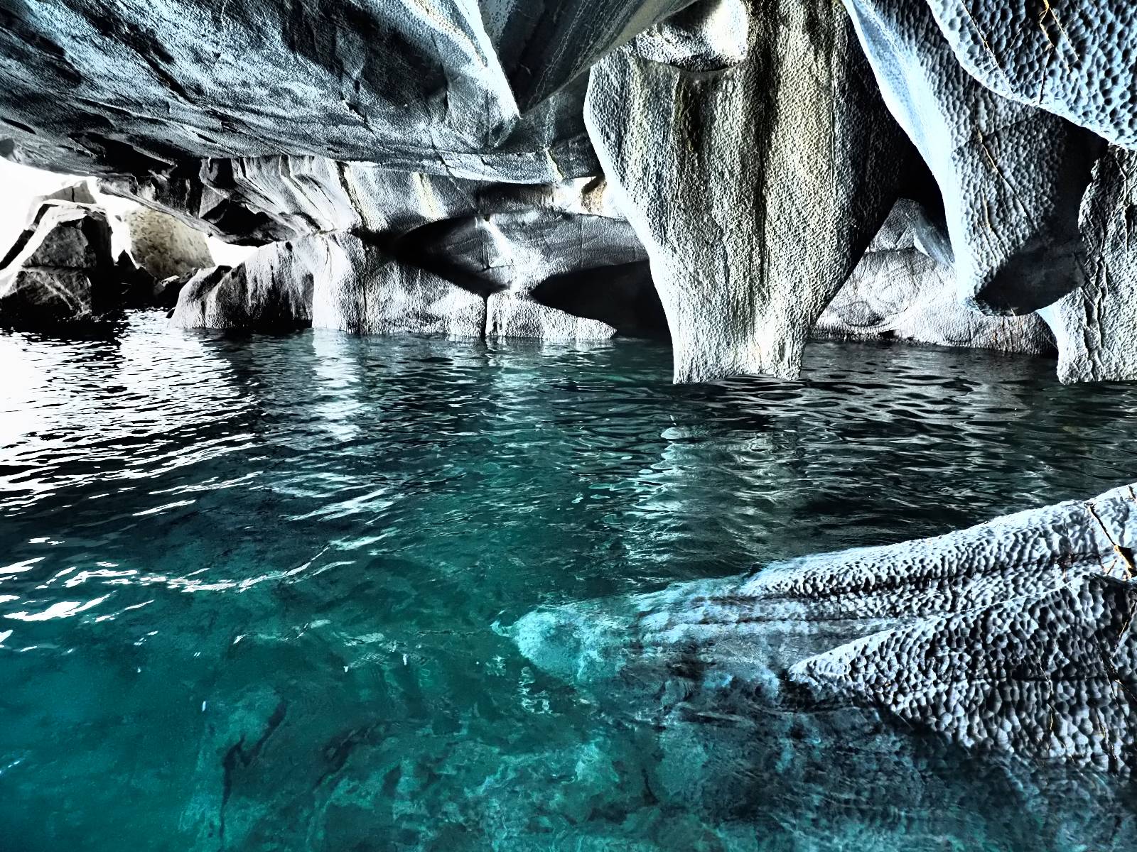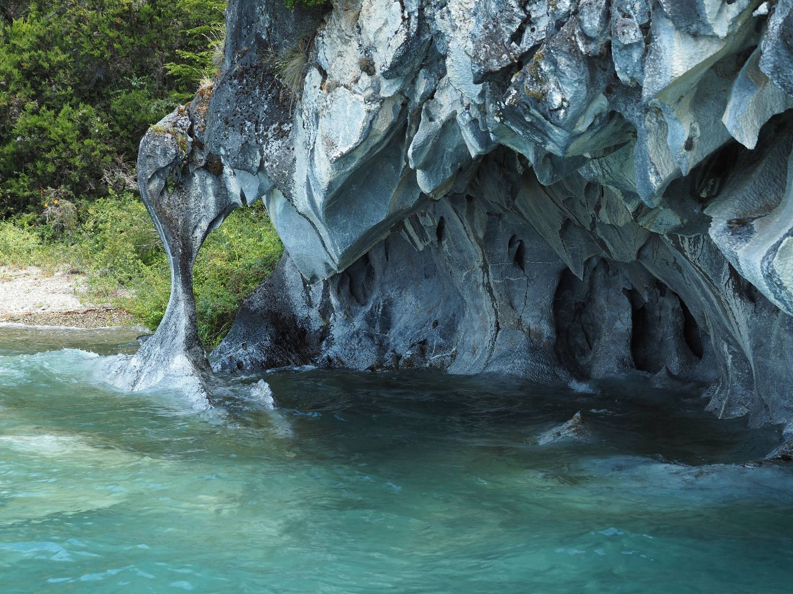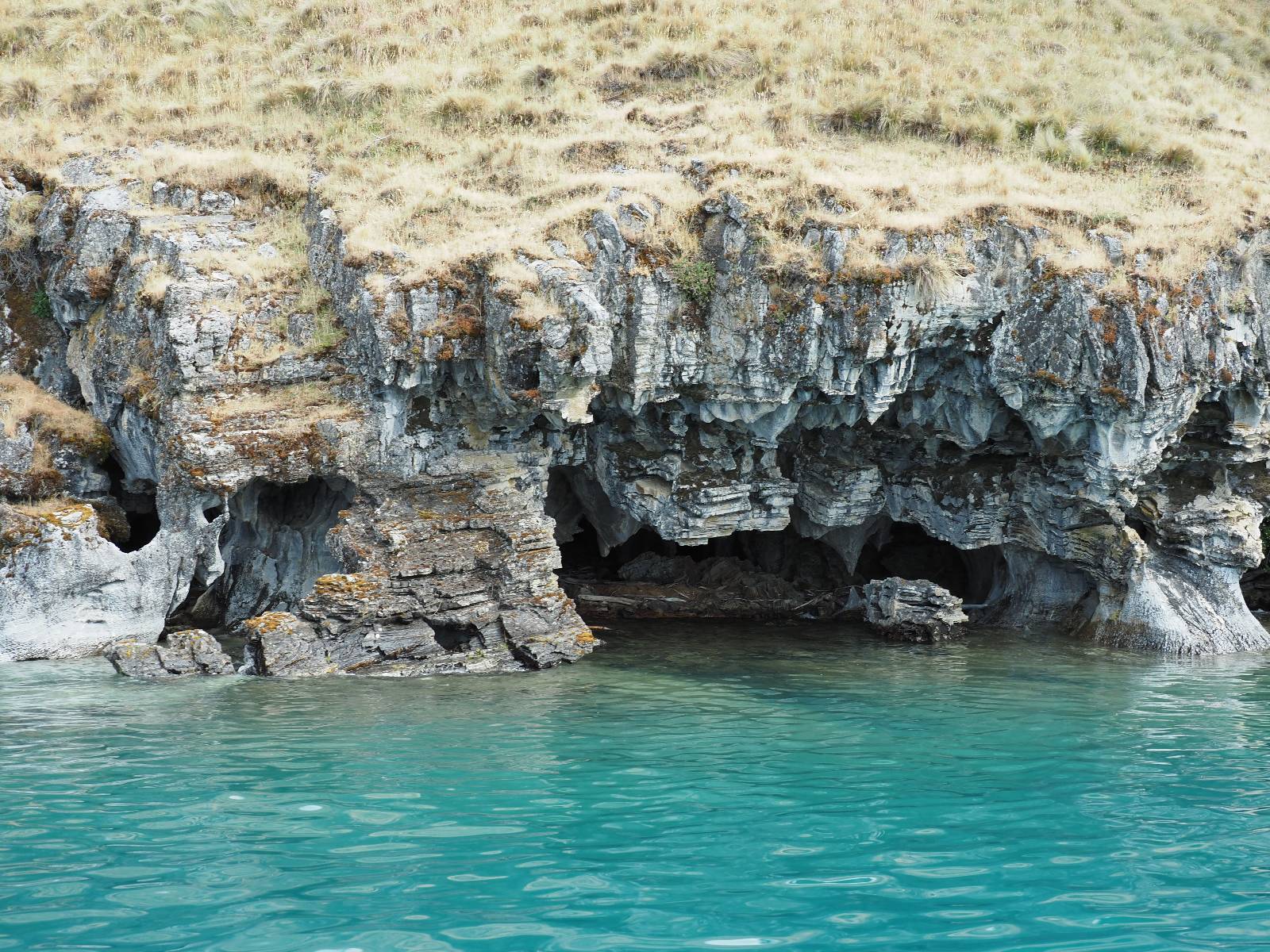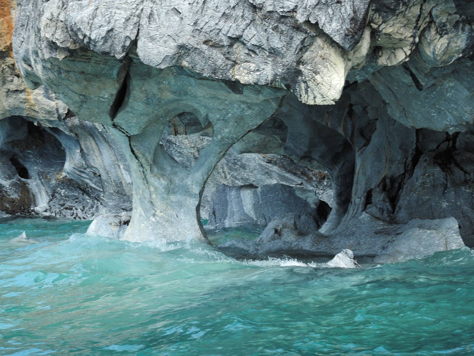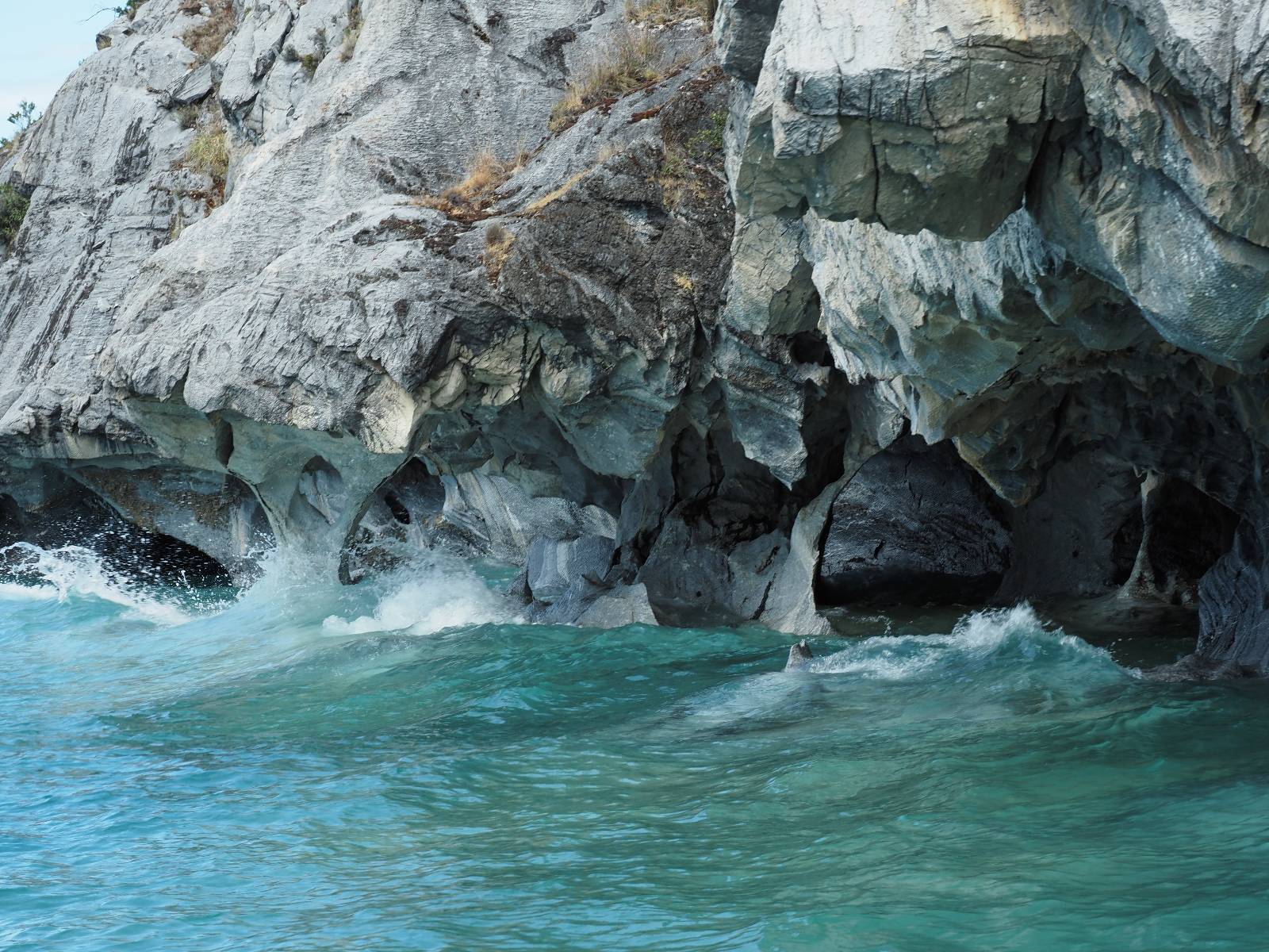 Auf gehts weiter nach Rio Tranquillo! Alles Schotter, der Wind steht fast und es staubt heftig! So manch Pickup ist wie immer schneller und die die ich einhole, denen folge ich in ihrer Wolke, bis sich die Chance zum überholen bietet! Ich hole Matthias ein und die jungen Columbianer auch und erreiche Rio Tranquillo. Aber nix Tranquillo! Hier tummelt sich mal wieder alles, was es so an Touristen zu geben scheint! Eijeijei, das wird schwierig! Das erste Hostal was ich anfahre, geführt von einem Deutschen Paar, dessen Dialekt mir vertraut scheint, nuwa, ist leider völlig ausgebucht! Sie geben mir zwar einen Tip aber auch da ist nichts zu bekommen. Mal wieder hängen auch diverse „keine Zimmer“ Schilder draußen. In einem kleinen Hostal könnte ich etwas für eine Nacht bekommen aber ich brauche zwei. Ich treffe auf der Straße Matthias wieder, bei ihm sieht es nicht viel besser aus und wir entscheiden, den Campingplatz auszuprobieren. Da bekommen wir gut Platz mit diversen Hühnern, die mit ihren Küken das Graß klein halten! Duschen und WC sind ok aber auch das habe ich schon besser erlebt! Aber das passt schon. Nachdem der Staub abgespühlt ist, geht es über den Stoppelacker von Fußballplatz direkt gegenüber ins Restaurant. Bier und Staek sind lecker und der Kellner sehr freundlich! Nach ein bisschen Schnak gibt er mir eine Karte, um evtl. noch eine geführte Tour in die Berge zu einem Gletscher zu machen. Ein junger Amerikaner bekommt das mit und fragt, ob er das abfotografieren darf. Ich erwähne es, weil er zumindest für uns alle Klischees eines „Amis“ erfüllt. Jung, kräftig, gut aussehend, lockiges Haar etwas versnobt, wie aus einer Soap Opera! 😉 Gut, ich gebe zu, um meinen Bauch müsste ich mich auch mal kümmern. 😂 Der Verdauungsspazierganz fürht uns an den See, um auszuloten was uns die Bootsfahrt zu den Marmolhölen kosten würde. Es kostet eigentlich bei jedem Anbieter das selbe und die eine Bude hat noch auf. Die Jungs sind geschäftstüchtig und bieten uns, wenn wir jetzt in Bar zahlen 10% Rabatt. Wahrscheinlich ist das ohnehin der normale Preis aber wir akzeptieren und haben somit die große Runde mit ein paar Inseln und den Marmorhölen in Sack und Tüten. Ich glaube wir hatten die 10:00 Uhr Tour genommen, so ein bisschen ausschlafen muss schon sein. Mit einer ordentlichen Geschwindigkeit geht es über den größten Binnensee Chiles zu erst zu ein paar Inseln mit Schiffswrack und wo ein Herzchirurg aus Coyhaique sein Wochenendhäuschen auf einer der Inseln stehen hat und dann weiter an den Inselkanten vorbei, die wunderbar ausgehölhte Marmorhölen bilden. Hier und da kann sogar unser Boot ein Stückchen reinfahren. Das sieht in dem blauen Wasser und dem Sonnenschein schon sehr fantastisch aus! Die Strukturen unterschiedlichen Grautöne, Streifen, Hölen und Säulen sind durchaus beeindruckend. Es geht nochmal für gute 10min im Highspeedtempo zur Catedral de Marmol und die ist noch einmal wirklich ein paar Nummern schöner anzusehen! Einige Kajakfahrer tummel sich da. Der Bursche aus New York ist auch dabei, natürlich Oberkörper frei, nur mit Schwimmweste, wäre ja auch nicht anders gegangen. Aber wie wir erfahren alles geführte Touren und wirklich nahe ran oder durchfahren darf man nicht. Sie passen zumindest sehr darauf auf, dass niemand etwas kaputt macht. Ein paar Idioten haben wohl vor ein paar Jahren angefangen sich mit ihren Namen verewigen zu wollen… Ich schieße unmengen an Fotos, mal sehen was davon was taugt. Also evtl. bekommt ihr viel zum Schauen, wenn ich nicht ordentlich aussortiere. Schließlich wir der Tag noch richtig angenehm warm und ich entschließe mich nach einem Spazierganz mit Kaffee und Kuchen, doch noch die Badehose zu holen. Am Strand treffe ich „Pi“ Paolo wieder der unterwegs Rowan mit seiner Triumpf Scrambler aufgegabelt hat. Rowan ist Ami, ebenfalls aus New York und er rückt mein Bild wieder gerade. Ich springe…, naja gehe langsam ins Wasser. Die oberen 20cm sind ja okay-frisch aber tiefer merkt man, dass das Wasser wohl auch von den Gletscherflüssen gespeist wird. Zumindes hat es nicht die Temperatur, um unbedingt eine halbe Stunde drin bleiben zu müssen!
