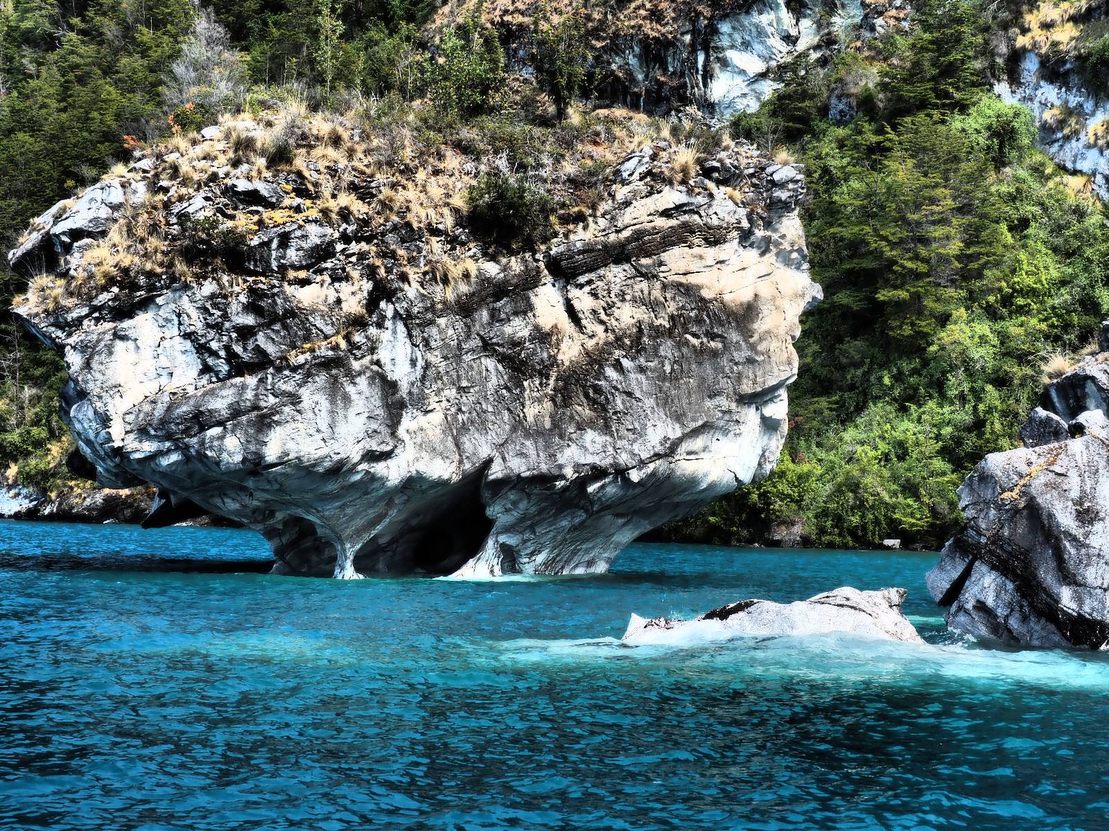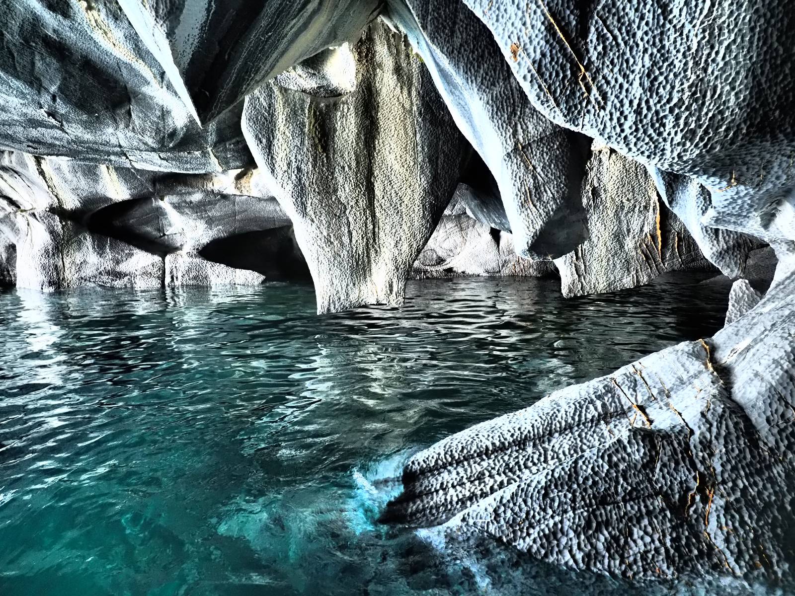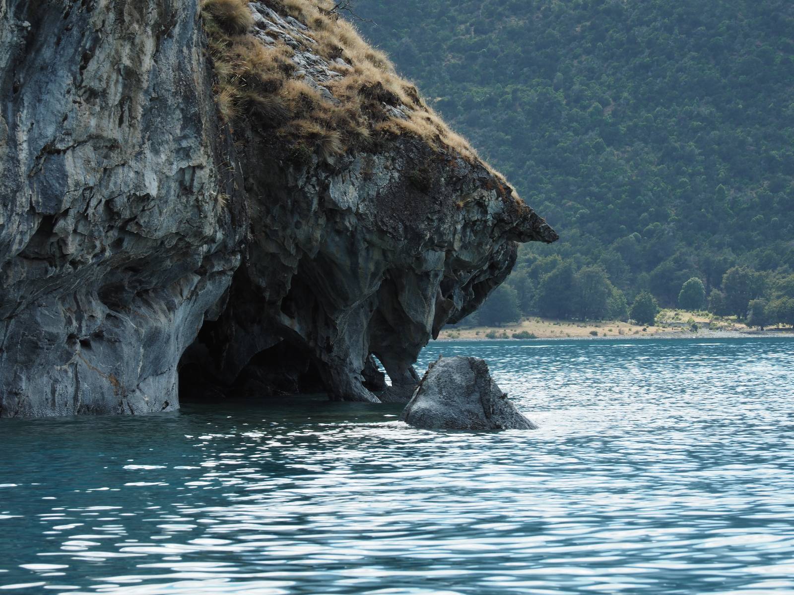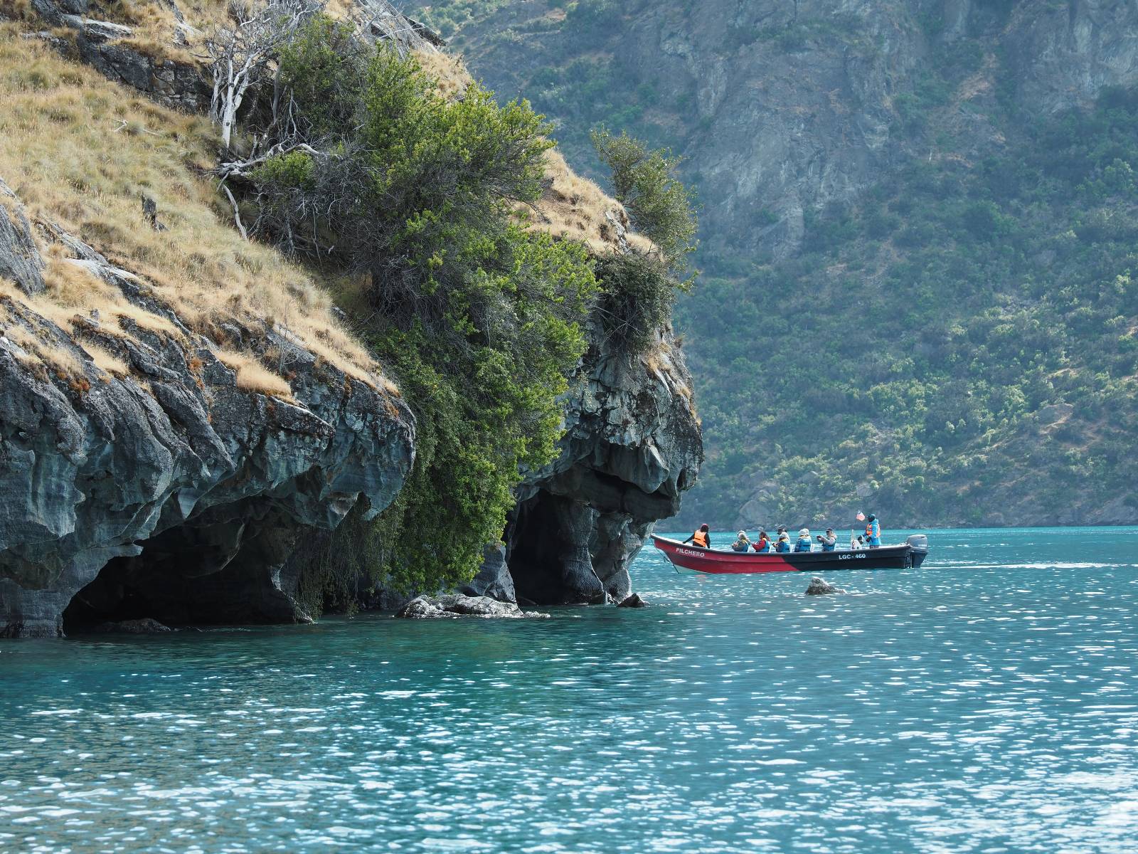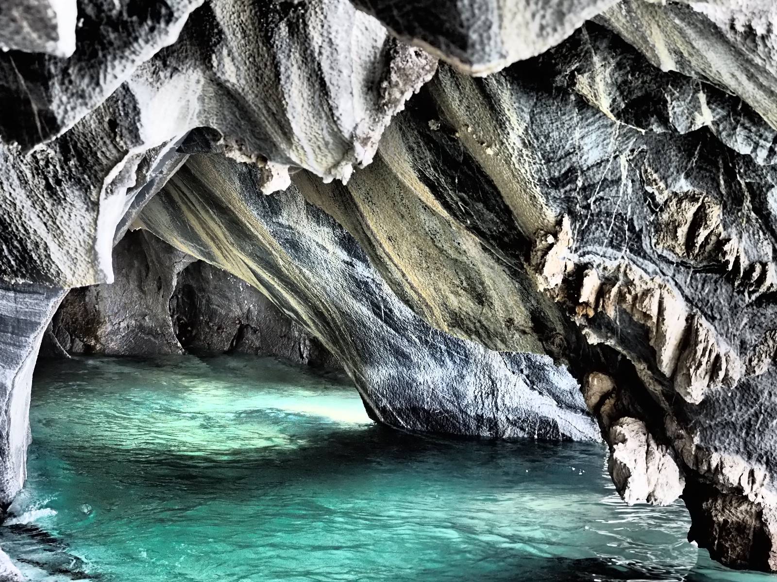 Auf gehts weiter nach Rio Tranquillo! Alles Schotter, der Wind steht fast und es staubt heftig! So manch Pickup ist wie immer schneller und die die ich einhole, denen folge ich in ihrer Wolke, bis sich die Chance zum überholen bietet! Ich hole Matthias ein und die jungen Columbianer auch und erreiche Rio Tranquillo. Aber nix Tranquillo! Hier tummelt sich mal wieder alles, was es so an Touristen zu geben scheint! Eijeijei, das wird schwierig! Das erste Hostal was ich anfahre, geführt von einem Deutschen Paar, dessen Dialekt mir vertraut scheint, nuwa, ist leider völlig ausgebucht! Sie geben mir zwar einen Tip aber auch da ist nichts zu bekommen. Mal wieder hängen auch diverse „keine Zimmer“ Schilder draußen. In einem kleinen Hostal könnte ich etwas für eine Nacht bekommen aber ich brauche zwei. Ich treffe auf der Straße Matthias wieder, bei ihm sieht es nicht viel besser aus und wir entscheiden, den Campingplatz auszuprobieren. Da bekommen wir gut Platz mit diversen Hühnern, die mit ihren Küken das Graß klein halten! Duschen und WC sind ok aber auch das habe ich schon besser erlebt! Aber das passt schon. Nachdem der Staub abgespühlt ist, geht es über den Stoppelacker von Fußballplatz direkt gegenüber ins Restaurant. Bier und Staek sind lecker und der Kellner sehr freundlich! Nach ein bisschen Schnak gibt er mir eine Karte, um evtl. noch eine geführte Tour in die Berge zu einem Gletscher zu machen. Ein junger Amerikaner bekommt das mit und fragt, ob er das abfotografieren darf. Ich erwähne es, weil er zumindest für uns alle Klischees eines „Amis“ erfüllt. Jung, kräftig, gut aussehend, lockiges Haar etwas versnobt, wie aus einer Soap Opera! 😉 Gut, ich gebe zu, um meinen Bauch müsste ich mich auch mal kümmern. 😂 Der Verdauungsspazierganz fürht uns an den See, um auszuloten was uns die Bootsfahrt zu den Marmolhölen kosten würde. Es kostet eigentlich bei jedem Anbieter das selbe und die eine Bude hat noch auf. Die Jungs sind geschäftstüchtig und bieten uns, wenn wir jetzt in Bar zahlen 10% Rabatt. Wahrscheinlich ist das ohnehin der normale Preis aber wir akzeptieren und haben somit die große Runde mit ein paar Inseln und den Marmorhölen in Sack und Tüten. Ich glaube wir hatten die 10:00 Uhr Tour genommen, so ein bisschen ausschlafen muss schon sein. Mit einer ordentlichen Geschwindigkeit geht es über den größten Binnensee Chiles zu erst zu ein paar Inseln mit Schiffswrack und wo ein Herzchirurg aus Coyhaique sein Wochenendhäuschen auf einer der Inseln stehen hat und dann weiter an den Inselkanten vorbei, die wunderbar ausgehölhte Marmorhölen bilden. Hier und da kann sogar unser Boot ein Stückchen reinfahren. Das sieht in dem blauen Wasser und dem Sonnenschein schon sehr fantastisch aus! Die Strukturen unterschiedlichen Grautöne, Streifen, Hölen und Säulen sind durchaus beeindruckend. Es geht nochmal für gute 10min im Highspeedtempo zur Catedral de Marmol und die ist noch einmal wirklich ein paar Nummern schöner anzusehen! Einige Kajakfahrer tummel sich da. Der Bursche aus New York ist auch dabei, natürlich Oberkörper frei, nur mit Schwimmweste, wäre ja auch nicht anders gegangen. Aber wie wir erfahren alles geführte Touren und wirklich nahe ran oder durchfahren darf man nicht. Sie passen zumindest sehr darauf auf, dass niemand etwas kaputt macht. Ein paar Idioten haben wohl vor ein paar Jahren angefangen sich mit ihren Namen verewigen zu wollen… Ich schieße unmengen an Fotos, mal sehen was davon was taugt. Also evtl. bekommt ihr viel zum Schauen, wenn ich nicht ordentlich aussortiere. Schließlich wir der Tag noch richtig angenehm warm und ich entschließe mich nach einem Spazierganz mit Kaffee und Kuchen, doch noch die Badehose zu holen. Am Strand treffe ich „Pi“ Paolo wieder der unterwegs Rowan mit seiner Triumpf Scrambler aufgegabelt hat. Rowan ist Ami, ebenfalls aus New York und er rückt mein Bild wieder gerade. Ich springe…, naja gehe langsam ins Wasser. Die oberen 20cm sind ja okay-frisch aber tiefer merkt man, dass das Wasser wohl auch von den Gletscherflüssen gespeist wird. Zumindes hat es nicht die Temperatur, um unbedingt eine halbe Stunde drin bleiben zu müssen!