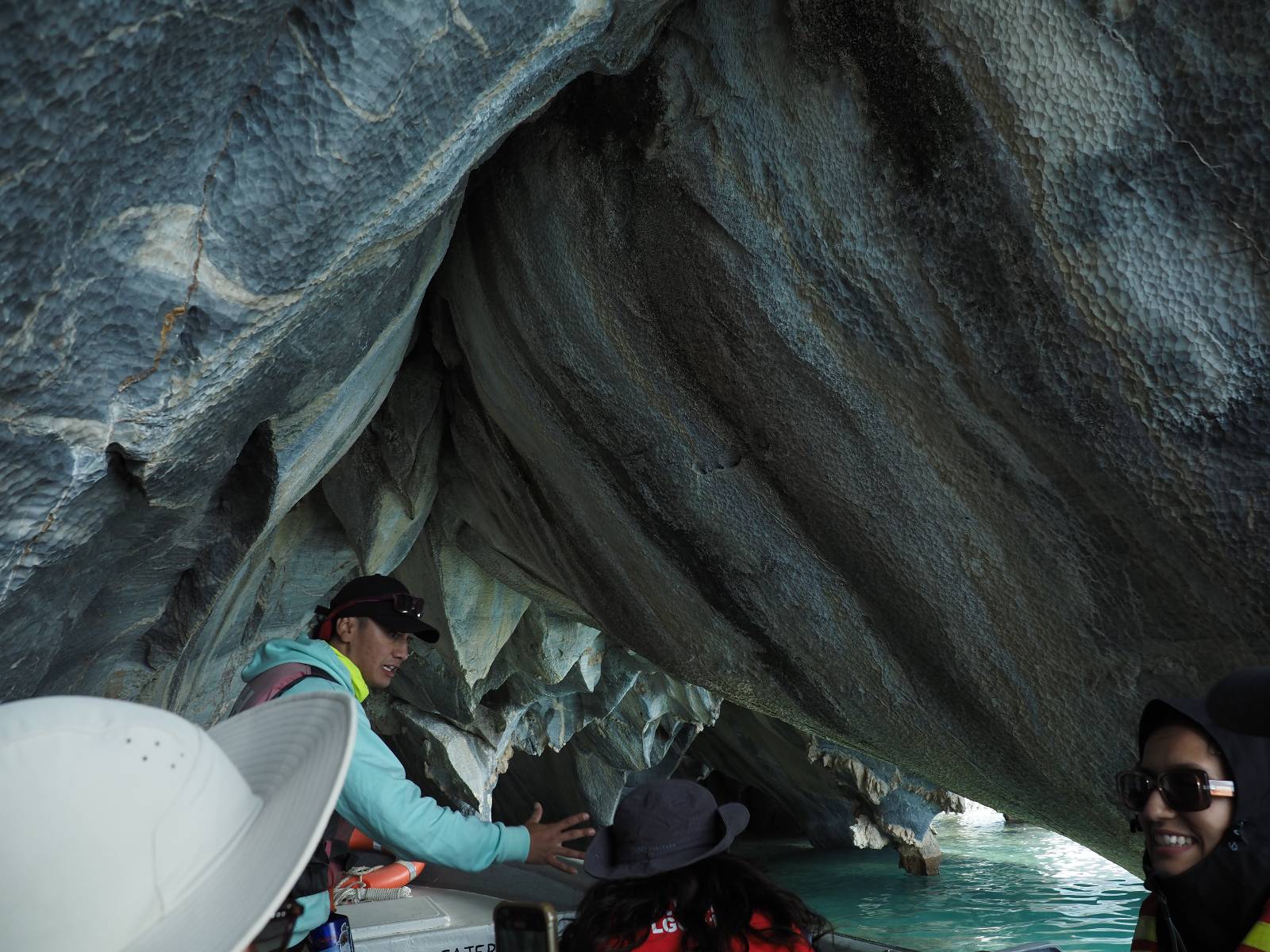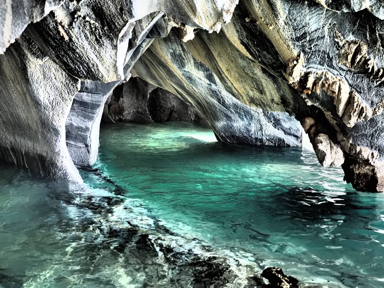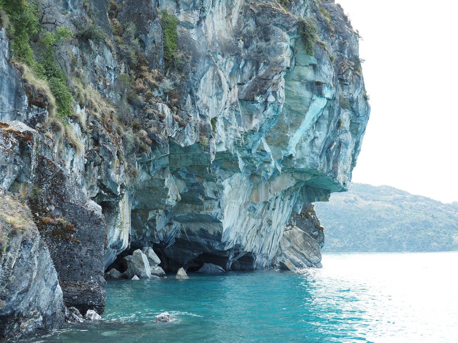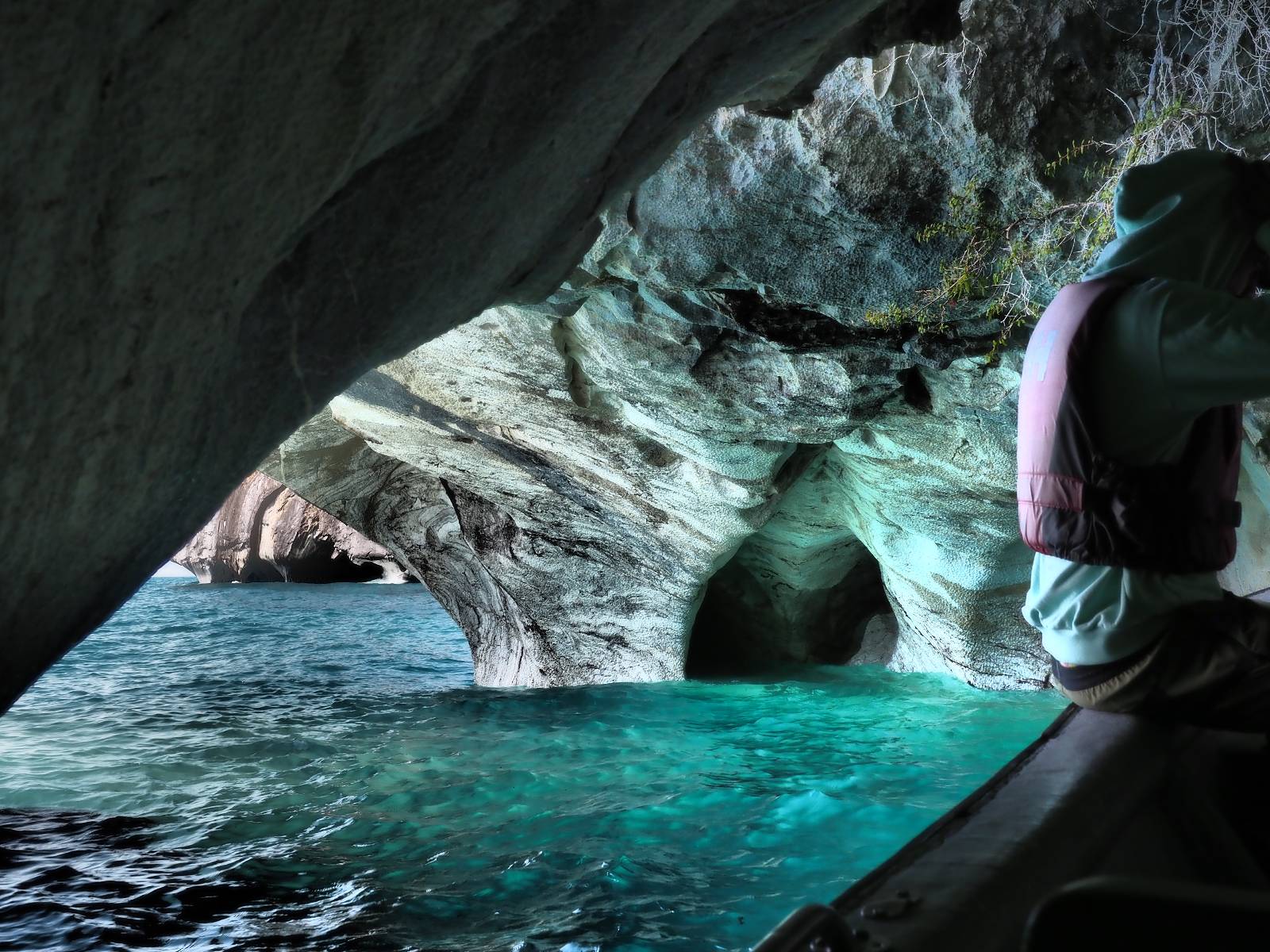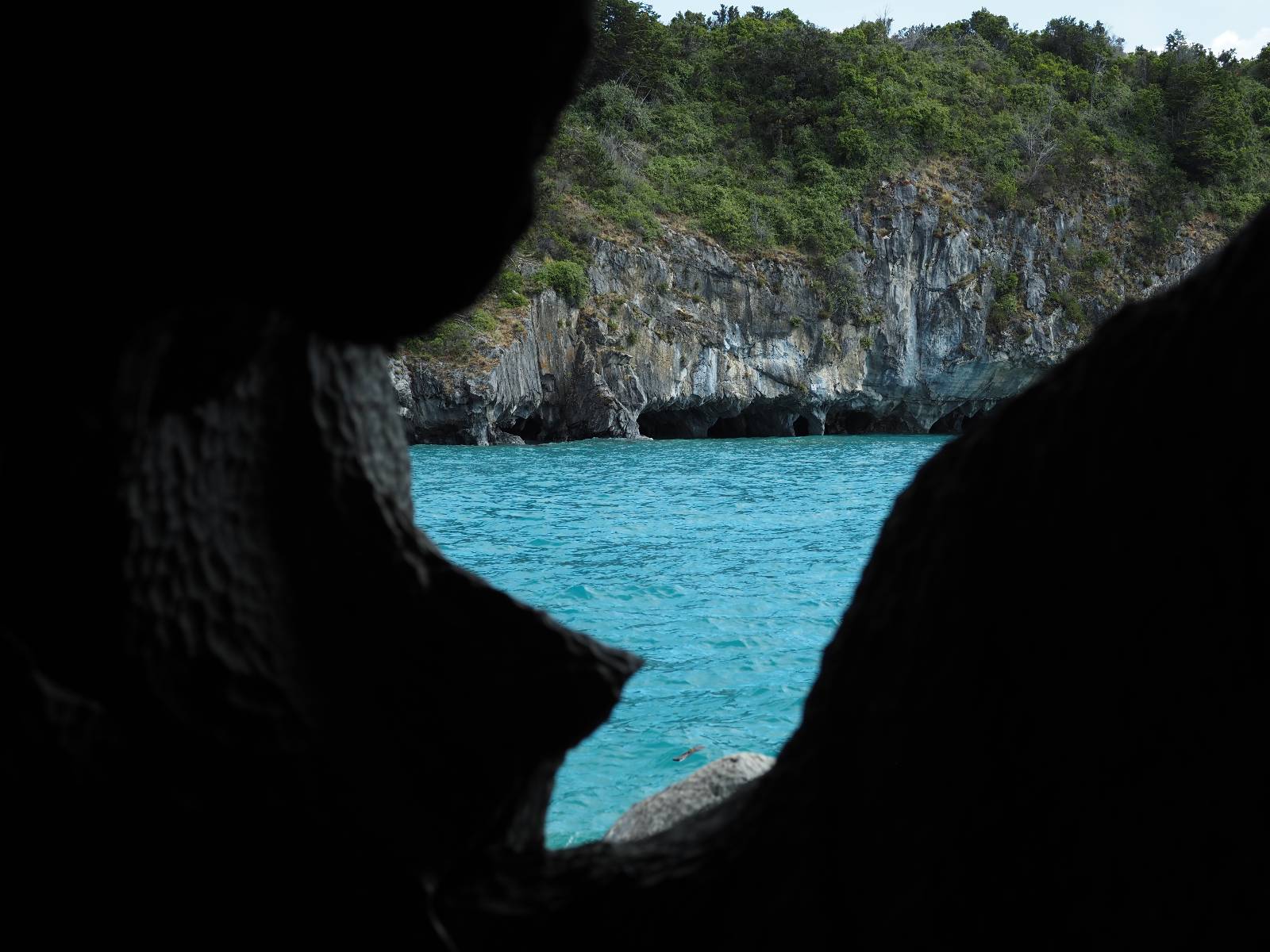 Auf gehts weiter nach Rio Tranquillo! Alles Schotter, der Wind steht fast und es staubt heftig! So manch Pickup ist wie immer schneller und die die ich einhole, denen folge ich in ihrer Wolke, bis sich die Chance zum überholen bietet! Ich hole Matthias ein und die jungen Columbianer auch und erreiche Rio Tranquillo. Aber nix Tranquillo! Hier tummelt sich mal wieder alles, was es so an Touristen zu geben scheint! Eijeijei, das wird schwierig! Das erste Hostal was ich anfahre, geführt von einem Deutschen Paar, dessen Dialekt mir vertraut scheint, nuwa, ist leider völlig ausgebucht! Sie geben mir zwar einen Tip aber auch da ist nichts zu bekommen. Mal wieder hängen auch diverse „keine Zimmer“ Schilder draußen. In einem kleinen Hostal könnte ich etwas für eine Nacht bekommen aber ich brauche zwei. Ich treffe auf der Straße Matthias wieder, bei ihm sieht es nicht viel besser aus und wir entscheiden, den Campingplatz auszuprobieren. Da bekommen wir gut Platz mit diversen Hühnern, die mit ihren Küken das Graß klein halten! Duschen und WC sind ok aber auch das habe ich schon besser erlebt! Aber das passt schon. Nachdem der Staub abgespühlt ist, geht es über den Stoppelacker von Fußballplatz direkt gegenüber ins Restaurant. Bier und Staek sind lecker und der Kellner sehr freundlich! Nach ein bisschen Schnak gibt er mir eine Karte, um evtl. noch eine geführte Tour in die Berge zu einem Gletscher zu machen. Ein junger Amerikaner bekommt das mit und fragt, ob er das abfotografieren darf. Ich erwähne es, weil er zumindest für uns alle Klischees eines „Amis“ erfüllt. Jung, kräftig, gut aussehend, lockiges Haar etwas versnobt, wie aus einer Soap Opera! 😉 Gut, ich gebe zu, um meinen Bauch müsste ich mich auch mal kümmern. 😂 Der Verdauungsspazierganz fürht uns an den See, um auszuloten was uns die Bootsfahrt zu den Marmolhölen kosten würde. Es kostet eigentlich bei jedem Anbieter das selbe und die eine Bude hat noch auf. Die Jungs sind geschäftstüchtig und bieten uns, wenn wir jetzt in Bar zahlen 10% Rabatt. Wahrscheinlich ist das ohnehin der normale Preis aber wir akzeptieren und haben somit die große Runde mit ein paar Inseln und den Marmorhölen in Sack und Tüten. Ich glaube wir hatten die 10:00 Uhr Tour genommen, so ein bisschen ausschlafen muss schon sein. Mit einer ordentlichen Geschwindigkeit geht es über den größten Binnensee Chiles zu erst zu ein paar Inseln mit Schiffswrack und wo ein Herzchirurg aus Coyhaique sein Wochenendhäuschen auf einer der Inseln stehen hat und dann weiter an den Inselkanten vorbei, die wunderbar ausgehölhte Marmorhölen bilden. Hier und da kann sogar unser Boot ein Stückchen reinfahren. Das sieht in dem blauen Wasser und dem Sonnenschein schon sehr fantastisch aus! Die Strukturen unterschiedlichen Grautöne, Streifen, Hölen und Säulen sind durchaus beeindruckend. Es geht nochmal für gute 10min im Highspeedtempo zur Catedral de Marmol und die ist noch einmal wirklich ein paar Nummern schöner anzusehen! Einige Kajakfahrer tummel sich da. Der Bursche aus New York ist auch dabei, natürlich Oberkörper frei, nur mit Schwimmweste, wäre ja auch nicht anders gegangen. Aber wie wir erfahren alles geführte Touren und wirklich nahe ran oder durchfahren darf man nicht. Sie passen zumindest sehr darauf auf, dass niemand etwas kaputt macht. Ein paar Idioten haben wohl vor ein paar Jahren angefangen sich mit ihren Namen verewigen zu wollen… Ich schieße unmengen an Fotos, mal sehen was davon was taugt. Also evtl. bekommt ihr viel zum Schauen, wenn ich nicht ordentlich aussortiere. Schließlich wir der Tag noch richtig angenehm warm und ich entschließe mich nach einem Spazierganz mit Kaffee und Kuchen, doch noch die Badehose zu holen. Am Strand treffe ich „Pi“ Paolo wieder der unterwegs Rowan mit seiner Triumpf Scrambler aufgegabelt hat. Rowan ist Ami, ebenfalls aus New York und er rückt mein Bild wieder gerade. Ich springe…, naja gehe langsam ins Wasser. Die oberen 20cm sind ja okay-frisch aber tiefer merkt man, dass das Wasser wohl auch von den Gletscherflüssen gespeist wird. Zumindes hat es nicht die Temperatur, um unbedingt eine halbe Stunde drin bleiben zu müssen!