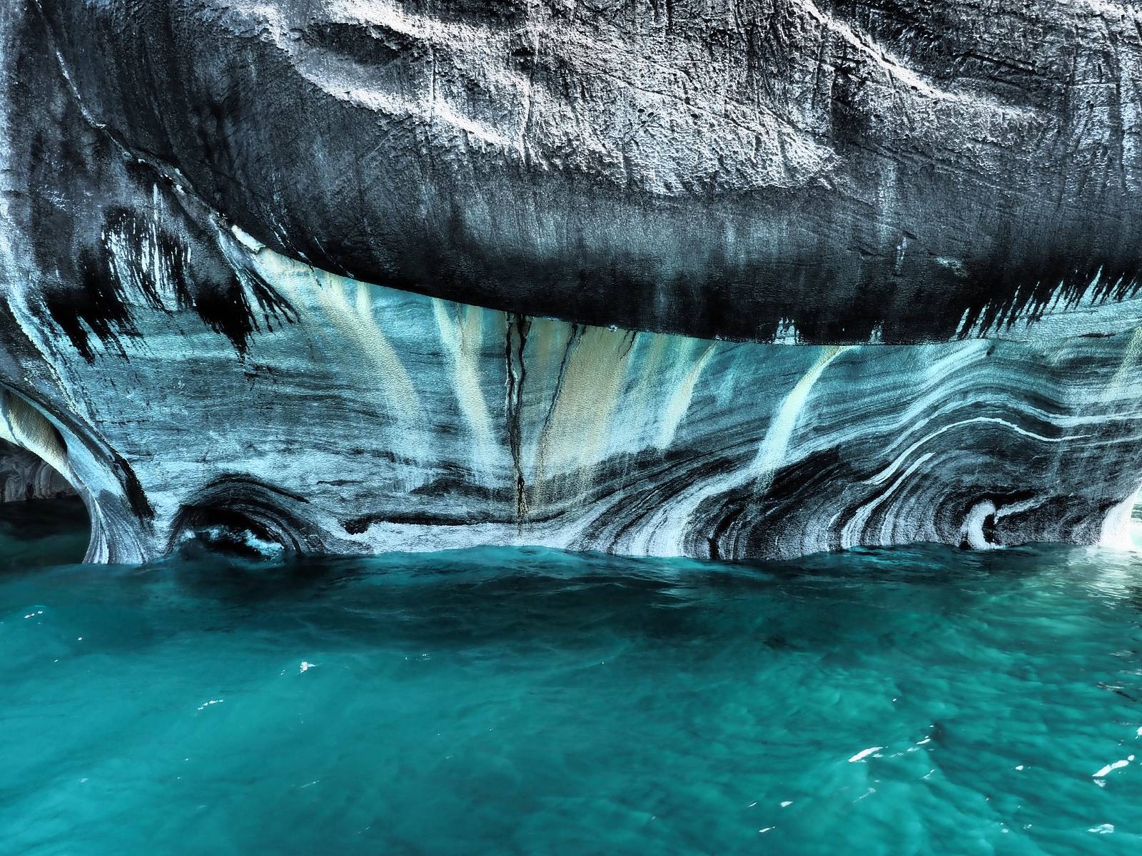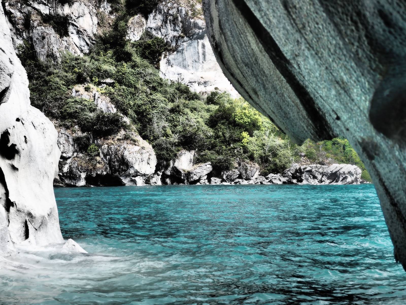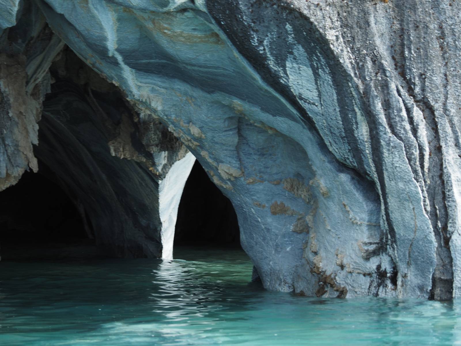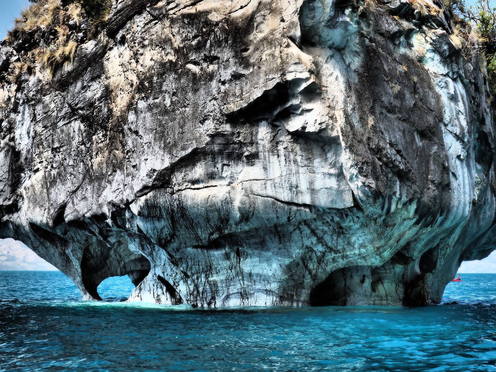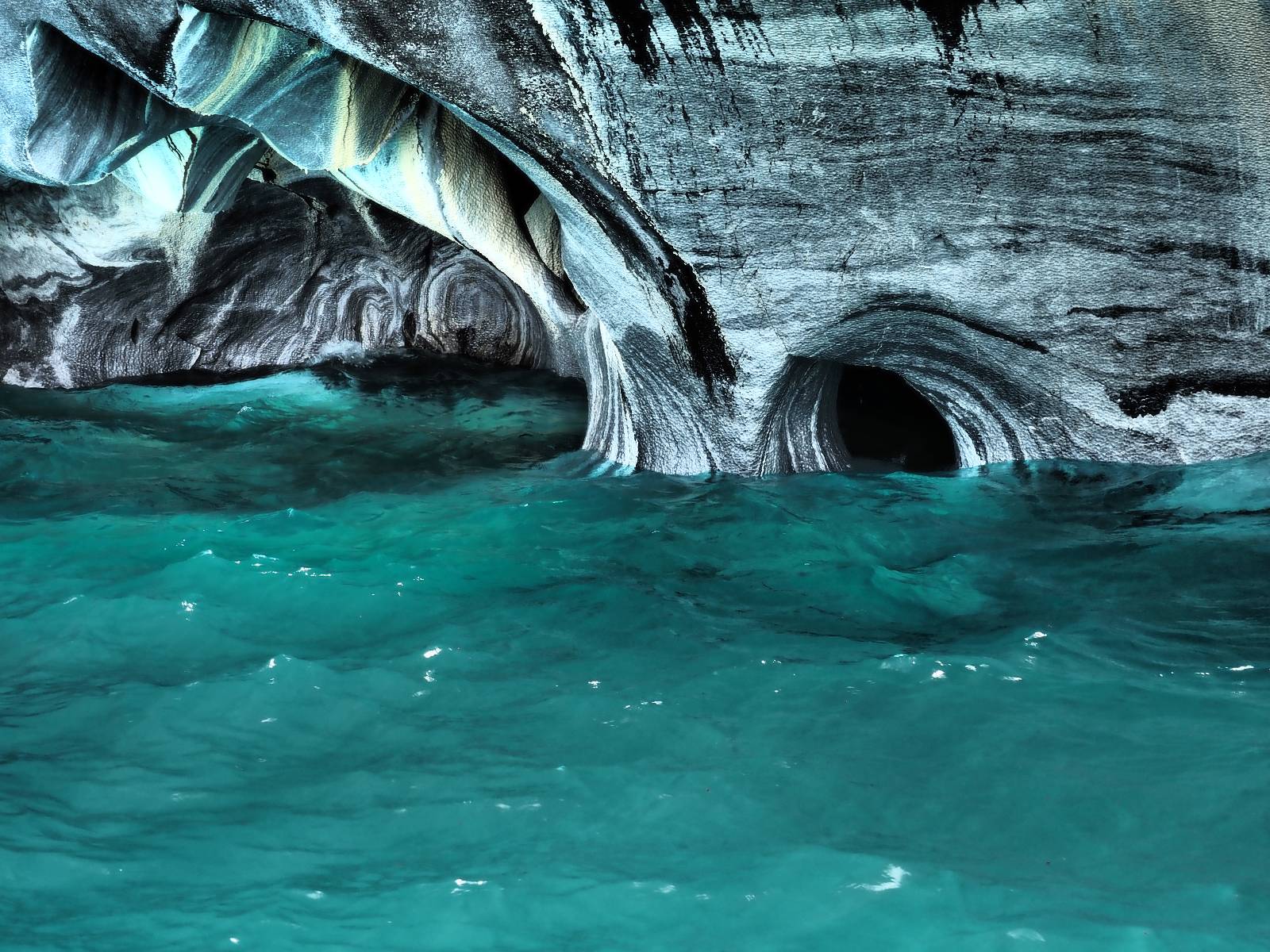 Auf gehts weiter nach Rio Tranquillo! Alles Schotter, der Wind steht fast und es staubt heftig! So manch Pickup ist wie immer schneller und die die ich einhole, denen folge ich in ihrer Wolke, bis sich die Chance zum überholen bietet! Ich hole Matthias ein und die jungen Columbianer auch und erreiche Rio Tranquillo. Aber nix Tranquillo! Hier tummelt sich mal wieder alles, was es so an Touristen zu geben scheint! Eijeijei, das wird schwierig! Das erste Hostal was ich anfahre, geführt von einem Deutschen Paar, dessen Dialekt mir vertraut scheint, nuwa, ist leider völlig ausgebucht! Sie geben mir zwar einen Tip aber auch da ist nichts zu bekommen. Mal wieder hängen auch diverse „keine Zimmer“ Schilder draußen. In einem kleinen Hostal könnte ich etwas für eine Nacht bekommen aber ich brauche zwei. Ich treffe auf der Straße Matthias wieder, bei ihm sieht es nicht viel besser aus und wir entscheiden, den Campingplatz auszuprobieren. Da bekommen wir gut Platz mit diversen Hühnern, die mit ihren Küken das Graß klein halten! Duschen und WC sind ok aber auch das habe ich schon besser erlebt! Aber das passt schon. Nachdem der Staub abgespühlt ist, geht es über den Stoppelacker von Fußballplatz direkt gegenüber ins Restaurant. Bier und Staek sind lecker und der Kellner sehr freundlich! Nach ein bisschen Schnak gibt er mir eine Karte, um evtl. noch eine geführte Tour in die Berge zu einem Gletscher zu machen. Ein junger Amerikaner bekommt das mit und fragt, ob er das abfotografieren darf. Ich erwähne es, weil er zumindest für uns alle Klischees eines „Amis“ erfüllt. Jung, kräftig, gut aussehend, lockiges Haar etwas versnobt, wie aus einer Soap Opera! 😉 Gut, ich gebe zu, um meinen Bauch müsste ich mich auch mal kümmern. 😂 Der Verdauungsspazierganz fürht uns an den See, um auszuloten was uns die Bootsfahrt zu den Marmolhölen kosten würde. Es kostet eigentlich bei jedem Anbieter das selbe und die eine Bude hat noch auf. Die Jungs sind geschäftstüchtig und bieten uns, wenn wir jetzt in Bar zahlen 10% Rabatt. Wahrscheinlich ist das ohnehin der normale Preis aber wir akzeptieren und haben somit die große Runde mit ein paar Inseln und den Marmorhölen in Sack und Tüten. Ich glaube wir hatten die 10:00 Uhr Tour genommen, so ein bisschen ausschlafen muss schon sein. Mit einer ordentlichen Geschwindigkeit geht es über den größten Binnensee Chiles zu erst zu ein paar Inseln mit Schiffswrack und wo ein Herzchirurg aus Coyhaique sein Wochenendhäuschen auf einer der Inseln stehen hat und dann weiter an den Inselkanten vorbei, die wunderbar ausgehölhte Marmorhölen bilden. Hier und da kann sogar unser Boot ein Stückchen reinfahren. Das sieht in dem blauen Wasser und dem Sonnenschein schon sehr fantastisch aus! Die Strukturen unterschiedlichen Grautöne, Streifen, Hölen und Säulen sind durchaus beeindruckend. Es geht nochmal für gute 10min im Highspeedtempo zur Catedral de Marmol und die ist noch einmal wirklich ein paar Nummern schöner anzusehen! Einige Kajakfahrer tummel sich da. Der Bursche aus New York ist auch dabei, natürlich Oberkörper frei, nur mit Schwimmweste, wäre ja auch nicht anders gegangen. Aber wie wir erfahren alles geführte Touren und wirklich nahe ran oder durchfahren darf man nicht. Sie passen zumindest sehr darauf auf, dass niemand etwas kaputt macht. Ein paar Idioten haben wohl vor ein paar Jahren angefangen sich mit ihren Namen verewigen zu wollen… Ich schieße unmengen an Fotos, mal sehen was davon was taugt. Also evtl. bekommt ihr viel zum Schauen, wenn ich nicht ordentlich aussortiere. Schließlich wir der Tag noch richtig angenehm warm und ich entschließe mich nach einem Spazierganz mit Kaffee und Kuchen, doch noch die Badehose zu holen. Am Strand treffe ich „Pi“ Paolo wieder der unterwegs Rowan mit seiner Triumpf Scrambler aufgegabelt hat. Rowan ist Ami, ebenfalls aus New York und er rückt mein Bild wieder gerade. Ich springe…, naja gehe langsam ins Wasser. Die oberen 20cm sind ja okay-frisch aber tiefer merkt man, dass das Wasser wohl auch von den Gletscherflüssen gespeist wird. Zumindes hat es nicht die Temperatur, um unbedingt eine halbe Stunde drin bleiben zu müssen!
