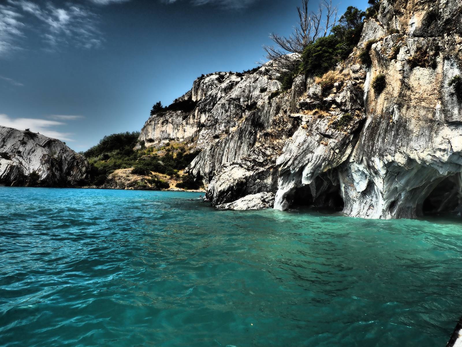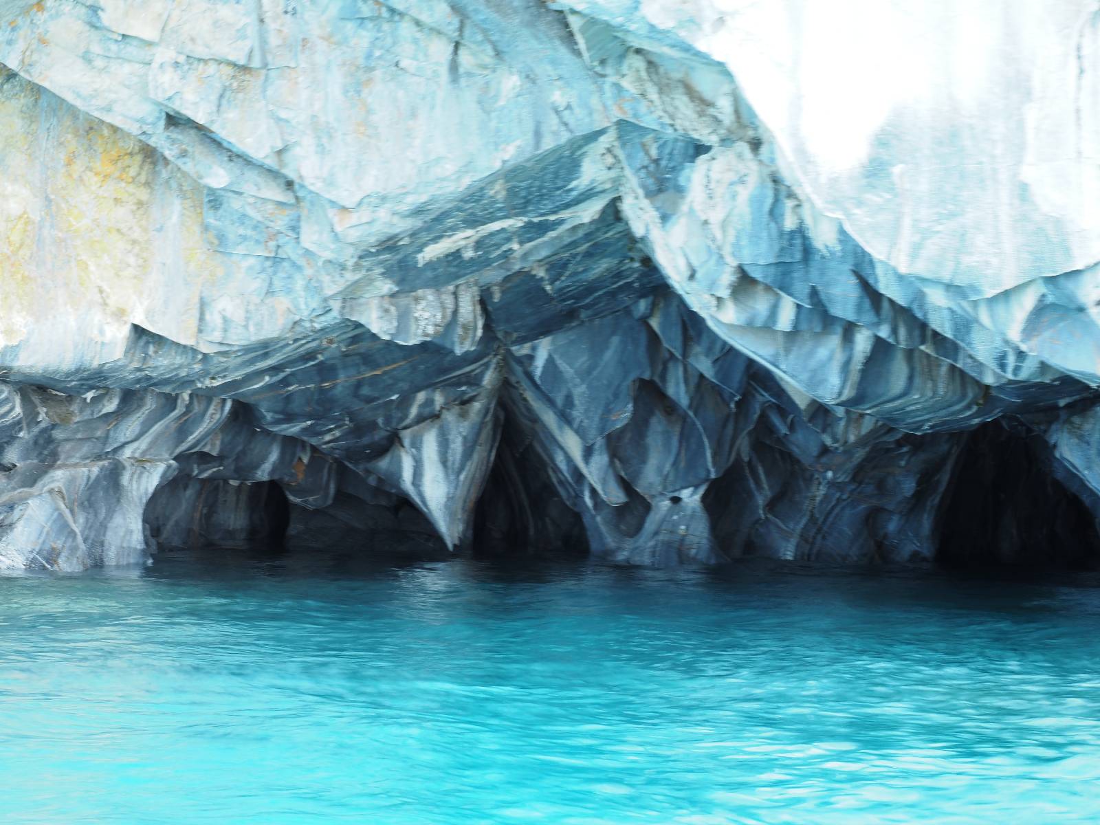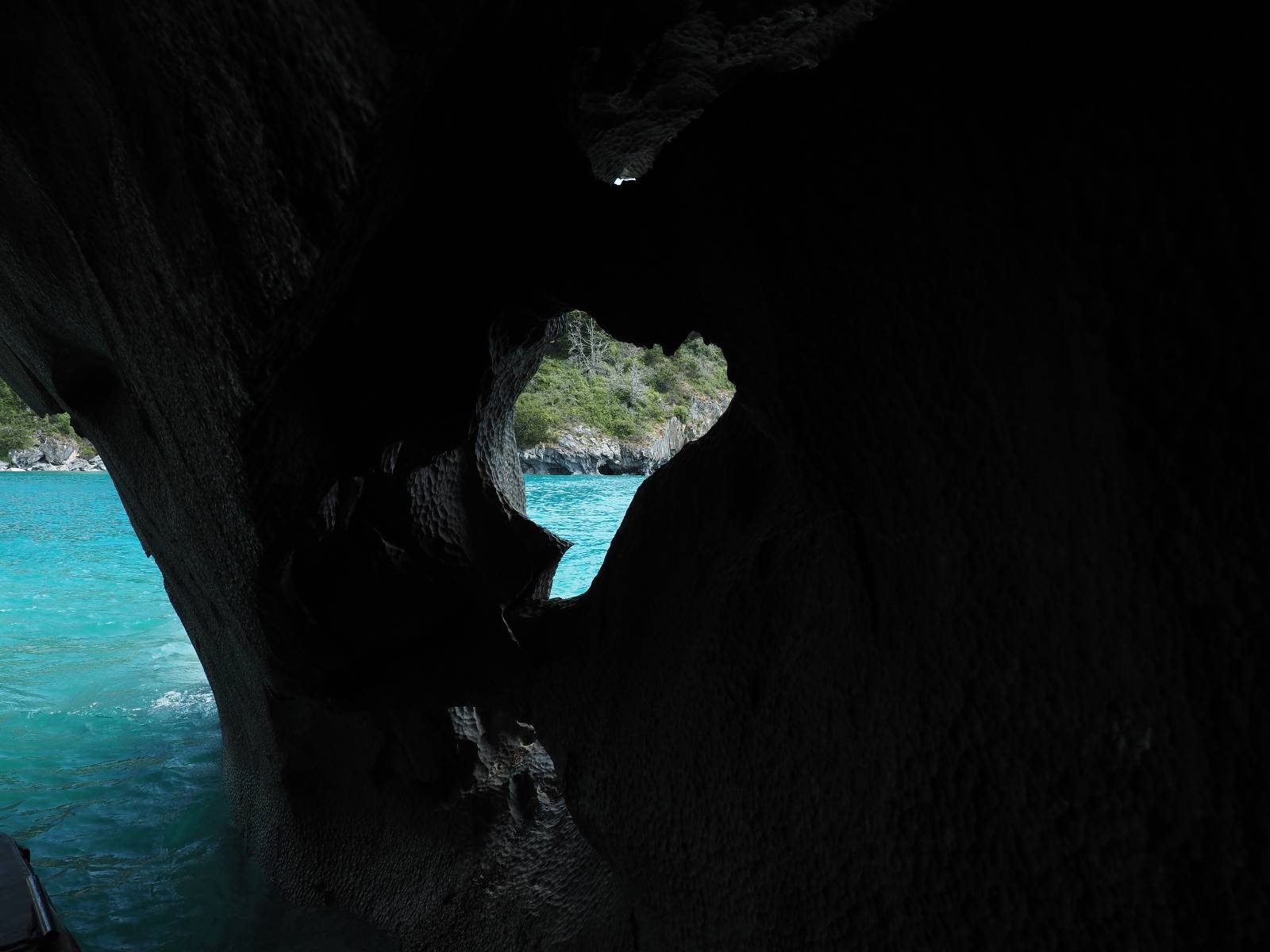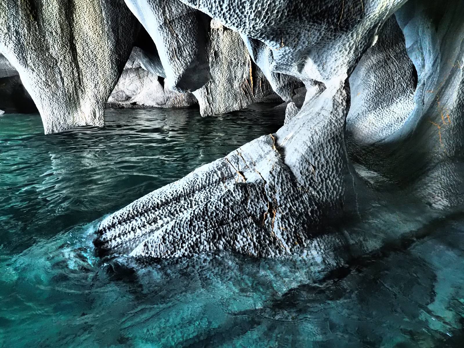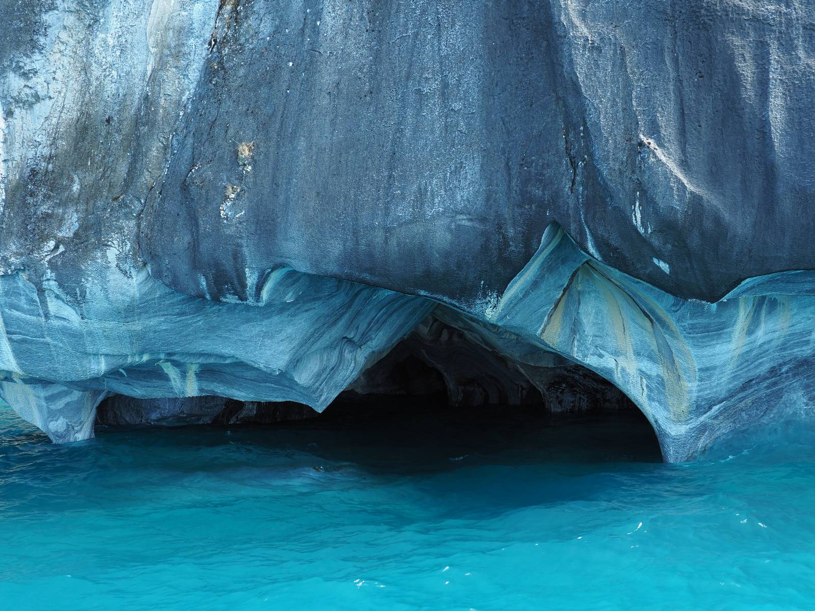 Auf gehts weiter nach Rio Tranquillo! Alles Schotter, der Wind steht fast und es staubt heftig! So manch Pickup ist wie immer schneller und die die ich einhole, denen folge ich in ihrer Wolke, bis sich die Chance zum überholen bietet! Ich hole Matthias ein und die jungen Columbianer auch und erreiche Rio Tranquillo. Aber nix Tranquillo! Hier tummelt sich mal wieder alles, was es so an Touristen zu geben scheint! Eijeijei, das wird schwierig! Das erste Hostal was ich anfahre, geführt von einem Deutschen Paar, dessen Dialekt mir vertraut scheint, nuwa, ist leider völlig ausgebucht! Sie geben mir zwar einen Tip aber auch da ist nichts zu bekommen. Mal wieder hängen auch diverse „keine Zimmer“ Schilder draußen. In einem kleinen Hostal könnte ich etwas für eine Nacht bekommen aber ich brauche zwei. Ich treffe auf der Straße Matthias wieder, bei ihm sieht es nicht viel besser aus und wir entscheiden, den Campingplatz auszuprobieren. Da bekommen wir gut Platz mit diversen Hühnern, die mit ihren Küken das Graß klein halten! Duschen und WC sind ok aber auch das habe ich schon besser erlebt! Aber das passt schon. Nachdem der Staub abgespühlt ist, geht es über den Stoppelacker von Fußballplatz direkt gegenüber ins Restaurant. Bier und Staek sind lecker und der Kellner sehr freundlich! Nach ein bisschen Schnak gibt er mir eine Karte, um evtl. noch eine geführte Tour in die Berge zu einem Gletscher zu machen. Ein junger Amerikaner bekommt das mit und fragt, ob er das abfotografieren darf. Ich erwähne es, weil er zumindest für uns alle Klischees eines „Amis“ erfüllt. Jung, kräftig, gut aussehend, lockiges Haar etwas versnobt, wie aus einer Soap Opera! 😉 Gut, ich gebe zu, um meinen Bauch müsste ich mich auch mal kümmern. 😂 Der Verdauungsspazierganz fürht uns an den See, um auszuloten was uns die Bootsfahrt zu den Marmolhölen kosten würde. Es kostet eigentlich bei jedem Anbieter das selbe und die eine Bude hat noch auf. Die Jungs sind geschäftstüchtig und bieten uns, wenn wir jetzt in Bar zahlen 10% Rabatt. Wahrscheinlich ist das ohnehin der normale Preis aber wir akzeptieren und haben somit die große Runde mit ein paar Inseln und den Marmorhölen in Sack und Tüten. Ich glaube wir hatten die 10:00 Uhr Tour genommen, so ein bisschen ausschlafen muss schon sein. Mit einer ordentlichen Geschwindigkeit geht es über den größten Binnensee Chiles zu erst zu ein paar Inseln mit Schiffswrack und wo ein Herzchirurg aus Coyhaique sein Wochenendhäuschen auf einer der Inseln stehen hat und dann weiter an den Inselkanten vorbei, die wunderbar ausgehölhte Marmorhölen bilden. Hier und da kann sogar unser Boot ein Stückchen reinfahren. Das sieht in dem blauen Wasser und dem Sonnenschein schon sehr fantastisch aus! Die Strukturen unterschiedlichen Grautöne, Streifen, Hölen und Säulen sind durchaus beeindruckend. Es geht nochmal für gute 10min im Highspeedtempo zur Catedral de Marmol und die ist noch einmal wirklich ein paar Nummern schöner anzusehen! Einige Kajakfahrer tummel sich da. Der Bursche aus New York ist auch dabei, natürlich Oberkörper frei, nur mit Schwimmweste, wäre ja auch nicht anders gegangen. Aber wie wir erfahren alles geführte Touren und wirklich nahe ran oder durchfahren darf man nicht. Sie passen zumindest sehr darauf auf, dass niemand etwas kaputt macht. Ein paar Idioten haben wohl vor ein paar Jahren angefangen sich mit ihren Namen verewigen zu wollen… Ich schieße unmengen an Fotos, mal sehen was davon was taugt. Also evtl. bekommt ihr viel zum Schauen, wenn ich nicht ordentlich aussortiere. Schließlich wir der Tag noch richtig angenehm warm und ich entschließe mich nach einem Spazierganz mit Kaffee und Kuchen, doch noch die Badehose zu holen. Am Strand treffe ich „Pi“ Paolo wieder der unterwegs Rowan mit seiner Triumpf Scrambler aufgegabelt hat. Rowan ist Ami, ebenfalls aus New York und er rückt mein Bild wieder gerade. Ich springe…, naja gehe langsam ins Wasser. Die oberen 20cm sind ja okay-frisch aber tiefer merkt man, dass das Wasser wohl auch von den Gletscherflüssen gespeist wird. Zumindes hat es nicht die Temperatur, um unbedingt eine halbe Stunde drin bleiben zu müssen!