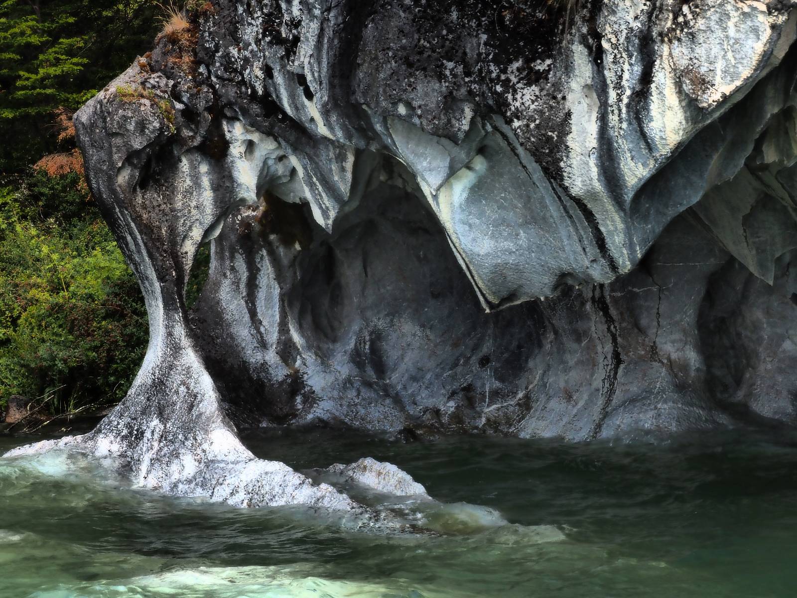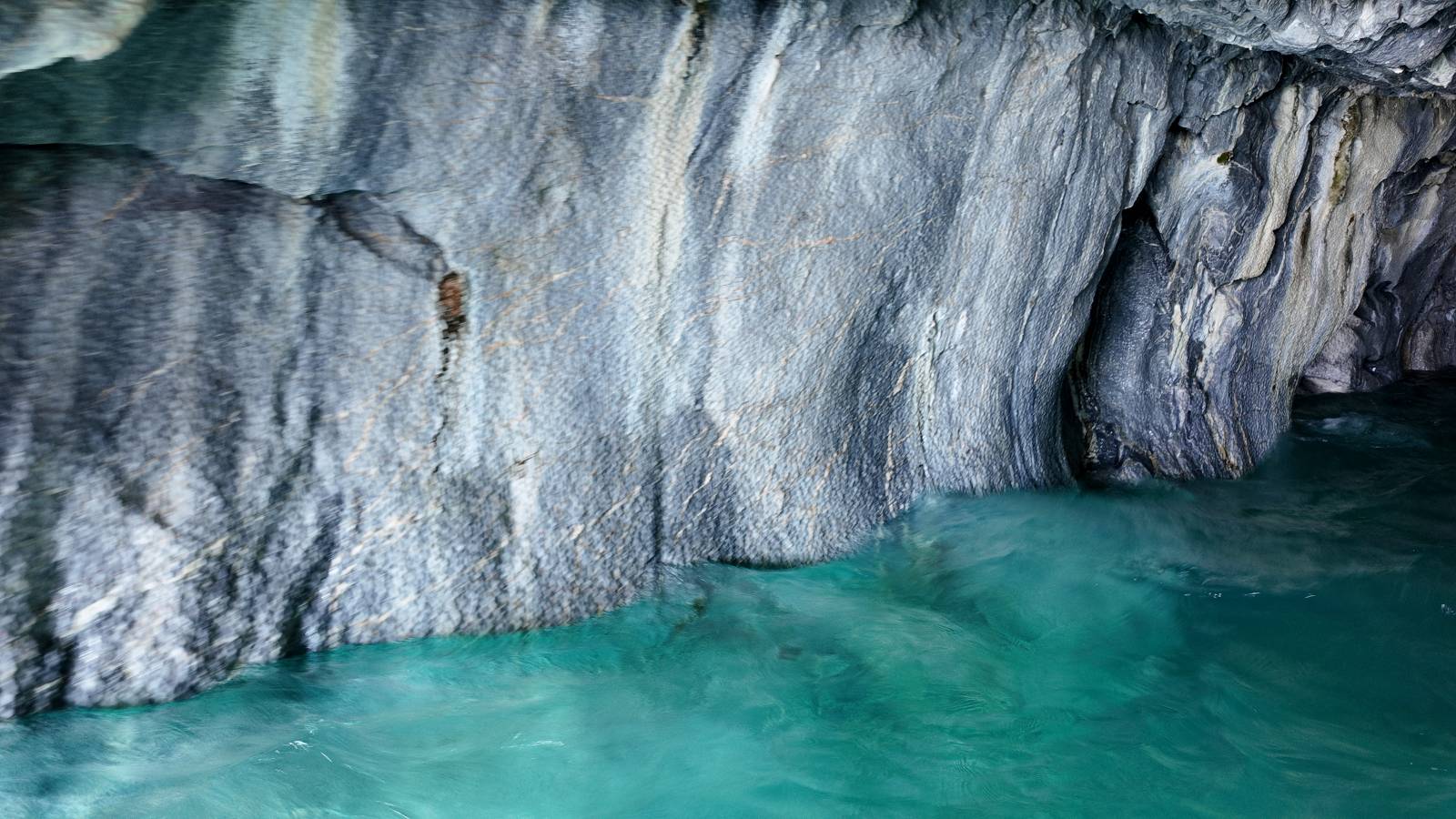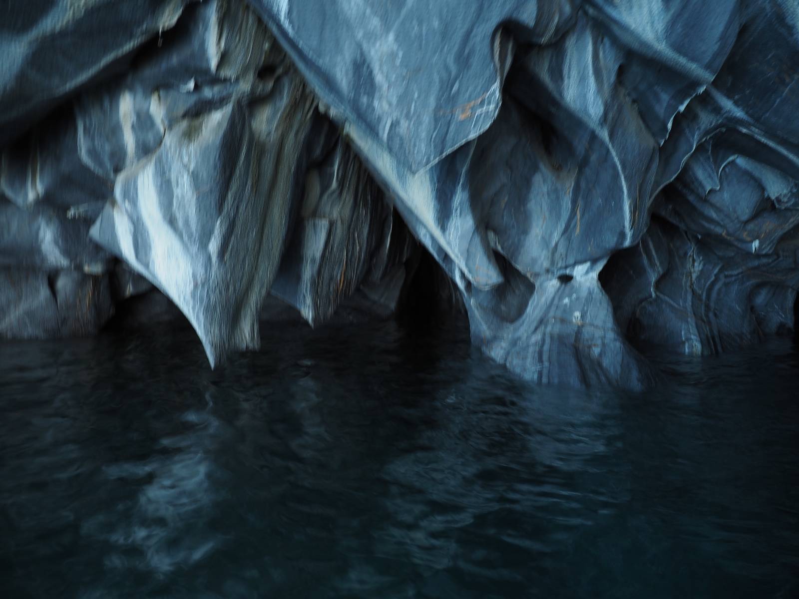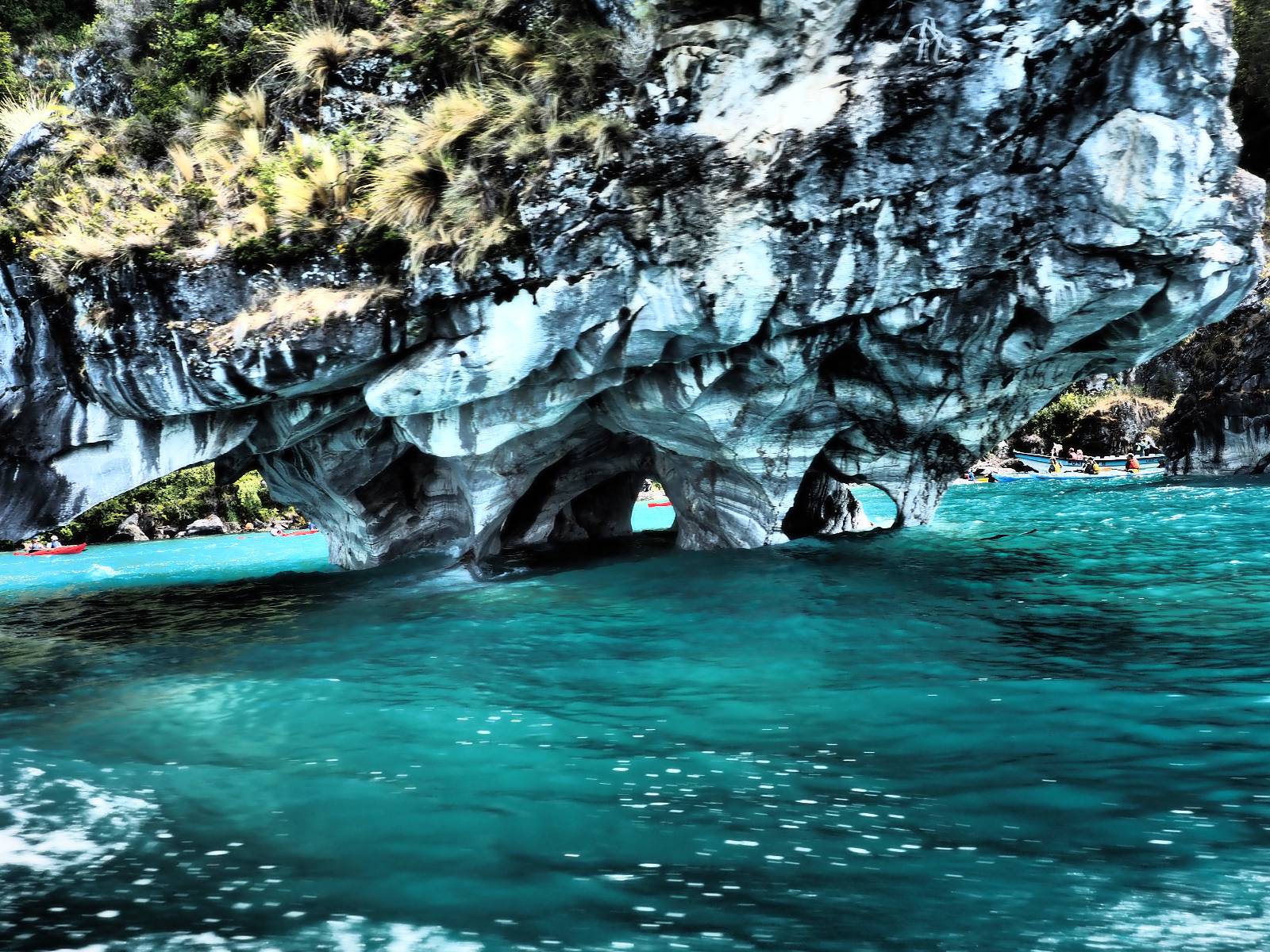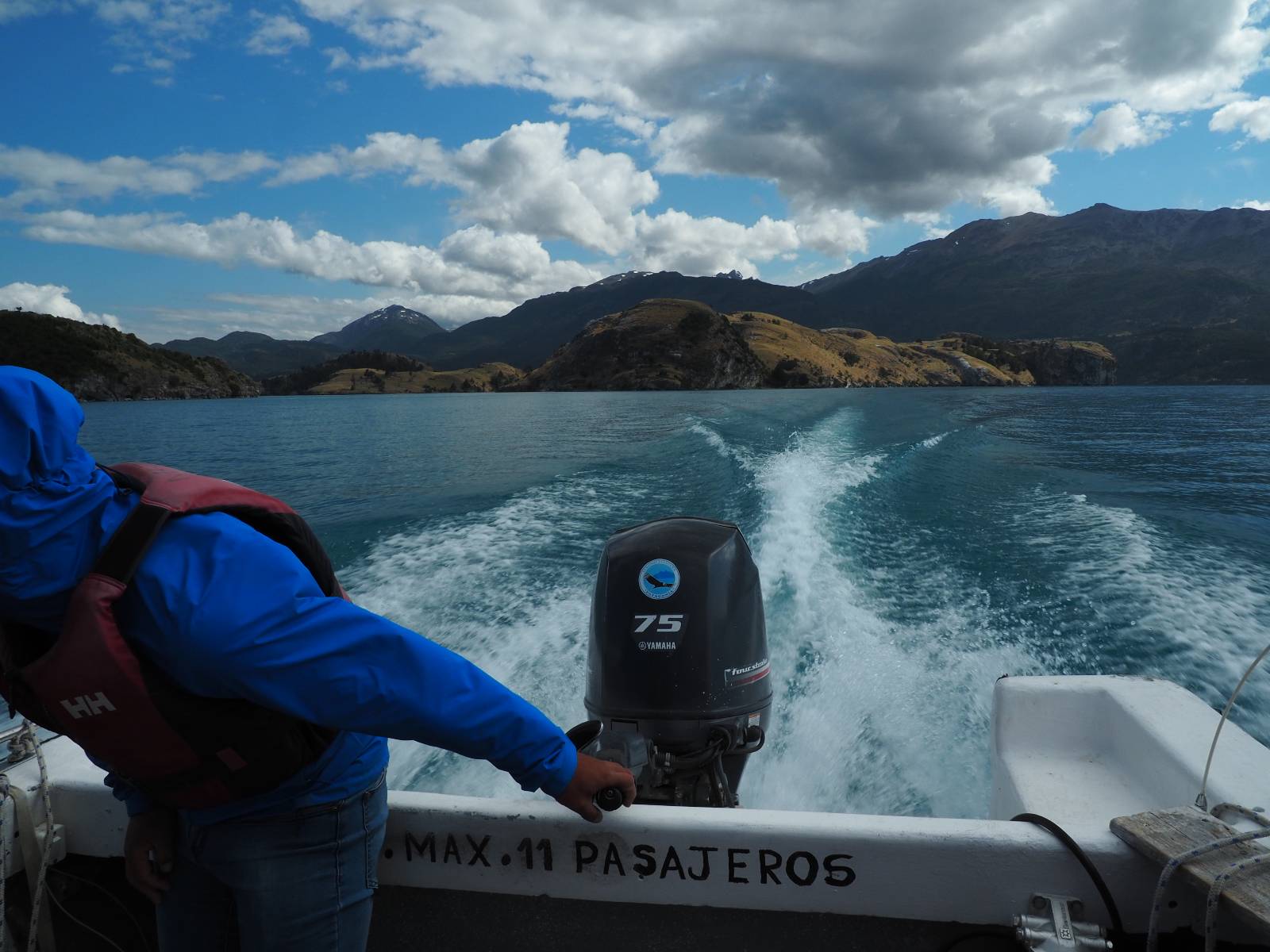 Auf gehts weiter nach Rio Tranquillo! Alles Schotter, der Wind steht fast und es staubt heftig! So manch Pickup ist wie immer schneller und die die ich einhole, denen folge ich in ihrer Wolke, bis sich die Chance zum überholen bietet! Ich hole Matthias ein und die jungen Columbianer auch und erreiche Rio Tranquillo. Aber nix Tranquillo! Hier tummelt sich mal wieder alles, was es so an Touristen zu geben scheint! Eijeijei, das wird schwierig! Das erste Hostal was ich anfahre, geführt von einem Deutschen Paar, dessen Dialekt mir vertraut scheint, nuwa, ist leider völlig ausgebucht! Sie geben mir zwar einen Tip aber auch da ist nichts zu bekommen. Mal wieder hängen auch diverse „keine Zimmer“ Schilder draußen. In einem kleinen Hostal könnte ich etwas für eine Nacht bekommen aber ich brauche zwei. Ich treffe auf der Straße Matthias wieder, bei ihm sieht es nicht viel besser aus und wir entscheiden, den Campingplatz auszuprobieren. Da bekommen wir gut Platz mit diversen Hühnern, die mit ihren Küken das Graß klein halten! Duschen und WC sind ok aber auch das habe ich schon besser erlebt! Aber das passt schon. Nachdem der Staub abgespühlt ist, geht es über den Stoppelacker von Fußballplatz direkt gegenüber ins Restaurant. Bier und Staek sind lecker und der Kellner sehr freundlich! Nach ein bisschen Schnak gibt er mir eine Karte, um evtl. noch eine geführte Tour in die Berge zu einem Gletscher zu machen. Ein junger Amerikaner bekommt das mit und fragt, ob er das abfotografieren darf. Ich erwähne es, weil er zumindest für uns alle Klischees eines „Amis“ erfüllt. Jung, kräftig, gut aussehend, lockiges Haar etwas versnobt, wie aus einer Soap Opera! 😉 Gut, ich gebe zu, um meinen Bauch müsste ich mich auch mal kümmern. 😂 Der Verdauungsspazierganz fürht uns an den See, um auszuloten was uns die Bootsfahrt zu den Marmolhölen kosten würde. Es kostet eigentlich bei jedem Anbieter das selbe und die eine Bude hat noch auf. Die Jungs sind geschäftstüchtig und bieten uns, wenn wir jetzt in Bar zahlen 10% Rabatt. Wahrscheinlich ist das ohnehin der normale Preis aber wir akzeptieren und haben somit die große Runde mit ein paar Inseln und den Marmorhölen in Sack und Tüten. Ich glaube wir hatten die 10:00 Uhr Tour genommen, so ein bisschen ausschlafen muss schon sein. Mit einer ordentlichen Geschwindigkeit geht es über den größten Binnensee Chiles zu erst zu ein paar Inseln mit Schiffswrack und wo ein Herzchirurg aus Coyhaique sein Wochenendhäuschen auf einer der Inseln stehen hat und dann weiter an den Inselkanten vorbei, die wunderbar ausgehölhte Marmorhölen bilden. Hier und da kann sogar unser Boot ein Stückchen reinfahren. Das sieht in dem blauen Wasser und dem Sonnenschein schon sehr fantastisch aus! Die Strukturen unterschiedlichen Grautöne, Streifen, Hölen und Säulen sind durchaus beeindruckend. Es geht nochmal für gute 10min im Highspeedtempo zur Catedral de Marmol und die ist noch einmal wirklich ein paar Nummern schöner anzusehen! Einige Kajakfahrer tummel sich da. Der Bursche aus New York ist auch dabei, natürlich Oberkörper frei, nur mit Schwimmweste, wäre ja auch nicht anders gegangen. Aber wie wir erfahren alles geführte Touren und wirklich nahe ran oder durchfahren darf man nicht. Sie passen zumindest sehr darauf auf, dass niemand etwas kaputt macht. Ein paar Idioten haben wohl vor ein paar Jahren angefangen sich mit ihren Namen verewigen zu wollen… Ich schieße unmengen an Fotos, mal sehen was davon was taugt. Also evtl. bekommt ihr viel zum Schauen, wenn ich nicht ordentlich aussortiere. Schließlich wir der Tag noch richtig angenehm warm und ich entschließe mich nach einem Spazierganz mit Kaffee und Kuchen, doch noch die Badehose zu holen. Am Strand treffe ich „Pi“ Paolo wieder der unterwegs Rowan mit seiner Triumpf Scrambler aufgegabelt hat. Rowan ist Ami, ebenfalls aus New York und er rückt mein Bild wieder gerade. Ich springe…, naja gehe langsam ins Wasser. Die oberen 20cm sind ja okay-frisch aber tiefer merkt man, dass das Wasser wohl auch von den Gletscherflüssen gespeist wird. Zumindes hat es nicht die Temperatur, um unbedingt eine halbe Stunde drin bleiben zu müssen!