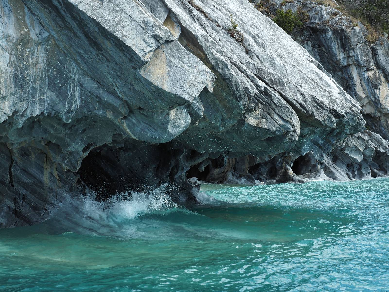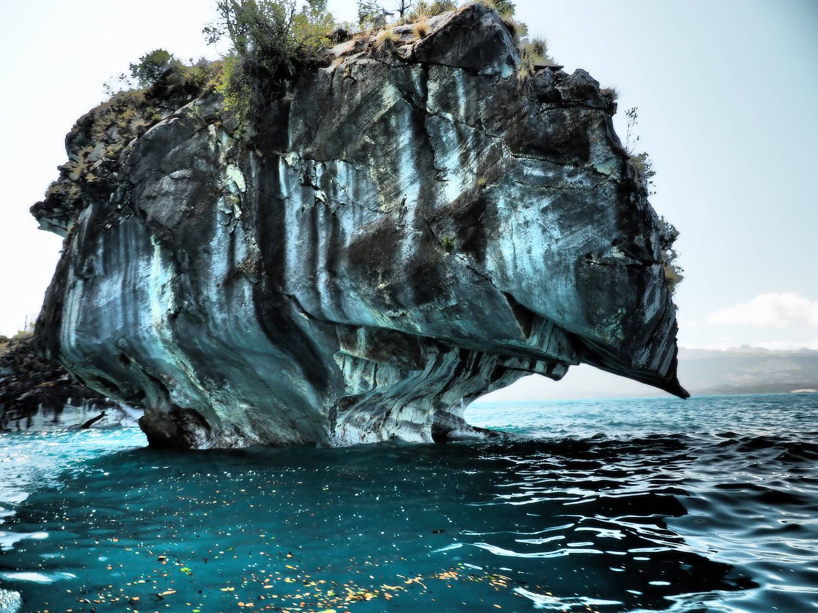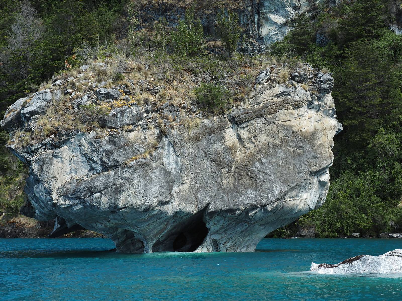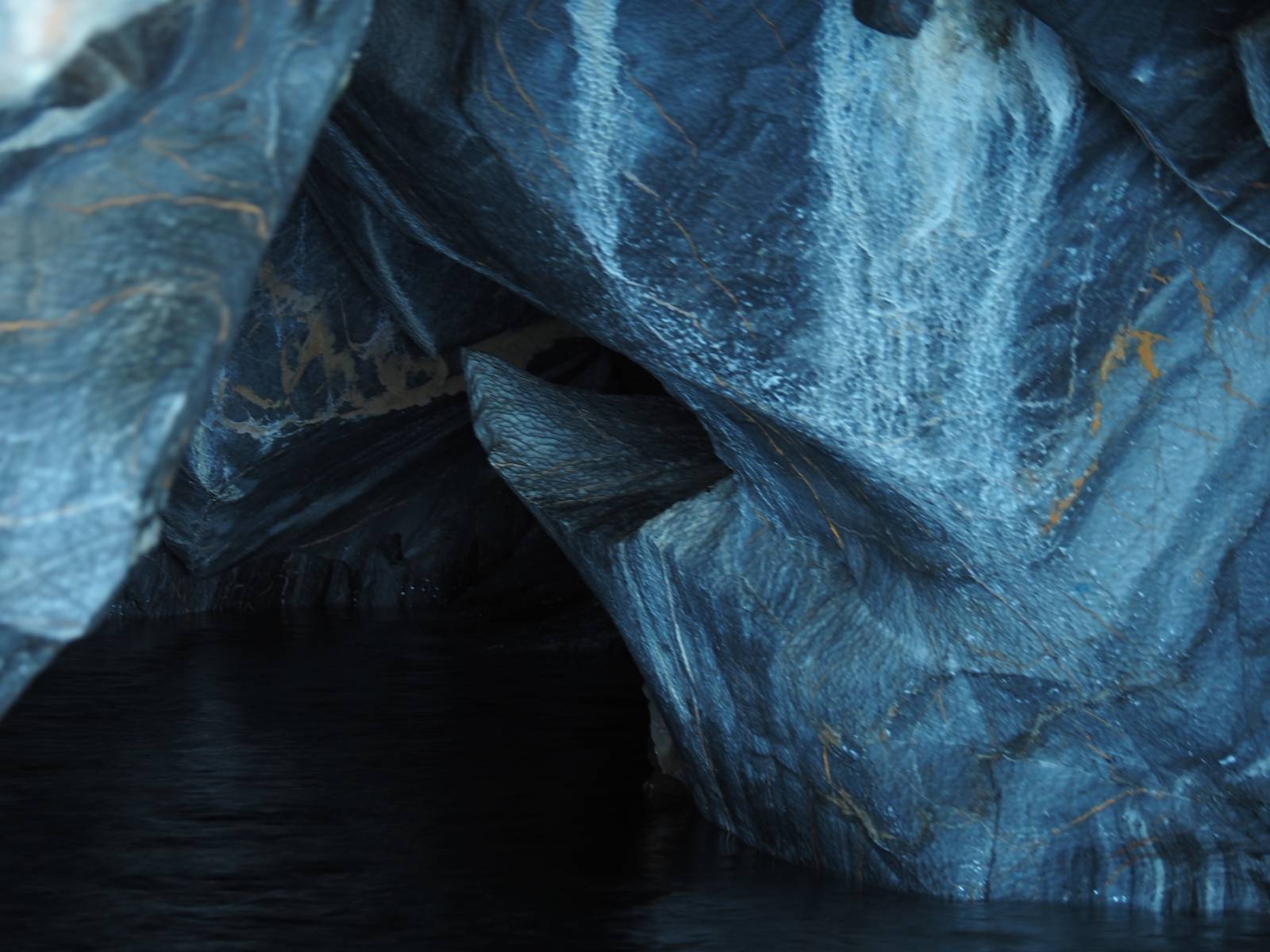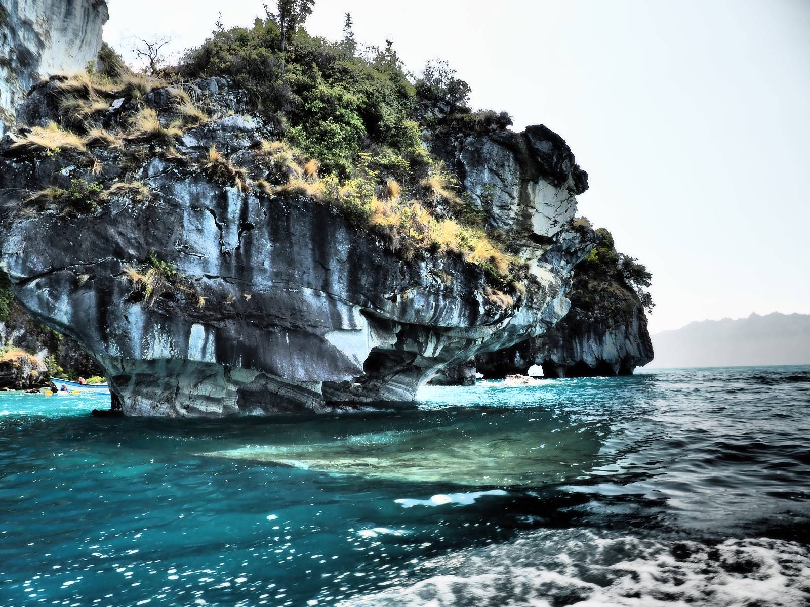 Auf gehts weiter nach Rio Tranquillo! Alles Schotter, der Wind steht fast und es staubt heftig! So manch Pickup ist wie immer schneller und die die ich einhole, denen folge ich in ihrer Wolke, bis sich die Chance zum überholen bietet! Ich hole Matthias ein und die jungen Columbianer auch und erreiche Rio Tranquillo. Aber nix Tranquillo! Hier tummelt sich mal wieder alles, was es so an Touristen zu geben scheint! Eijeijei, das wird schwierig! Das erste Hostal was ich anfahre, geführt von einem Deutschen Paar, dessen Dialekt mir vertraut scheint, nuwa, ist leider völlig ausgebucht! Sie geben mir zwar einen Tip aber auch da ist nichts zu bekommen. Mal wieder hängen auch diverse „keine Zimmer“ Schilder draußen. In einem kleinen Hostal könnte ich etwas für eine Nacht bekommen aber ich brauche zwei. Ich treffe auf der Straße Matthias wieder, bei ihm sieht es nicht viel besser aus und wir entscheiden, den Campingplatz auszuprobieren. Da bekommen wir gut Platz mit diversen Hühnern, die mit ihren Küken das Graß klein halten! Duschen und WC sind ok aber auch das habe ich schon besser erlebt! Aber das passt schon. Nachdem der Staub abgespühlt ist, geht es über den Stoppelacker von Fußballplatz direkt gegenüber ins Restaurant. Bier und Staek sind lecker und der Kellner sehr freundlich! Nach ein bisschen Schnak gibt er mir eine Karte, um evtl. noch eine geführte Tour in die Berge zu einem Gletscher zu machen. Ein junger Amerikaner bekommt das mit und fragt, ob er das abfotografieren darf. Ich erwähne es, weil er zumindest für uns alle Klischees eines „Amis“ erfüllt. Jung, kräftig, gut aussehend, lockiges Haar etwas versnobt, wie aus einer Soap Opera! 😉 Gut, ich gebe zu, um meinen Bauch müsste ich mich auch mal kümmern. 😂 Der Verdauungsspazierganz fürht uns an den See, um auszuloten was uns die Bootsfahrt zu den Marmolhölen kosten würde. Es kostet eigentlich bei jedem Anbieter das selbe und die eine Bude hat noch auf. Die Jungs sind geschäftstüchtig und bieten uns, wenn wir jetzt in Bar zahlen 10% Rabatt. Wahrscheinlich ist das ohnehin der normale Preis aber wir akzeptieren und haben somit die große Runde mit ein paar Inseln und den Marmorhölen in Sack und Tüten. Ich glaube wir hatten die 10:00 Uhr Tour genommen, so ein bisschen ausschlafen muss schon sein. Mit einer ordentlichen Geschwindigkeit geht es über den größten Binnensee Chiles zu erst zu ein paar Inseln mit Schiffswrack und wo ein Herzchirurg aus Coyhaique sein Wochenendhäuschen auf einer der Inseln stehen hat und dann weiter an den Inselkanten vorbei, die wunderbar ausgehölhte Marmorhölen bilden. Hier und da kann sogar unser Boot ein Stückchen reinfahren. Das sieht in dem blauen Wasser und dem Sonnenschein schon sehr fantastisch aus! Die Strukturen unterschiedlichen Grautöne, Streifen, Hölen und Säulen sind durchaus beeindruckend. Es geht nochmal für gute 10min im Highspeedtempo zur Catedral de Marmol und die ist noch einmal wirklich ein paar Nummern schöner anzusehen! Einige Kajakfahrer tummel sich da. Der Bursche aus New York ist auch dabei, natürlich Oberkörper frei, nur mit Schwimmweste, wäre ja auch nicht anders gegangen. Aber wie wir erfahren alles geführte Touren und wirklich nahe ran oder durchfahren darf man nicht. Sie passen zumindest sehr darauf auf, dass niemand etwas kaputt macht. Ein paar Idioten haben wohl vor ein paar Jahren angefangen sich mit ihren Namen verewigen zu wollen… Ich schieße unmengen an Fotos, mal sehen was davon was taugt. Also evtl. bekommt ihr viel zum Schauen, wenn ich nicht ordentlich aussortiere. Schließlich wir der Tag noch richtig angenehm warm und ich entschließe mich nach einem Spazierganz mit Kaffee und Kuchen, doch noch die Badehose zu holen. Am Strand treffe ich „Pi“ Paolo wieder der unterwegs Rowan mit seiner Triumpf Scrambler aufgegabelt hat. Rowan ist Ami, ebenfalls aus New York und er rückt mein Bild wieder gerade. Ich springe…, naja gehe langsam ins Wasser. Die oberen 20cm sind ja okay-frisch aber tiefer merkt man, dass das Wasser wohl auch von den Gletscherflüssen gespeist wird. Zumindes hat es nicht die Temperatur, um unbedingt eine halbe Stunde drin bleiben zu müssen!