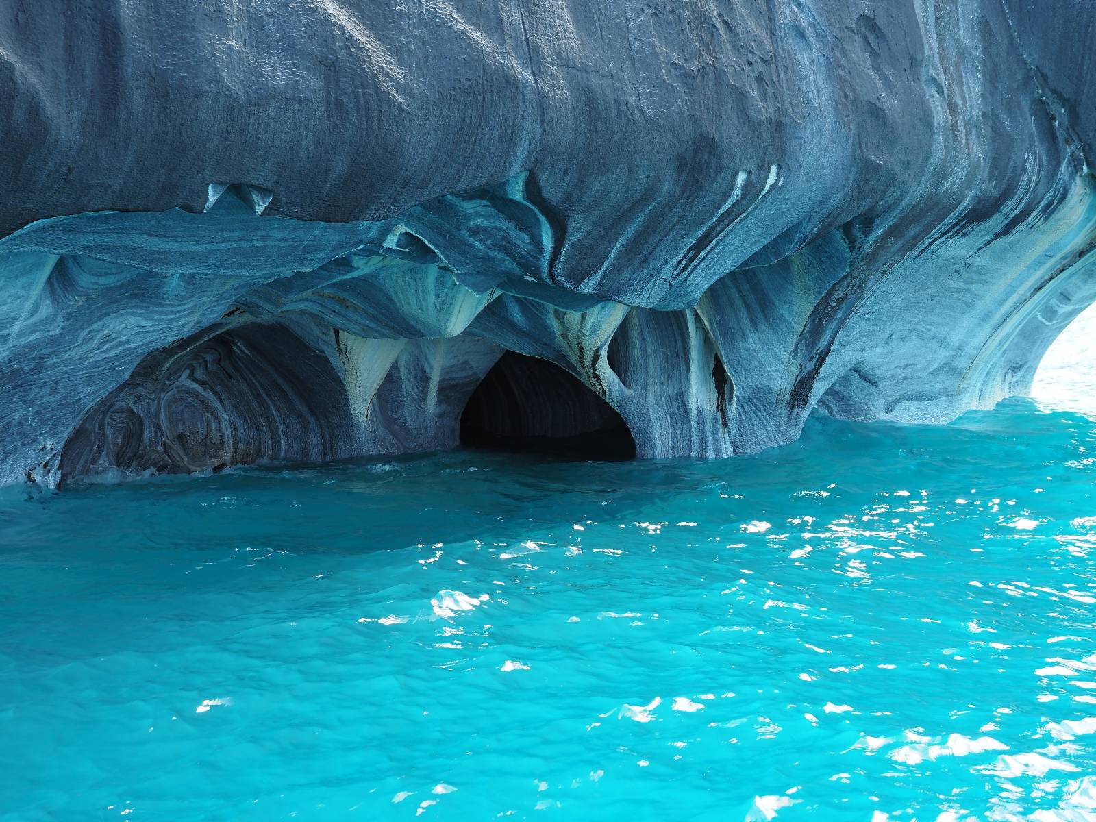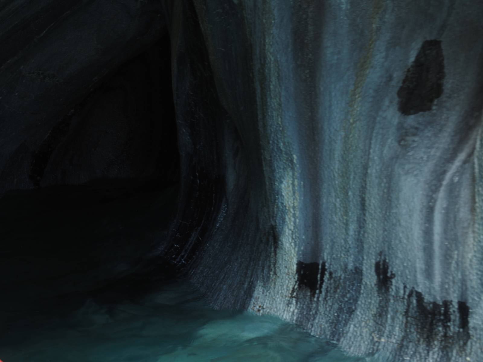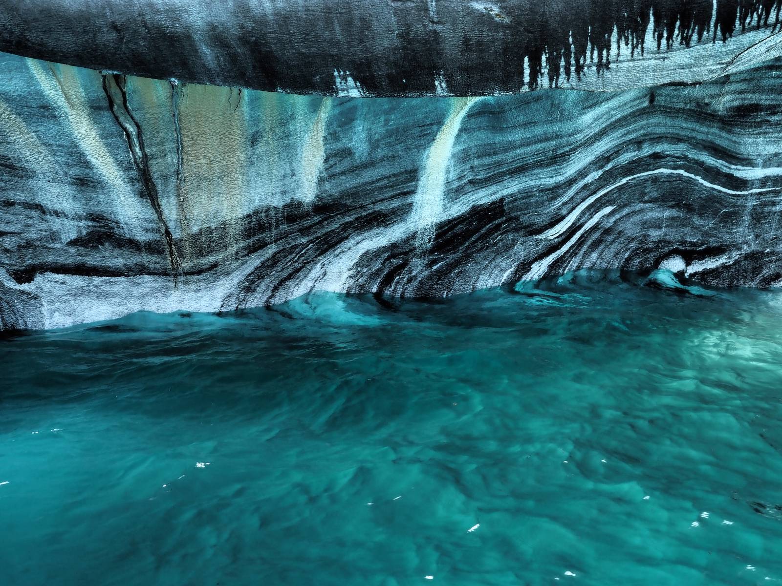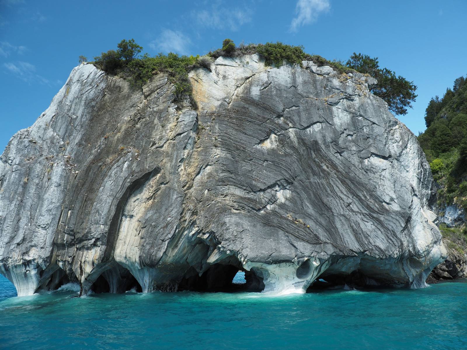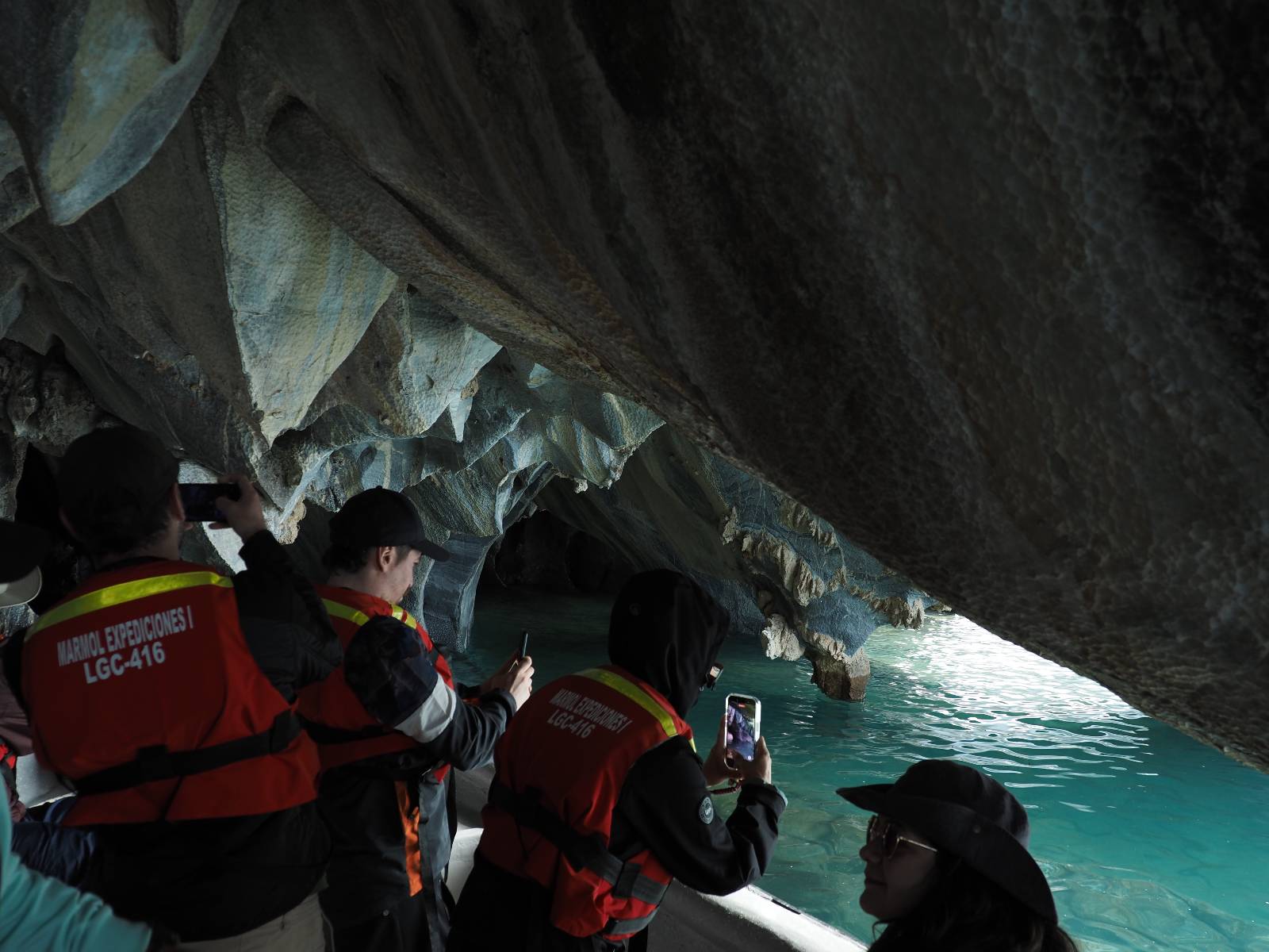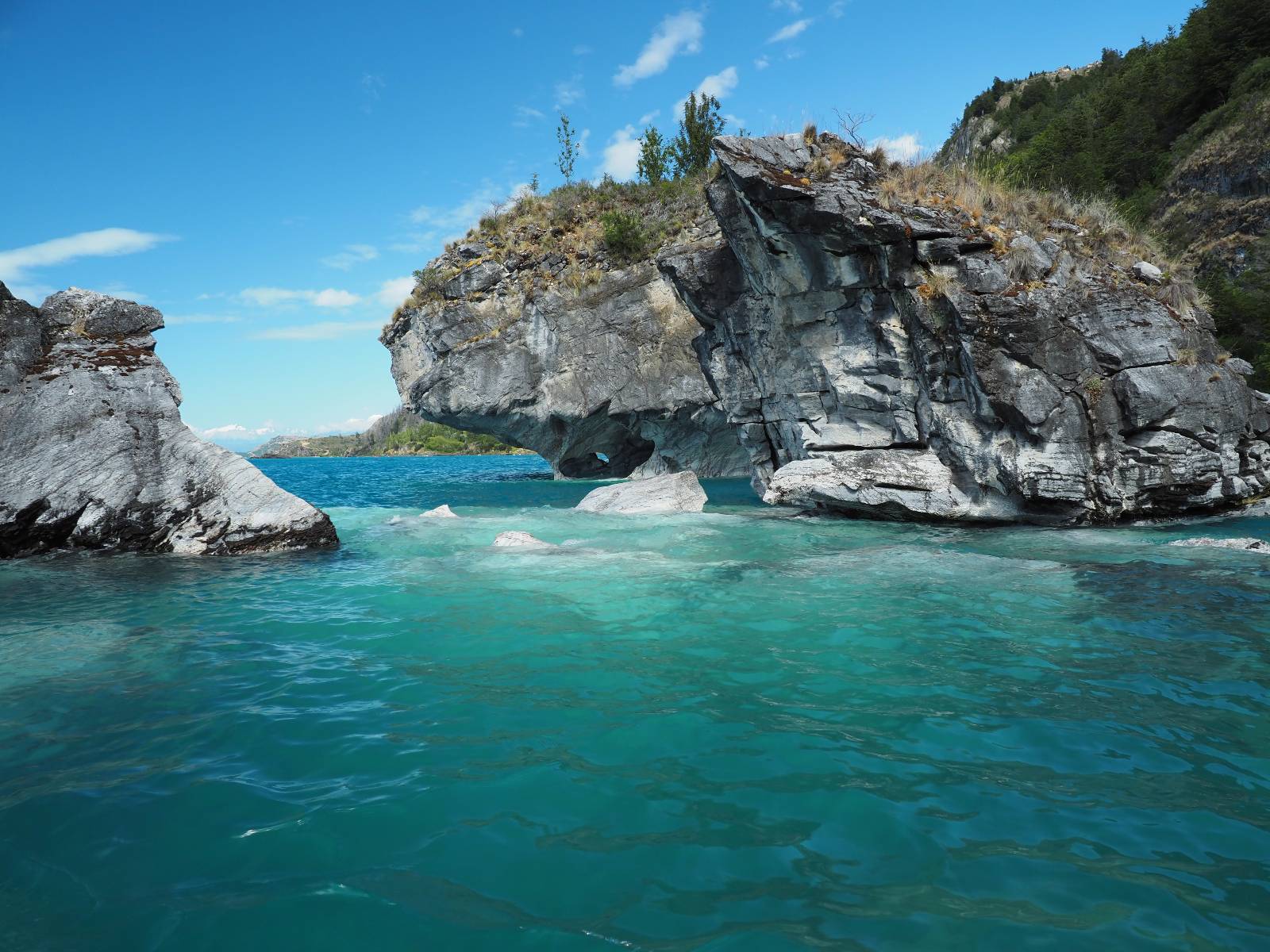 Auf gehts weiter nach Rio Tranquillo! Alles Schotter, der Wind steht fast und es staubt heftig! So manch Pickup ist wie immer schneller und die die ich einhole, denen folge ich in ihrer Wolke, bis sich die Chance zum überholen bietet! Ich hole Matthias ein und die jungen Columbianer auch und erreiche Rio Tranquillo. Aber nix Tranquillo! Hier tummelt sich mal wieder alles, was es so an Touristen zu geben scheint! Eijeijei, das wird schwierig! Das erste Hostal was ich anfahre, geführt von einem Deutschen Paar, dessen Dialekt mir vertraut scheint, nuwa, ist leider völlig ausgebucht! Sie geben mir zwar einen Tip aber auch da ist nichts zu bekommen. Mal wieder hängen auch diverse „keine Zimmer“ Schilder draußen. In einem kleinen Hostal könnte ich etwas für eine Nacht bekommen aber ich brauche zwei. Ich treffe auf der Straße Matthias wieder, bei ihm sieht es nicht viel besser aus und wir entscheiden, den Campingplatz auszuprobieren. Da bekommen wir gut Platz mit diversen Hühnern, die mit ihren Küken das Graß klein halten! Duschen und WC sind ok aber auch das habe ich schon besser erlebt! Aber das passt schon. Nachdem der Staub abgespühlt ist, geht es über den Stoppelacker von Fußballplatz direkt gegenüber ins Restaurant. Bier und Staek sind lecker und der Kellner sehr freundlich! Nach ein bisschen Schnak gibt er mir eine Karte, um evtl. noch eine geführte Tour in die Berge zu einem Gletscher zu machen. Ein junger Amerikaner bekommt das mit und fragt, ob er das abfotografieren darf. Ich erwähne es, weil er zumindest für uns alle Klischees eines „Amis“ erfüllt. Jung, kräftig, gut aussehend, lockiges Haar etwas versnobt, wie aus einer Soap Opera! 😉 Gut, ich gebe zu, um meinen Bauch müsste ich mich auch mal kümmern. 😂 Der Verdauungsspazierganz fürht uns an den See, um auszuloten was uns die Bootsfahrt zu den Marmolhölen kosten würde. Es kostet eigentlich bei jedem Anbieter das selbe und die eine Bude hat noch auf. Die Jungs sind geschäftstüchtig und bieten uns, wenn wir jetzt in Bar zahlen 10% Rabatt. Wahrscheinlich ist das ohnehin der normale Preis aber wir akzeptieren und haben somit die große Runde mit ein paar Inseln und den Marmorhölen in Sack und Tüten. Ich glaube wir hatten die 10:00 Uhr Tour genommen, so ein bisschen ausschlafen muss schon sein. Mit einer ordentlichen Geschwindigkeit geht es über den größten Binnensee Chiles zu erst zu ein paar Inseln mit Schiffswrack und wo ein Herzchirurg aus Coyhaique sein Wochenendhäuschen auf einer der Inseln stehen hat und dann weiter an den Inselkanten vorbei, die wunderbar ausgehölhte Marmorhölen bilden. Hier und da kann sogar unser Boot ein Stückchen reinfahren. Das sieht in dem blauen Wasser und dem Sonnenschein schon sehr fantastisch aus! Die Strukturen unterschiedlichen Grautöne, Streifen, Hölen und Säulen sind durchaus beeindruckend. Es geht nochmal für gute 10min im Highspeedtempo zur Catedral de Marmol und die ist noch einmal wirklich ein paar Nummern schöner anzusehen! Einige Kajakfahrer tummel sich da. Der Bursche aus New York ist auch dabei, natürlich Oberkörper frei, nur mit Schwimmweste, wäre ja auch nicht anders gegangen. Aber wie wir erfahren alles geführte Touren und wirklich nahe ran oder durchfahren darf man nicht. Sie passen zumindest sehr darauf auf, dass niemand etwas kaputt macht. Ein paar Idioten haben wohl vor ein paar Jahren angefangen sich mit ihren Namen verewigen zu wollen… Ich schieße unmengen an Fotos, mal sehen was davon was taugt. Also evtl. bekommt ihr viel zum Schauen, wenn ich nicht ordentlich aussortiere. Schließlich wir der Tag noch richtig angenehm warm und ich entschließe mich nach einem Spazierganz mit Kaffee und Kuchen, doch noch die Badehose zu holen. Am Strand treffe ich „Pi“ Paolo wieder der unterwegs Rowan mit seiner Triumpf Scrambler aufgegabelt hat. Rowan ist Ami, ebenfalls aus New York und er rückt mein Bild wieder gerade. Ich springe…, naja gehe langsam ins Wasser. Die oberen 20cm sind ja okay-frisch aber tiefer merkt man, dass das Wasser wohl auch von den Gletscherflüssen gespeist wird. Zumindes hat es nicht die Temperatur, um unbedingt eine halbe Stunde drin bleiben zu müssen!