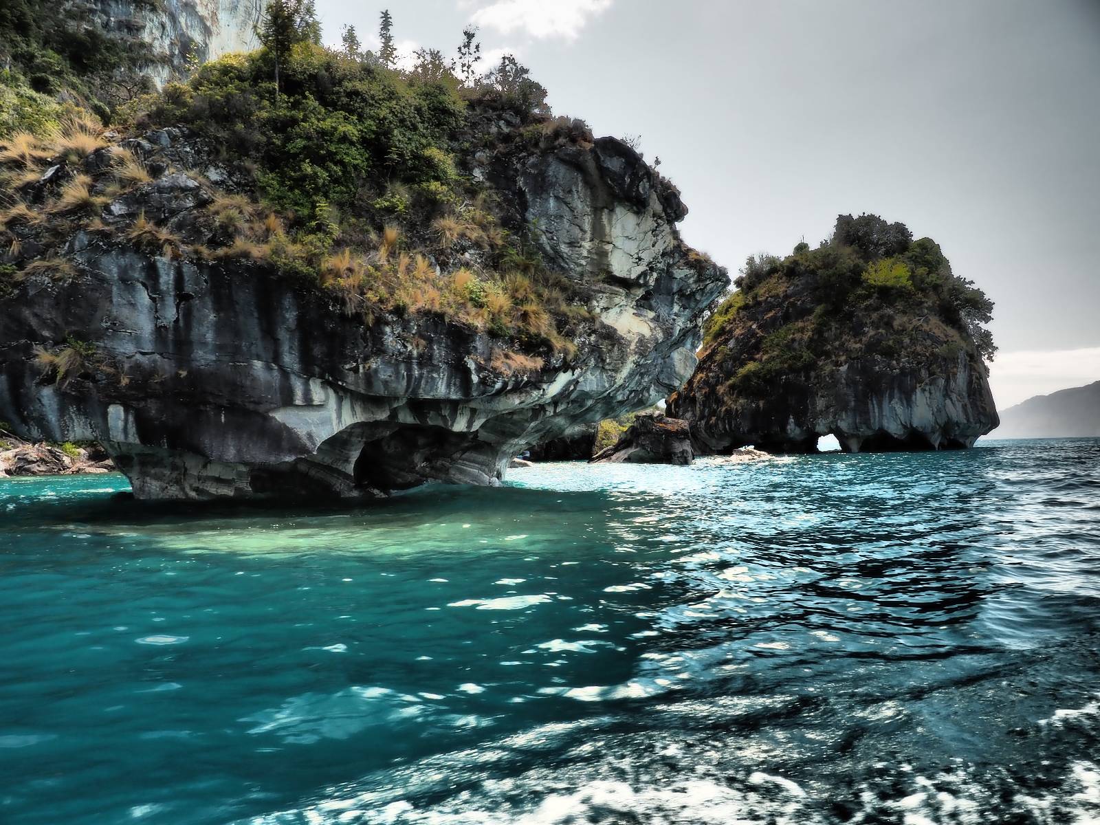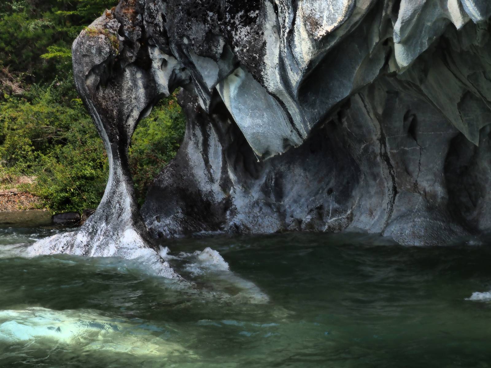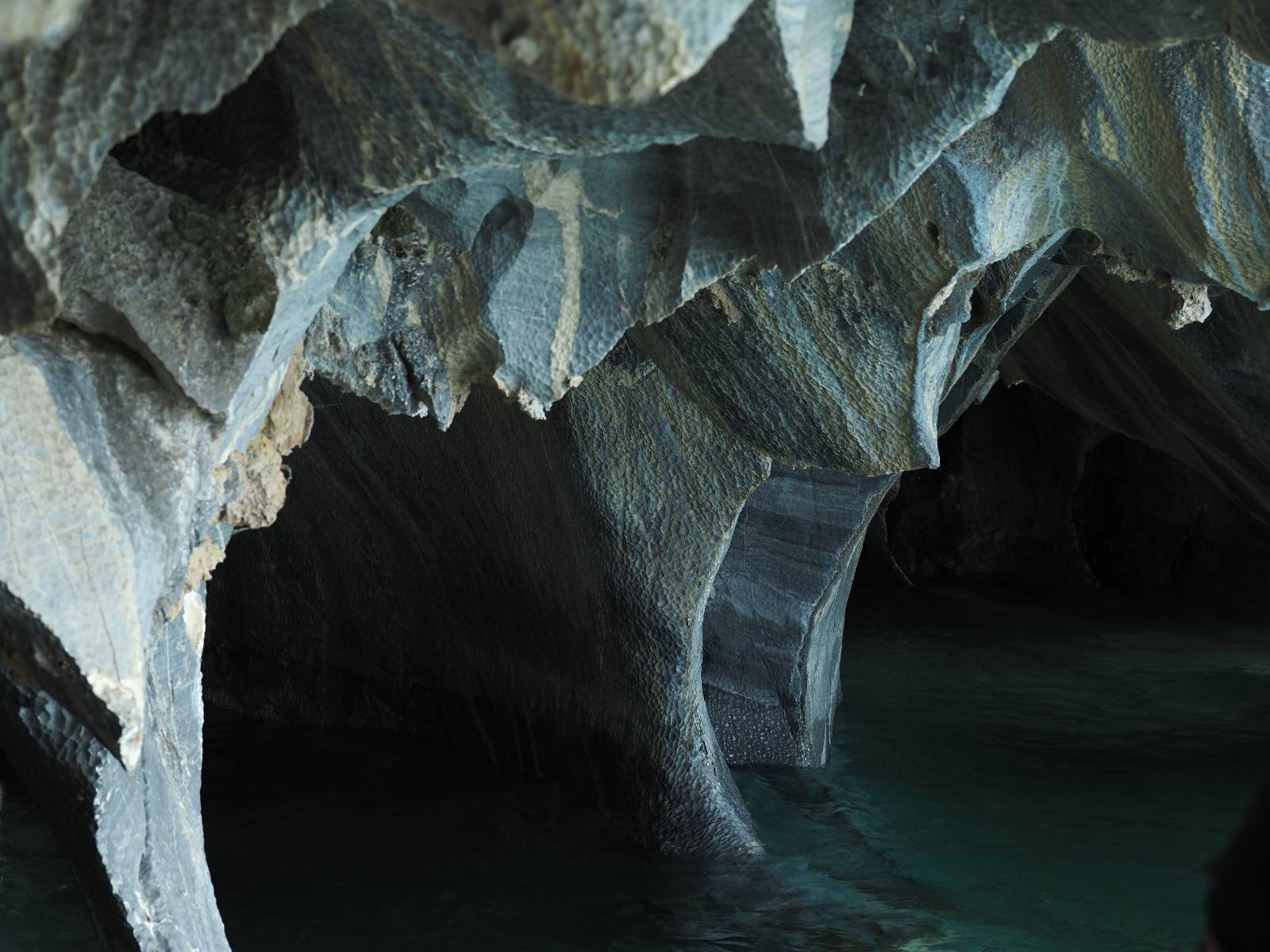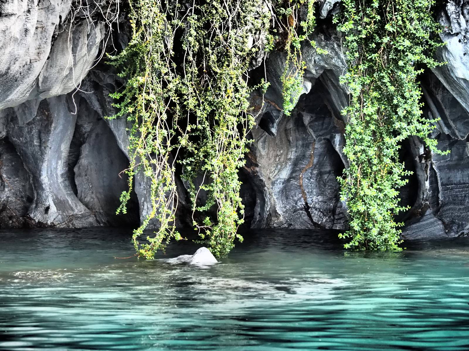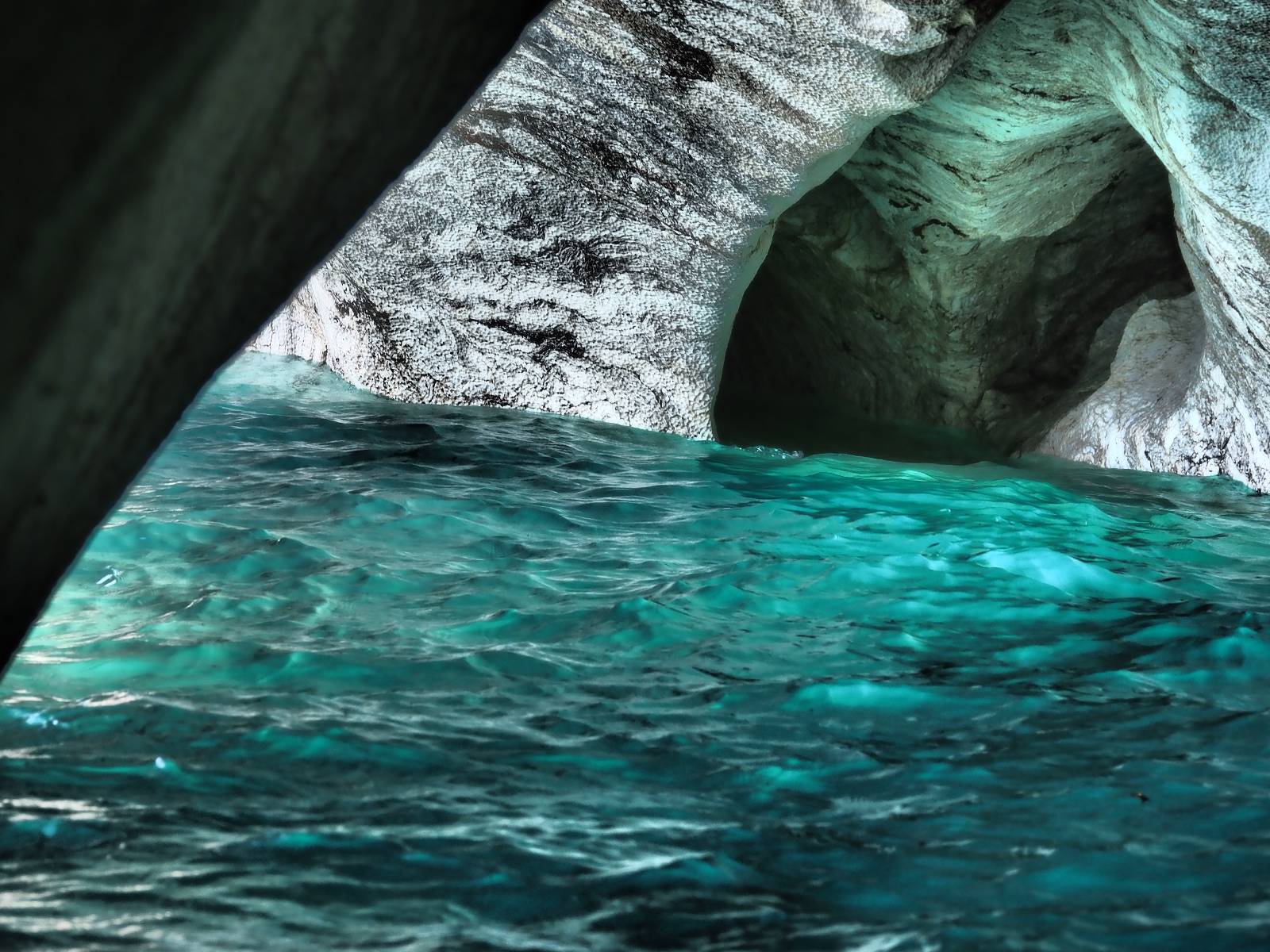 Auf gehts weiter nach Rio Tranquillo! Alles Schotter, der Wind steht fast und es staubt heftig! So manch Pickup ist wie immer schneller und die die ich einhole, denen folge ich in ihrer Wolke, bis sich die Chance zum überholen bietet! Ich hole Matthias ein und die jungen Columbianer auch und erreiche Rio Tranquillo. Aber nix Tranquillo! Hier tummelt sich mal wieder alles, was es so an Touristen zu geben scheint! Eijeijei, das wird schwierig! Das erste Hostal was ich anfahre, geführt von einem Deutschen Paar, dessen Dialekt mir vertraut scheint, nuwa, ist leider völlig ausgebucht! Sie geben mir zwar einen Tip aber auch da ist nichts zu bekommen. Mal wieder hängen auch diverse „keine Zimmer“ Schilder draußen. In einem kleinen Hostal könnte ich etwas für eine Nacht bekommen aber ich brauche zwei. Ich treffe auf der Straße Matthias wieder, bei ihm sieht es nicht viel besser aus und wir entscheiden, den Campingplatz auszuprobieren. Da bekommen wir gut Platz mit diversen Hühnern, die mit ihren Küken das Graß klein halten! Duschen und WC sind ok aber auch das habe ich schon besser erlebt! Aber das passt schon. Nachdem der Staub abgespühlt ist, geht es über den Stoppelacker von Fußballplatz direkt gegenüber ins Restaurant. Bier und Staek sind lecker und der Kellner sehr freundlich! Nach ein bisschen Schnak gibt er mir eine Karte, um evtl. noch eine geführte Tour in die Berge zu einem Gletscher zu machen. Ein junger Amerikaner bekommt das mit und fragt, ob er das abfotografieren darf. Ich erwähne es, weil er zumindest für uns alle Klischees eines „Amis“ erfüllt. Jung, kräftig, gut aussehend, lockiges Haar etwas versnobt, wie aus einer Soap Opera! 😉 Gut, ich gebe zu, um meinen Bauch müsste ich mich auch mal kümmern. 😂 Der Verdauungsspazierganz fürht uns an den See, um auszuloten was uns die Bootsfahrt zu den Marmolhölen kosten würde. Es kostet eigentlich bei jedem Anbieter das selbe und die eine Bude hat noch auf. Die Jungs sind geschäftstüchtig und bieten uns, wenn wir jetzt in Bar zahlen 10% Rabatt. Wahrscheinlich ist das ohnehin der normale Preis aber wir akzeptieren und haben somit die große Runde mit ein paar Inseln und den Marmorhölen in Sack und Tüten. Ich glaube wir hatten die 10:00 Uhr Tour genommen, so ein bisschen ausschlafen muss schon sein. Mit einer ordentlichen Geschwindigkeit geht es über den größten Binnensee Chiles zu erst zu ein paar Inseln mit Schiffswrack und wo ein Herzchirurg aus Coyhaique sein Wochenendhäuschen auf einer der Inseln stehen hat und dann weiter an den Inselkanten vorbei, die wunderbar ausgehölhte Marmorhölen bilden. Hier und da kann sogar unser Boot ein Stückchen reinfahren. Das sieht in dem blauen Wasser und dem Sonnenschein schon sehr fantastisch aus! Die Strukturen unterschiedlichen Grautöne, Streifen, Hölen und Säulen sind durchaus beeindruckend. Es geht nochmal für gute 10min im Highspeedtempo zur Catedral de Marmol und die ist noch einmal wirklich ein paar Nummern schöner anzusehen! Einige Kajakfahrer tummel sich da. Der Bursche aus New York ist auch dabei, natürlich Oberkörper frei, nur mit Schwimmweste, wäre ja auch nicht anders gegangen. Aber wie wir erfahren alles geführte Touren und wirklich nahe ran oder durchfahren darf man nicht. Sie passen zumindest sehr darauf auf, dass niemand etwas kaputt macht. Ein paar Idioten haben wohl vor ein paar Jahren angefangen sich mit ihren Namen verewigen zu wollen… Ich schieße unmengen an Fotos, mal sehen was davon was taugt. Also evtl. bekommt ihr viel zum Schauen, wenn ich nicht ordentlich aussortiere. Schließlich wir der Tag noch richtig angenehm warm und ich entschließe mich nach einem Spazierganz mit Kaffee und Kuchen, doch noch die Badehose zu holen. Am Strand treffe ich „Pi“ Paolo wieder der unterwegs Rowan mit seiner Triumpf Scrambler aufgegabelt hat. Rowan ist Ami, ebenfalls aus New York und er rückt mein Bild wieder gerade. Ich springe…, naja gehe langsam ins Wasser. Die oberen 20cm sind ja okay-frisch aber tiefer merkt man, dass das Wasser wohl auch von den Gletscherflüssen gespeist wird. Zumindes hat es nicht die Temperatur, um unbedingt eine halbe Stunde drin bleiben zu müssen!