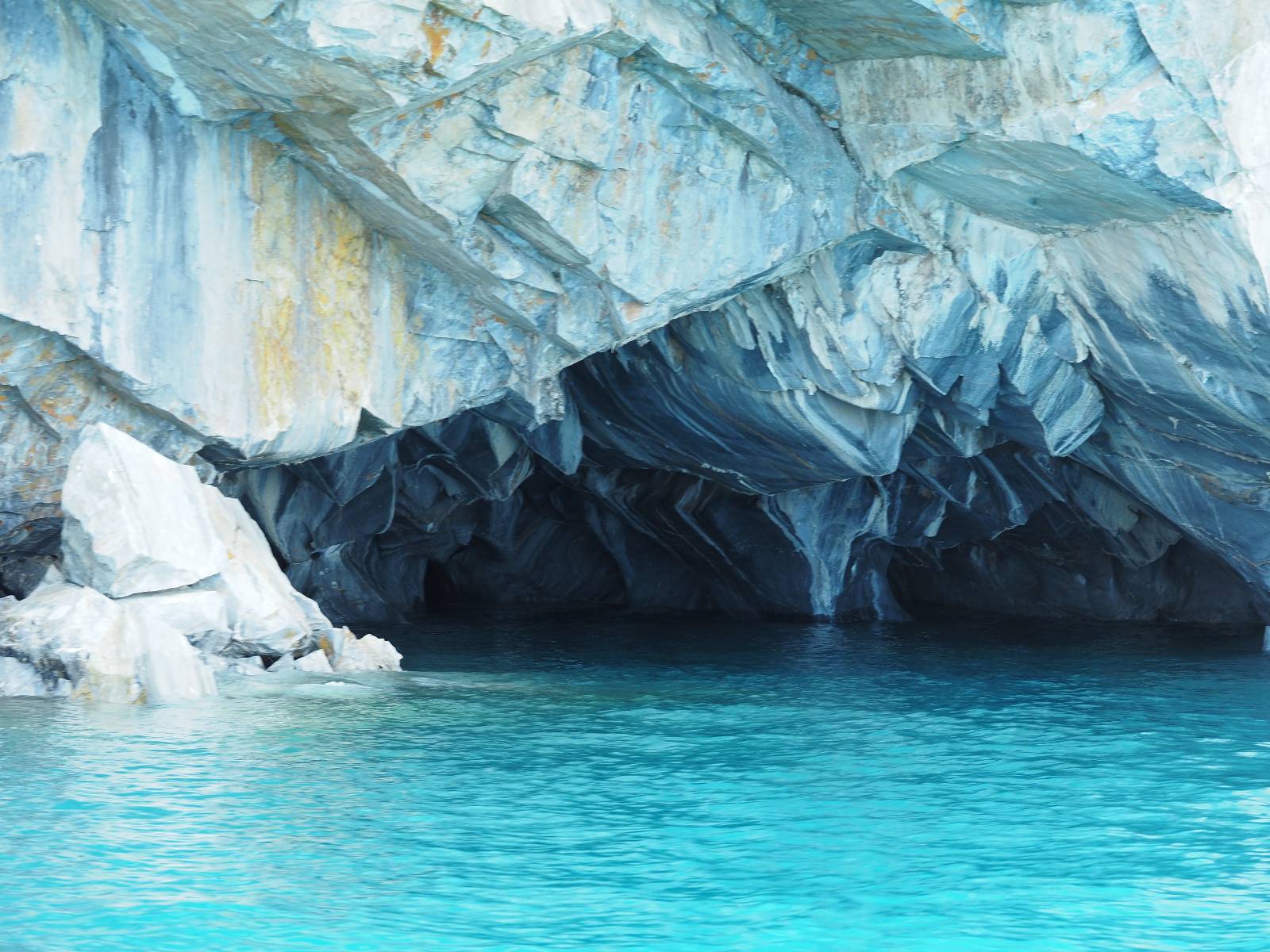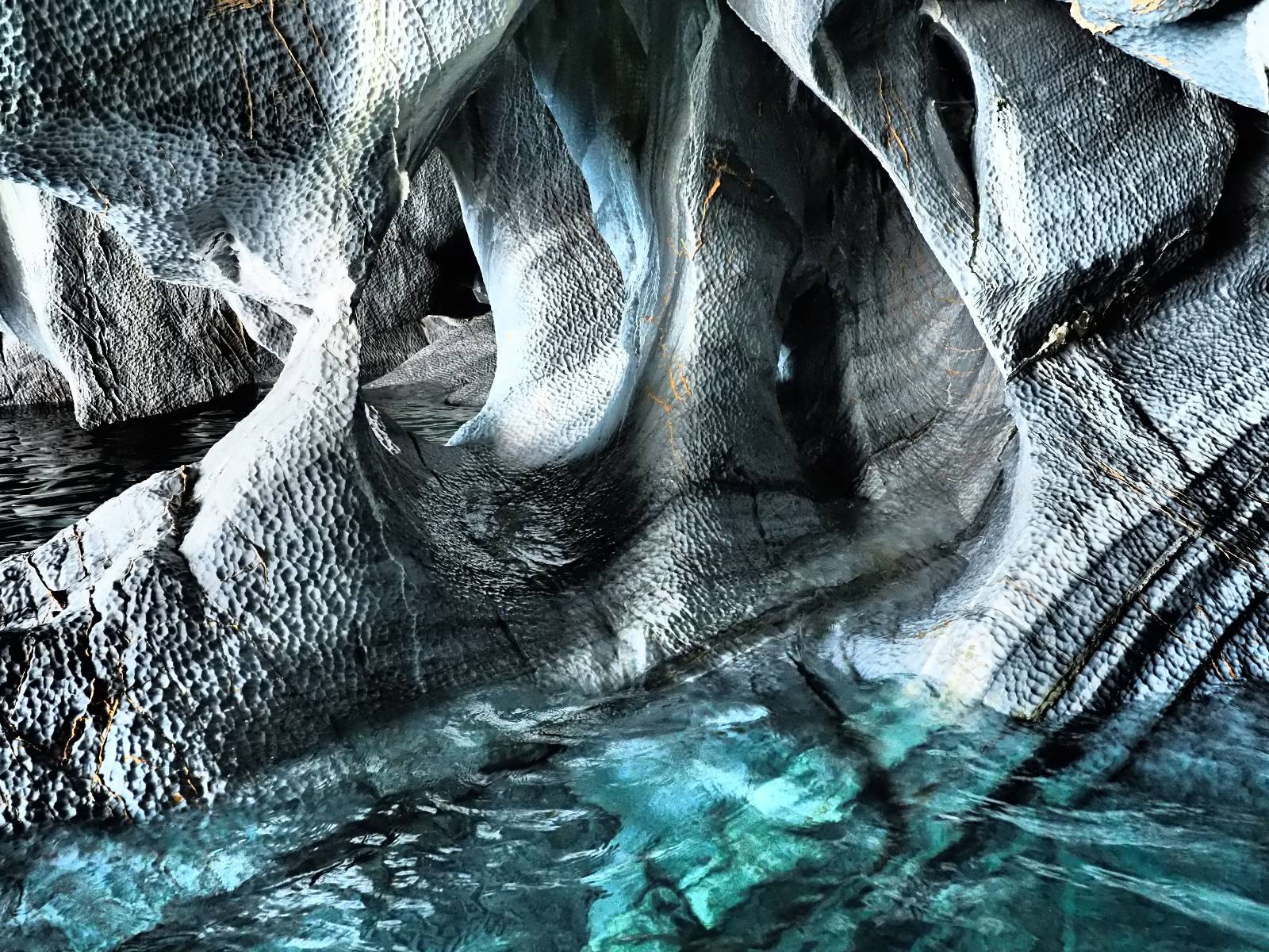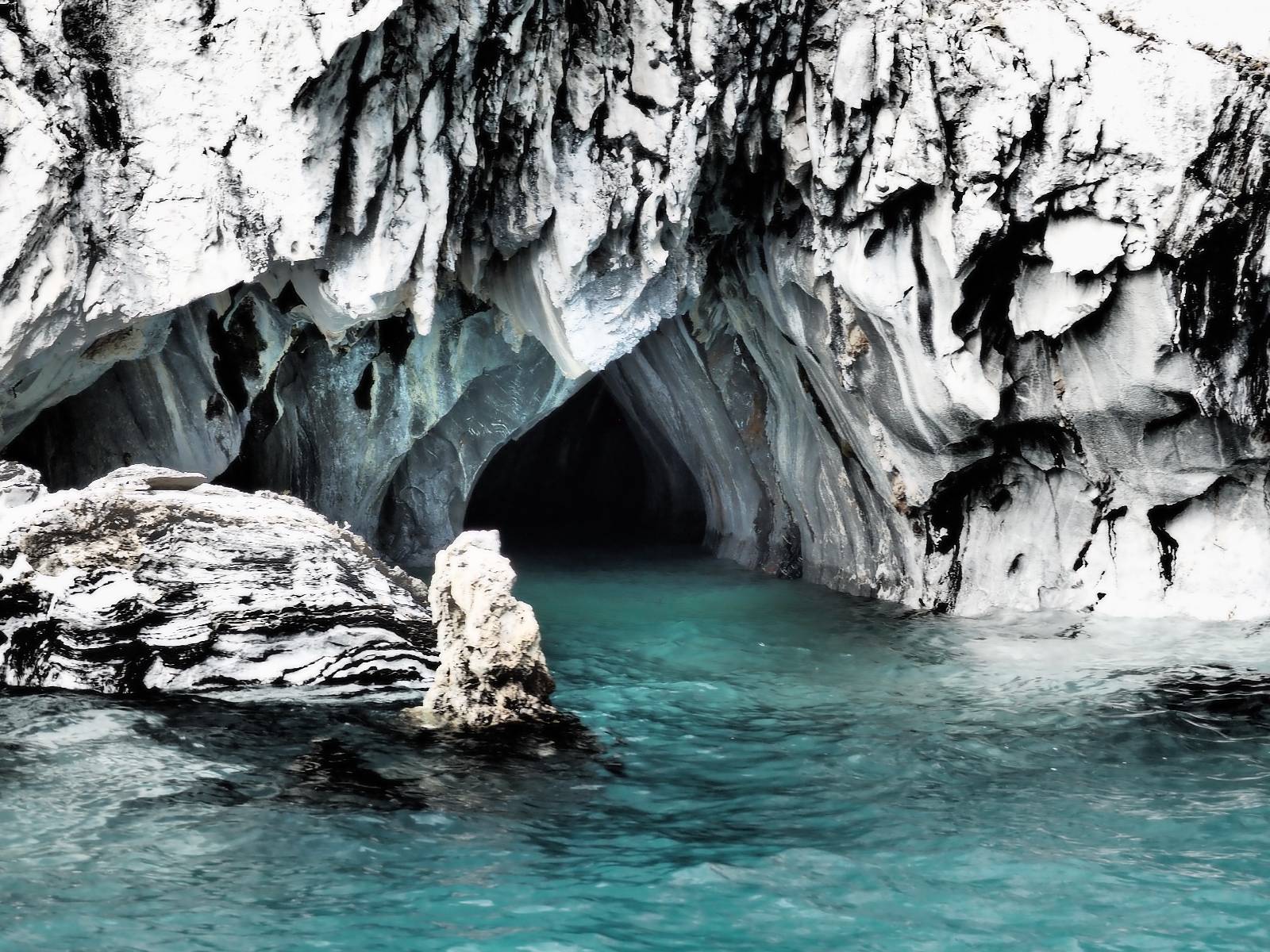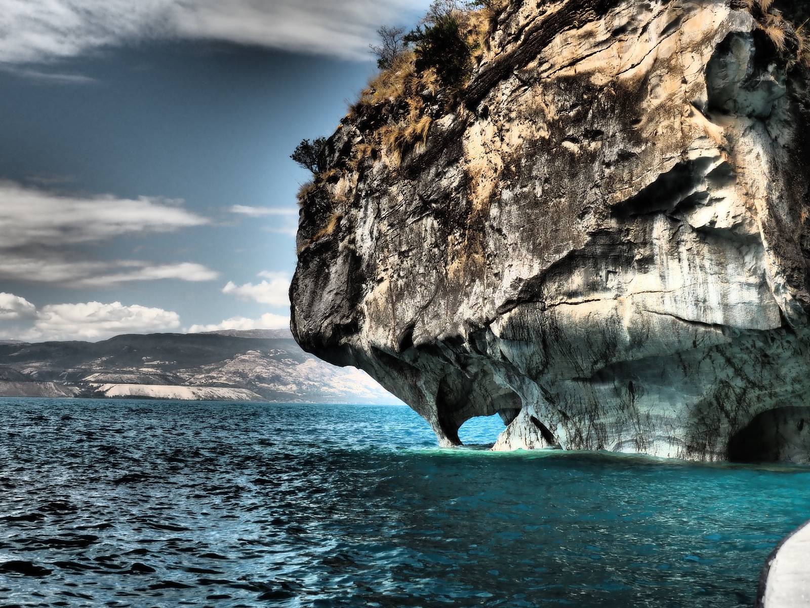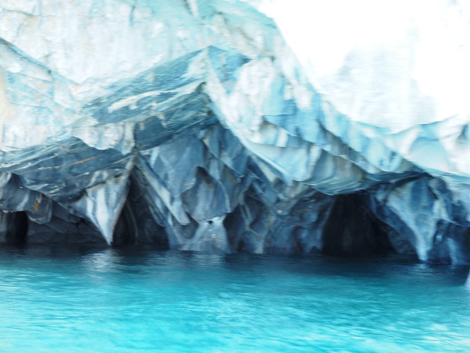 Auf gehts weiter nach Rio Tranquillo! Alles Schotter, der Wind steht fast und es staubt heftig! So manch Pickup ist wie immer schneller und die die ich einhole, denen folge ich in ihrer Wolke, bis sich die Chance zum überholen bietet! Ich hole Matthias ein und die jungen Columbianer auch und erreiche Rio Tranquillo. Aber nix Tranquillo! Hier tummelt sich mal wieder alles, was es so an Touristen zu geben scheint! Eijeijei, das wird schwierig! Das erste Hostal was ich anfahre, geführt von einem Deutschen Paar, dessen Dialekt mir vertraut scheint, nuwa, ist leider völlig ausgebucht! Sie geben mir zwar einen Tip aber auch da ist nichts zu bekommen. Mal wieder hängen auch diverse „keine Zimmer“ Schilder draußen. In einem kleinen Hostal könnte ich etwas für eine Nacht bekommen aber ich brauche zwei. Ich treffe auf der Straße Matthias wieder, bei ihm sieht es nicht viel besser aus und wir entscheiden, den Campingplatz auszuprobieren. Da bekommen wir gut Platz mit diversen Hühnern, die mit ihren Küken das Graß klein halten! Duschen und WC sind ok aber auch das habe ich schon besser erlebt! Aber das passt schon. Nachdem der Staub abgespühlt ist, geht es über den Stoppelacker von Fußballplatz direkt gegenüber ins Restaurant. Bier und Staek sind lecker und der Kellner sehr freundlich! Nach ein bisschen Schnak gibt er mir eine Karte, um evtl. noch eine geführte Tour in die Berge zu einem Gletscher zu machen. Ein junger Amerikaner bekommt das mit und fragt, ob er das abfotografieren darf. Ich erwähne es, weil er zumindest für uns alle Klischees eines „Amis“ erfüllt. Jung, kräftig, gut aussehend, lockiges Haar etwas versnobt, wie aus einer Soap Opera! 😉 Gut, ich gebe zu, um meinen Bauch müsste ich mich auch mal kümmern. 😂 Der Verdauungsspazierganz fürht uns an den See, um auszuloten was uns die Bootsfahrt zu den Marmolhölen kosten würde. Es kostet eigentlich bei jedem Anbieter das selbe und die eine Bude hat noch auf. Die Jungs sind geschäftstüchtig und bieten uns, wenn wir jetzt in Bar zahlen 10% Rabatt. Wahrscheinlich ist das ohnehin der normale Preis aber wir akzeptieren und haben somit die große Runde mit ein paar Inseln und den Marmorhölen in Sack und Tüten. Ich glaube wir hatten die 10:00 Uhr Tour genommen, so ein bisschen ausschlafen muss schon sein. Mit einer ordentlichen Geschwindigkeit geht es über den größten Binnensee Chiles zu erst zu ein paar Inseln mit Schiffswrack und wo ein Herzchirurg aus Coyhaique sein Wochenendhäuschen auf einer der Inseln stehen hat und dann weiter an den Inselkanten vorbei, die wunderbar ausgehölhte Marmorhölen bilden. Hier und da kann sogar unser Boot ein Stückchen reinfahren. Das sieht in dem blauen Wasser und dem Sonnenschein schon sehr fantastisch aus! Die Strukturen unterschiedlichen Grautöne, Streifen, Hölen und Säulen sind durchaus beeindruckend. Es geht nochmal für gute 10min im Highspeedtempo zur Catedral de Marmol und die ist noch einmal wirklich ein paar Nummern schöner anzusehen! Einige Kajakfahrer tummel sich da. Der Bursche aus New York ist auch dabei, natürlich Oberkörper frei, nur mit Schwimmweste, wäre ja auch nicht anders gegangen. Aber wie wir erfahren alles geführte Touren und wirklich nahe ran oder durchfahren darf man nicht. Sie passen zumindest sehr darauf auf, dass niemand etwas kaputt macht. Ein paar Idioten haben wohl vor ein paar Jahren angefangen sich mit ihren Namen verewigen zu wollen… Ich schieße unmengen an Fotos, mal sehen was davon was taugt. Also evtl. bekommt ihr viel zum Schauen, wenn ich nicht ordentlich aussortiere. Schließlich wir der Tag noch richtig angenehm warm und ich entschließe mich nach einem Spazierganz mit Kaffee und Kuchen, doch noch die Badehose zu holen. Am Strand treffe ich „Pi“ Paolo wieder der unterwegs Rowan mit seiner Triumpf Scrambler aufgegabelt hat. Rowan ist Ami, ebenfalls aus New York und er rückt mein Bild wieder gerade. Ich springe…, naja gehe langsam ins Wasser. Die oberen 20cm sind ja okay-frisch aber tiefer merkt man, dass das Wasser wohl auch von den Gletscherflüssen gespeist wird. Zumindes hat es nicht die Temperatur, um unbedingt eine halbe Stunde drin bleiben zu müssen!