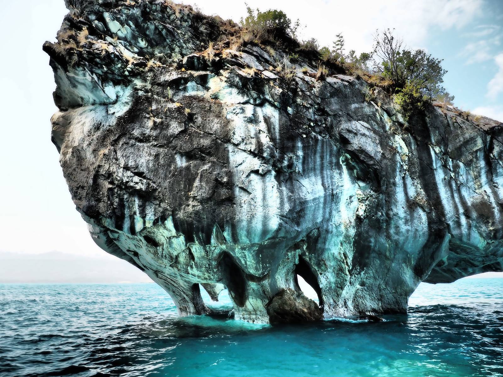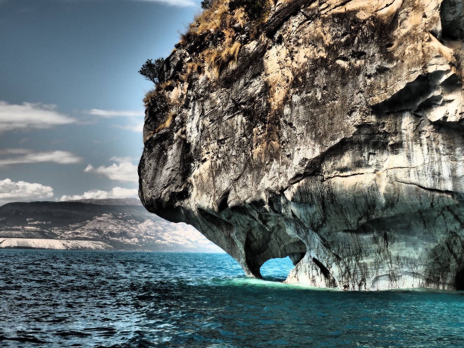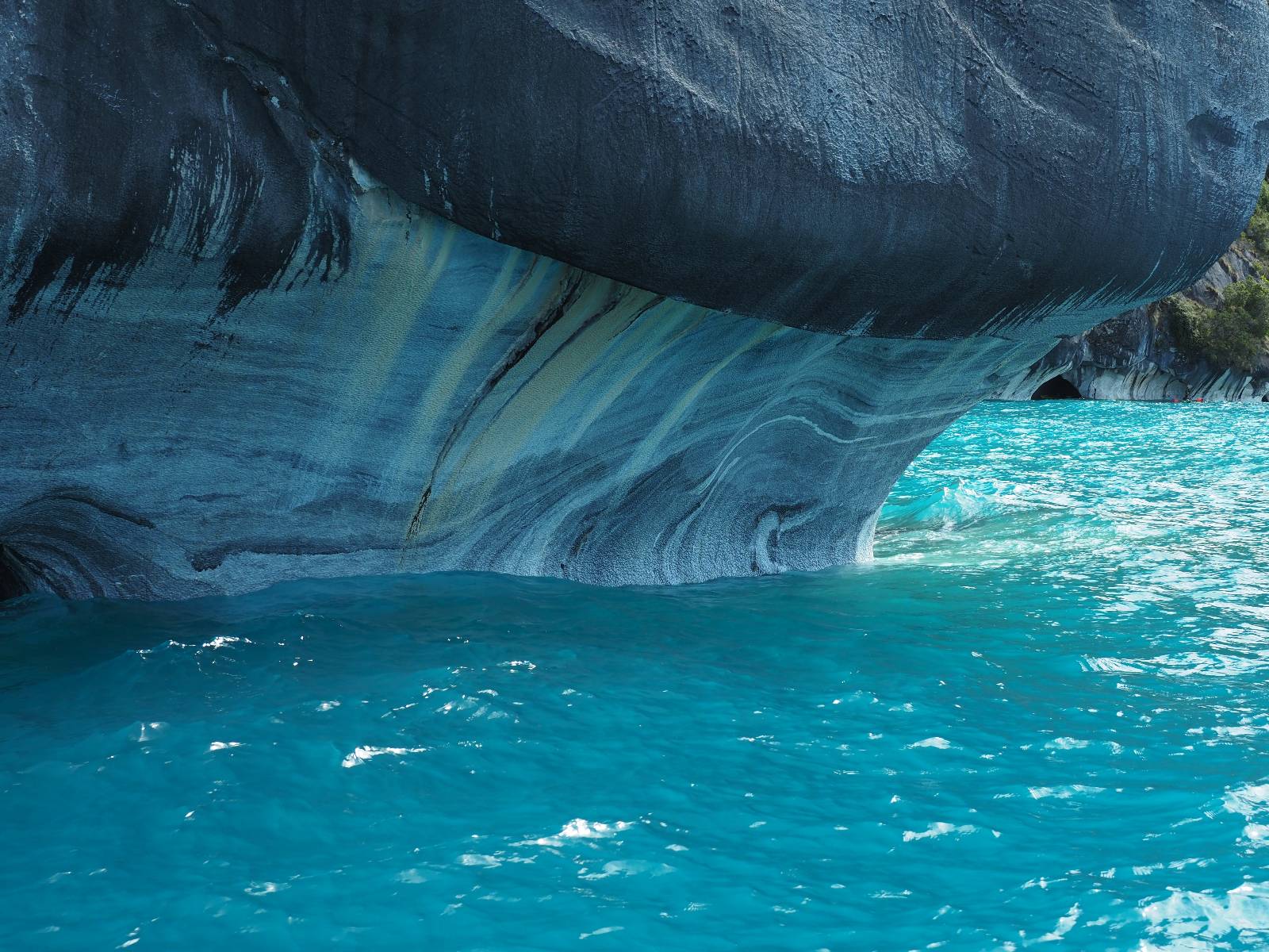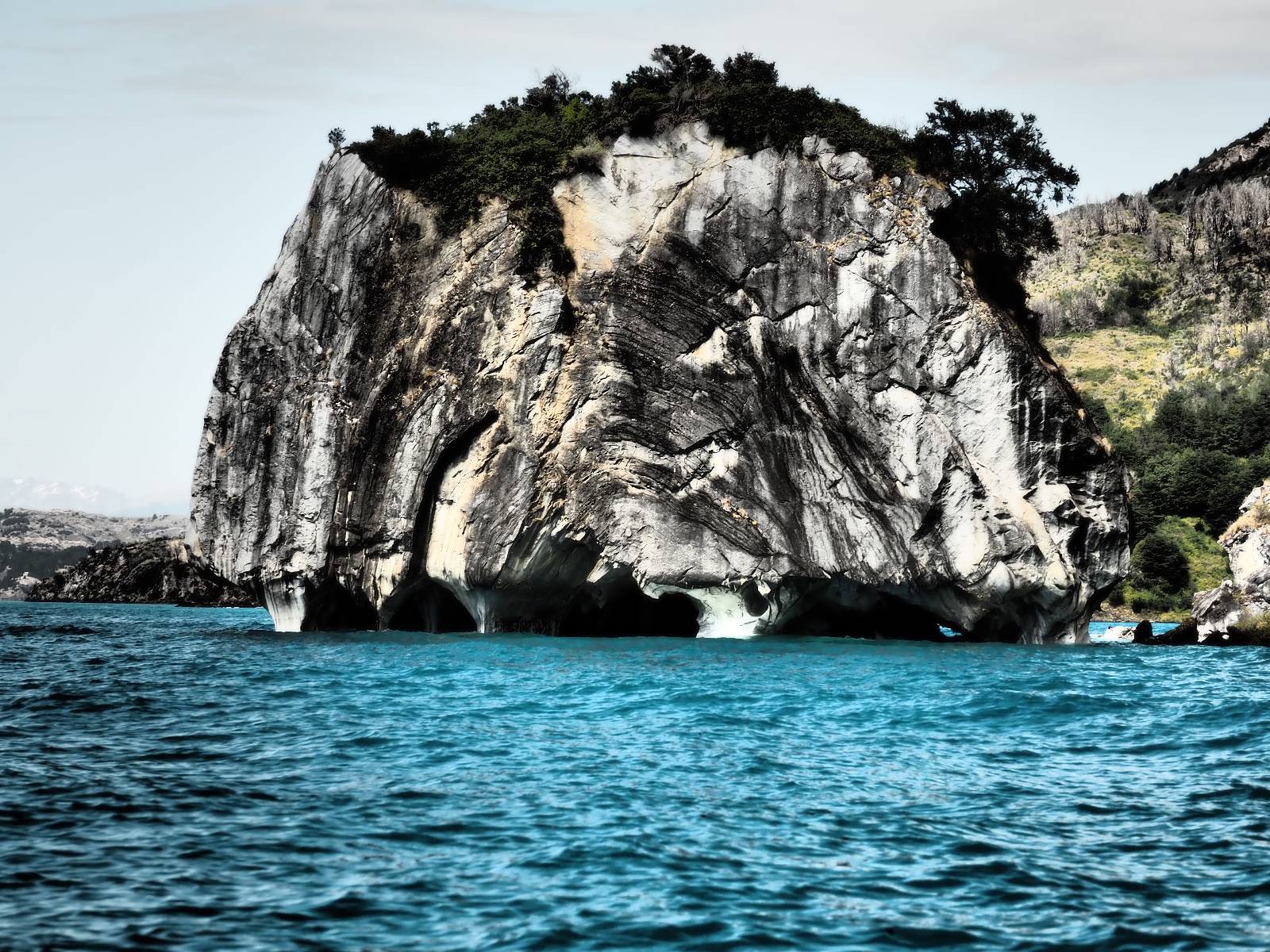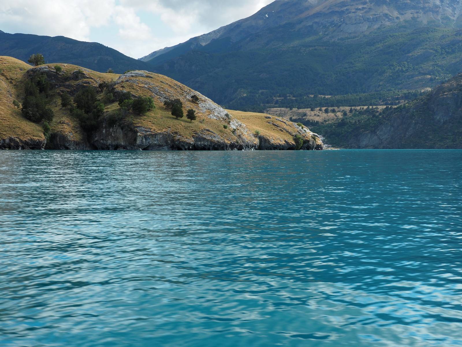 Auf gehts weiter nach Rio Tranquillo! Alles Schotter, der Wind steht fast und es staubt heftig! So manch Pickup ist wie immer schneller und die die ich einhole, denen folge ich in ihrer Wolke, bis sich die Chance zum überholen bietet! Ich hole Matthias ein und die jungen Columbianer auch und erreiche Rio Tranquillo. Aber nix Tranquillo! Hier tummelt sich mal wieder alles, was es so an Touristen zu geben scheint! Eijeijei, das wird schwierig! Das erste Hostal was ich anfahre, geführt von einem Deutschen Paar, dessen Dialekt mir vertraut scheint, nuwa, ist leider völlig ausgebucht! Sie geben mir zwar einen Tip aber auch da ist nichts zu bekommen. Mal wieder hängen auch diverse „keine Zimmer“ Schilder draußen. In einem kleinen Hostal könnte ich etwas für eine Nacht bekommen aber ich brauche zwei. Ich treffe auf der Straße Matthias wieder, bei ihm sieht es nicht viel besser aus und wir entscheiden, den Campingplatz auszuprobieren. Da bekommen wir gut Platz mit diversen Hühnern, die mit ihren Küken das Graß klein halten! Duschen und WC sind ok aber auch das habe ich schon besser erlebt! Aber das passt schon. Nachdem der Staub abgespühlt ist, geht es über den Stoppelacker von Fußballplatz direkt gegenüber ins Restaurant. Bier und Staek sind lecker und der Kellner sehr freundlich! Nach ein bisschen Schnak gibt er mir eine Karte, um evtl. noch eine geführte Tour in die Berge zu einem Gletscher zu machen. Ein junger Amerikaner bekommt das mit und fragt, ob er das abfotografieren darf. Ich erwähne es, weil er zumindest für uns alle Klischees eines „Amis“ erfüllt. Jung, kräftig, gut aussehend, lockiges Haar etwas versnobt, wie aus einer Soap Opera! 😉 Gut, ich gebe zu, um meinen Bauch müsste ich mich auch mal kümmern. 😂 Der Verdauungsspazierganz fürht uns an den See, um auszuloten was uns die Bootsfahrt zu den Marmolhölen kosten würde. Es kostet eigentlich bei jedem Anbieter das selbe und die eine Bude hat noch auf. Die Jungs sind geschäftstüchtig und bieten uns, wenn wir jetzt in Bar zahlen 10% Rabatt. Wahrscheinlich ist das ohnehin der normale Preis aber wir akzeptieren und haben somit die große Runde mit ein paar Inseln und den Marmorhölen in Sack und Tüten. Ich glaube wir hatten die 10:00 Uhr Tour genommen, so ein bisschen ausschlafen muss schon sein. Mit einer ordentlichen Geschwindigkeit geht es über den größten Binnensee Chiles zu erst zu ein paar Inseln mit Schiffswrack und wo ein Herzchirurg aus Coyhaique sein Wochenendhäuschen auf einer der Inseln stehen hat und dann weiter an den Inselkanten vorbei, die wunderbar ausgehölhte Marmorhölen bilden. Hier und da kann sogar unser Boot ein Stückchen reinfahren. Das sieht in dem blauen Wasser und dem Sonnenschein schon sehr fantastisch aus! Die Strukturen unterschiedlichen Grautöne, Streifen, Hölen und Säulen sind durchaus beeindruckend. Es geht nochmal für gute 10min im Highspeedtempo zur Catedral de Marmol und die ist noch einmal wirklich ein paar Nummern schöner anzusehen! Einige Kajakfahrer tummel sich da. Der Bursche aus New York ist auch dabei, natürlich Oberkörper frei, nur mit Schwimmweste, wäre ja auch nicht anders gegangen. Aber wie wir erfahren alles geführte Touren und wirklich nahe ran oder durchfahren darf man nicht. Sie passen zumindest sehr darauf auf, dass niemand etwas kaputt macht. Ein paar Idioten haben wohl vor ein paar Jahren angefangen sich mit ihren Namen verewigen zu wollen… Ich schieße unmengen an Fotos, mal sehen was davon was taugt. Also evtl. bekommt ihr viel zum Schauen, wenn ich nicht ordentlich aussortiere. Schließlich wir der Tag noch richtig angenehm warm und ich entschließe mich nach einem Spazierganz mit Kaffee und Kuchen, doch noch die Badehose zu holen. Am Strand treffe ich „Pi“ Paolo wieder der unterwegs Rowan mit seiner Triumpf Scrambler aufgegabelt hat. Rowan ist Ami, ebenfalls aus New York und er rückt mein Bild wieder gerade. Ich springe…, naja gehe langsam ins Wasser. Die oberen 20cm sind ja okay-frisch aber tiefer merkt man, dass das Wasser wohl auch von den Gletscherflüssen gespeist wird. Zumindes hat es nicht die Temperatur, um unbedingt eine halbe Stunde drin bleiben zu müssen!