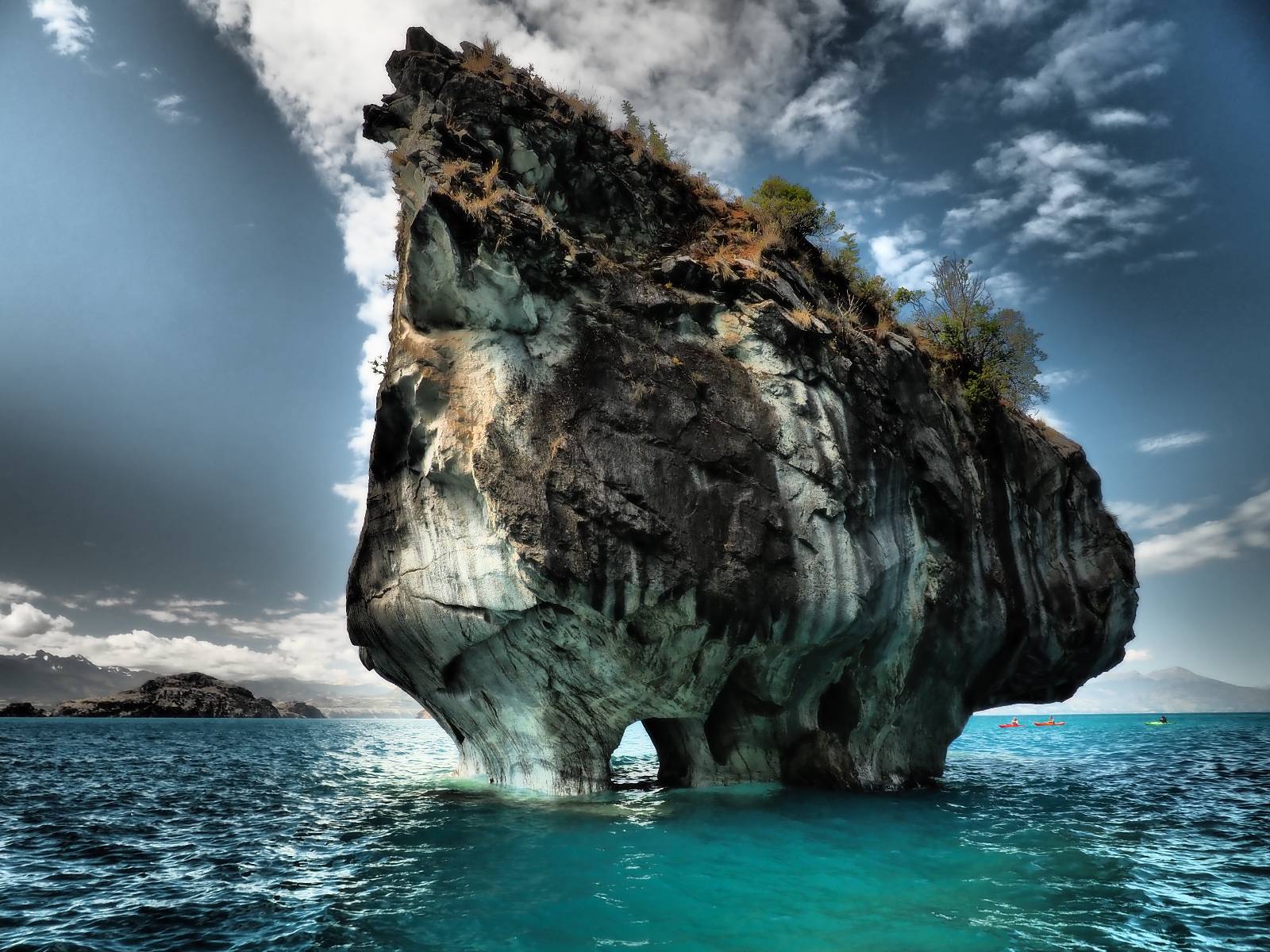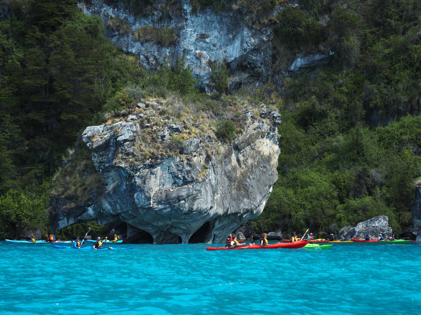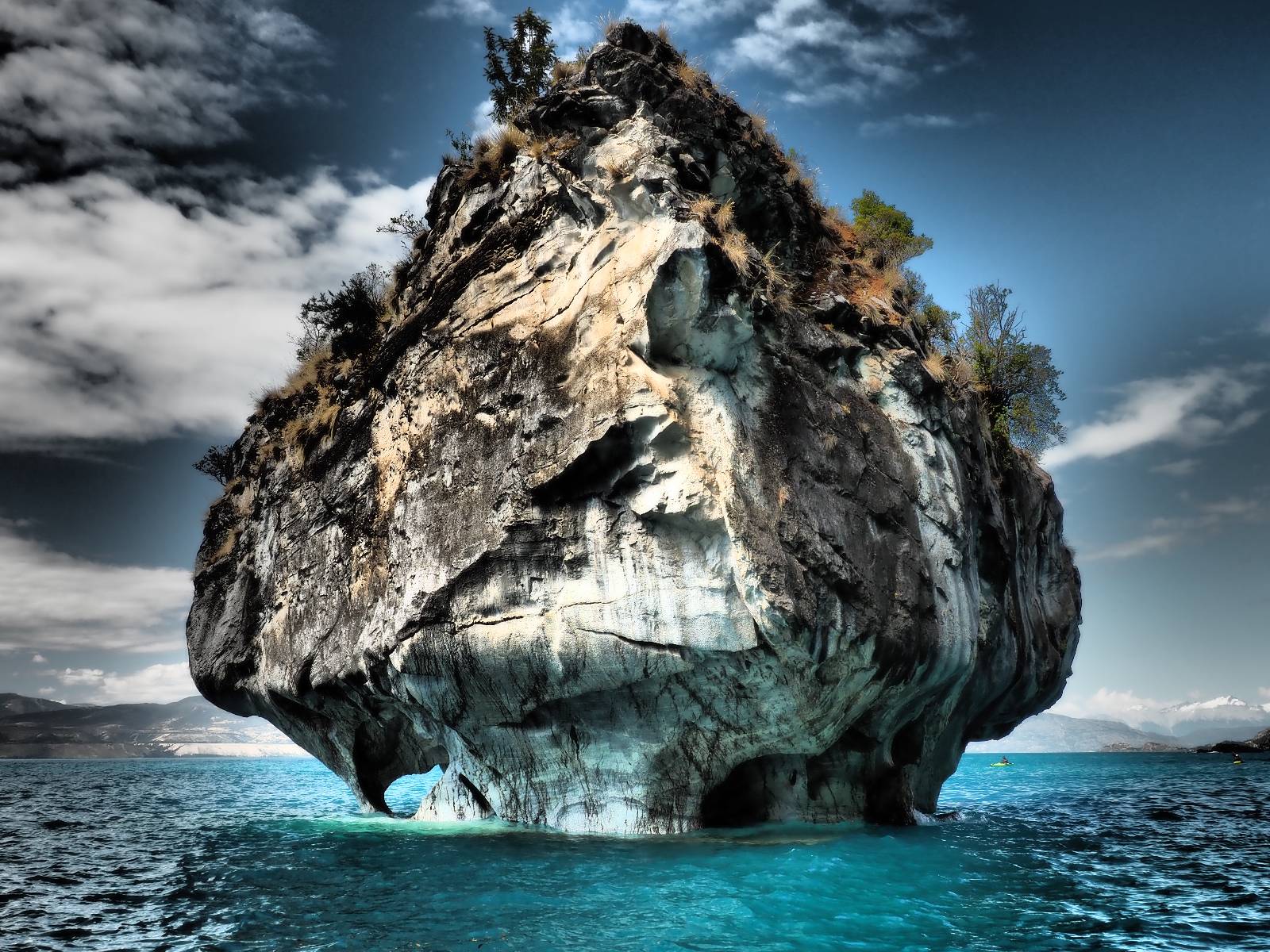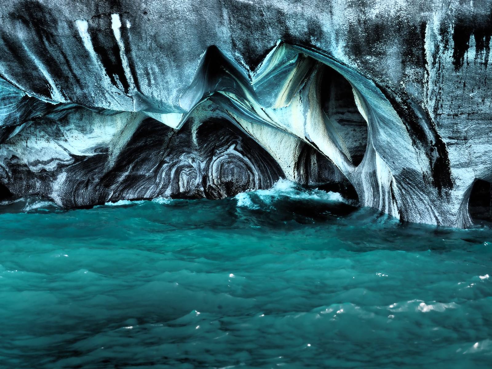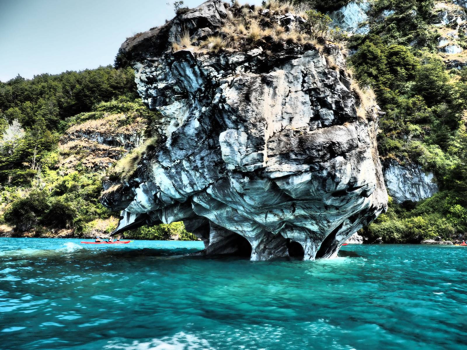 Auf gehts weiter nach Rio Tranquillo! Alles Schotter, der Wind steht fast und es staubt heftig! So manch Pickup ist wie immer schneller und die die ich einhole, denen folge ich in ihrer Wolke, bis sich die Chance zum überholen bietet! Ich hole Matthias ein und die jungen Columbianer auch und erreiche Rio Tranquillo. Aber nix Tranquillo! Hier tummelt sich mal wieder alles, was es so an Touristen zu geben scheint! Eijeijei, das wird schwierig! Das erste Hostal was ich anfahre, geführt von einem Deutschen Paar, dessen Dialekt mir vertraut scheint, nuwa, ist leider völlig ausgebucht! Sie geben mir zwar einen Tip aber auch da ist nichts zu bekommen. Mal wieder hängen auch diverse „keine Zimmer“ Schilder draußen. In einem kleinen Hostal könnte ich etwas für eine Nacht bekommen aber ich brauche zwei. Ich treffe auf der Straße Matthias wieder, bei ihm sieht es nicht viel besser aus und wir entscheiden, den Campingplatz auszuprobieren. Da bekommen wir gut Platz mit diversen Hühnern, die mit ihren Küken das Graß klein halten! Duschen und WC sind ok aber auch das habe ich schon besser erlebt! Aber das passt schon. Nachdem der Staub abgespühlt ist, geht es über den Stoppelacker von Fußballplatz direkt gegenüber ins Restaurant. Bier und Staek sind lecker und der Kellner sehr freundlich! Nach ein bisschen Schnak gibt er mir eine Karte, um evtl. noch eine geführte Tour in die Berge zu einem Gletscher zu machen. Ein junger Amerikaner bekommt das mit und fragt, ob er das abfotografieren darf. Ich erwähne es, weil er zumindest für uns alle Klischees eines „Amis“ erfüllt. Jung, kräftig, gut aussehend, lockiges Haar etwas versnobt, wie aus einer Soap Opera! 😉 Gut, ich gebe zu, um meinen Bauch müsste ich mich auch mal kümmern. 😂 Der Verdauungsspazierganz fürht uns an den See, um auszuloten was uns die Bootsfahrt zu den Marmolhölen kosten würde. Es kostet eigentlich bei jedem Anbieter das selbe und die eine Bude hat noch auf. Die Jungs sind geschäftstüchtig und bieten uns, wenn wir jetzt in Bar zahlen 10% Rabatt. Wahrscheinlich ist das ohnehin der normale Preis aber wir akzeptieren und haben somit die große Runde mit ein paar Inseln und den Marmorhölen in Sack und Tüten. Ich glaube wir hatten die 10:00 Uhr Tour genommen, so ein bisschen ausschlafen muss schon sein. Mit einer ordentlichen Geschwindigkeit geht es über den größten Binnensee Chiles zu erst zu ein paar Inseln mit Schiffswrack und wo ein Herzchirurg aus Coyhaique sein Wochenendhäuschen auf einer der Inseln stehen hat und dann weiter an den Inselkanten vorbei, die wunderbar ausgehölhte Marmorhölen bilden. Hier und da kann sogar unser Boot ein Stückchen reinfahren. Das sieht in dem blauen Wasser und dem Sonnenschein schon sehr fantastisch aus! Die Strukturen unterschiedlichen Grautöne, Streifen, Hölen und Säulen sind durchaus beeindruckend. Es geht nochmal für gute 10min im Highspeedtempo zur Catedral de Marmol und die ist noch einmal wirklich ein paar Nummern schöner anzusehen! Einige Kajakfahrer tummel sich da. Der Bursche aus New York ist auch dabei, natürlich Oberkörper frei, nur mit Schwimmweste, wäre ja auch nicht anders gegangen. Aber wie wir erfahren alles geführte Touren und wirklich nahe ran oder durchfahren darf man nicht. Sie passen zumindest sehr darauf auf, dass niemand etwas kaputt macht. Ein paar Idioten haben wohl vor ein paar Jahren angefangen sich mit ihren Namen verewigen zu wollen… Ich schieße unmengen an Fotos, mal sehen was davon was taugt. Also evtl. bekommt ihr viel zum Schauen, wenn ich nicht ordentlich aussortiere. Schließlich wir der Tag noch richtig angenehm warm und ich entschließe mich nach einem Spazierganz mit Kaffee und Kuchen, doch noch die Badehose zu holen. Am Strand treffe ich „Pi“ Paolo wieder der unterwegs Rowan mit seiner Triumpf Scrambler aufgegabelt hat. Rowan ist Ami, ebenfalls aus New York und er rückt mein Bild wieder gerade. Ich springe…, naja gehe langsam ins Wasser. Die oberen 20cm sind ja okay-frisch aber tiefer merkt man, dass das Wasser wohl auch von den Gletscherflüssen gespeist wird. Zumindes hat es nicht die Temperatur, um unbedingt eine halbe Stunde drin bleiben zu müssen!