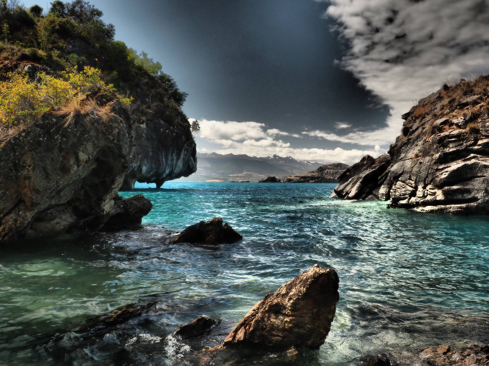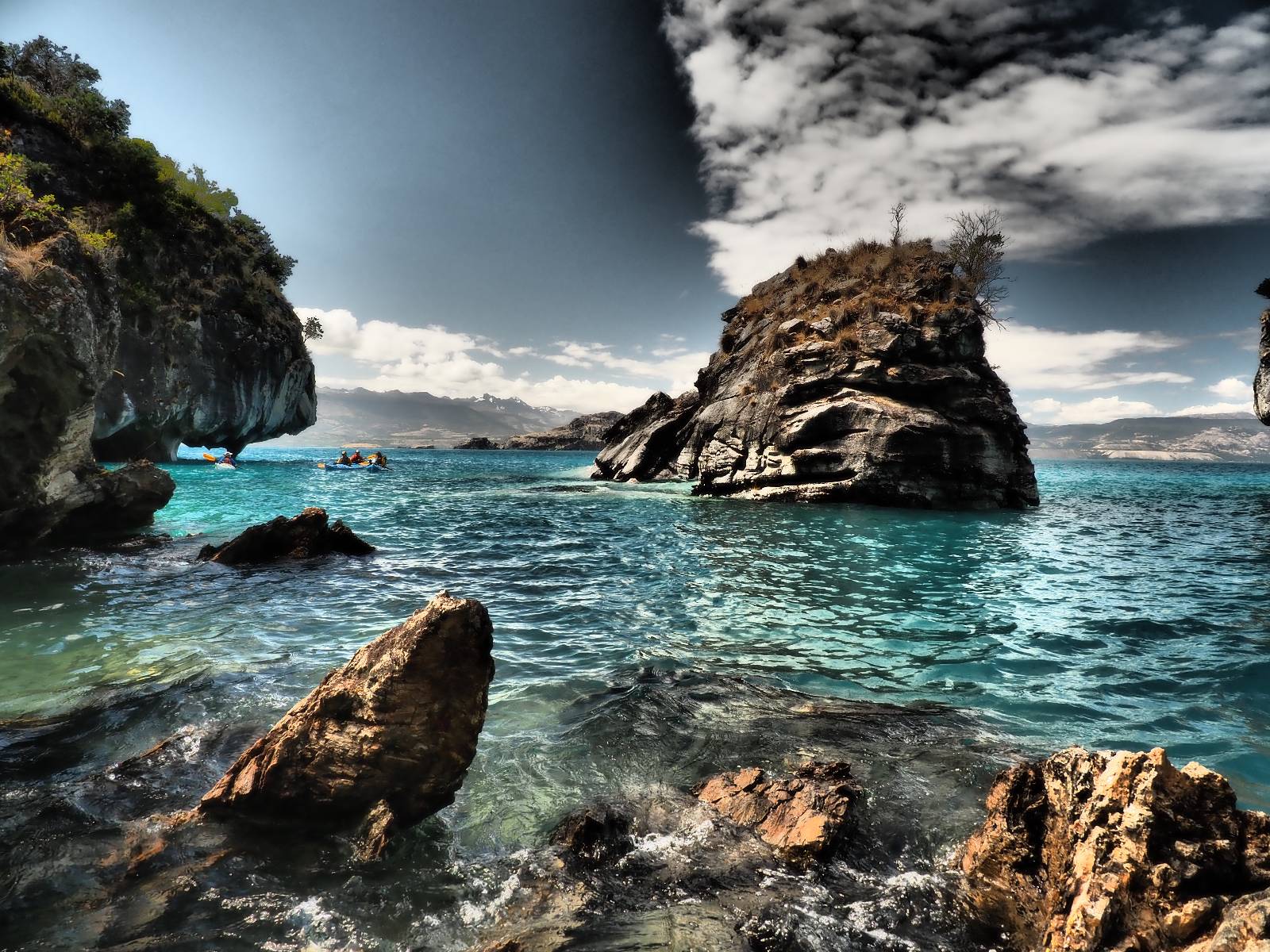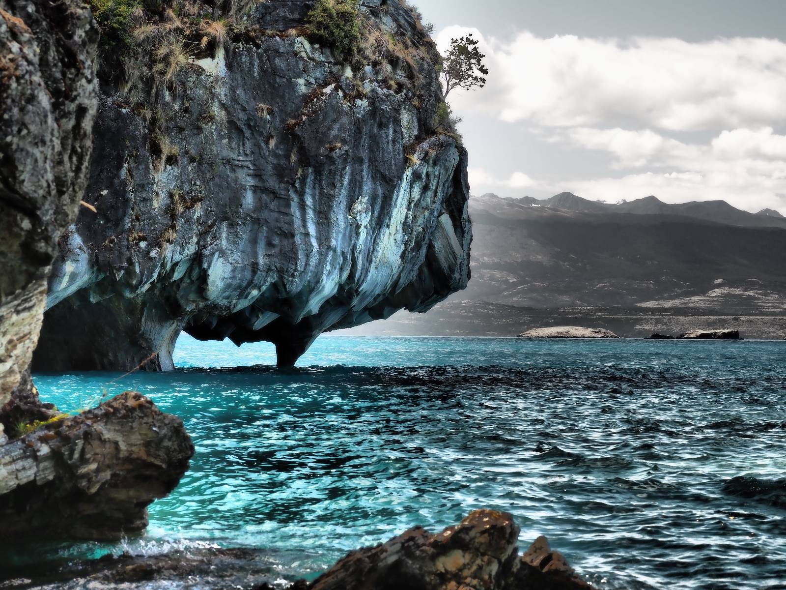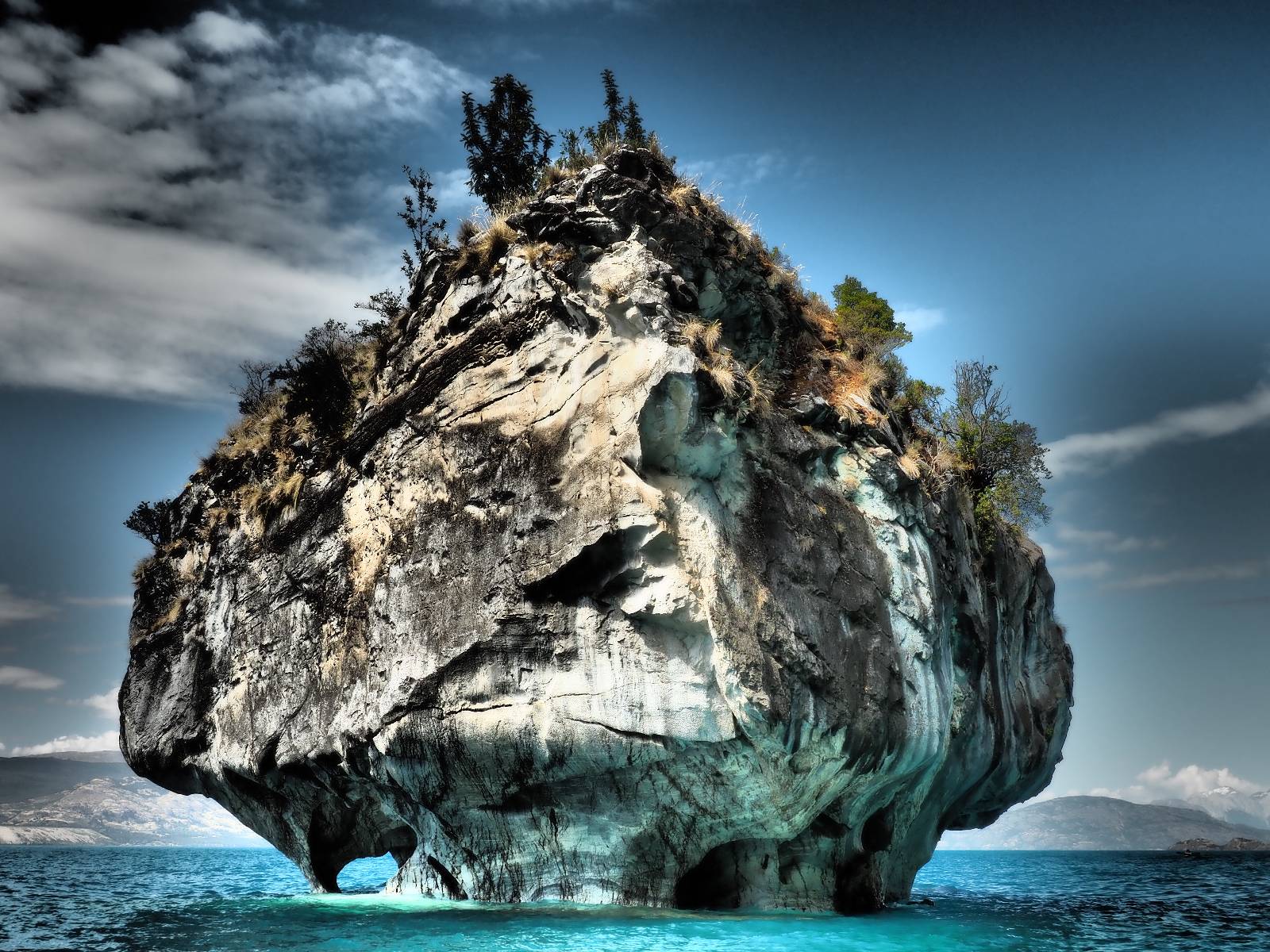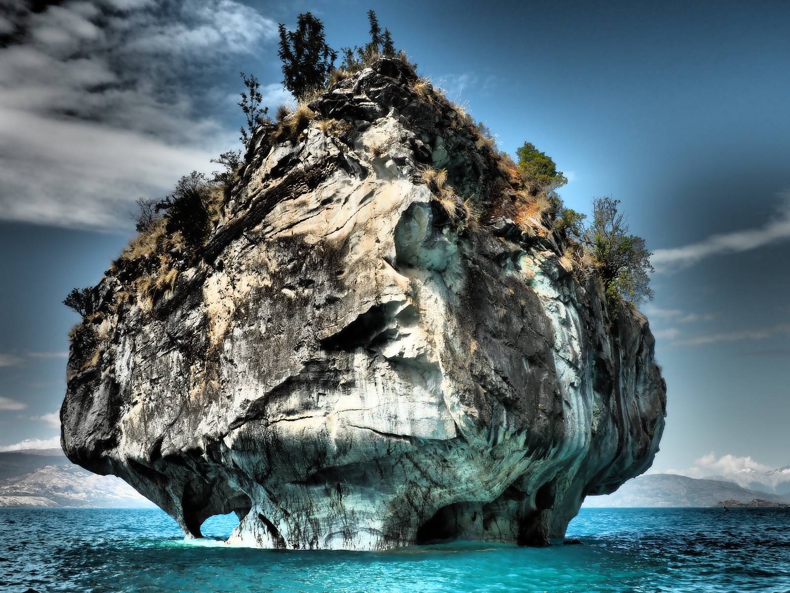 Auf gehts weiter nach Rio Tranquillo! Alles Schotter, der Wind steht fast und es staubt heftig! So manch Pickup ist wie immer schneller und die die ich einhole, denen folge ich in ihrer Wolke, bis sich die Chance zum überholen bietet! Ich hole Matthias ein und die jungen Columbianer auch und erreiche Rio Tranquillo. Aber nix Tranquillo! Hier tummelt sich mal wieder alles, was es so an Touristen zu geben scheint! Eijeijei, das wird schwierig! Das erste Hostal was ich anfahre, geführt von einem Deutschen Paar, dessen Dialekt mir vertraut scheint, nuwa, ist leider völlig ausgebucht! Sie geben mir zwar einen Tip aber auch da ist nichts zu bekommen. Mal wieder hängen auch diverse „keine Zimmer“ Schilder draußen. In einem kleinen Hostal könnte ich etwas für eine Nacht bekommen aber ich brauche zwei. Ich treffe auf der Straße Matthias wieder, bei ihm sieht es nicht viel besser aus und wir entscheiden, den Campingplatz auszuprobieren. Da bekommen wir gut Platz mit diversen Hühnern, die mit ihren Küken das Graß klein halten! Duschen und WC sind ok aber auch das habe ich schon besser erlebt! Aber das passt schon. Nachdem der Staub abgespühlt ist, geht es über den Stoppelacker von Fußballplatz direkt gegenüber ins Restaurant. Bier und Staek sind lecker und der Kellner sehr freundlich! Nach ein bisschen Schnak gibt er mir eine Karte, um evtl. noch eine geführte Tour in die Berge zu einem Gletscher zu machen. Ein junger Amerikaner bekommt das mit und fragt, ob er das abfotografieren darf. Ich erwähne es, weil er zumindest für uns alle Klischees eines „Amis“ erfüllt. Jung, kräftig, gut aussehend, lockiges Haar etwas versnobt, wie aus einer Soap Opera! 😉 Gut, ich gebe zu, um meinen Bauch müsste ich mich auch mal kümmern. 😂 Der Verdauungsspazierganz fürht uns an den See, um auszuloten was uns die Bootsfahrt zu den Marmolhölen kosten würde. Es kostet eigentlich bei jedem Anbieter das selbe und die eine Bude hat noch auf. Die Jungs sind geschäftstüchtig und bieten uns, wenn wir jetzt in Bar zahlen 10% Rabatt. Wahrscheinlich ist das ohnehin der normale Preis aber wir akzeptieren und haben somit die große Runde mit ein paar Inseln und den Marmorhölen in Sack und Tüten. Ich glaube wir hatten die 10:00 Uhr Tour genommen, so ein bisschen ausschlafen muss schon sein. Mit einer ordentlichen Geschwindigkeit geht es über den größten Binnensee Chiles zu erst zu ein paar Inseln mit Schiffswrack und wo ein Herzchirurg aus Coyhaique sein Wochenendhäuschen auf einer der Inseln stehen hat und dann weiter an den Inselkanten vorbei, die wunderbar ausgehölhte Marmorhölen bilden. Hier und da kann sogar unser Boot ein Stückchen reinfahren. Das sieht in dem blauen Wasser und dem Sonnenschein schon sehr fantastisch aus! Die Strukturen unterschiedlichen Grautöne, Streifen, Hölen und Säulen sind durchaus beeindruckend. Es geht nochmal für gute 10min im Highspeedtempo zur Catedral de Marmol und die ist noch einmal wirklich ein paar Nummern schöner anzusehen! Einige Kajakfahrer tummel sich da. Der Bursche aus New York ist auch dabei, natürlich Oberkörper frei, nur mit Schwimmweste, wäre ja auch nicht anders gegangen. Aber wie wir erfahren alles geführte Touren und wirklich nahe ran oder durchfahren darf man nicht. Sie passen zumindest sehr darauf auf, dass niemand etwas kaputt macht. Ein paar Idioten haben wohl vor ein paar Jahren angefangen sich mit ihren Namen verewigen zu wollen… Ich schieße unmengen an Fotos, mal sehen was davon was taugt. Also evtl. bekommt ihr viel zum Schauen, wenn ich nicht ordentlich aussortiere. Schließlich wir der Tag noch richtig angenehm warm und ich entschließe mich nach einem Spazierganz mit Kaffee und Kuchen, doch noch die Badehose zu holen. Am Strand treffe ich „Pi“ Paolo wieder der unterwegs Rowan mit seiner Triumpf Scrambler aufgegabelt hat. Rowan ist Ami, ebenfalls aus New York und er rückt mein Bild wieder gerade. Ich springe…, naja gehe langsam ins Wasser. Die oberen 20cm sind ja okay-frisch aber tiefer merkt man, dass das Wasser wohl auch von den Gletscherflüssen gespeist wird. Zumindes hat es nicht die Temperatur, um unbedingt eine halbe Stunde drin bleiben zu müssen!