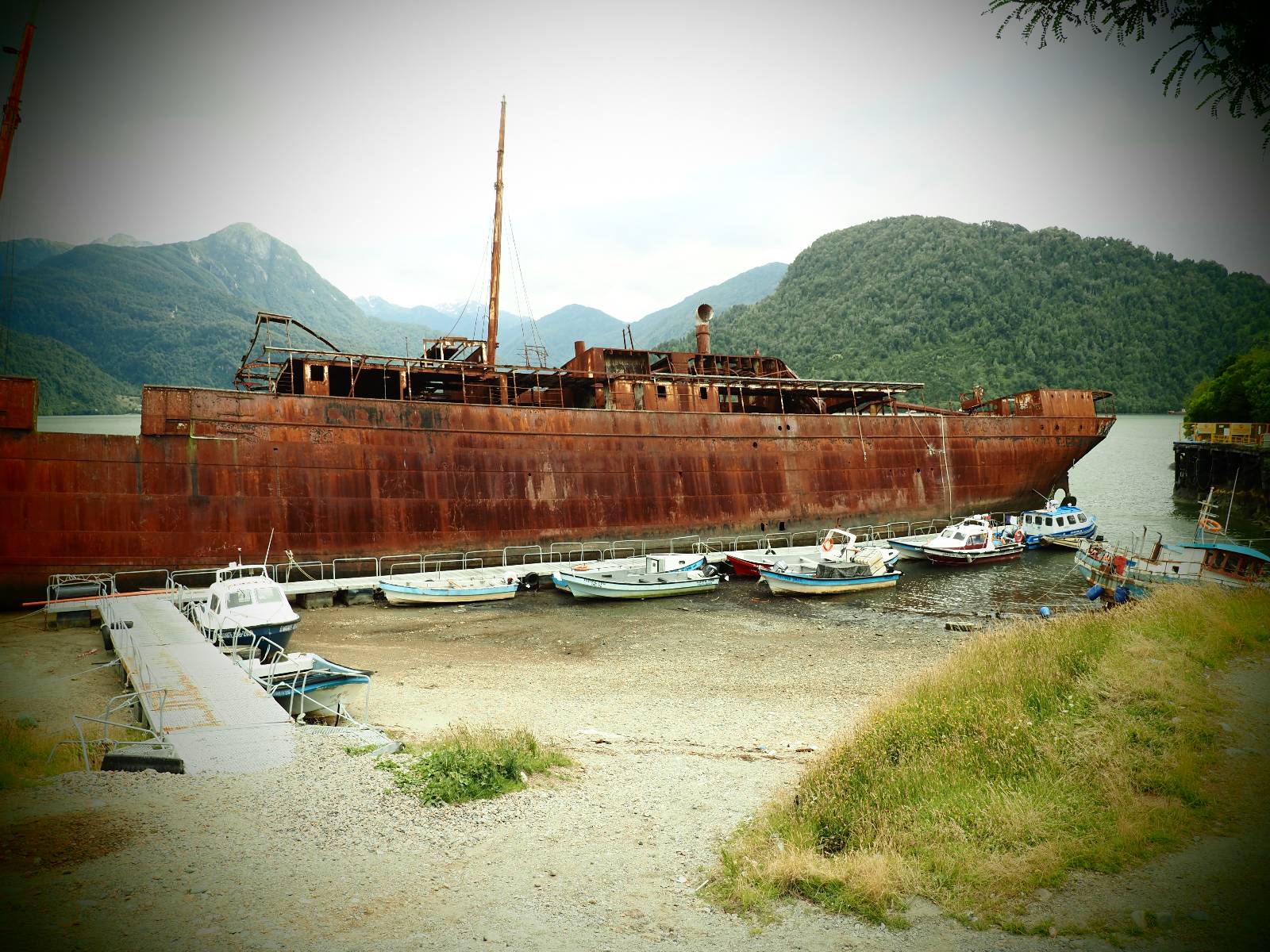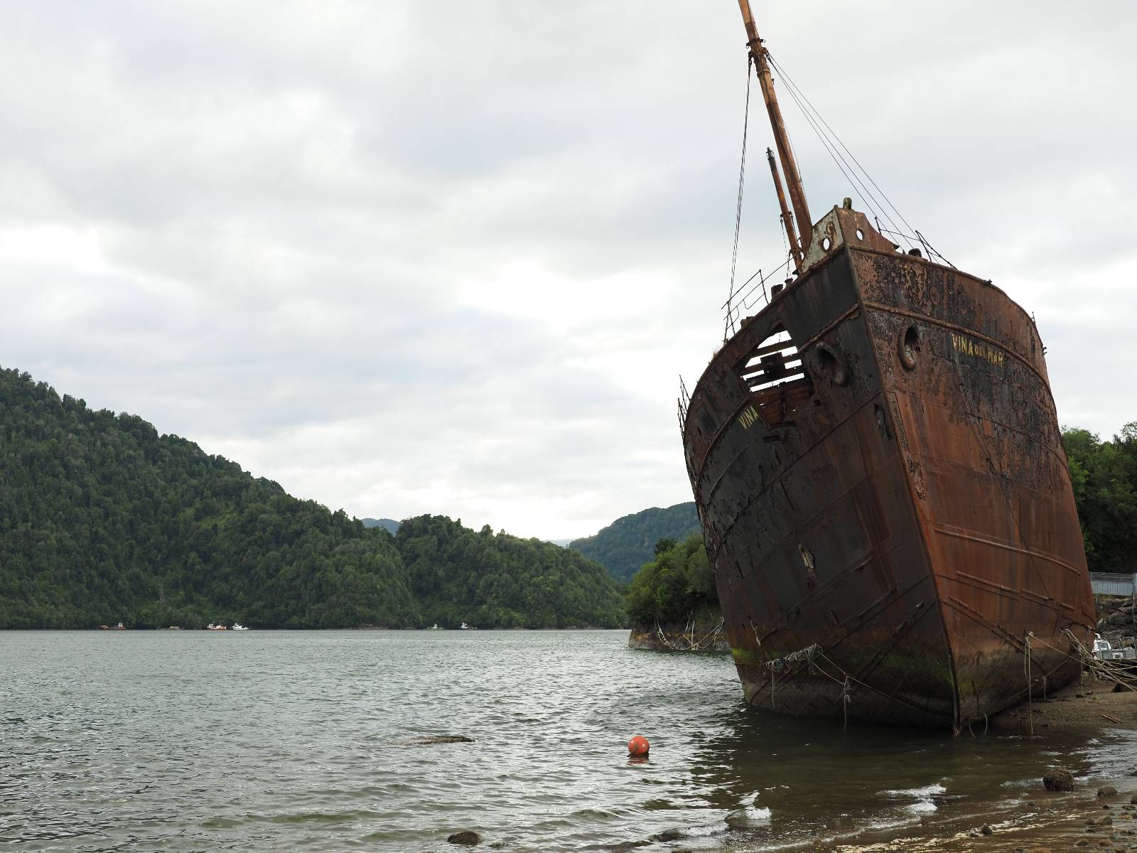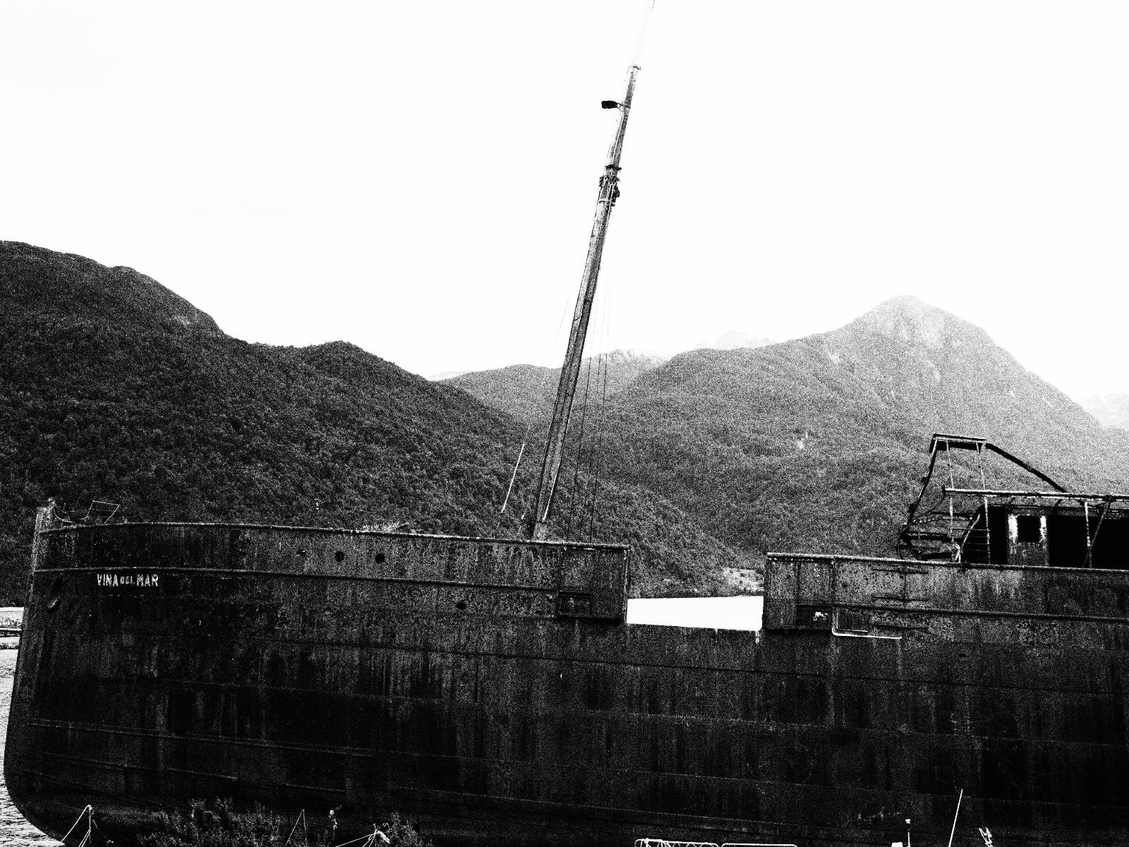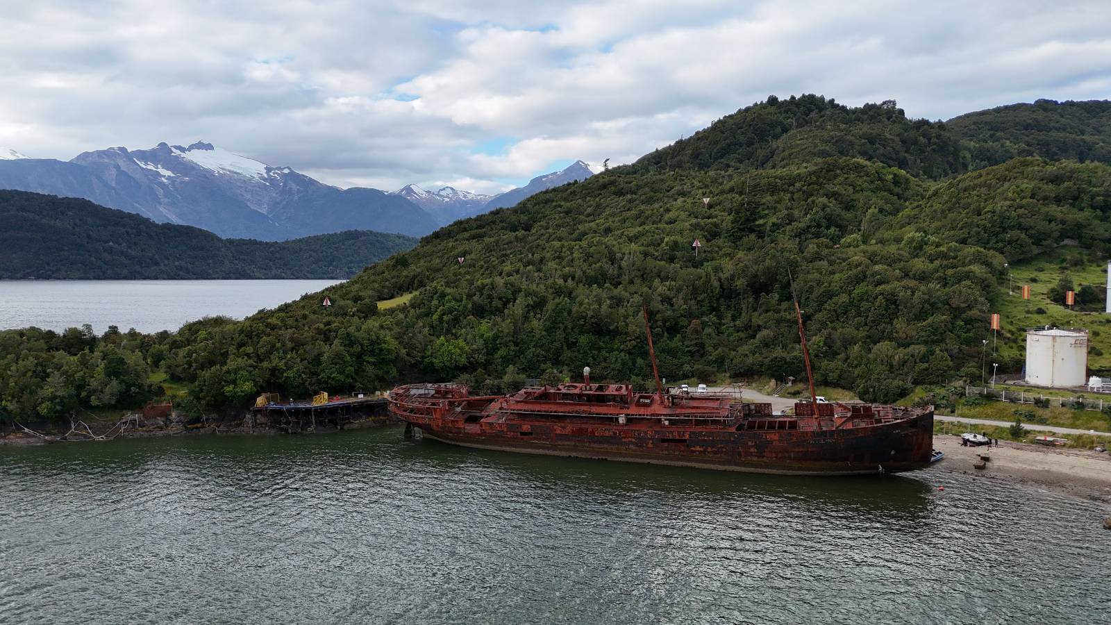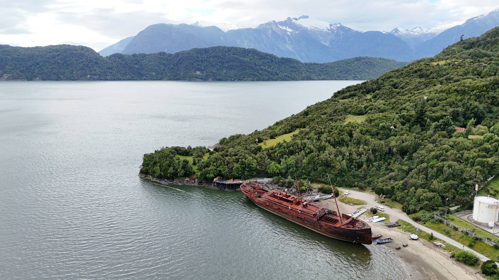 Meine Zwischenetappe ist erstmal Puerto Cisnes. Allein der Weg dort hin bietet wieder schöne Aussichten und so mancher Gletscher lässt sich gut von der Straße aus sehen. Ich bin wieder auf Schotter und über enge Serpentinen erklimme ich einen kleinen Pass der durch dicht bewachsenen Urwald führt mit sensationellen Blicken zurück auf eis- und schneebedeckte Berge. Puerto Cisnes ist nicht mehr weit. Als ich ankomme fahre ich einmal die Uferpromenade ab und halte an einem netten Restaurant mit Terrasse. Ich gönne mir Lachs mit Kartoffelbrei, was sehr lecker ist und genieße den Blick auf die weite, im Sonnenschein ruhig daliegende Bucht, den Fjord dahinter und die Berge am anderen weit entfernten Ufer. Es ist gerade einfach nur schön und gemütlich und lädt eigentlich zum Bleiben ein. Nebenbei schwatze ich ein wenig mit Paola vom Nachbartisch und erfahre, das sie aus Salta ist. Aber ich will noch ein Stückchen hinter mich bringen und das Ziel ist Puerto Chacabuco in der Nähe von Puerto Aisén. Auf der Hauptstraße in Chacabuco laufen mich zwei Hunde wild kläffend und mit gestäubten Fell an und rennen dicht hinter mir her. Es ist nicht das erste Mal und langsamer werden hilft durchaus oder gleich richtig durchziehen. Ich fahre erstmal bis zu Ende des Ortes, um mich zu orientieren und mir in den einschlägigen App’s eine Unterkunft zu suchen. Dabei sehe ich auch mein Fotoziel für den Rest des späten Nachmittages. Ein altes großes rostiges Schiffswrack, welches direkt am Strand der Bucht aus dem Wasser ragt. Doch erstmal das ausgewählte Hostal, wovon es hier nicht allzu viele gibt anfahren. Die beiden Wilden „begrüßen“ mich wieder wild jagend und dummerweise ist der Hostaleingan direkt vor ihrem Revier. Als durch! Falls einer beißt, durch die Stiefel kommt er sicher nicht durch! Ich halte vor der Tür steige ab und das allein verwirrt die beiden schon und als ich dem einen auch noch den Kopf kraule ist er völlig verwirrt! Eben war ich noch der böse Motorradfahrer und nun plötzlich Streicheleinheiten? Für einen Moment habe ich ihm wohl sein Weltbild zerstört! Ich mache mich auf dem Weg zum Schiffswrack und schaue, was ich alles für Motive finde. Zudem ist es eine schöne Gelegenheit auch mal wieder ein bisschen mit der Drohne zu spielen.
