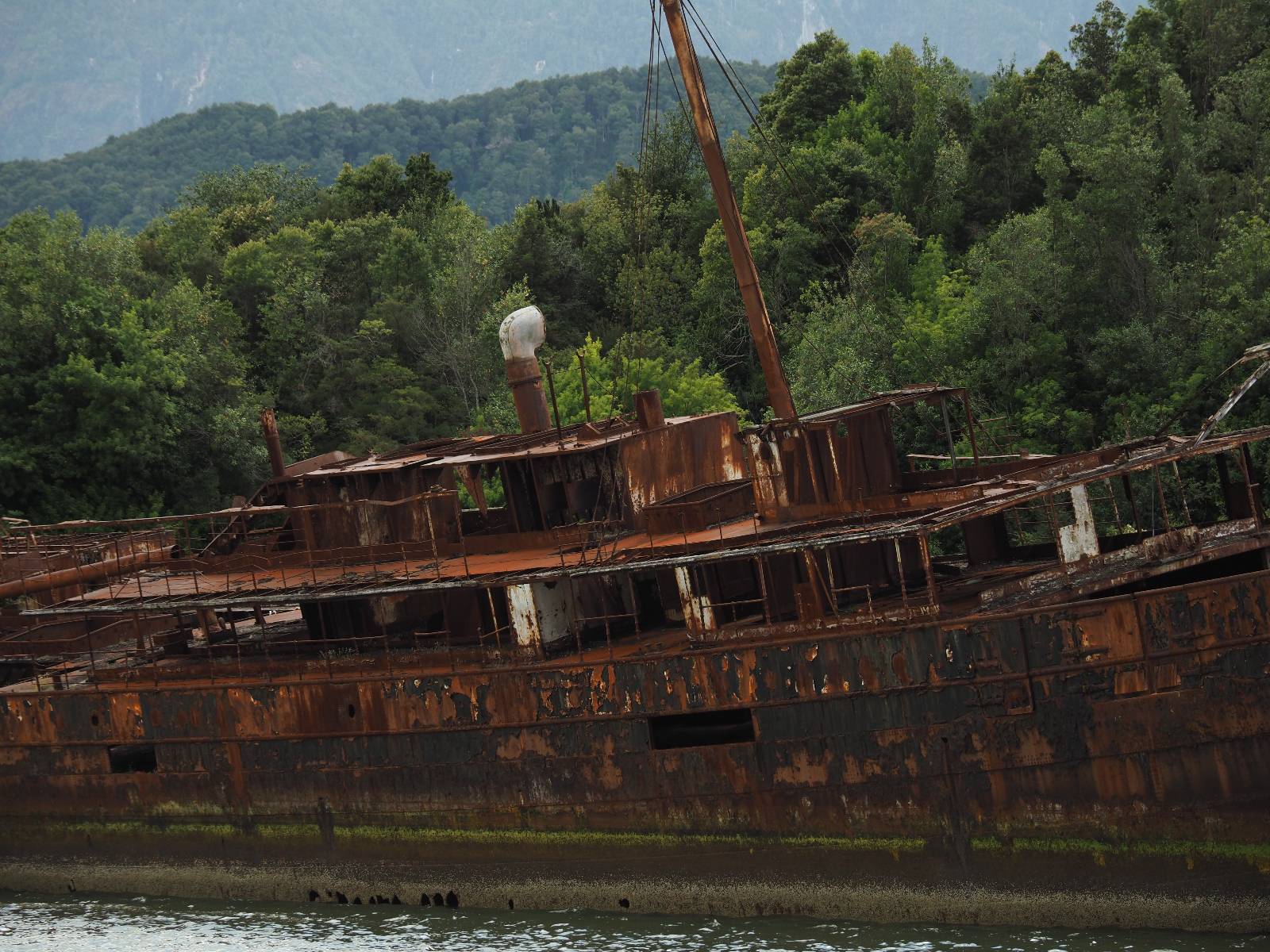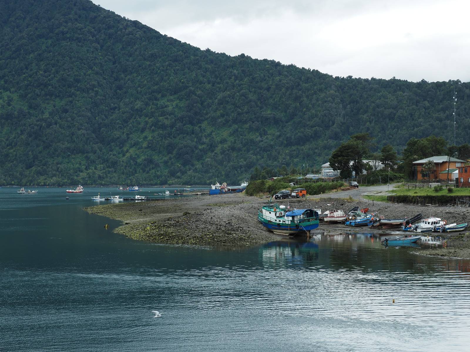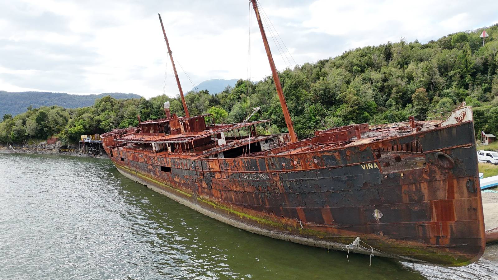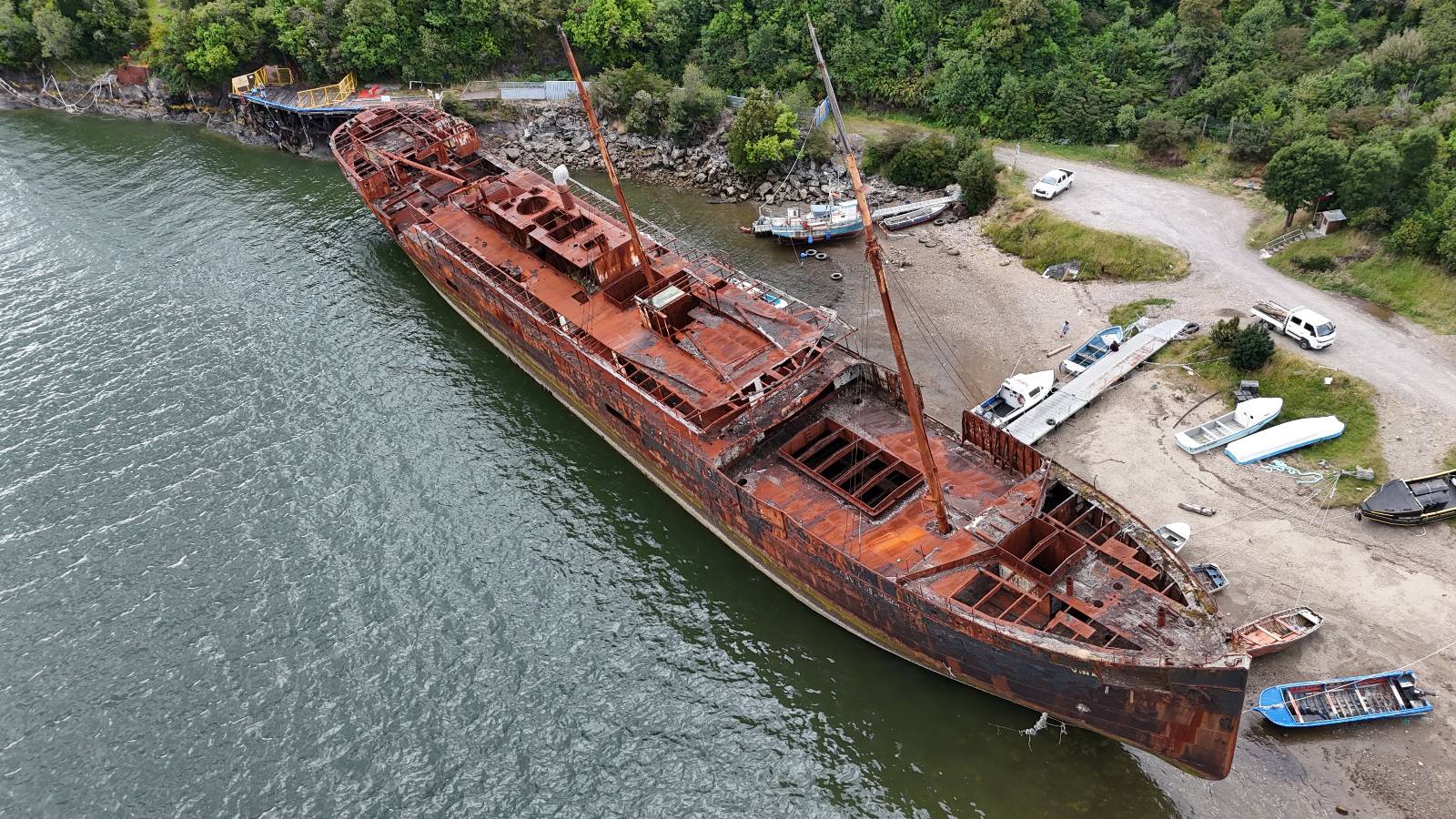 Meine Zwischenetappe ist erstmal Puerto Cisnes. Allein der Weg dort hin bietet wieder schöne Aussichten und so mancher Gletscher lässt sich gut von der Straße aus sehen. Ich bin wieder auf Schotter und über enge Serpentinen erklimme ich einen kleinen Pass der durch dicht bewachsenen Urwald führt mit sensationellen Blicken zurück auf eis- und schneebedeckte Berge. Puerto Cisnes ist nicht mehr weit. Als ich ankomme fahre ich einmal die Uferpromenade ab und halte an einem netten Restaurant mit Terrasse. Ich gönne mir Lachs mit Kartoffelbrei, was sehr lecker ist und genieße den Blick auf die weite, im Sonnenschein ruhig daliegende Bucht, den Fjord dahinter und die Berge am anderen weit entfernten Ufer. Es ist gerade einfach nur schön und gemütlich und lädt eigentlich zum Bleiben ein. Nebenbei schwatze ich ein wenig mit Paola vom Nachbartisch und erfahre, das sie aus Salta ist. Aber ich will noch ein Stückchen hinter mich bringen und das Ziel ist Puerto Chacabuco in der Nähe von Puerto Aisén. Auf der Hauptstraße in Chacabuco laufen mich zwei Hunde wild kläffend und mit gestäubten Fell an und rennen dicht hinter mir her. Es ist nicht das erste Mal und langsamer werden hilft durchaus oder gleich richtig durchziehen. Ich fahre erstmal bis zu Ende des Ortes, um mich zu orientieren und mir in den einschlägigen App’s eine Unterkunft zu suchen. Dabei sehe ich auch mein Fotoziel für den Rest des späten Nachmittages. Ein altes großes rostiges Schiffswrack, welches direkt am Strand der Bucht aus dem Wasser ragt. Doch erstmal das ausgewählte Hostal, wovon es hier nicht allzu viele gibt anfahren. Die beiden Wilden „begrüßen“ mich wieder wild jagend und dummerweise ist der Hostaleingan direkt vor ihrem Revier. Als durch! Falls einer beißt, durch die Stiefel kommt er sicher nicht durch! Ich halte vor der Tür steige ab und das allein verwirrt die beiden schon und als ich dem einen auch noch den Kopf kraule ist er völlig verwirrt! Eben war ich noch der böse Motorradfahrer und nun plötzlich Streicheleinheiten? Für einen Moment habe ich ihm wohl sein Weltbild zerstört! Ich mache mich auf dem Weg zum Schiffswrack und schaue, was ich alles für Motive finde. Zudem ist es eine schöne Gelegenheit auch mal wieder ein bisschen mit der Drohne zu spielen.