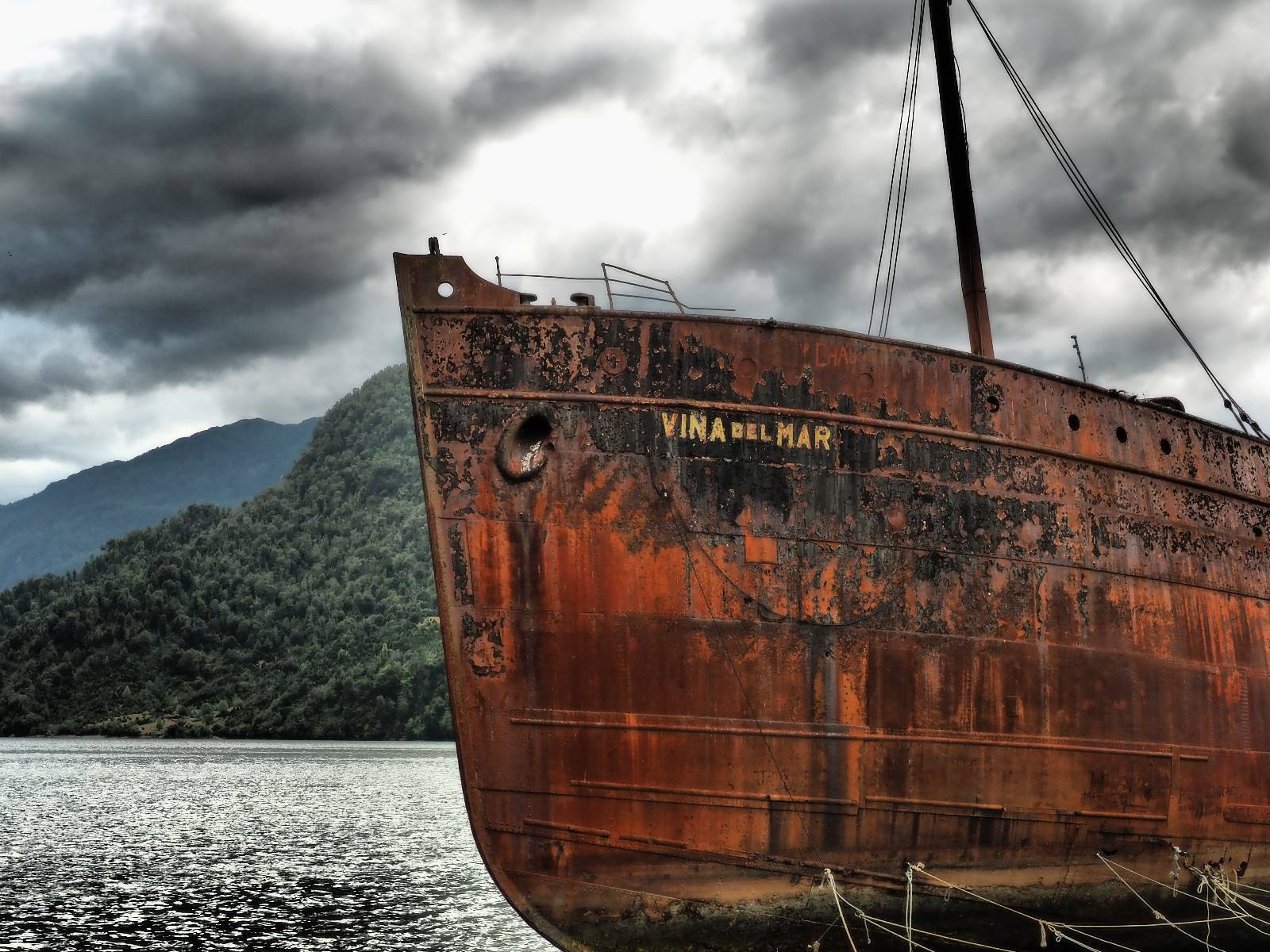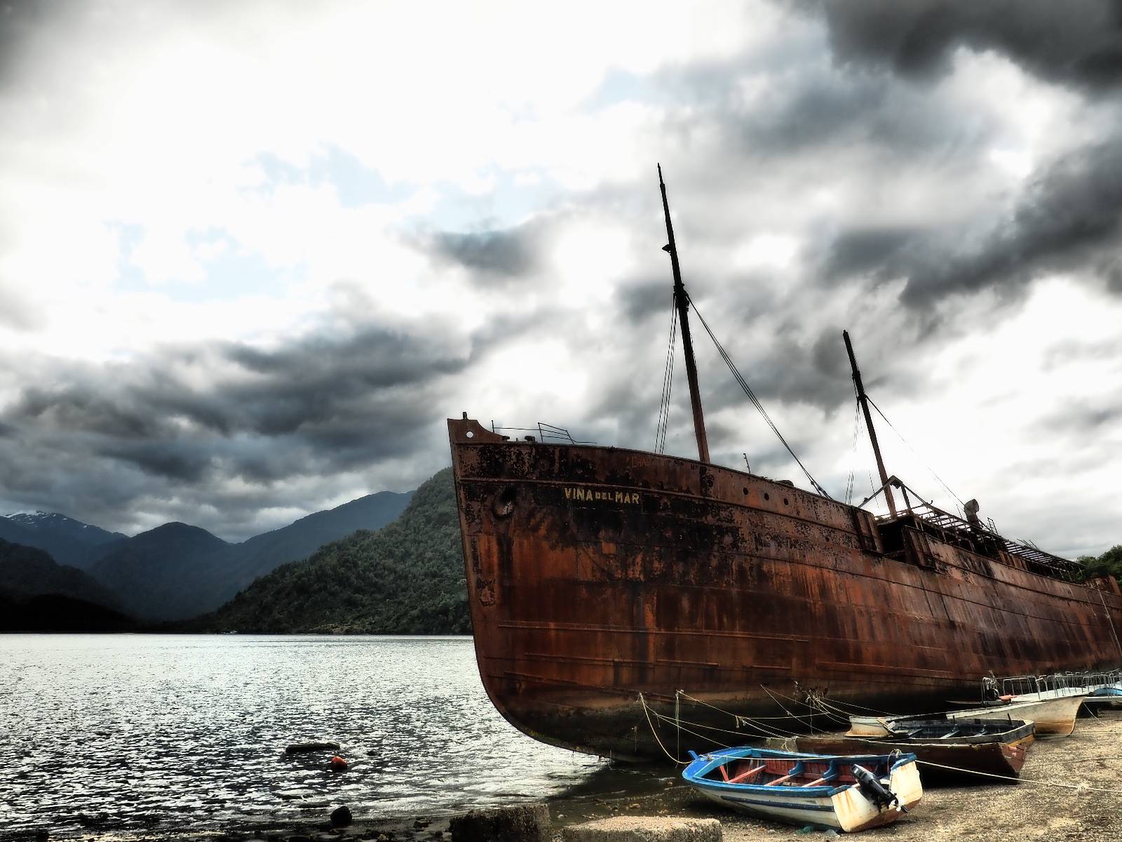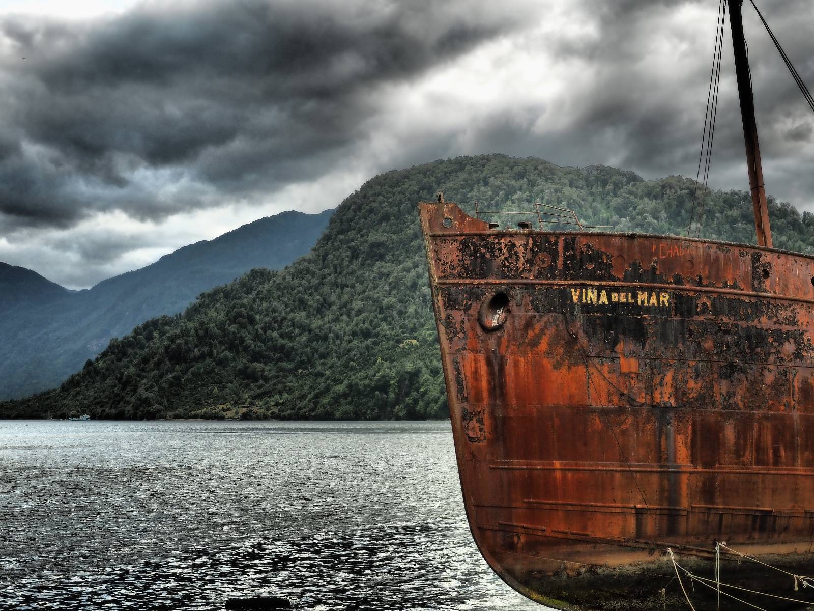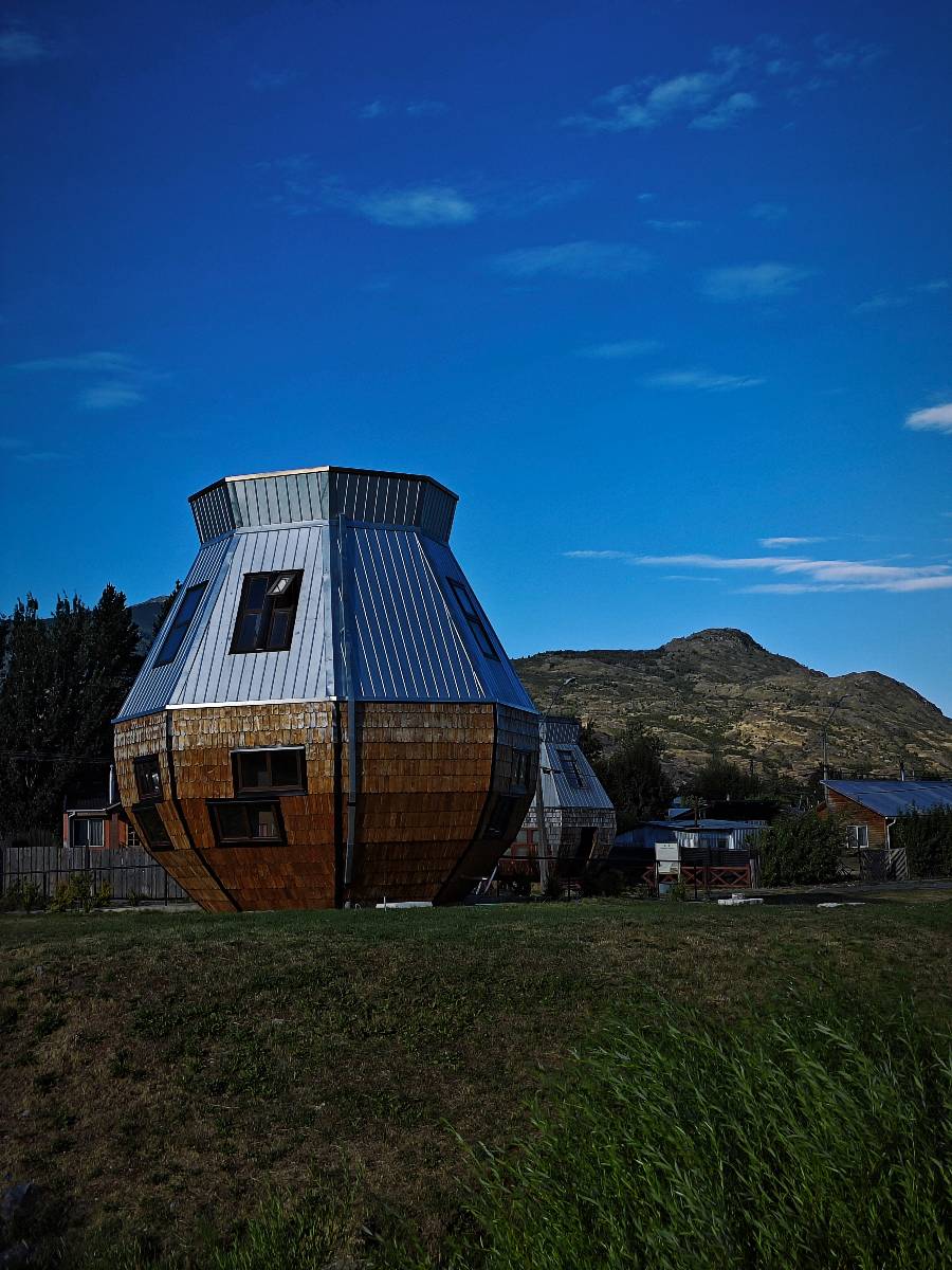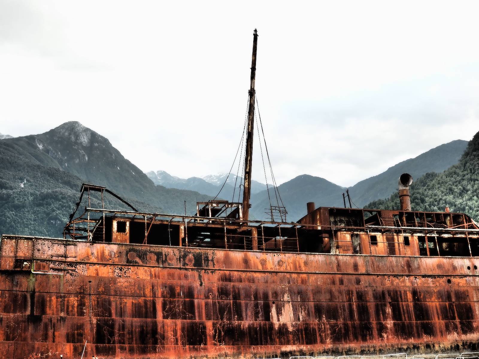 Meine Zwischenetappe ist erstmal Puerto Cisnes. Allein der Weg dort hin bietet wieder schöne Aussichten und so mancher Gletscher lässt sich gut von der Straße aus sehen. Ich bin wieder auf Schotter und über enge Serpentinen erklimme ich einen kleinen Pass der durch dicht bewachsenen Urwald führt mit sensationellen Blicken zurück auf eis- und schneebedeckte Berge. Puerto Cisnes ist nicht mehr weit. Als ich ankomme fahre ich einmal die Uferpromenade ab und halte an einem netten Restaurant mit Terrasse. Ich gönne mir Lachs mit Kartoffelbrei, was sehr lecker ist und genieße den Blick auf die weite, im Sonnenschein ruhig daliegende Bucht, den Fjord dahinter und die Berge am anderen weit entfernten Ufer. Es ist gerade einfach nur schön und gemütlich und lädt eigentlich zum Bleiben ein. Nebenbei schwatze ich ein wenig mit Paola vom Nachbartisch und erfahre, das sie aus Salta ist. Aber ich will noch ein Stückchen hinter mich bringen und das Ziel ist Puerto Chacabuco in der Nähe von Puerto Aisén. Auf der Hauptstraße in Chacabuco laufen mich zwei Hunde wild kläffend und mit gestäubten Fell an und rennen dicht hinter mir her. Es ist nicht das erste Mal und langsamer werden hilft durchaus oder gleich richtig durchziehen. Ich fahre erstmal bis zu Ende des Ortes, um mich zu orientieren und mir in den einschlägigen App’s eine Unterkunft zu suchen. Dabei sehe ich auch mein Fotoziel für den Rest des späten Nachmittages. Ein altes großes rostiges Schiffswrack, welches direkt am Strand der Bucht aus dem Wasser ragt. Doch erstmal das ausgewählte Hostal, wovon es hier nicht allzu viele gibt anfahren. Die beiden Wilden „begrüßen“ mich wieder wild jagend und dummerweise ist der Hostaleingan direkt vor ihrem Revier. Als durch! Falls einer beißt, durch die Stiefel kommt er sicher nicht durch! Ich halte vor der Tür steige ab und das allein verwirrt die beiden schon und als ich dem einen auch noch den Kopf kraule ist er völlig verwirrt! Eben war ich noch der böse Motorradfahrer und nun plötzlich Streicheleinheiten? Für einen Moment habe ich ihm wohl sein Weltbild zerstört! Ich mache mich auf dem Weg zum Schiffswrack und schaue, was ich alles für Motive finde. Zudem ist es eine schöne Gelegenheit auch mal wieder ein bisschen mit der Drohne zu spielen.