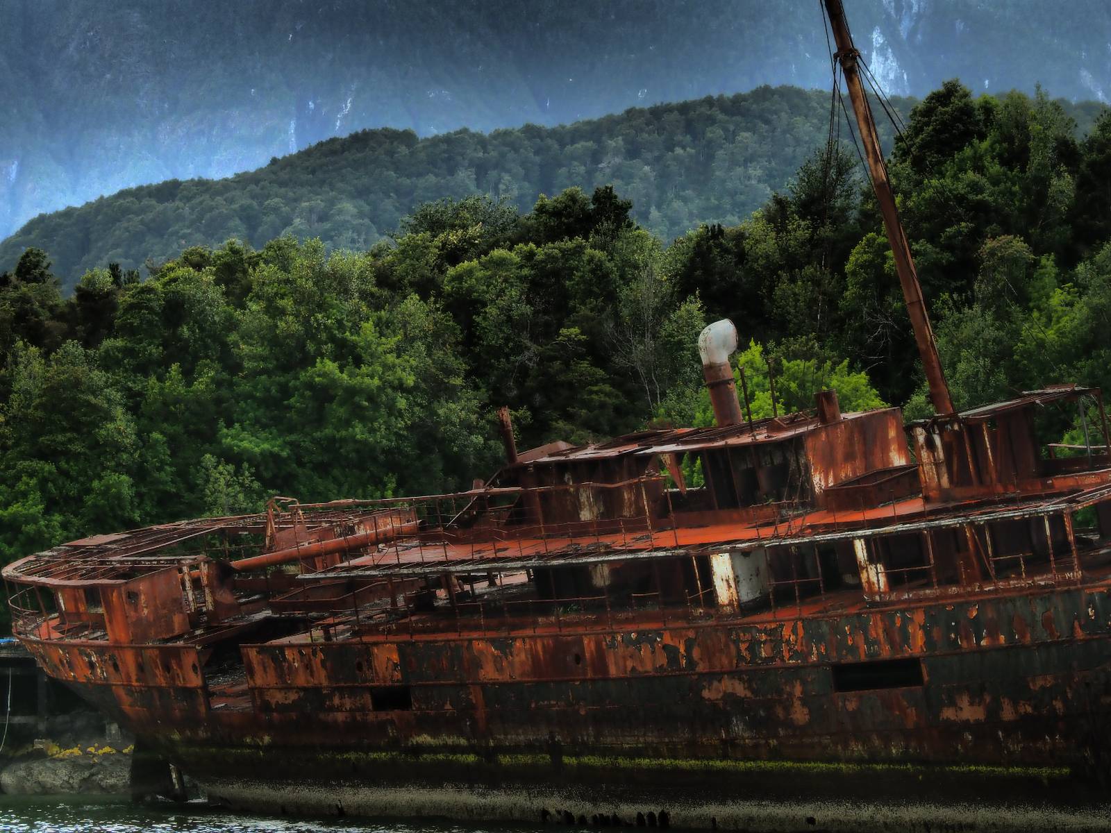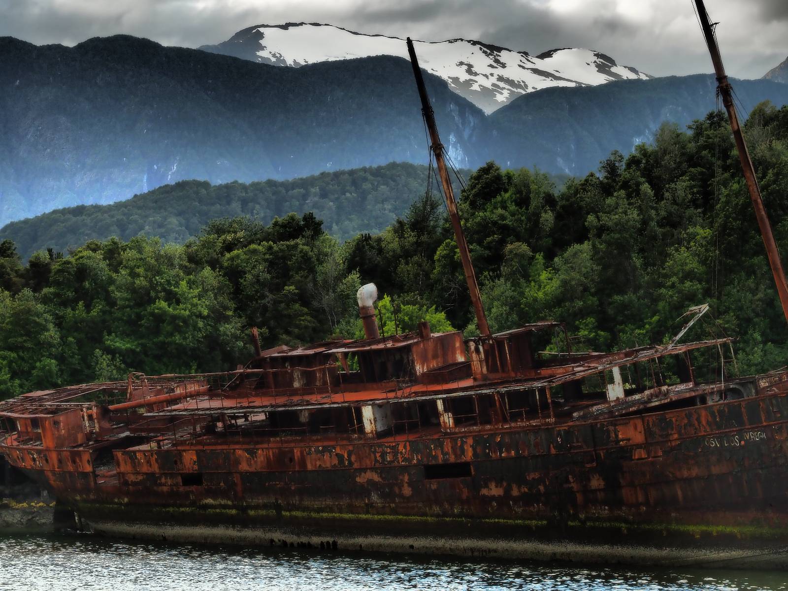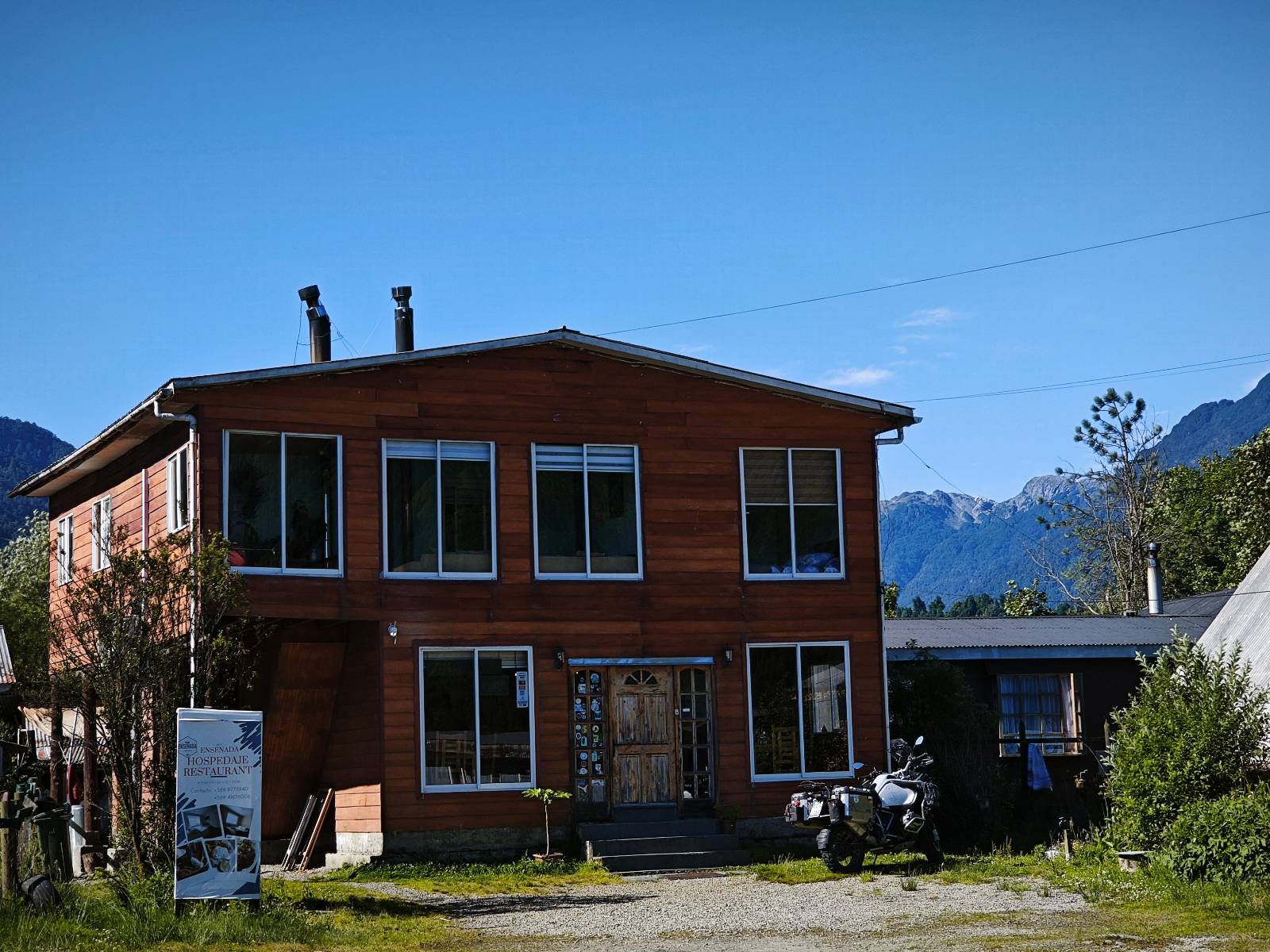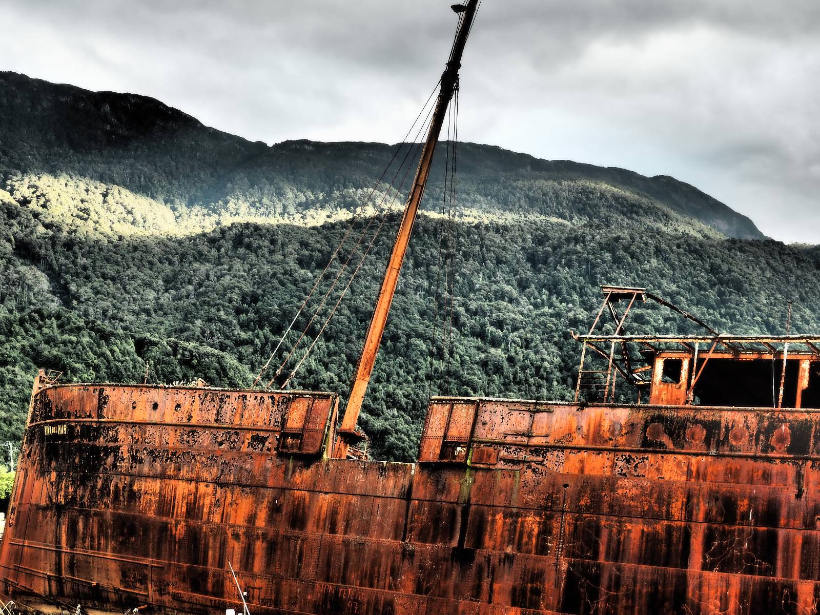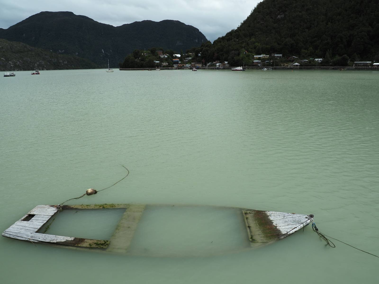 Meine Zwischenetappe ist erstmal Puerto Cisnes. Allein der Weg dort hin bietet wieder schöne Aussichten und so mancher Gletscher lässt sich gut von der Straße aus sehen. Ich bin wieder auf Schotter und über enge Serpentinen erklimme ich einen kleinen Pass der durch dicht bewachsenen Urwald führt mit sensationellen Blicken zurück auf eis- und schneebedeckte Berge. Puerto Cisnes ist nicht mehr weit. Als ich ankomme fahre ich einmal die Uferpromenade ab und halte an einem netten Restaurant mit Terrasse. Ich gönne mir Lachs mit Kartoffelbrei, was sehr lecker ist und genieße den Blick auf die weite, im Sonnenschein ruhig daliegende Bucht, den Fjord dahinter und die Berge am anderen weit entfernten Ufer. Es ist gerade einfach nur schön und gemütlich und lädt eigentlich zum Bleiben ein. Nebenbei schwatze ich ein wenig mit Paola vom Nachbartisch und erfahre, das sie aus Salta ist. Aber ich will noch ein Stückchen hinter mich bringen und das Ziel ist Puerto Chacabuco in der Nähe von Puerto Aisén. Auf der Hauptstraße in Chacabuco laufen mich zwei Hunde wild kläffend und mit gestäubten Fell an und rennen dicht hinter mir her. Es ist nicht das erste Mal und langsamer werden hilft durchaus oder gleich richtig durchziehen. Ich fahre erstmal bis zu Ende des Ortes, um mich zu orientieren und mir in den einschlägigen App’s eine Unterkunft zu suchen. Dabei sehe ich auch mein Fotoziel für den Rest des späten Nachmittages. Ein altes großes rostiges Schiffswrack, welches direkt am Strand der Bucht aus dem Wasser ragt. Doch erstmal das ausgewählte Hostal, wovon es hier nicht allzu viele gibt anfahren. Die beiden Wilden „begrüßen“ mich wieder wild jagend und dummerweise ist der Hostaleingan direkt vor ihrem Revier. Als durch! Falls einer beißt, durch die Stiefel kommt er sicher nicht durch! Ich halte vor der Tür steige ab und das allein verwirrt die beiden schon und als ich dem einen auch noch den Kopf kraule ist er völlig verwirrt! Eben war ich noch der böse Motorradfahrer und nun plötzlich Streicheleinheiten? Für einen Moment habe ich ihm wohl sein Weltbild zerstört! Ich mache mich auf dem Weg zum Schiffswrack und schaue, was ich alles für Motive finde. Zudem ist es eine schöne Gelegenheit auch mal wieder ein bisschen mit der Drohne zu spielen.