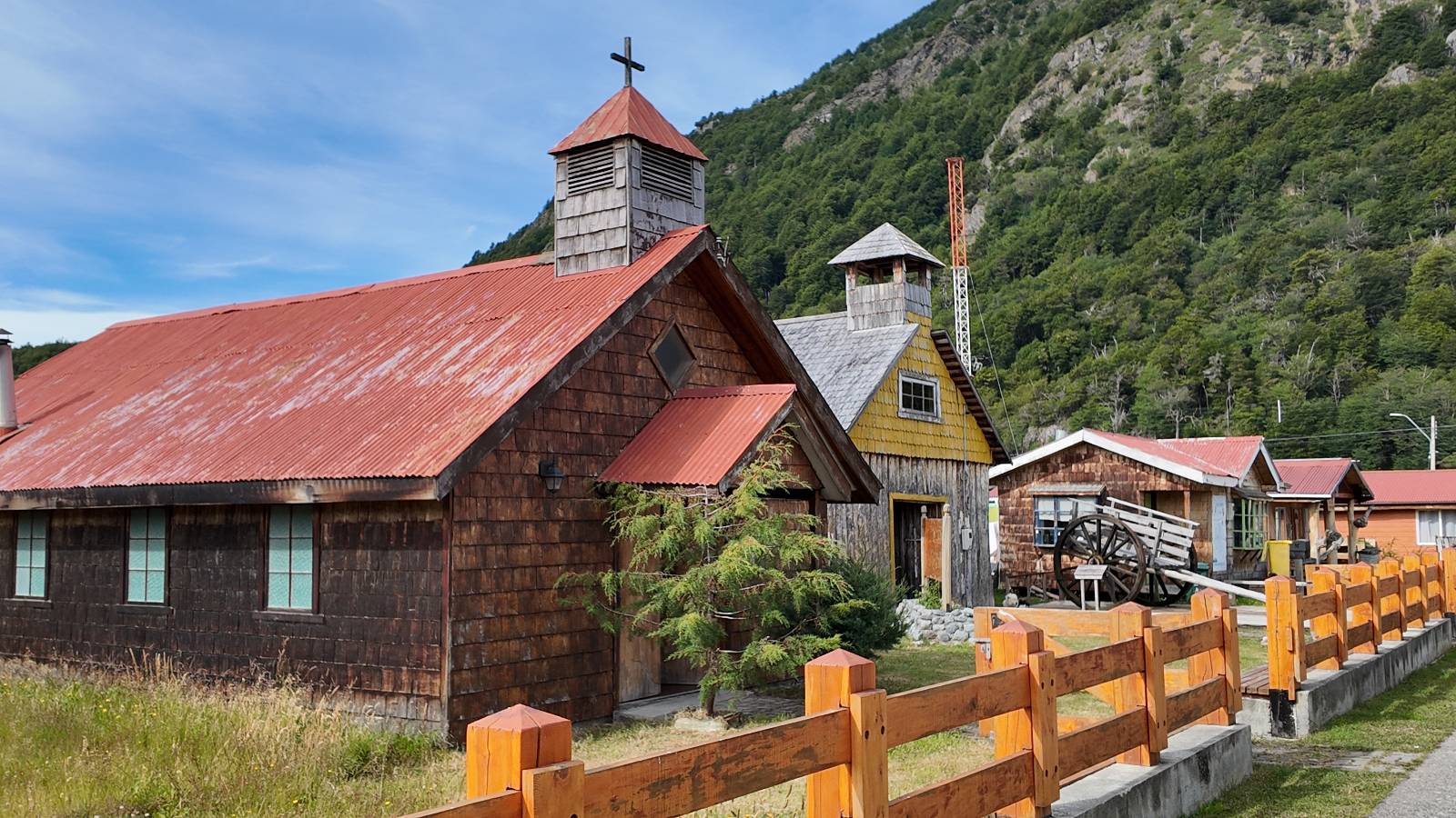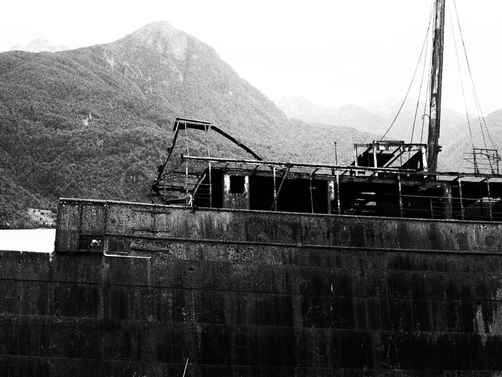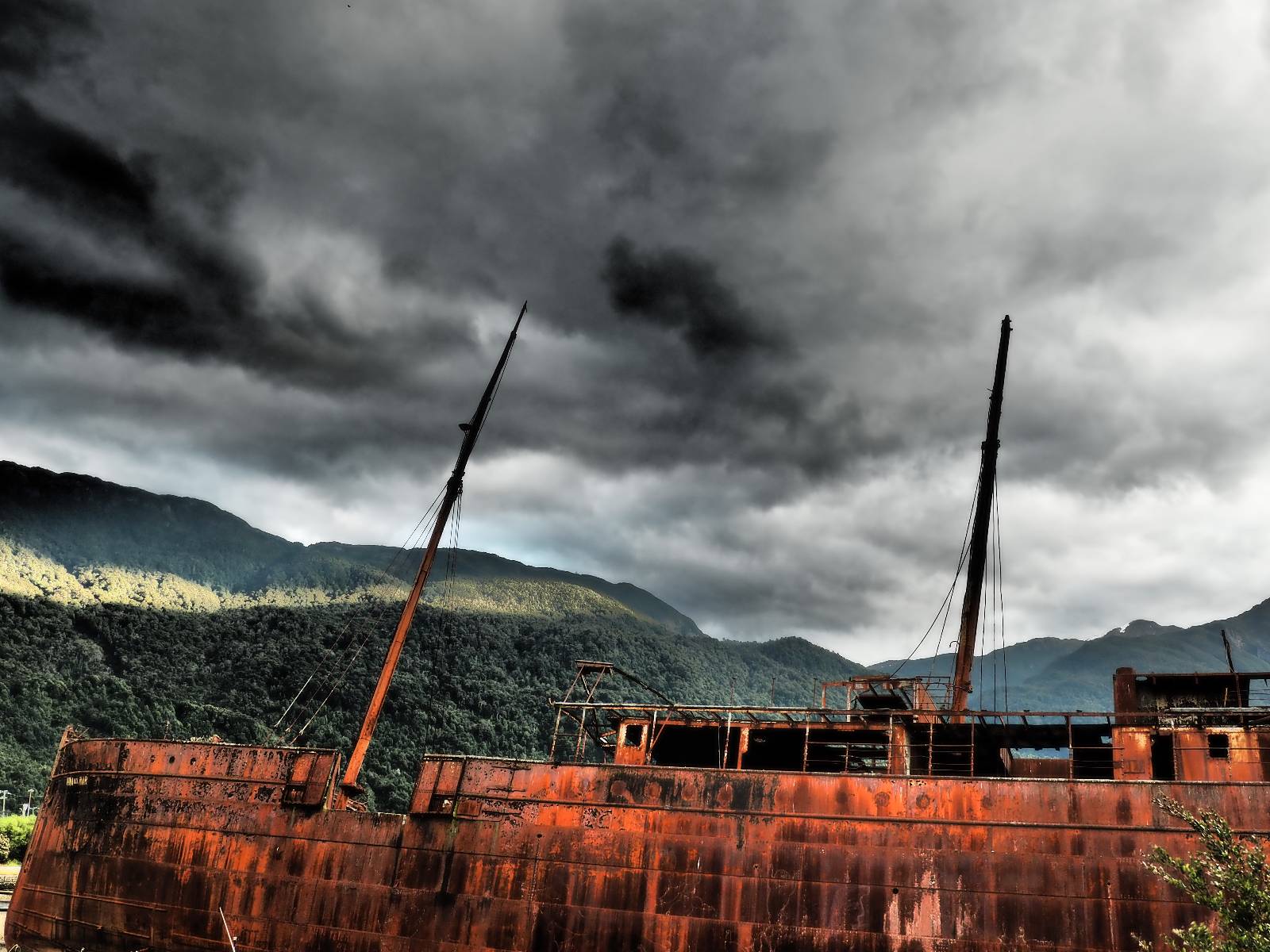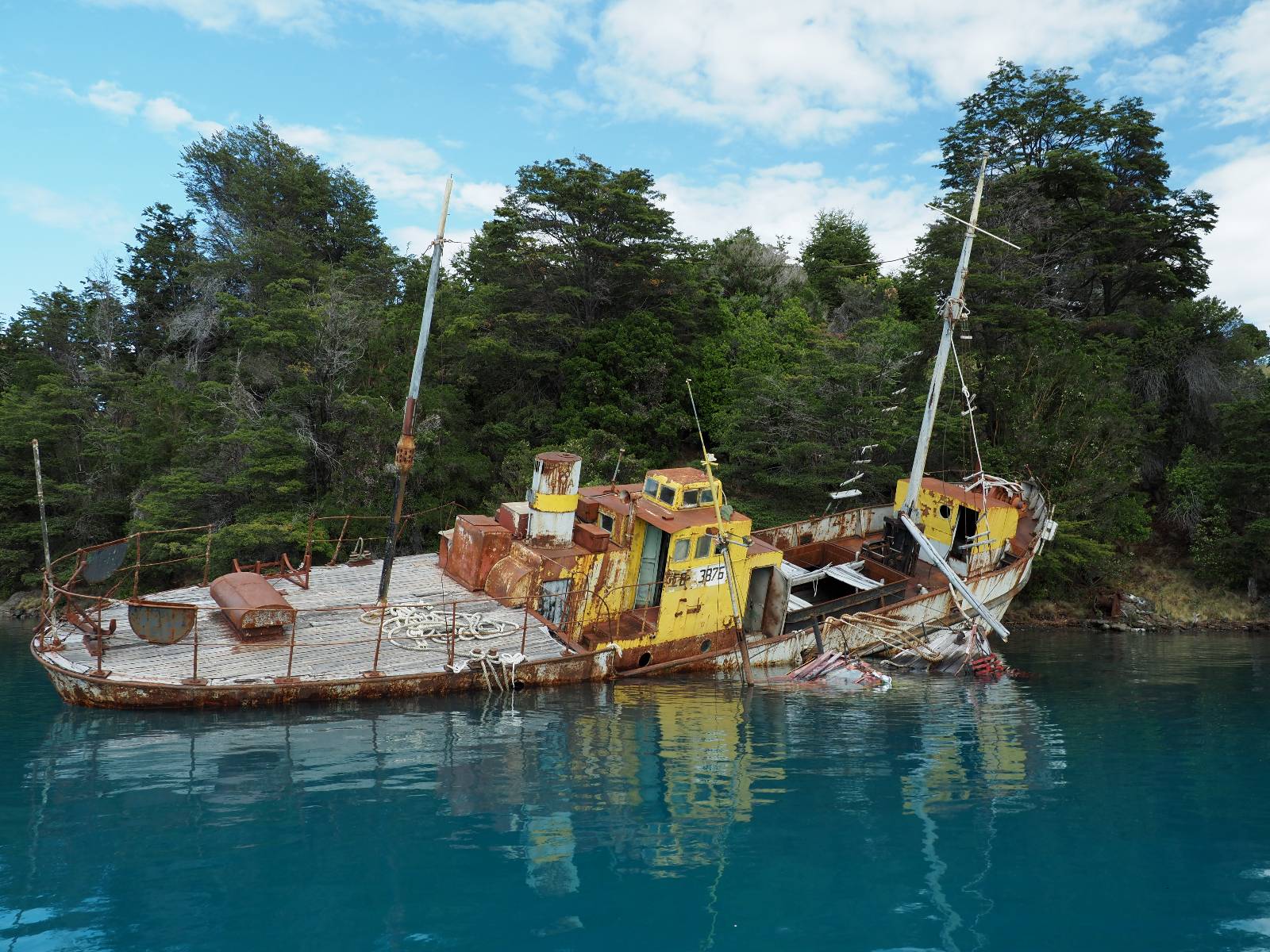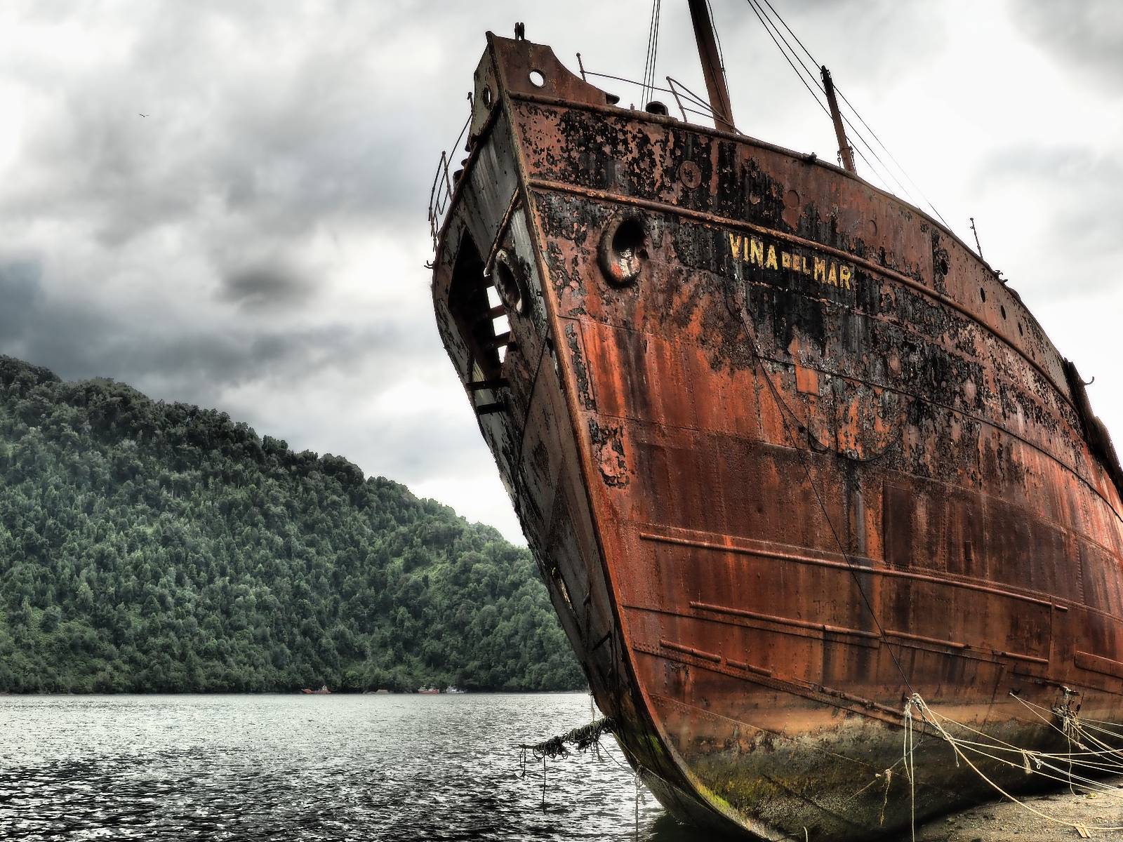 Meine Zwischenetappe ist erstmal Puerto Cisnes. Allein der Weg dort hin bietet wieder schöne Aussichten und so mancher Gletscher lässt sich gut von der Straße aus sehen. Ich bin wieder auf Schotter und über enge Serpentinen erklimme ich einen kleinen Pass der durch dicht bewachsenen Urwald führt mit sensationellen Blicken zurück auf eis- und schneebedeckte Berge. Puerto Cisnes ist nicht mehr weit. Als ich ankomme fahre ich einmal die Uferpromenade ab und halte an einem netten Restaurant mit Terrasse. Ich gönne mir Lachs mit Kartoffelbrei, was sehr lecker ist und genieße den Blick auf die weite, im Sonnenschein ruhig daliegende Bucht, den Fjord dahinter und die Berge am anderen weit entfernten Ufer. Es ist gerade einfach nur schön und gemütlich und lädt eigentlich zum Bleiben ein. Nebenbei schwatze ich ein wenig mit Paola vom Nachbartisch und erfahre, das sie aus Salta ist. Aber ich will noch ein Stückchen hinter mich bringen und das Ziel ist Puerto Chacabuco in der Nähe von Puerto Aisén. Auf der Hauptstraße in Chacabuco laufen mich zwei Hunde wild kläffend und mit gestäubten Fell an und rennen dicht hinter mir her. Es ist nicht das erste Mal und langsamer werden hilft durchaus oder gleich richtig durchziehen. Ich fahre erstmal bis zu Ende des Ortes, um mich zu orientieren und mir in den einschlägigen App’s eine Unterkunft zu suchen. Dabei sehe ich auch mein Fotoziel für den Rest des späten Nachmittages. Ein altes großes rostiges Schiffswrack, welches direkt am Strand der Bucht aus dem Wasser ragt. Doch erstmal das ausgewählte Hostal, wovon es hier nicht allzu viele gibt anfahren. Die beiden Wilden „begrüßen“ mich wieder wild jagend und dummerweise ist der Hostaleingan direkt vor ihrem Revier. Als durch! Falls einer beißt, durch die Stiefel kommt er sicher nicht durch! Ich halte vor der Tür steige ab und das allein verwirrt die beiden schon und als ich dem einen auch noch den Kopf kraule ist er völlig verwirrt! Eben war ich noch der böse Motorradfahrer und nun plötzlich Streicheleinheiten? Für einen Moment habe ich ihm wohl sein Weltbild zerstört! Ich mache mich auf dem Weg zum Schiffswrack und schaue, was ich alles für Motive finde. Zudem ist es eine schöne Gelegenheit auch mal wieder ein bisschen mit der Drohne zu spielen.