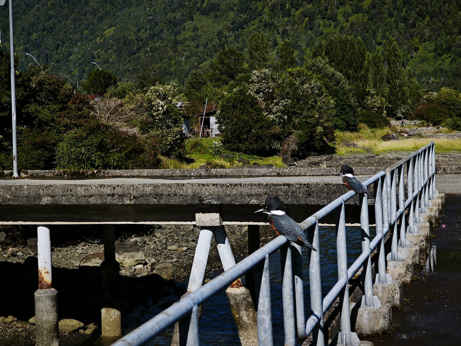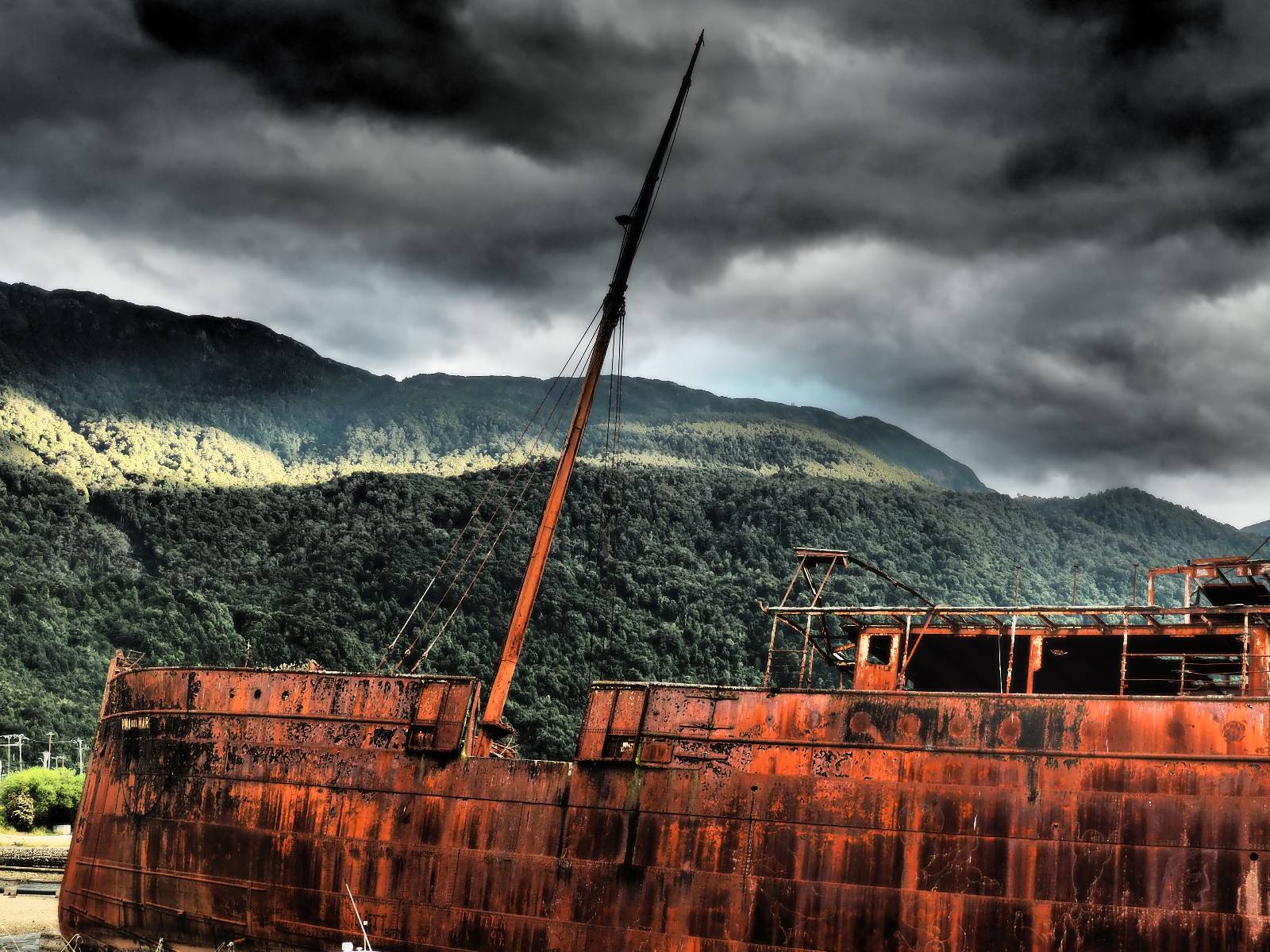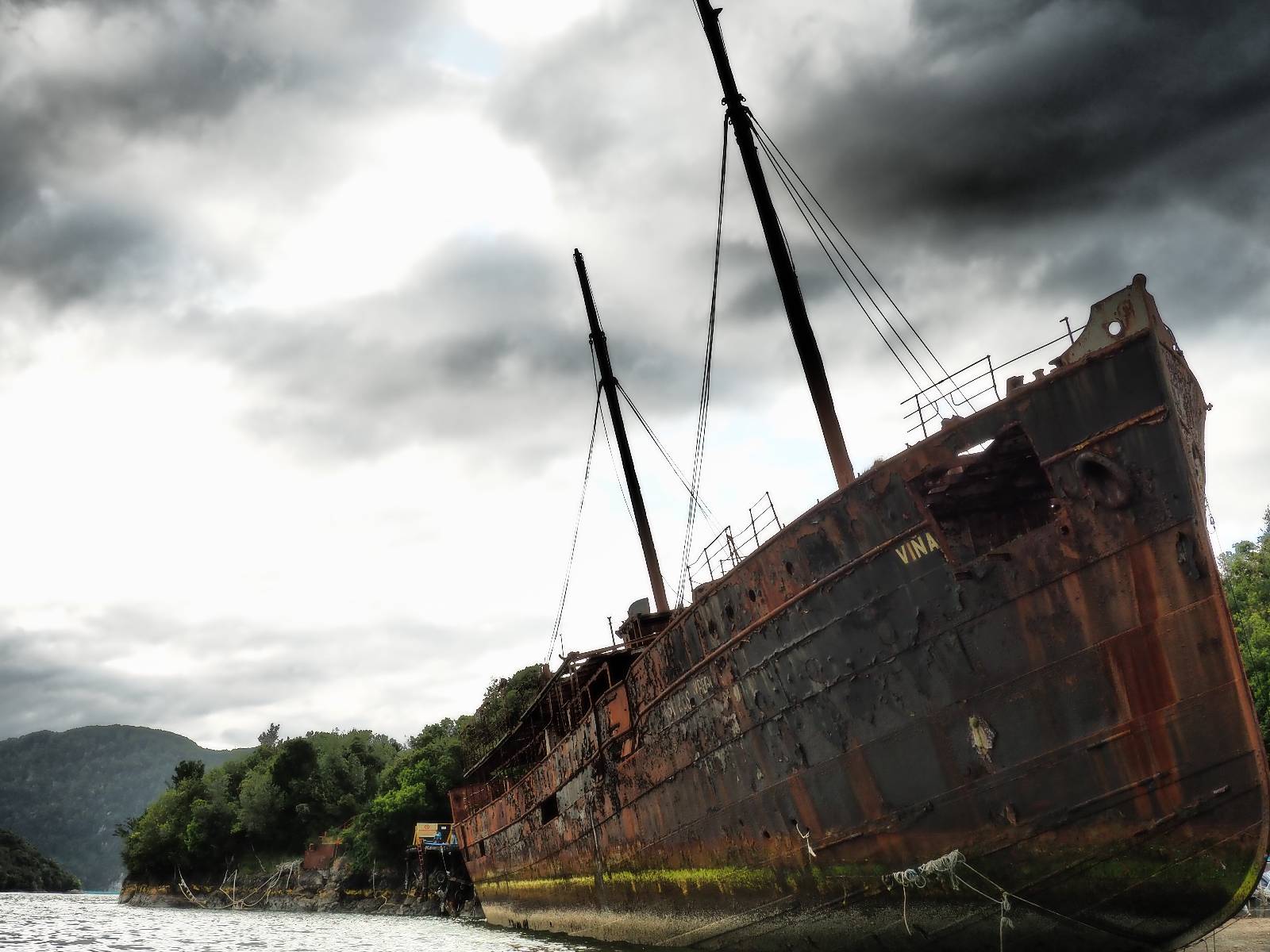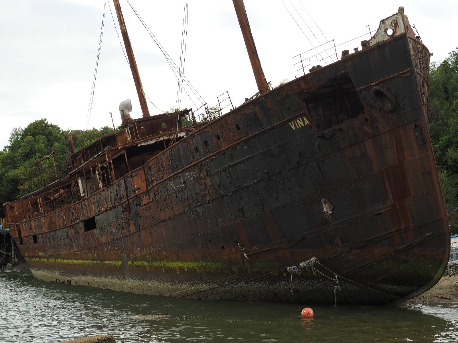 Meine Zwischenetappe ist erstmal Puerto Cisnes. Allein der Weg dort hin bietet wieder schöne Aussichten und so mancher Gletscher lässt sich gut von der Straße aus sehen. Ich bin wieder auf Schotter und über enge Serpentinen erklimme ich einen kleinen Pass der durch dicht bewachsenen Urwald führt mit sensationellen Blicken zurück auf eis- und schneebedeckte Berge. Puerto Cisnes ist nicht mehr weit. Als ich ankomme fahre ich einmal die Uferpromenade ab und halte an einem netten Restaurant mit Terrasse. Ich gönne mir Lachs mit Kartoffelbrei, was sehr lecker ist und genieße den Blick auf die weite, im Sonnenschein ruhig daliegende Bucht, den Fjord dahinter und die Berge am anderen weit entfernten Ufer. Es ist gerade einfach nur schön und gemütlich und lädt eigentlich zum Bleiben ein. Nebenbei schwatze ich ein wenig mit Paola vom Nachbartisch und erfahre, das sie aus Salta ist. Aber ich will noch ein Stückchen hinter mich bringen und das Ziel ist Puerto Chacabuco in der Nähe von Puerto Aisén. Auf der Hauptstraße in Chacabuco laufen mich zwei Hunde wild kläffend und mit gestäubten Fell an und rennen dicht hinter mir her. Es ist nicht das erste Mal und langsamer werden hilft durchaus oder gleich richtig durchziehen. Ich fahre erstmal bis zu Ende des Ortes, um mich zu orientieren und mir in den einschlägigen App’s eine Unterkunft zu suchen. Dabei sehe ich auch mein Fotoziel für den Rest des späten Nachmittages. Ein altes großes rostiges Schiffswrack, welches direkt am Strand der Bucht aus dem Wasser ragt. Doch erstmal das ausgewählte Hostal, wovon es hier nicht allzu viele gibt anfahren. Die beiden Wilden „begrüßen“ mich wieder wild jagend und dummerweise ist der Hostaleingan direkt vor ihrem Revier. Als durch! Falls einer beißt, durch die Stiefel kommt er sicher nicht durch! Ich halte vor der Tür steige ab und das allein verwirrt die beiden schon und als ich dem einen auch noch den Kopf kraule ist er völlig verwirrt! Eben war ich noch der böse Motorradfahrer und nun plötzlich Streicheleinheiten? Für einen Moment habe ich ihm wohl sein Weltbild zerstört! Ich mache mich auf dem Weg zum Schiffswrack und schaue, was ich alles für Motive finde. Zudem ist es eine schöne Gelegenheit auch mal wieder ein bisschen mit der Drohne zu spielen.