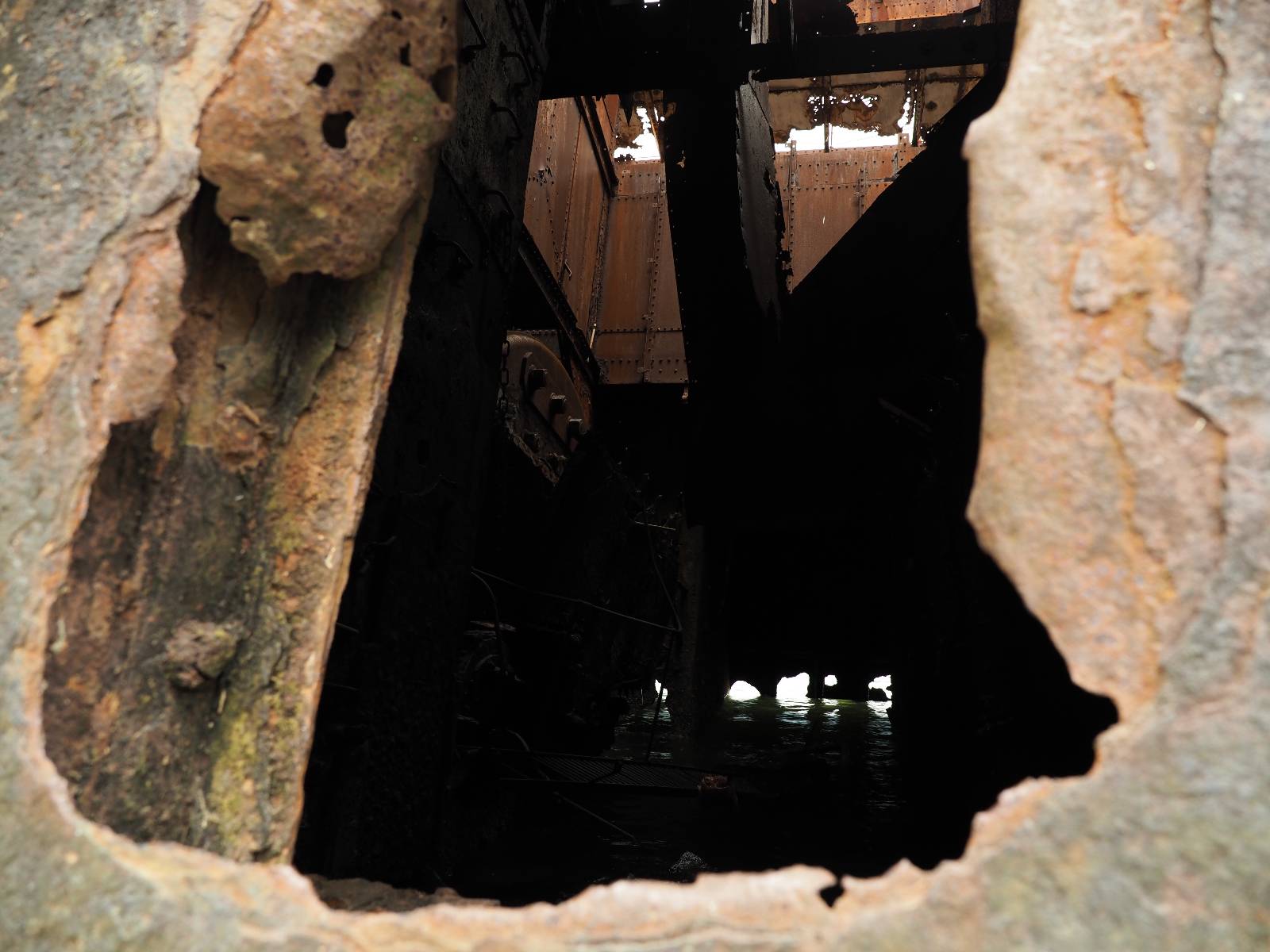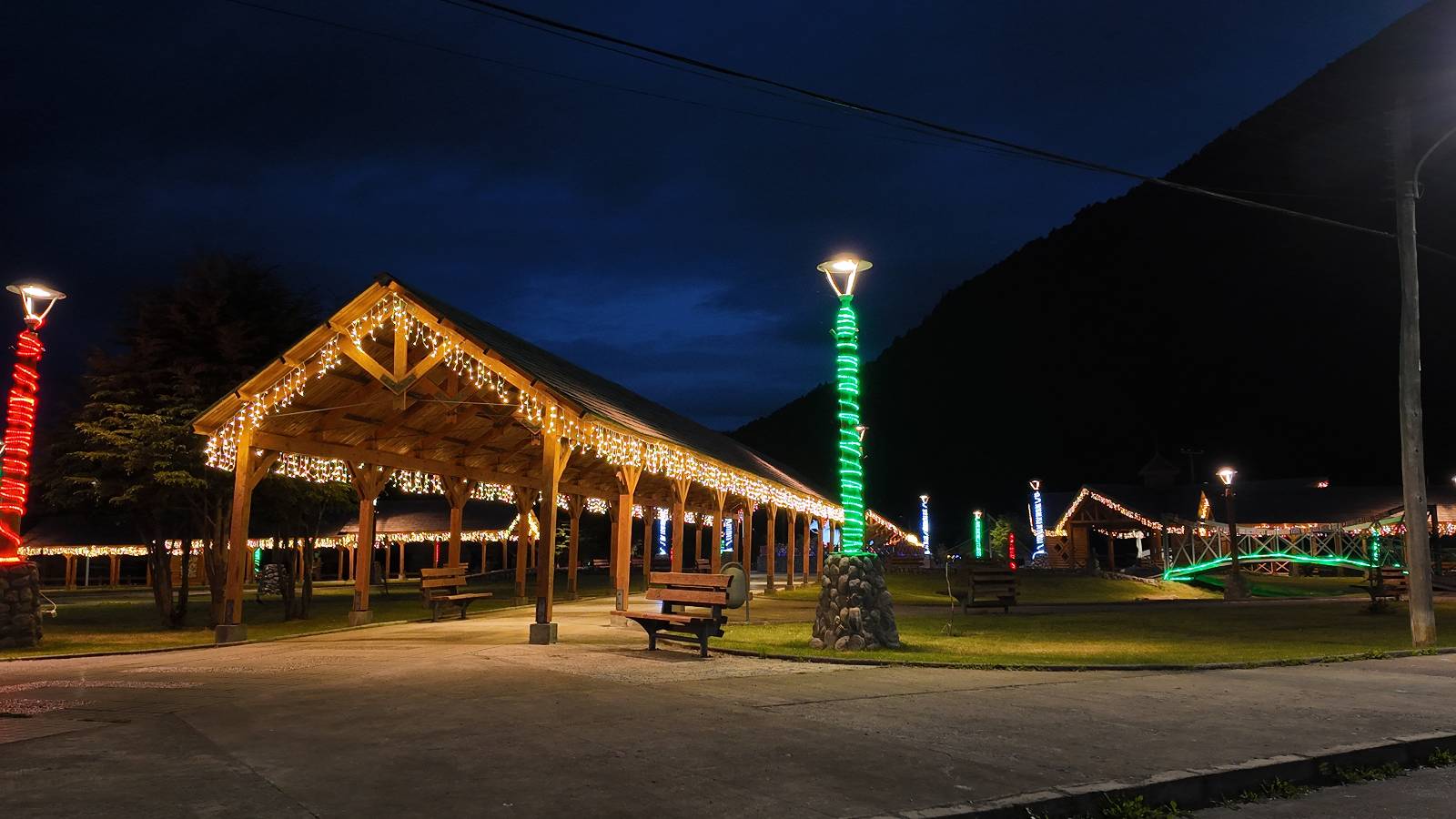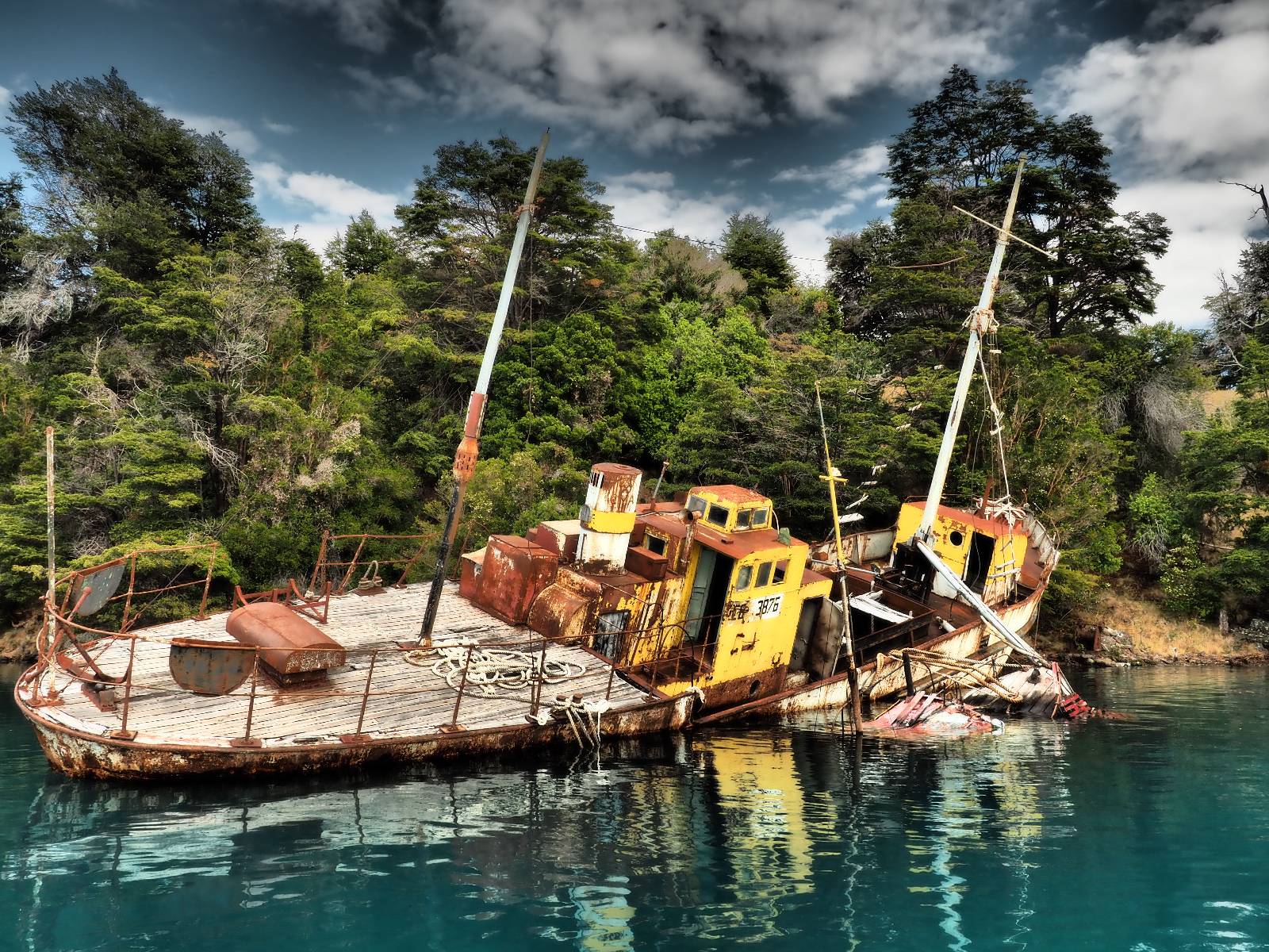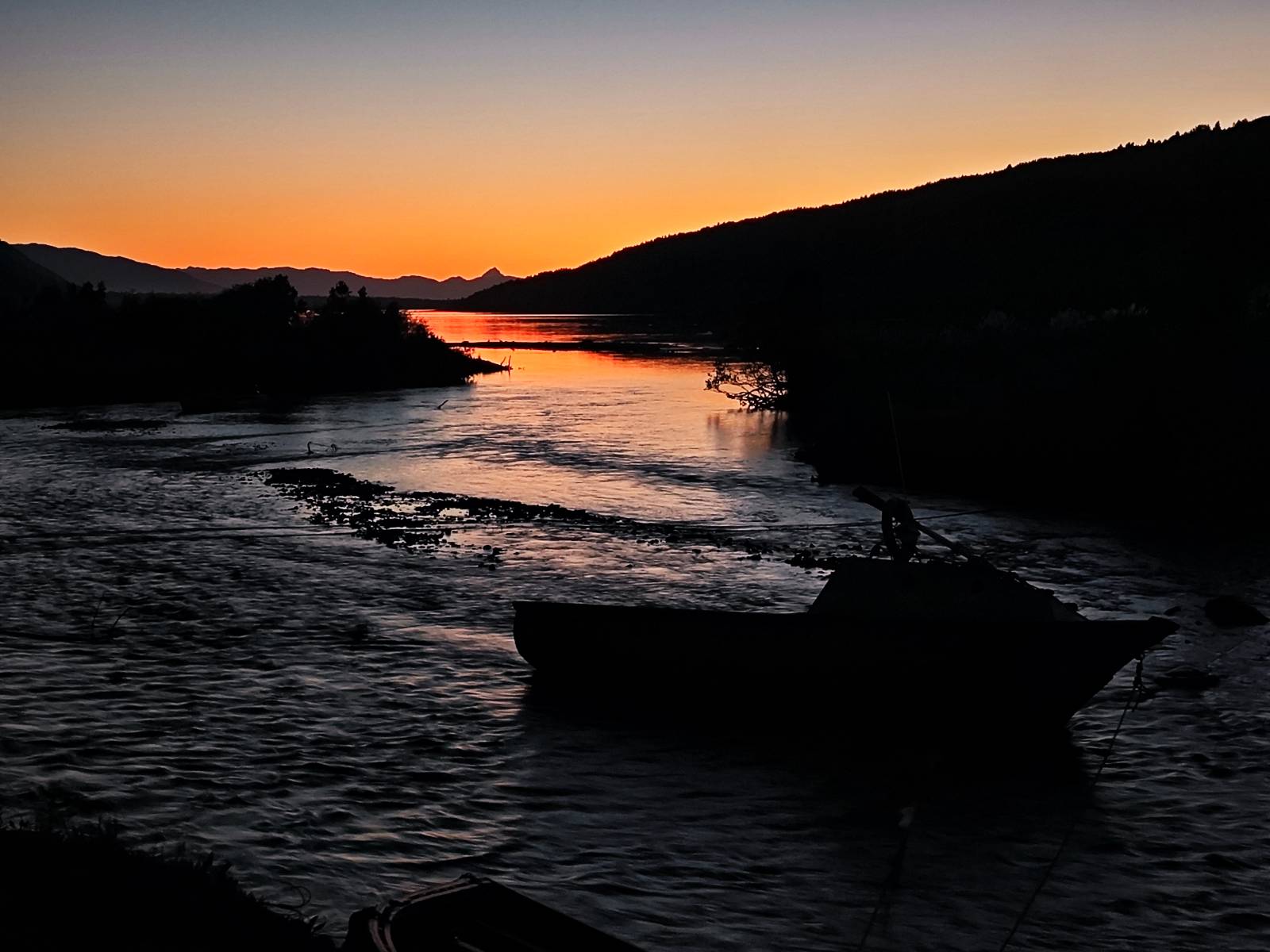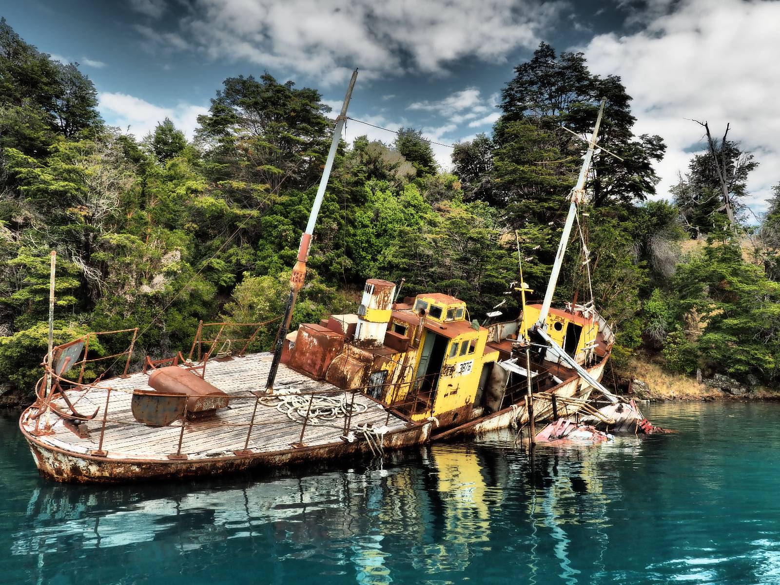 Meine Zwischenetappe ist erstmal Puerto Cisnes. Allein der Weg dort hin bietet wieder schöne Aussichten und so mancher Gletscher lässt sich gut von der Straße aus sehen. Ich bin wieder auf Schotter und über enge Serpentinen erklimme ich einen kleinen Pass der durch dicht bewachsenen Urwald führt mit sensationellen Blicken zurück auf eis- und schneebedeckte Berge. Puerto Cisnes ist nicht mehr weit. Als ich ankomme fahre ich einmal die Uferpromenade ab und halte an einem netten Restaurant mit Terrasse. Ich gönne mir Lachs mit Kartoffelbrei, was sehr lecker ist und genieße den Blick auf die weite, im Sonnenschein ruhig daliegende Bucht, den Fjord dahinter und die Berge am anderen weit entfernten Ufer. Es ist gerade einfach nur schön und gemütlich und lädt eigentlich zum Bleiben ein. Nebenbei schwatze ich ein wenig mit Paola vom Nachbartisch und erfahre, das sie aus Salta ist. Aber ich will noch ein Stückchen hinter mich bringen und das Ziel ist Puerto Chacabuco in der Nähe von Puerto Aisén. Auf der Hauptstraße in Chacabuco laufen mich zwei Hunde wild kläffend und mit gestäubten Fell an und rennen dicht hinter mir her. Es ist nicht das erste Mal und langsamer werden hilft durchaus oder gleich richtig durchziehen. Ich fahre erstmal bis zu Ende des Ortes, um mich zu orientieren und mir in den einschlägigen App’s eine Unterkunft zu suchen. Dabei sehe ich auch mein Fotoziel für den Rest des späten Nachmittages. Ein altes großes rostiges Schiffswrack, welches direkt am Strand der Bucht aus dem Wasser ragt. Doch erstmal das ausgewählte Hostal, wovon es hier nicht allzu viele gibt anfahren. Die beiden Wilden „begrüßen“ mich wieder wild jagend und dummerweise ist der Hostaleingan direkt vor ihrem Revier. Als durch! Falls einer beißt, durch die Stiefel kommt er sicher nicht durch! Ich halte vor der Tür steige ab und das allein verwirrt die beiden schon und als ich dem einen auch noch den Kopf kraule ist er völlig verwirrt! Eben war ich noch der böse Motorradfahrer und nun plötzlich Streicheleinheiten? Für einen Moment habe ich ihm wohl sein Weltbild zerstört! Ich mache mich auf dem Weg zum Schiffswrack und schaue, was ich alles für Motive finde. Zudem ist es eine schöne Gelegenheit auch mal wieder ein bisschen mit der Drohne zu spielen.