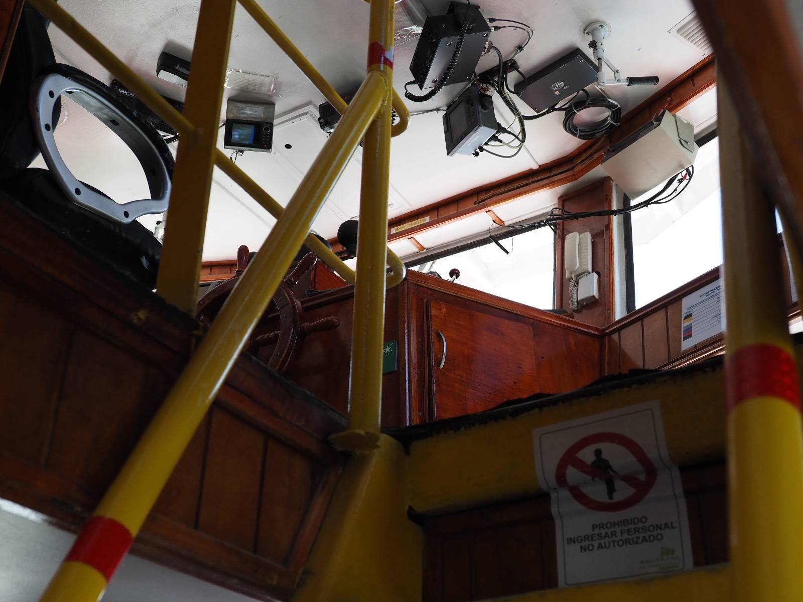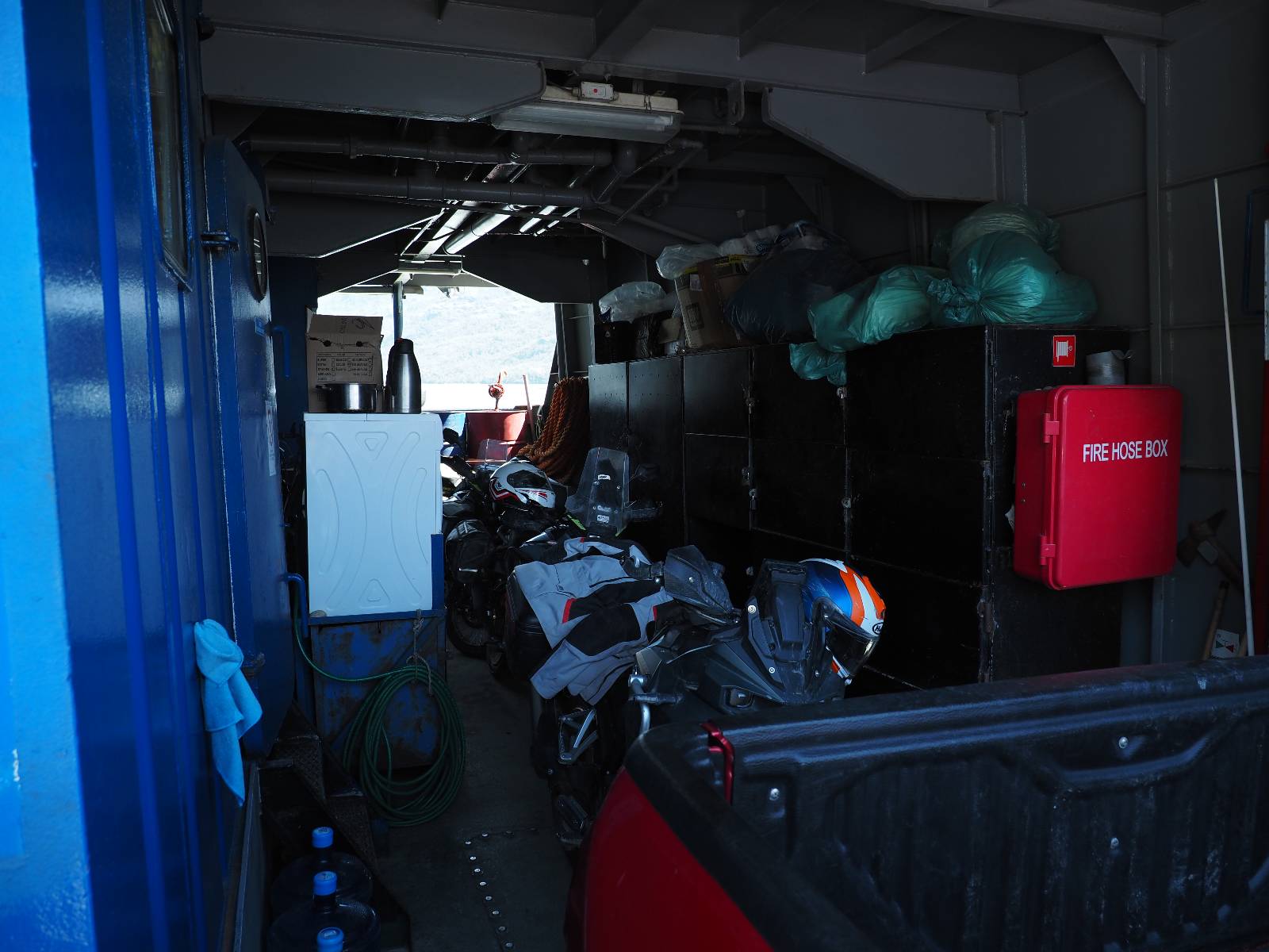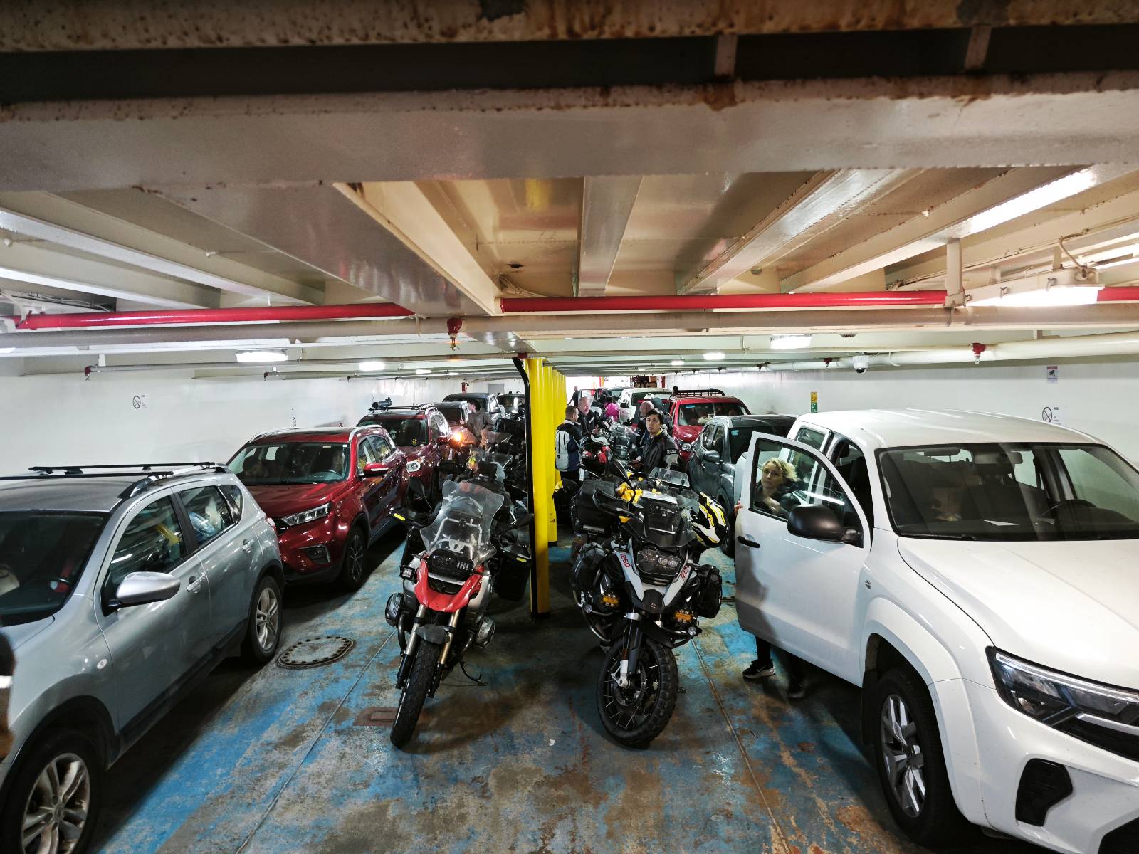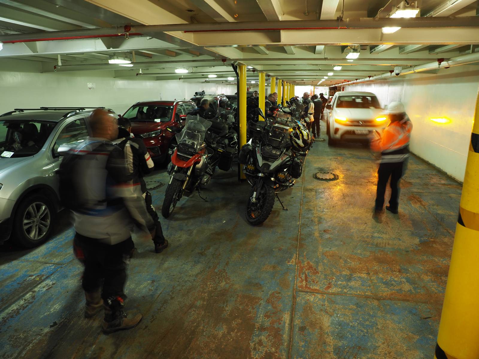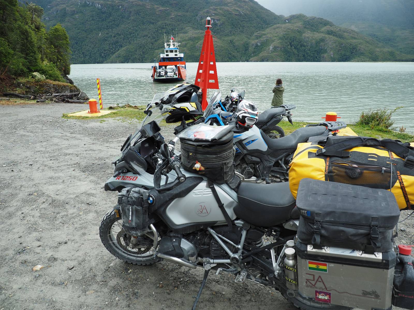 Am nächsten Morgen stehe ich zeitig am Fähranleger und geselle mich zu den anderen Motorrädern. Ein Einweiser geht durch die Reihen, kontrolliert die Tickets und verteilt laminierte grüne Haken und Rota „A“s. Ich dachte noch das A bedeutet sowas wie „A“ccepted, erfahre aber sehr schnell von Paolo aus Kolumbien, dass das Adelante heißt und so viel wie Warteliste bedeutet! Eine Fünfergruppe Slowaken kommt ebenfalls mit den schönen großen GS’en an, reiht sich ein und kommt ins Gespräch mit dem Einweiser. Ihr Spanisch ist noch viel rudimentärer als meins, sie verstehen aber, dass sie noch ein Ticket im Fährshop gegenüber kaufen müssen. Doch der Beauftragte kommt zurück und diskutiert. Was ich daraus verstehe ist, daß sie kein Ticket für in ein paar Tagen kaufen wollen. Also kläre ich sie auf englisch auf, dass sie einfach nur dieses Ticket brauchen, für welchen Tag auch immer und dann mit dieser Fähre mitkommen.