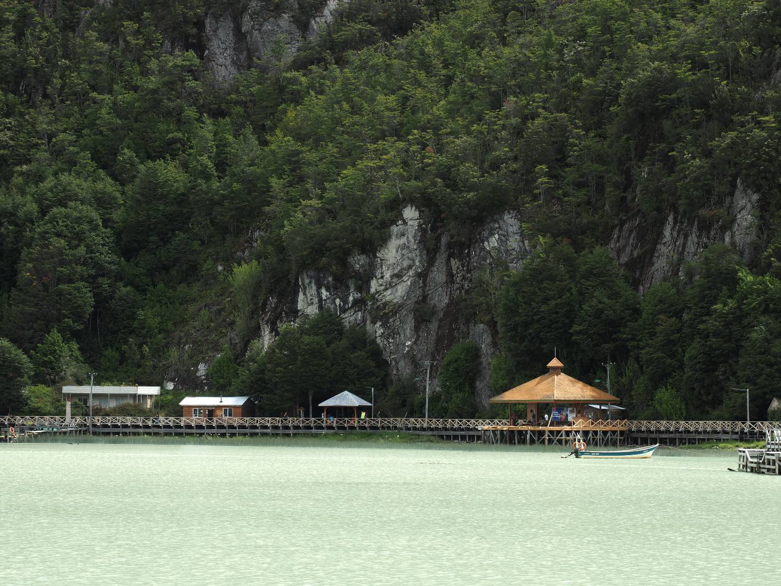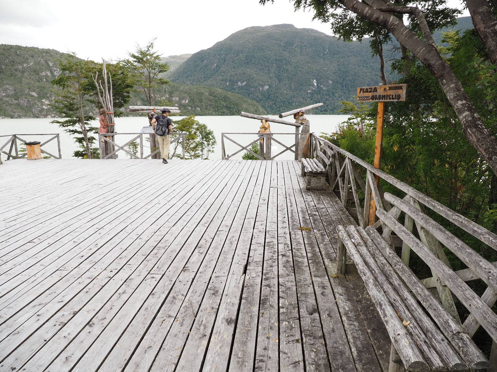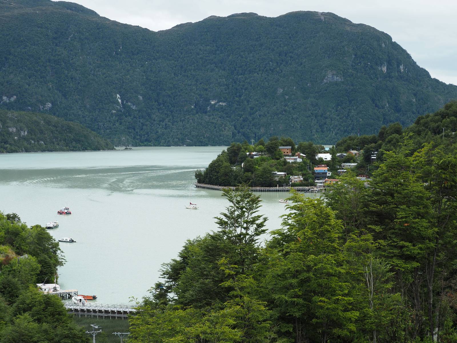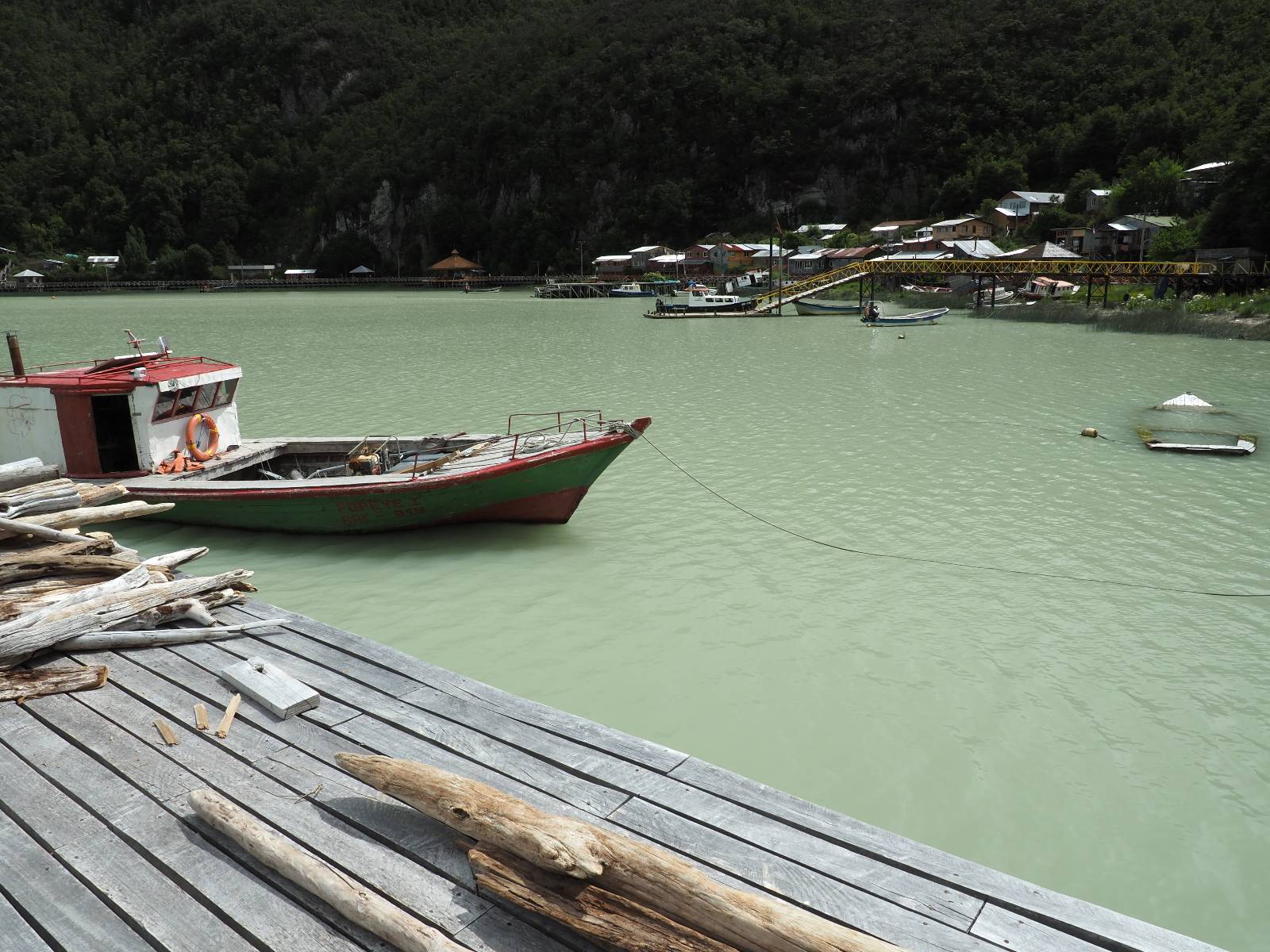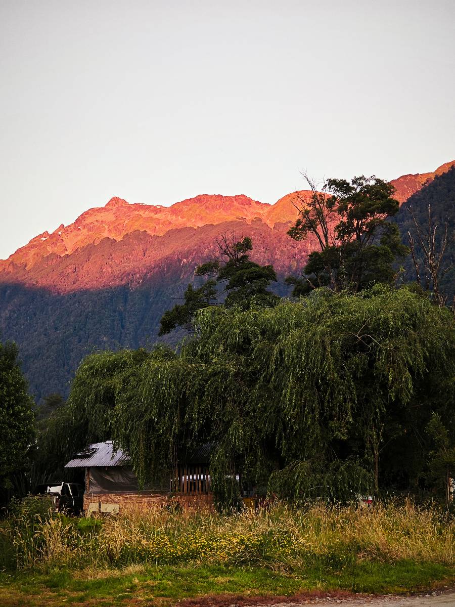 Der nächste Tag beginnt wesentlich schöner und es scheint sogar warm zu werden. Die Sachen sind doch soweit trocken geworden und den Rest müssen Sonne und Fahrtwind erledigen. So genieße ich einfach meine Fahrt und die blauen Stellen am Himmel, durch die immer mehr die Sonne scheint! Es lässt sich wunderbar cruisen, hier und da mache ich ein paar Bilder, halte auf einen Hamburger und Kaffee an. Ich fahre durch bis Puyuhuapi, einem kleinen Dorf am Ende eines Fjordes, das 1935 von ein paar Deutschen gegründet wurde. Es sieht etwas touristisch aus, lebt zumindest nur davon, so scheint es. Den alten Friedhof mit den deutschen Gräbern besuche ich nicht, trozdem ich mir hier zwei nächte gönne. Der eine Tag geht mal wieder für die Homepage und Film schneiden drauf, wobei ich in meinem Hostal einen kleinen Aufenhaltsraum habe, mit wunderbarem Blick auf das Wasser! Am letzten Abend esse ich Outdoor an einem Hamburgerwagen und unterhalte ich mich mit einem Reisepaar, das allerding nur ein paar Wochen unterwegs ist. Ich genieße den Blick auf das Wasser, ein Standup-Paddler zieht gemütlich seine Runde und irgend etwas anderes als Fisch schwimmt entfernt auch herum, allerdings kann ich es nicht erkennen.