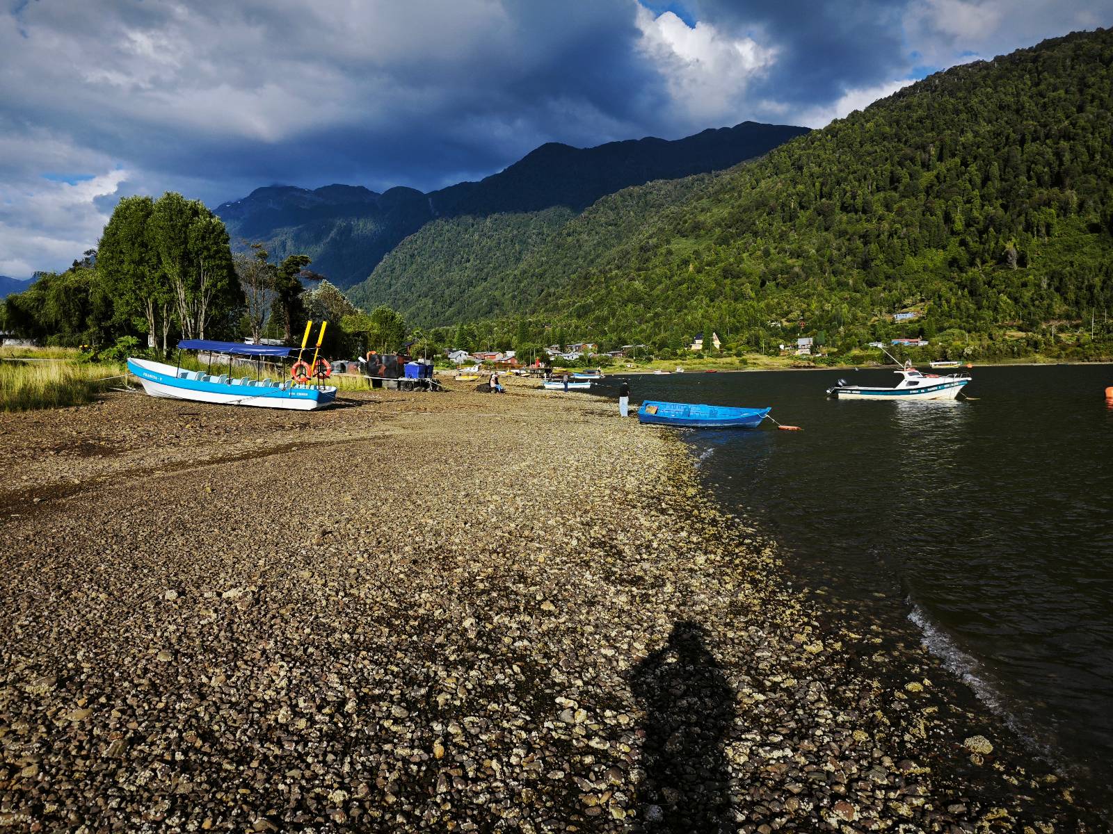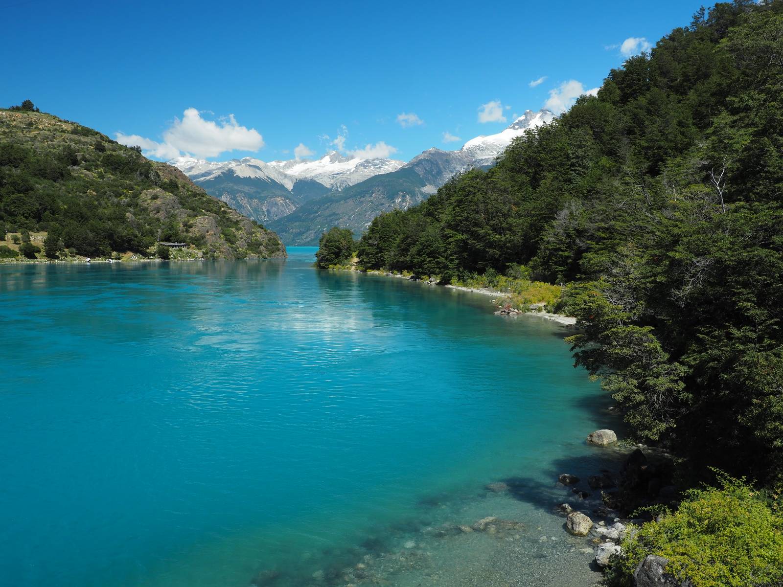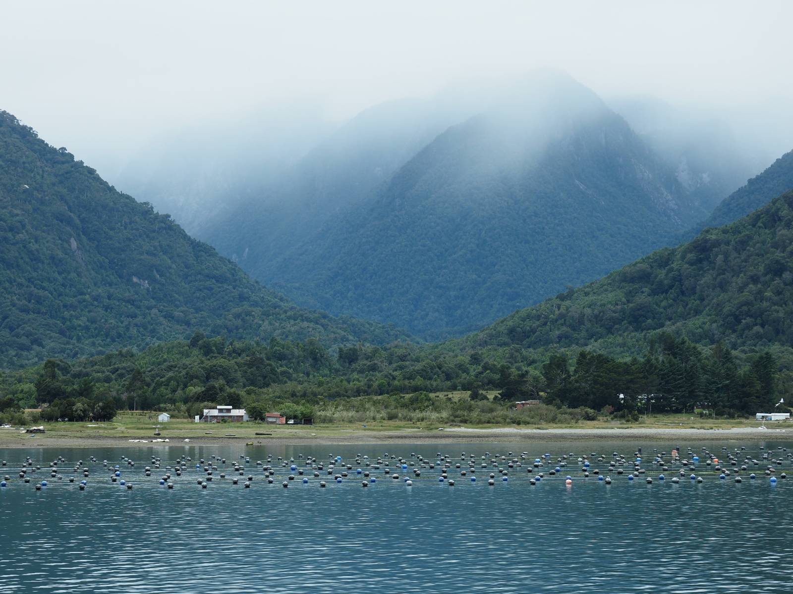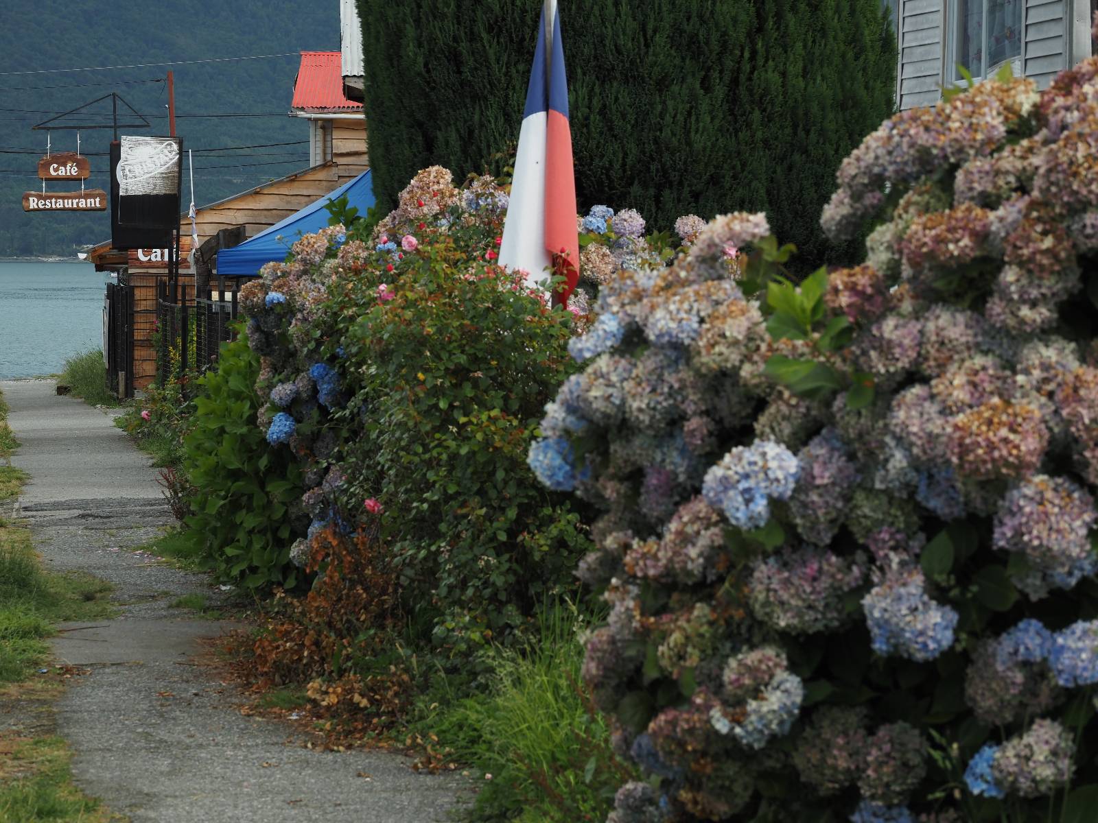 Der nächste Tag beginnt wesentlich schöner und es scheint sogar warm zu werden. Die Sachen sind doch soweit trocken geworden und den Rest müssen Sonne und Fahrtwind erledigen. So genieße ich einfach meine Fahrt und die blauen Stellen am Himmel, durch die immer mehr die Sonne scheint! Es lässt sich wunderbar cruisen, hier und da mache ich ein paar Bilder, halte auf einen Hamburger und Kaffee an. Ich fahre durch bis Puyuhuapi, einem kleinen Dorf am Ende eines Fjordes, das 1935 von ein paar Deutschen gegründet wurde. Es sieht etwas touristisch aus, lebt zumindest nur davon, so scheint es. Den alten Friedhof mit den deutschen Gräbern besuche ich nicht, trozdem ich mir hier zwei nächte gönne. Der eine Tag geht mal wieder für die Homepage und Film schneiden drauf, wobei ich in meinem Hostal einen kleinen Aufenhaltsraum habe, mit wunderbarem Blick auf das Wasser! Am letzten Abend esse ich Outdoor an einem Hamburgerwagen und unterhalte ich mich mit einem Reisepaar, das allerding nur ein paar Wochen unterwegs ist. Ich genieße den Blick auf das Wasser, ein Standup-Paddler zieht gemütlich seine Runde und irgend etwas anderes als Fisch schwimmt entfernt auch herum, allerdings kann ich es nicht erkennen.