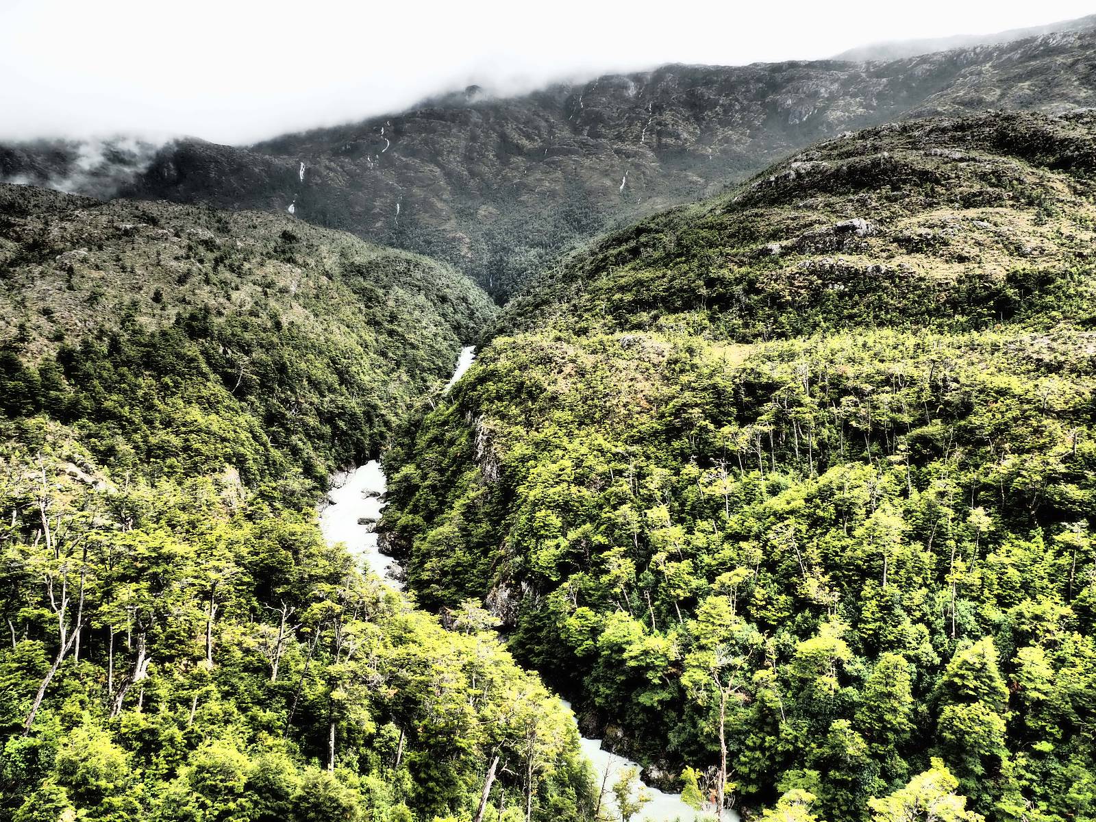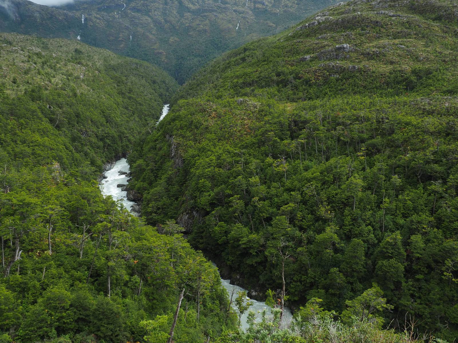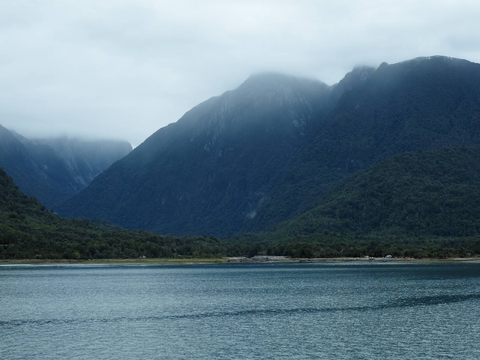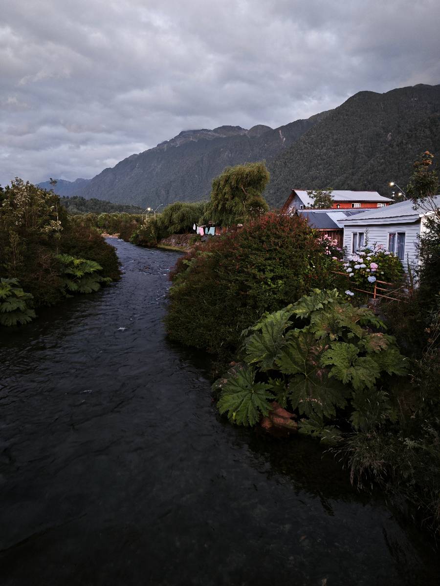 Bereits auf der langen Fahrt hatten sich Regen und Wind schon angekündigt und so erwartet mich die Carretera Austral mit Regen! Ich lege zumindest die Regenhose an und mache soweit alles dicht. Einen weiteren Wassereinbruch brauche ich nicht! Kaum wieder auf der Straße wird das so eine Art Wettrennen! Jeder fährt über die nasse Schotterstraße wie er kann. Die Straße mutet schwarz an und glänzt vor nässe und ist von einem Dschungel an Grün eingebettet. Das was ich hinter der Grenze nach Chile schon empfand, fühlt sich hier noch einmal viel dichter, grüner und undurchdringlicher an! Ich arbeite mich an den Langsamen und Mittelschnellen vorbei, die Kollegen aus der Slowakei sind nochmal viel schneller unterwegs, Paolo mit seinem unübersehbaren Pi auf dem Koffer will ins Zelt und sucht sich auf iOverlander einen Platz und ich will bis Chaitén. Der Dschungel ist irgendwie faszinierend und da ich keine Vorstellung von der Careterra Austral habe, hoffe ich, dass es nicht nur undurchdringlichen Dschungel, mit kaum Wegen abseits davon gibt.