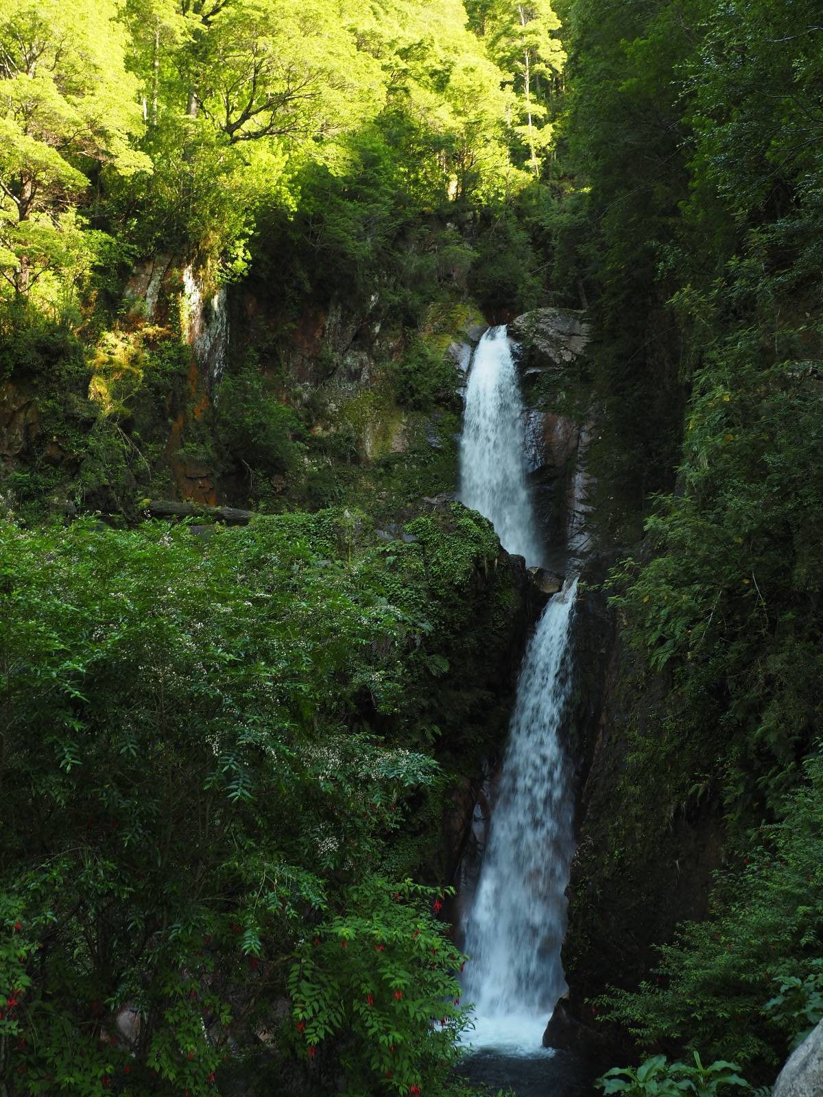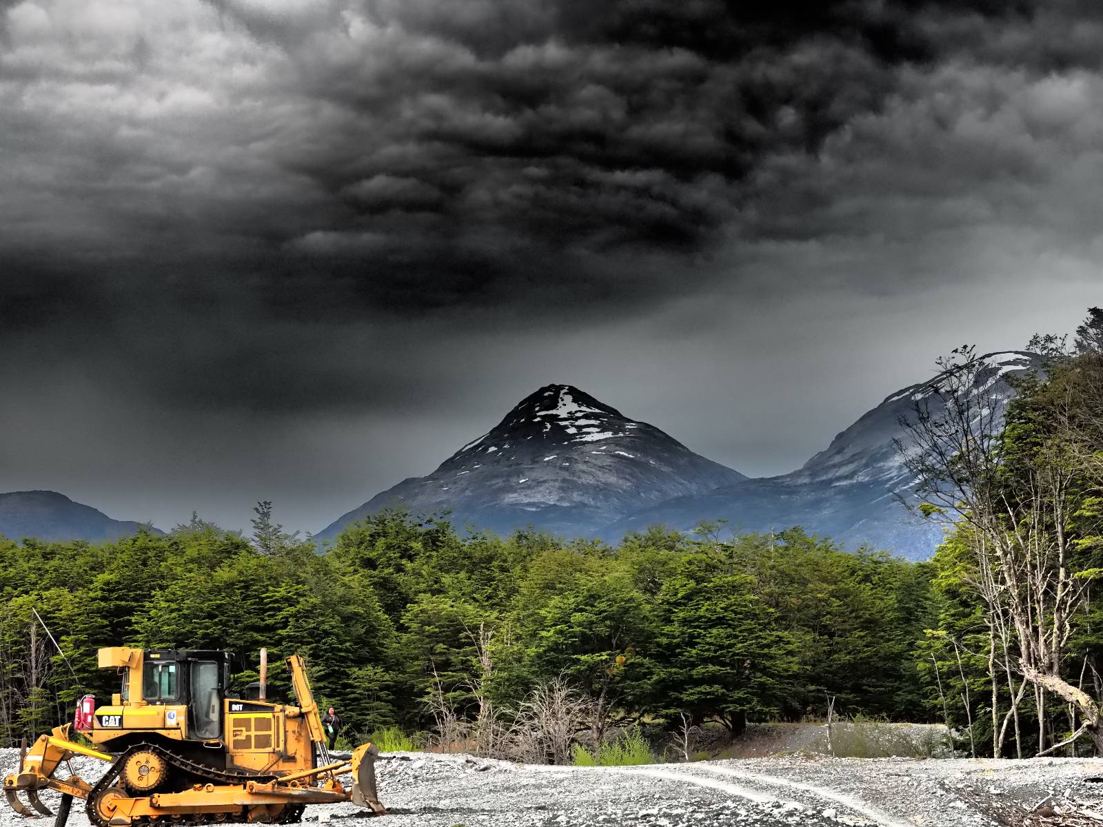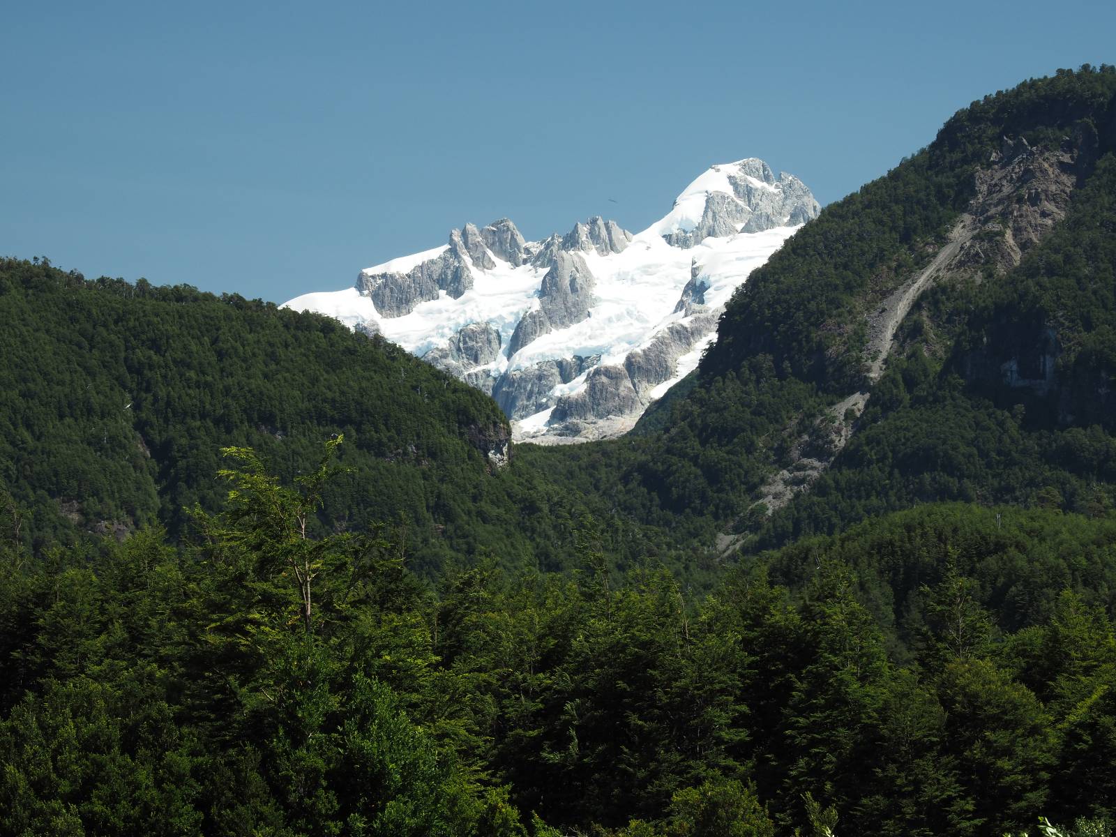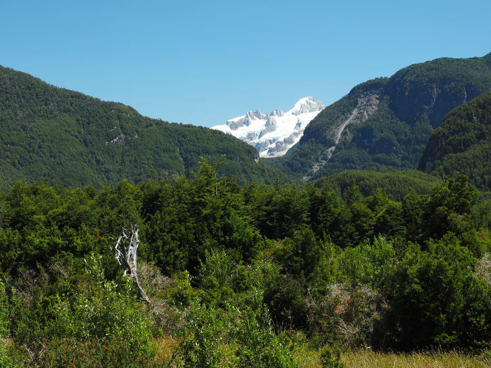 Bereits auf der langen Fahrt hatten sich Regen und Wind schon angekündigt und so erwartet mich die Carretera Austral mit Regen! Ich lege zumindest die Regenhose an und mache soweit alles dicht. Einen weiteren Wassereinbruch brauche ich nicht! Kaum wieder auf der Straße wird das so eine Art Wettrennen! Jeder fährt über die nasse Schotterstraße wie er kann. Die Straße mutet schwarz an und glänzt vor nässe und ist von einem Dschungel an Grün eingebettet. Das was ich hinter der Grenze nach Chile schon empfand, fühlt sich hier noch einmal viel dichter, grüner und undurchdringlicher an! Ich arbeite mich an den Langsamen und Mittelschnellen vorbei, die Kollegen aus der Slowakei sind nochmal viel schneller unterwegs, Paolo mit seinem unübersehbaren Pi auf dem Koffer will ins Zelt und sucht sich auf iOverlander einen Platz und ich will bis Chaitén. Der Dschungel ist irgendwie faszinierend und da ich keine Vorstellung von der Careterra Austral habe, hoffe ich, dass es nicht nur undurchdringlichen Dschungel, mit kaum Wegen abseits davon gibt.