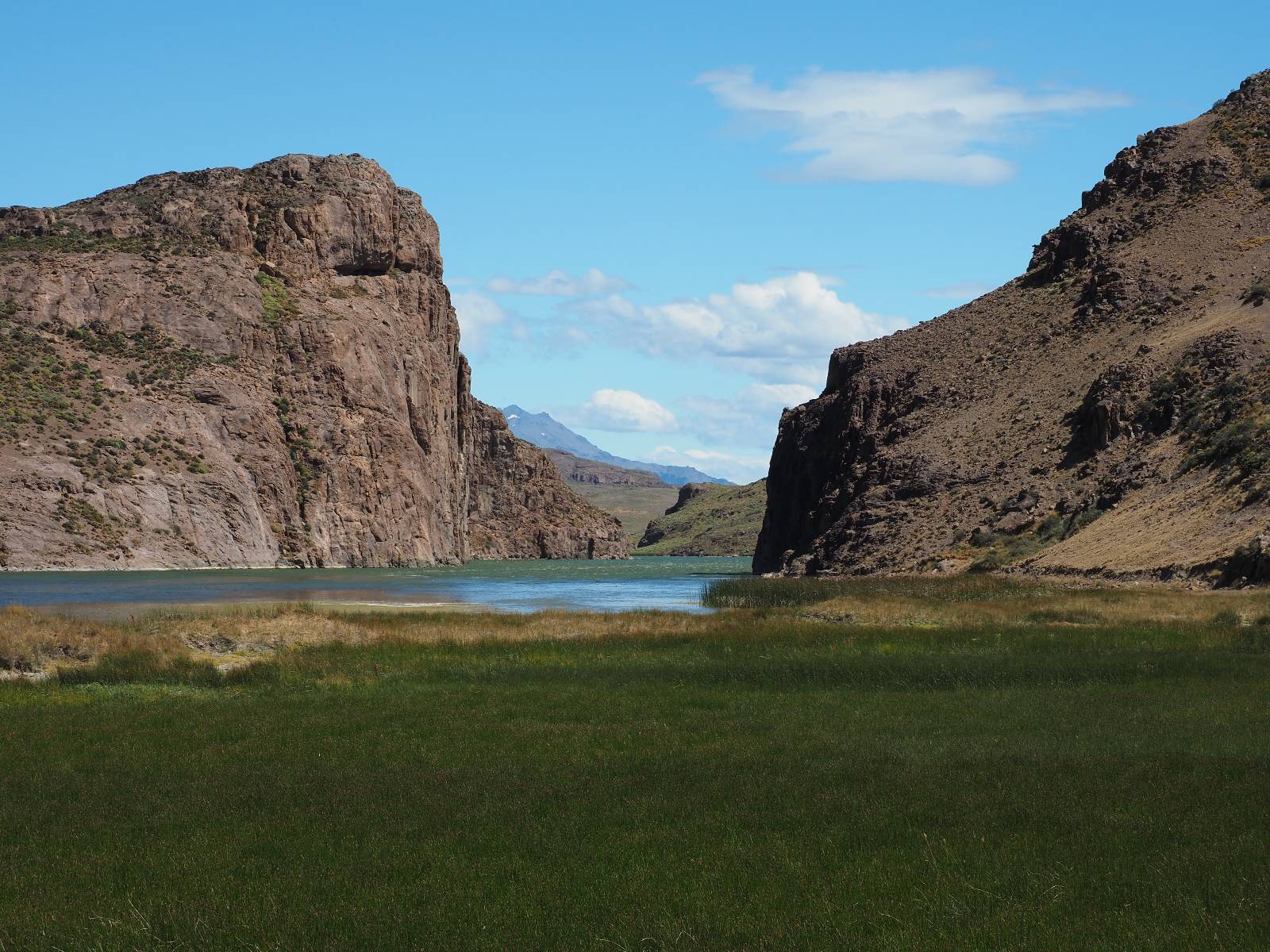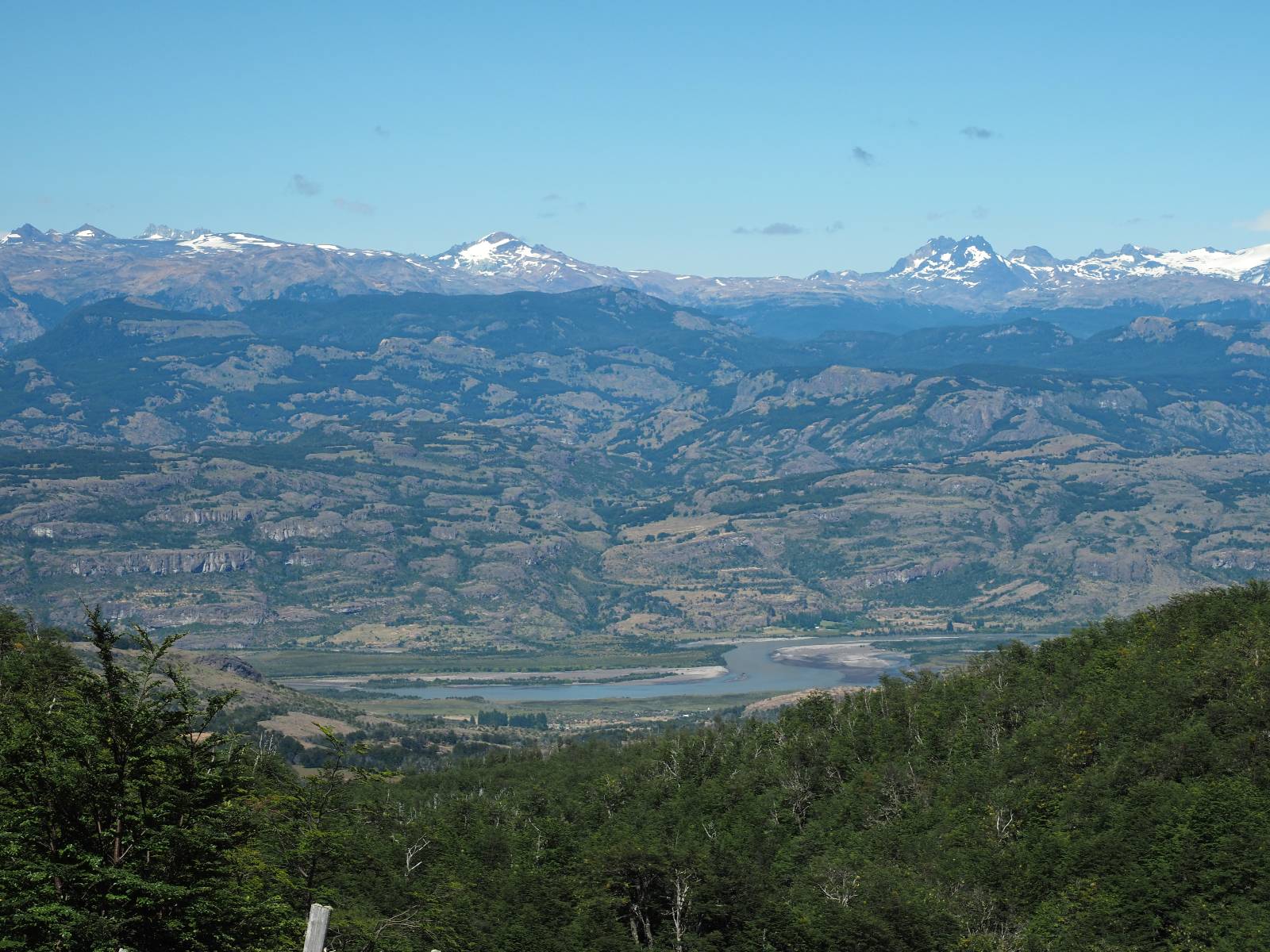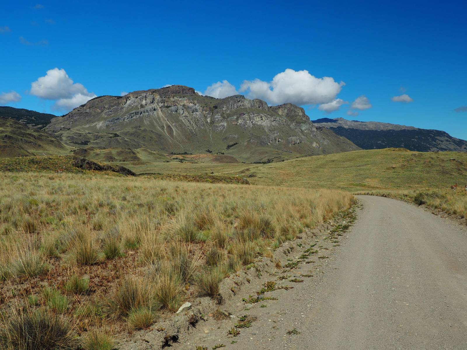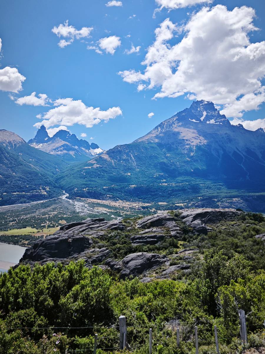 Aus Coyhaique raus ist die Landschaft recht sanft hügelig, ein paar leichte Kurven und schönes Wetter und es macht schon wieder Spaß! Bald geht es wieder in die Berge gehen, was meist mehr Kurven und noch schönere Bergansichten bedeutet! Mein Ziel ist Puerto Rio Tranqillo mit seinen Marmorhölen aber bis dahin ist es noch ein Stückchen! Nach dem Hügelland und den Bergen öffnet sich ein weites schönes Tal und ich nutze das nächste Dorf, um eine Futterpause zu machen mit herrlichem Blick auf den Cerro Castillo. Im selben Restaurant halten auch zwei Familien die ich vom sehen von der langen Fähre kenne. Aber auf der Carretera Austral trifft man sich wahrscheinlich immer mal wieder. Aus dem Dorf raus über eine kleine Brücke erspähe ich aus dem Auge heraus eine kleine Confluencia und drehe um, weil ich denke es könnte ein schönes Fotomotiv sein. Die kleine Schlucht bietet sich auch an, um die Drohne durchfliegen zu lassen. Aber was ist das denn nun wieder!? Sie ist mal wieder in Höhe und Weite eingeschrängt! Ich kenne das schon, da hilft wohl erst wieder ein Update! Zumindest habe ich noch nicht herausfinden können, wie ich das anschalten kann!? So bisschen kriege ich doch drauf, mache noch ein paar Fotos und fahre weiter. Aber nicht sehr weit! Ein großer Aussichtspunkt lockt, mit einem irre weiten Blick über das vor mir liegende Tal und rüber in die Crdillera Castillo! Zuerst treffe ich einen Mopedfahrer aus Columbien, mit dem ich etwas schwätze und als er abgefahren ist kommt Matthis aus Deutschland. Letztendlich haben wir beide das selbe Ziel fahren aber unseren eigenen Stiel. Der zwischenzeitliche Asphalt geht wieder in Schotter über und es Staubt ordentlich!!