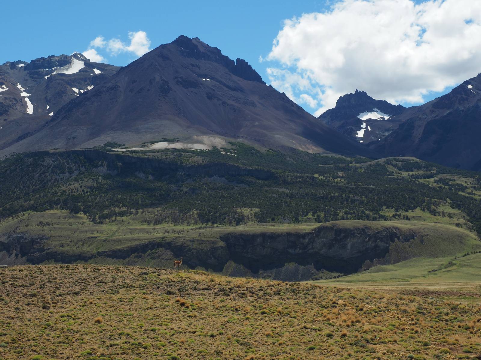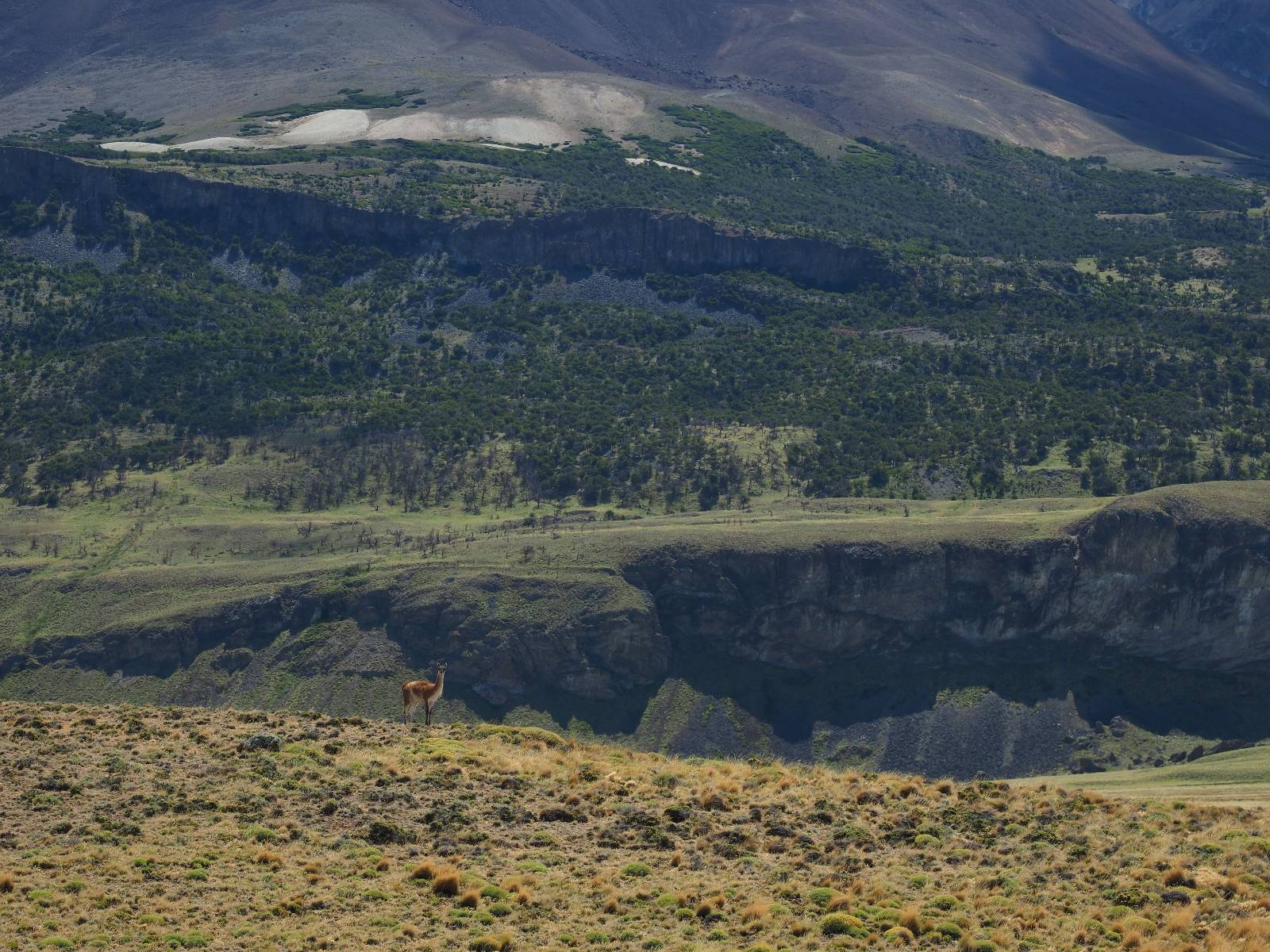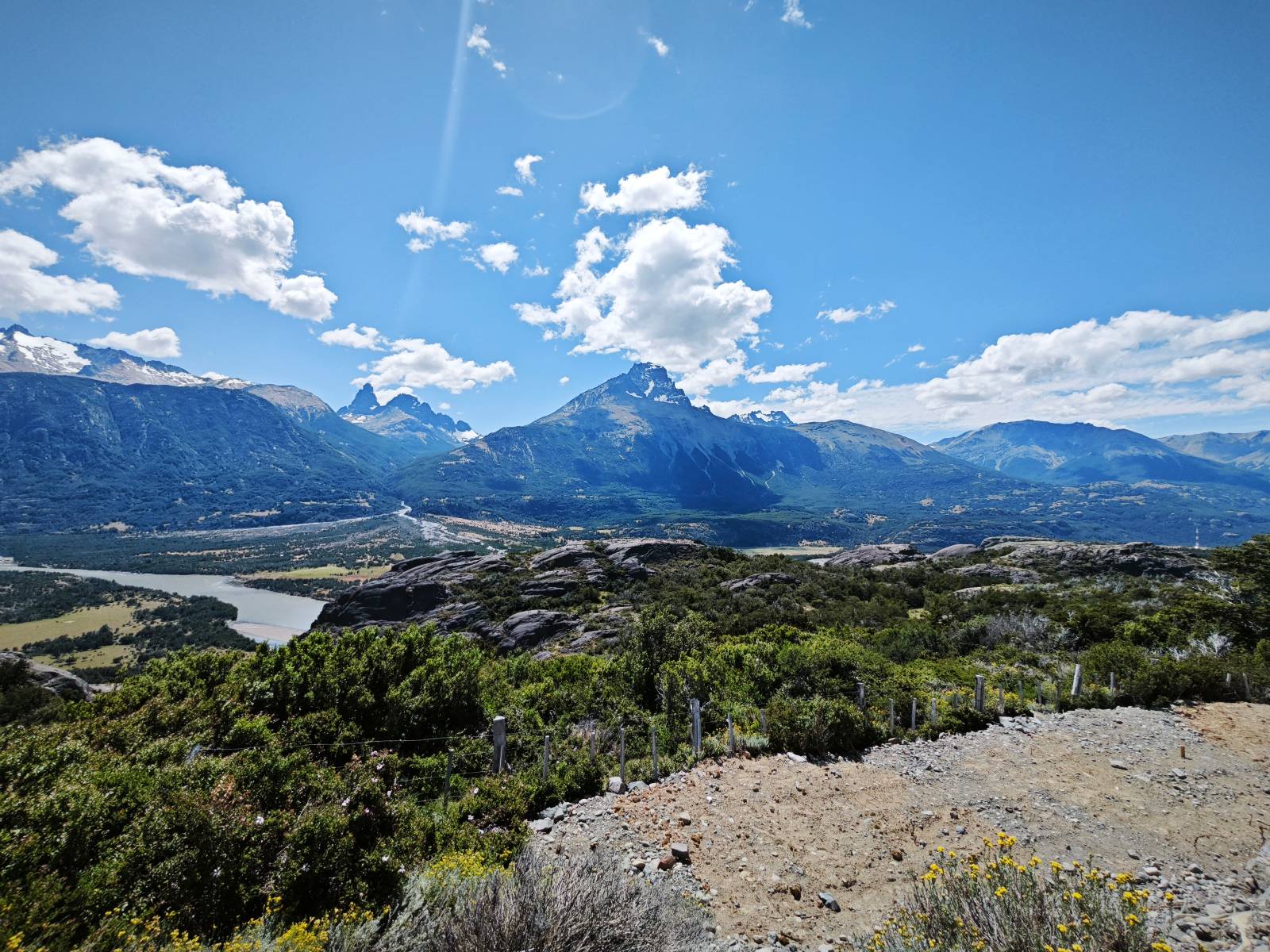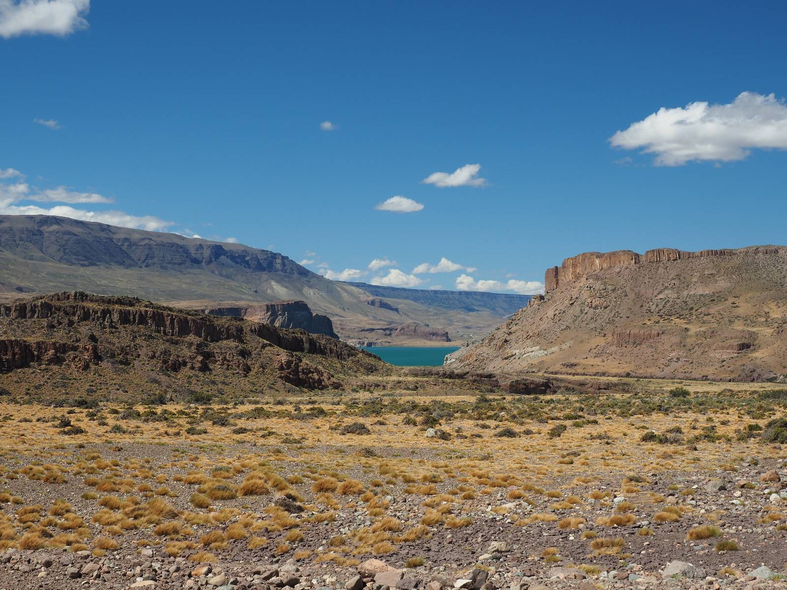 Aus Coyhaique raus ist die Landschaft recht sanft hügelig, ein paar leichte Kurven und schönes Wetter und es macht schon wieder Spaß! Bald geht es wieder in die Berge gehen, was meist mehr Kurven und noch schönere Bergansichten bedeutet! Mein Ziel ist Puerto Rio Tranqillo mit seinen Marmorhölen aber bis dahin ist es noch ein Stückchen! Nach dem Hügelland und den Bergen öffnet sich ein weites schönes Tal und ich nutze das nächste Dorf, um eine Futterpause zu machen mit herrlichem Blick auf den Cerro Castillo. Im selben Restaurant halten auch zwei Familien die ich vom sehen von der langen Fähre kenne. Aber auf der Carretera Austral trifft man sich wahrscheinlich immer mal wieder. Aus dem Dorf raus über eine kleine Brücke erspähe ich aus dem Auge heraus eine kleine Confluencia und drehe um, weil ich denke es könnte ein schönes Fotomotiv sein. Die kleine Schlucht bietet sich auch an, um die Drohne durchfliegen zu lassen. Aber was ist das denn nun wieder!? Sie ist mal wieder in Höhe und Weite eingeschrängt! Ich kenne das schon, da hilft wohl erst wieder ein Update! Zumindest habe ich noch nicht herausfinden können, wie ich das anschalten kann!? So bisschen kriege ich doch drauf, mache noch ein paar Fotos und fahre weiter. Aber nicht sehr weit! Ein großer Aussichtspunkt lockt, mit einem irre weiten Blick über das vor mir liegende Tal und rüber in die Crdillera Castillo! Zuerst treffe ich einen Mopedfahrer aus Columbien, mit dem ich etwas schwätze und als er abgefahren ist kommt Matthis aus Deutschland. Letztendlich haben wir beide das selbe Ziel fahren aber unseren eigenen Stiel. Der zwischenzeitliche Asphalt geht wieder in Schotter über und es Staubt ordentlich!!