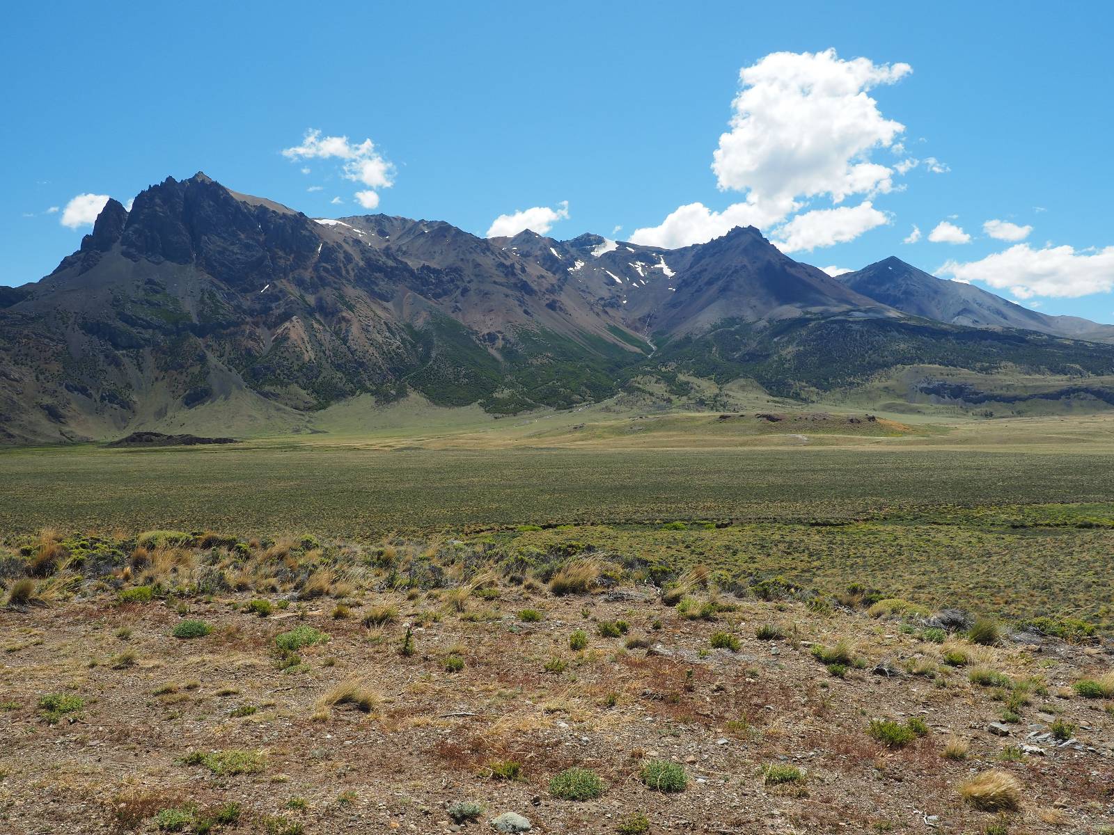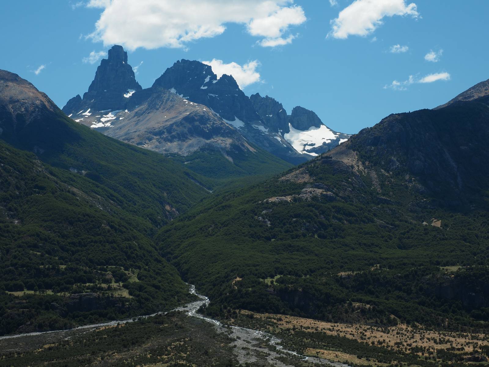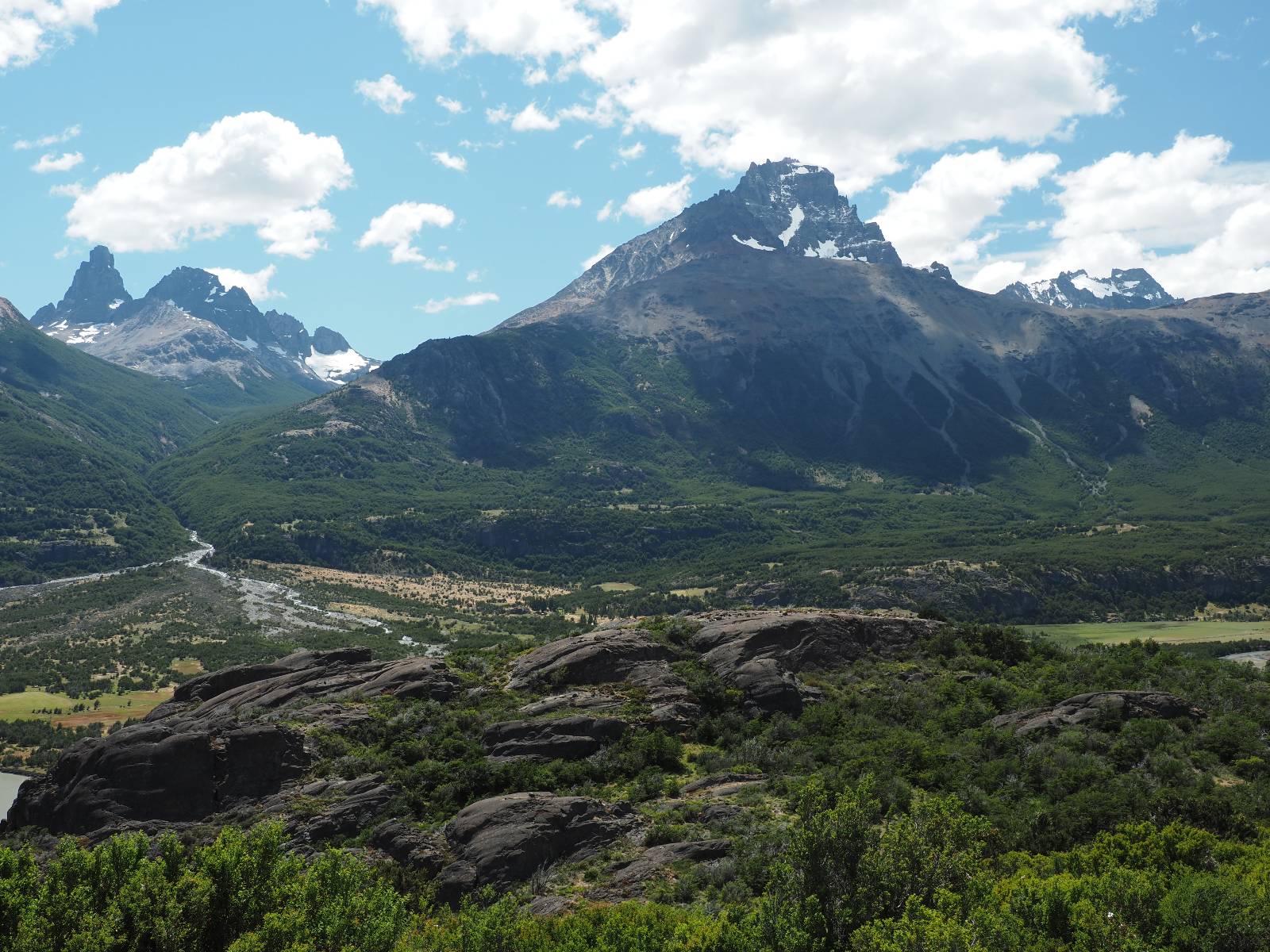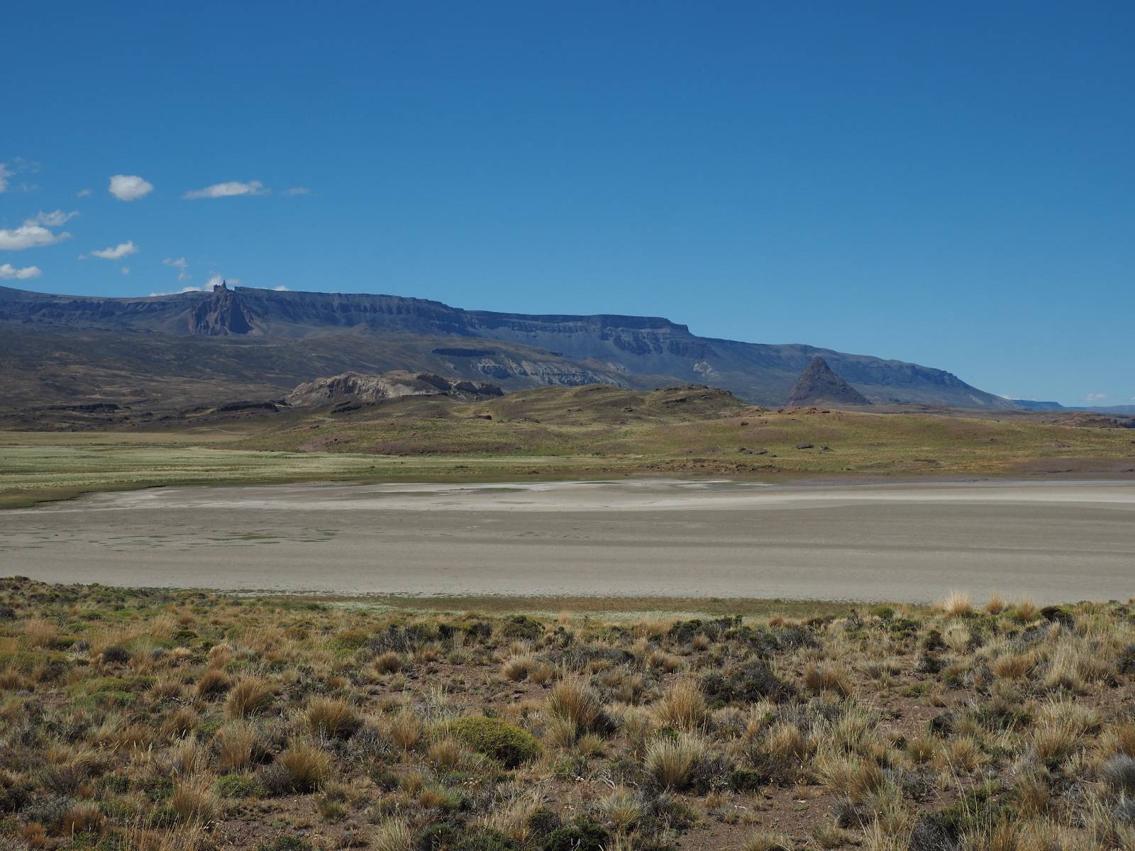 Aus Coyhaique raus ist die Landschaft recht sanft hügelig, ein paar leichte Kurven und schönes Wetter und es macht schon wieder Spaß! Bald geht es wieder in die Berge gehen, was meist mehr Kurven und noch schönere Bergansichten bedeutet! Mein Ziel ist Puerto Rio Tranqillo mit seinen Marmorhölen aber bis dahin ist es noch ein Stückchen! Nach dem Hügelland und den Bergen öffnet sich ein weites schönes Tal und ich nutze das nächste Dorf, um eine Futterpause zu machen mit herrlichem Blick auf den Cerro Castillo. Im selben Restaurant halten auch zwei Familien die ich vom sehen von der langen Fähre kenne. Aber auf der Carretera Austral trifft man sich wahrscheinlich immer mal wieder. Aus dem Dorf raus über eine kleine Brücke erspähe ich aus dem Auge heraus eine kleine Confluencia und drehe um, weil ich denke es könnte ein schönes Fotomotiv sein. Die kleine Schlucht bietet sich auch an, um die Drohne durchfliegen zu lassen. Aber was ist das denn nun wieder!? Sie ist mal wieder in Höhe und Weite eingeschrängt! Ich kenne das schon, da hilft wohl erst wieder ein Update! Zumindest habe ich noch nicht herausfinden können, wie ich das anschalten kann!? So bisschen kriege ich doch drauf, mache noch ein paar Fotos und fahre weiter. Aber nicht sehr weit! Ein großer Aussichtspunkt lockt, mit einem irre weiten Blick über das vor mir liegende Tal und rüber in die Crdillera Castillo! Zuerst treffe ich einen Mopedfahrer aus Columbien, mit dem ich etwas schwätze und als er abgefahren ist kommt Matthis aus Deutschland. Letztendlich haben wir beide das selbe Ziel fahren aber unseren eigenen Stiel. Der zwischenzeitliche Asphalt geht wieder in Schotter über und es Staubt ordentlich!!