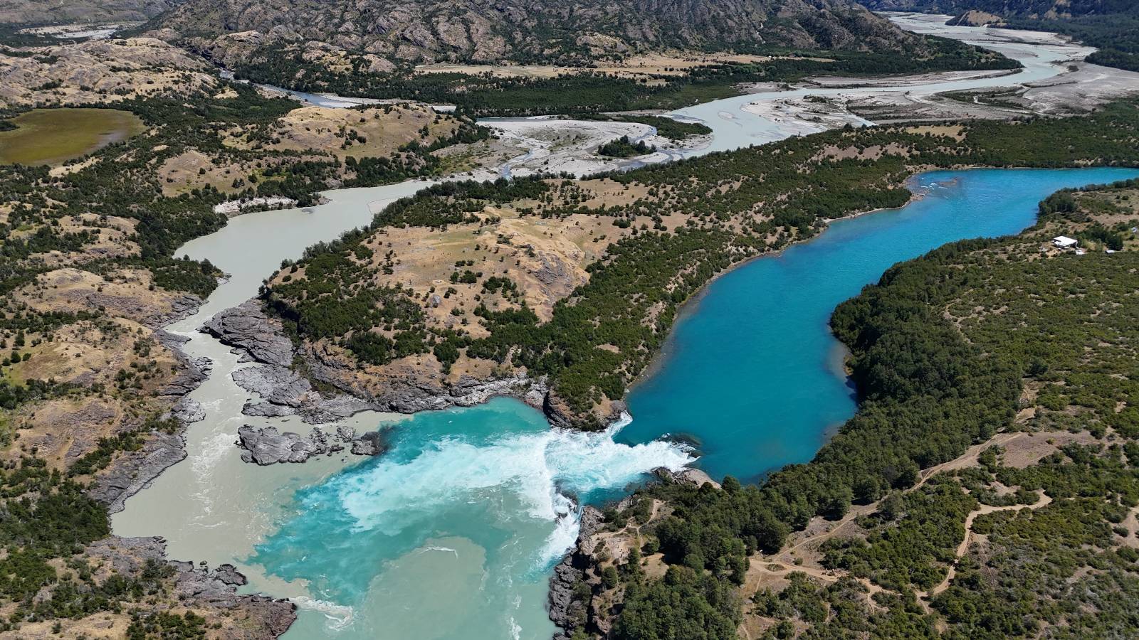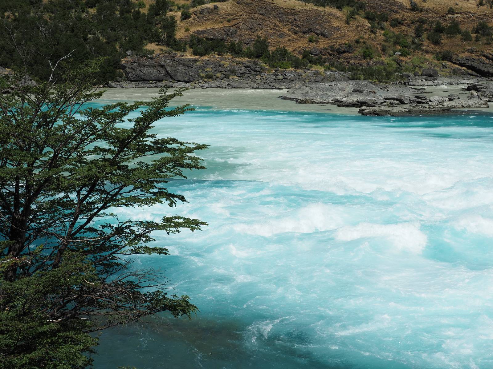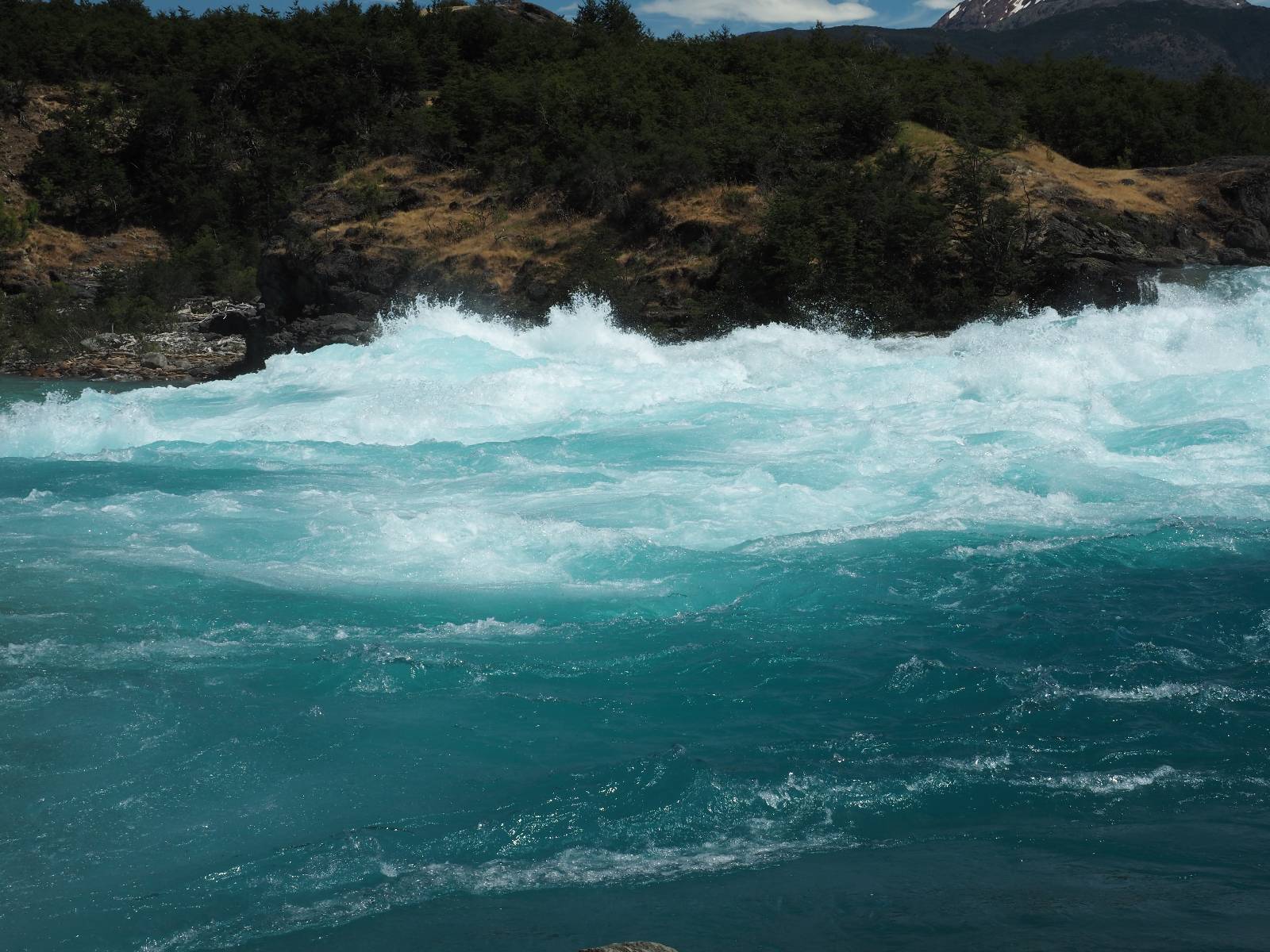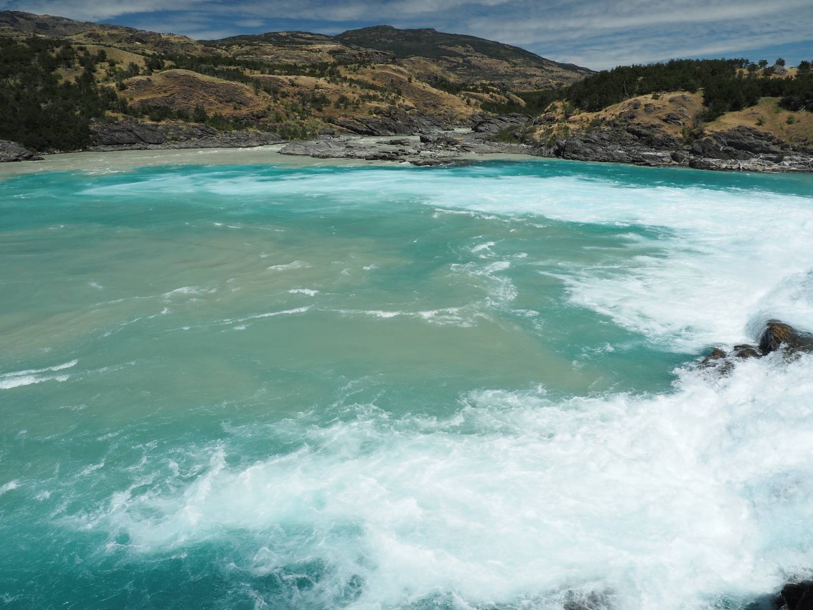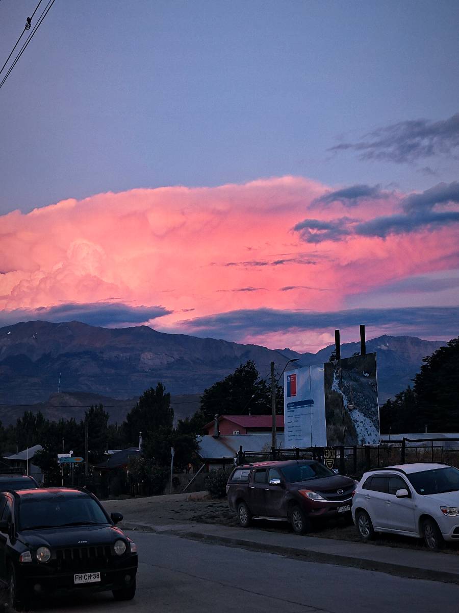 Schon bald fahre ich entlang des Rio Baker, der mit der selben blauen Farbe zu meiner Rechten dahinfließt. Ich zaudere anzuhalten oder nicht…, fahre aber durch, bis ich zum Parkplatz für die Confluencia von Rio Baker und Rio Neff komme. Ich muß ein Stückchen laufen aber es lohnt sich definitiv! Es ist eine wirklich große Stromschnelle, mit der sich der Rio Baker in den etwas schlammigeren Rio Neff ergießt aber gerade dieser Farbunterschied und die Wildheit des Flußßes macht das ganze Schauspiel unwahrscheinlich beeindruckend! Ich fotografiere wie wild, filme und lasse die Drohne fliegen und genieße natürlich auch so das Schauspiel. Die Sonne scheint und es ist ein herrlicher Tag, für den ich mal wieder sehr dankbar bin! An einer passenden Stelle etwas oberhalb erfrische ich mich im Rio Baker und trinke einen Schluck, auch auf die Gefahr hin Schlumpffarbe anzunehmen! Ein Ehepaar aus Argentinien fragt, wo ich her komme und so plauschen wir ein wenig und ich bekomme das Kompliment, das mein Spanisch sehr gut wäre. Hahaha! Ich nehme es gerne an als Motivation aber ich weiß, dass es nur sehr rudimenter taugt! Dafür kann der Herr tatsächlich ein paar Brocken Deutsch! Und so kann ich zurückloben. Der restliche Weg führt mich bis Cochrane, wiederum mit tollen Ausblicken und ein paar doofen Baustellen wo man schon mal 10-15min stehen muß. Das macht es nicht unbedingt gemütlich bei der Wärme und dem Staub, der von den Entgegenkommern aufgewirbelt wird. Vor mir steht ein Paar aus Argentinien mit ihrer R1000 und füllt Dichtmittel in den Hinterreifen und pump ihn noch weitestgehen auf. Ich frage, ob ich helfen kann aber sie wollen es so bis Cochrane schaffen. Ich bleibe eine Weile hinten dran, fallls es doch nötig wäre aber kurz vor Cochrane lasse ich sie ziehen und genieße noch einmal einen herrlichen Aussichtspunkt. Cochrane ist nicht wirklich spannend aber in guter Distanz als Zwischenstop mittendrin. Am ersten Hostal, wo ich anfrage ist alles belegt. lustigerweise sehe ich dort das Motorrad von Matthias stehen. Im Hostal schräg gegenüber werde ich fündig und quartiere mich ein.