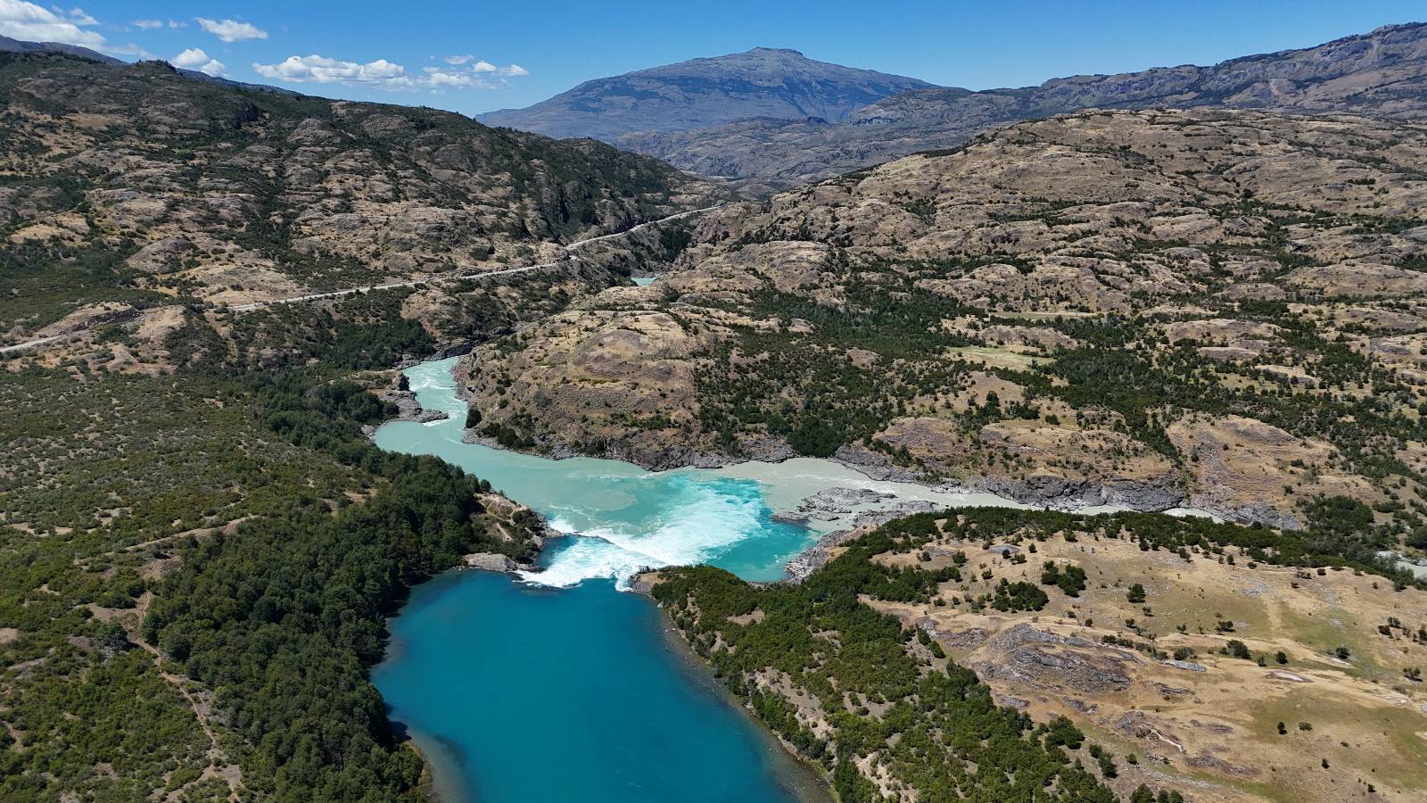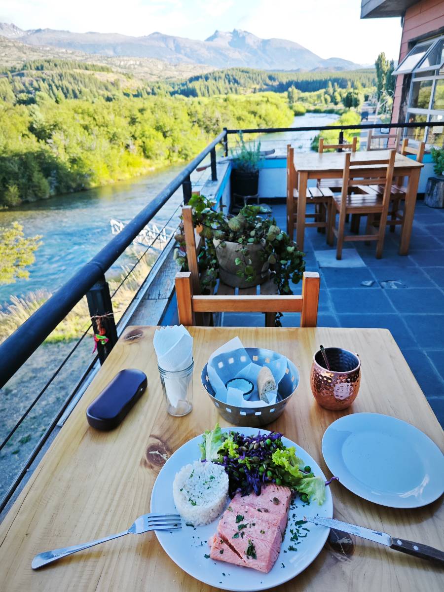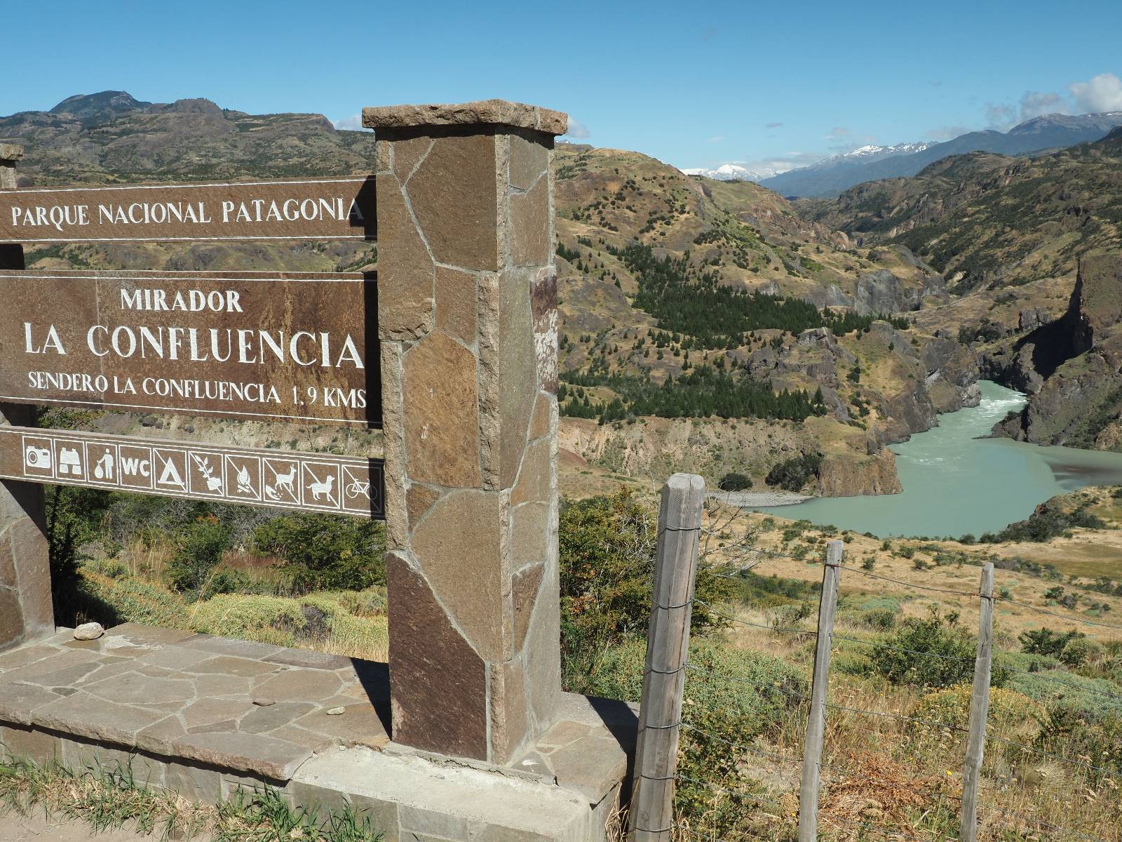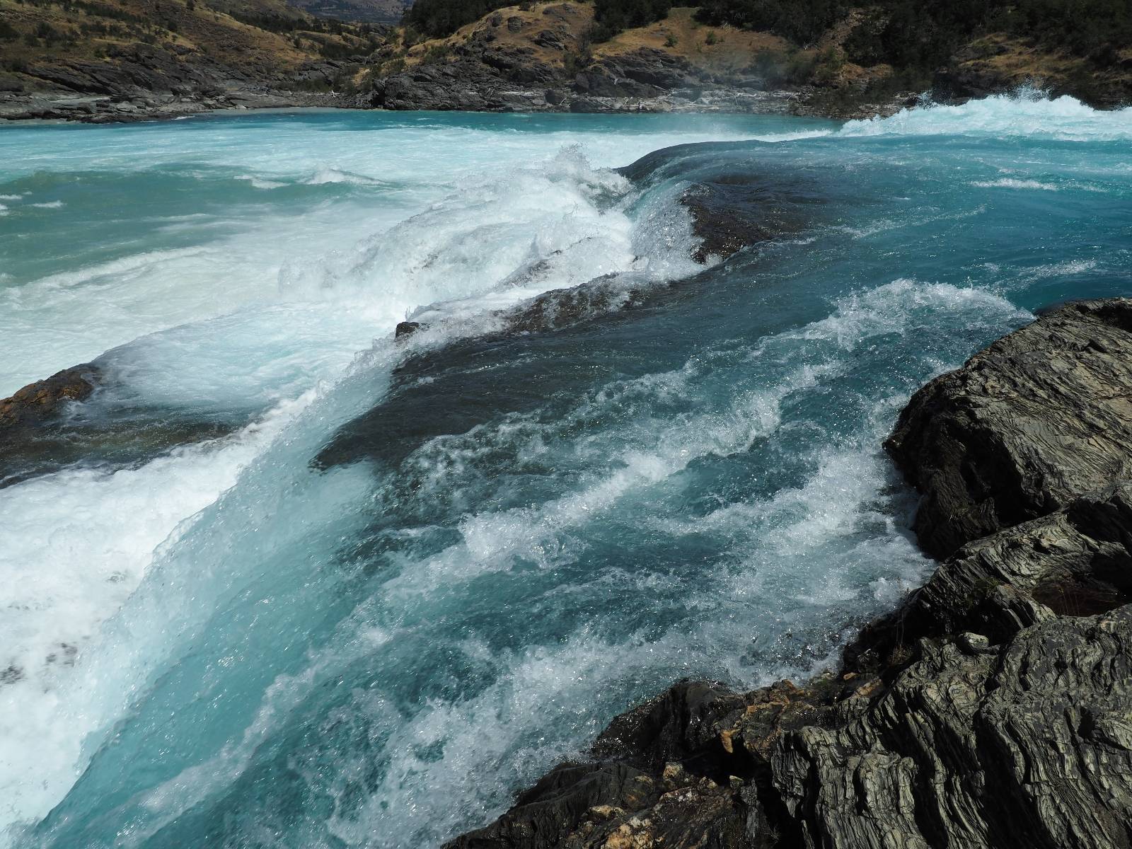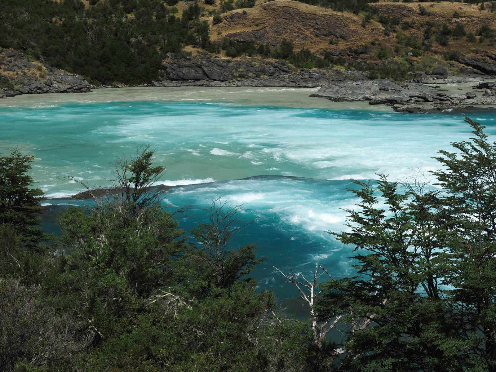 Schon bald fahre ich entlang des Rio Baker, der mit der selben blauen Farbe zu meiner Rechten dahinfließt. Ich zaudere anzuhalten oder nicht…, fahre aber durch, bis ich zum Parkplatz für die Confluencia von Rio Baker und Rio Neff komme. Ich muß ein Stückchen laufen aber es lohnt sich definitiv! Es ist eine wirklich große Stromschnelle, mit der sich der Rio Baker in den etwas schlammigeren Rio Neff ergießt aber gerade dieser Farbunterschied und die Wildheit des Flußßes macht das ganze Schauspiel unwahrscheinlich beeindruckend! Ich fotografiere wie wild, filme und lasse die Drohne fliegen und genieße natürlich auch so das Schauspiel. Die Sonne scheint und es ist ein herrlicher Tag, für den ich mal wieder sehr dankbar bin! An einer passenden Stelle etwas oberhalb erfrische ich mich im Rio Baker und trinke einen Schluck, auch auf die Gefahr hin Schlumpffarbe anzunehmen! Ein Ehepaar aus Argentinien fragt, wo ich her komme und so plauschen wir ein wenig und ich bekomme das Kompliment, das mein Spanisch sehr gut wäre. Hahaha! Ich nehme es gerne an als Motivation aber ich weiß, dass es nur sehr rudimenter taugt! Dafür kann der Herr tatsächlich ein paar Brocken Deutsch! Und so kann ich zurückloben. Der restliche Weg führt mich bis Cochrane, wiederum mit tollen Ausblicken und ein paar doofen Baustellen wo man schon mal 10-15min stehen muß. Das macht es nicht unbedingt gemütlich bei der Wärme und dem Staub, der von den Entgegenkommern aufgewirbelt wird. Vor mir steht ein Paar aus Argentinien mit ihrer R1000 und füllt Dichtmittel in den Hinterreifen und pump ihn noch weitestgehen auf. Ich frage, ob ich helfen kann aber sie wollen es so bis Cochrane schaffen. Ich bleibe eine Weile hinten dran, fallls es doch nötig wäre aber kurz vor Cochrane lasse ich sie ziehen und genieße noch einmal einen herrlichen Aussichtspunkt. Cochrane ist nicht wirklich spannend aber in guter Distanz als Zwischenstop mittendrin. Am ersten Hostal, wo ich anfrage ist alles belegt. lustigerweise sehe ich dort das Motorrad von Matthias stehen. Im Hostal schräg gegenüber werde ich fündig und quartiere mich ein.