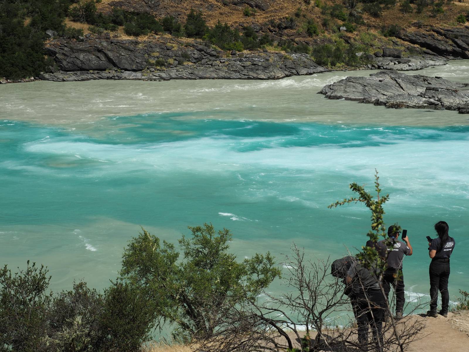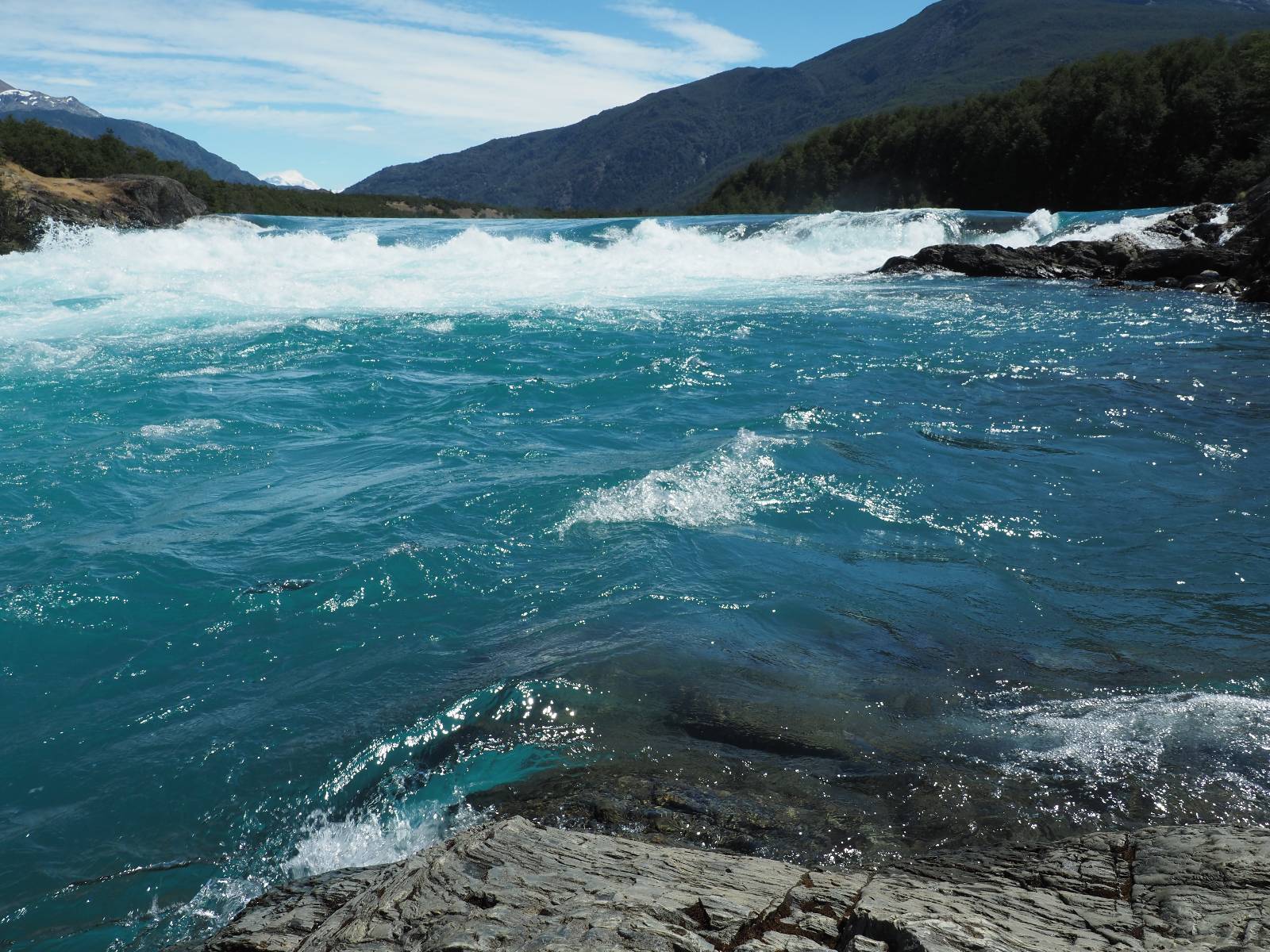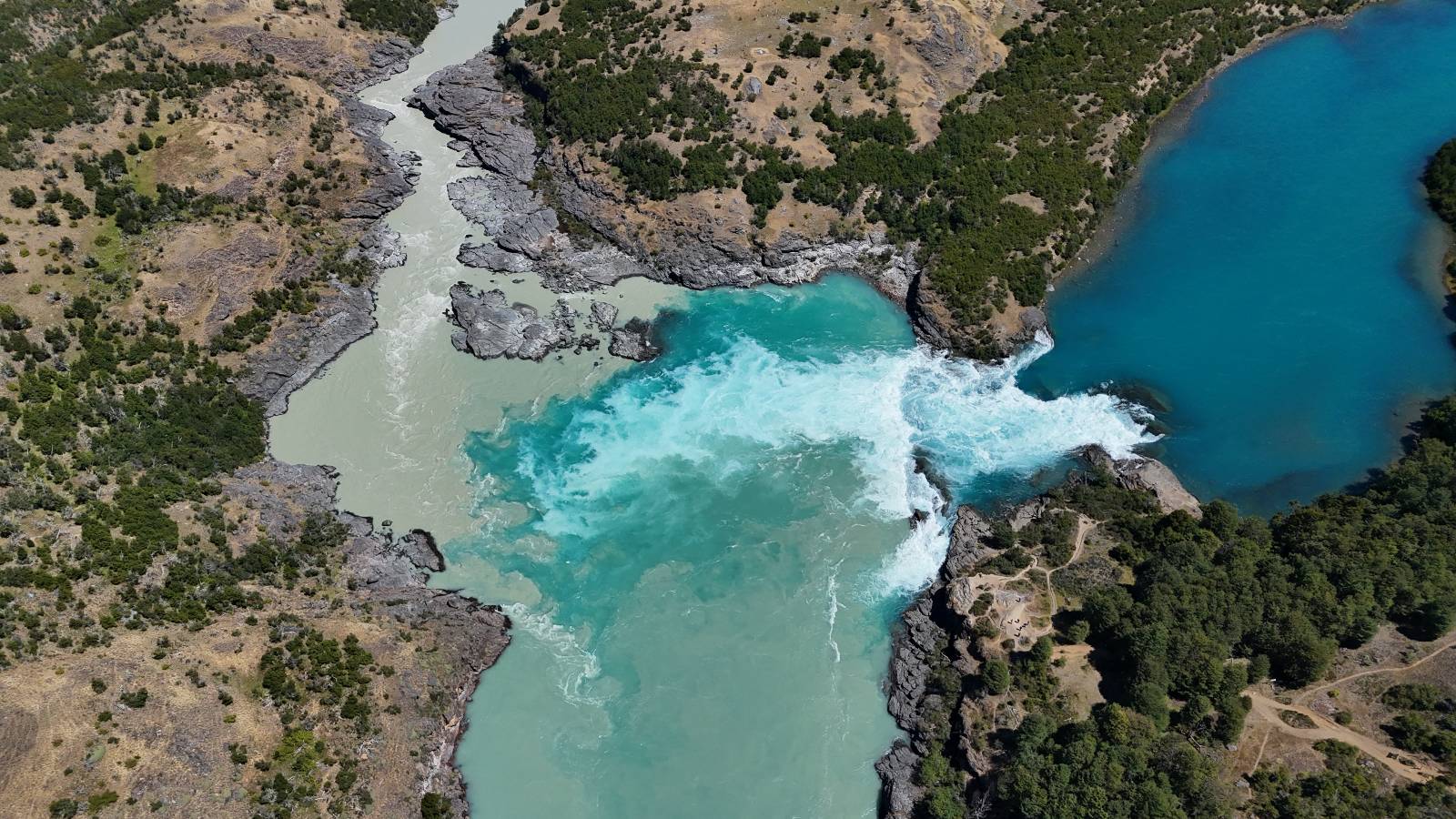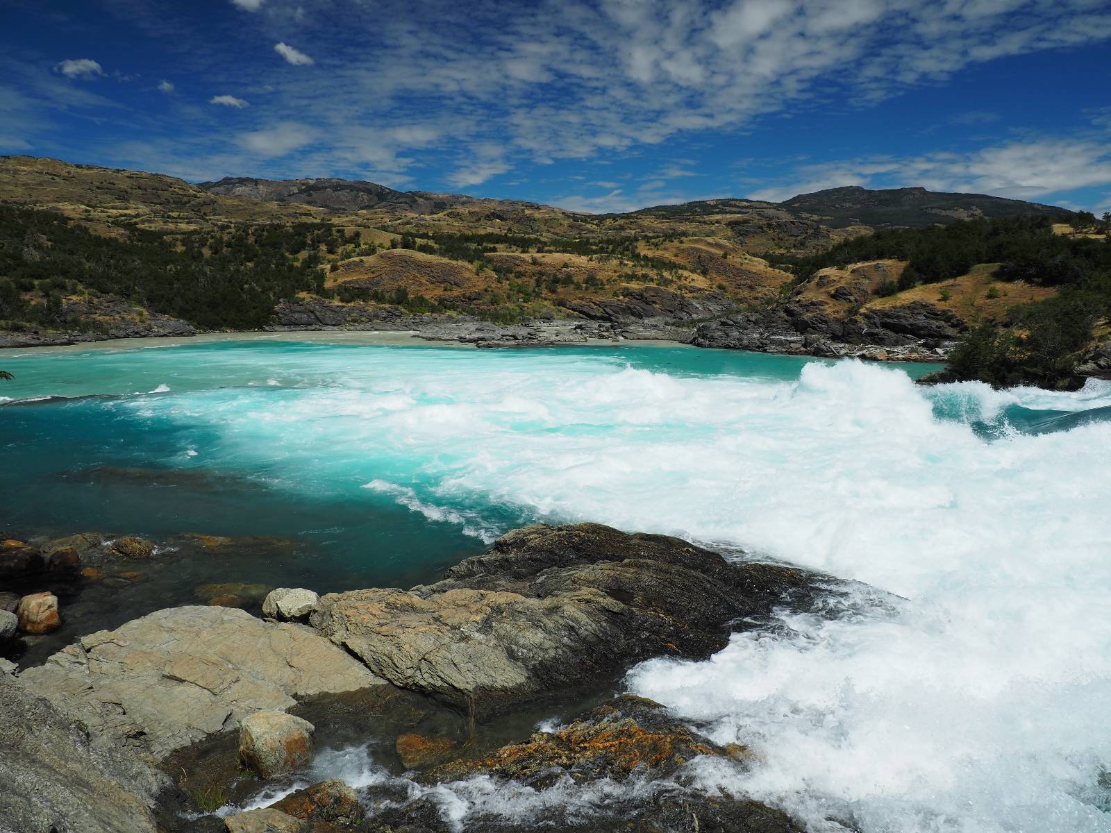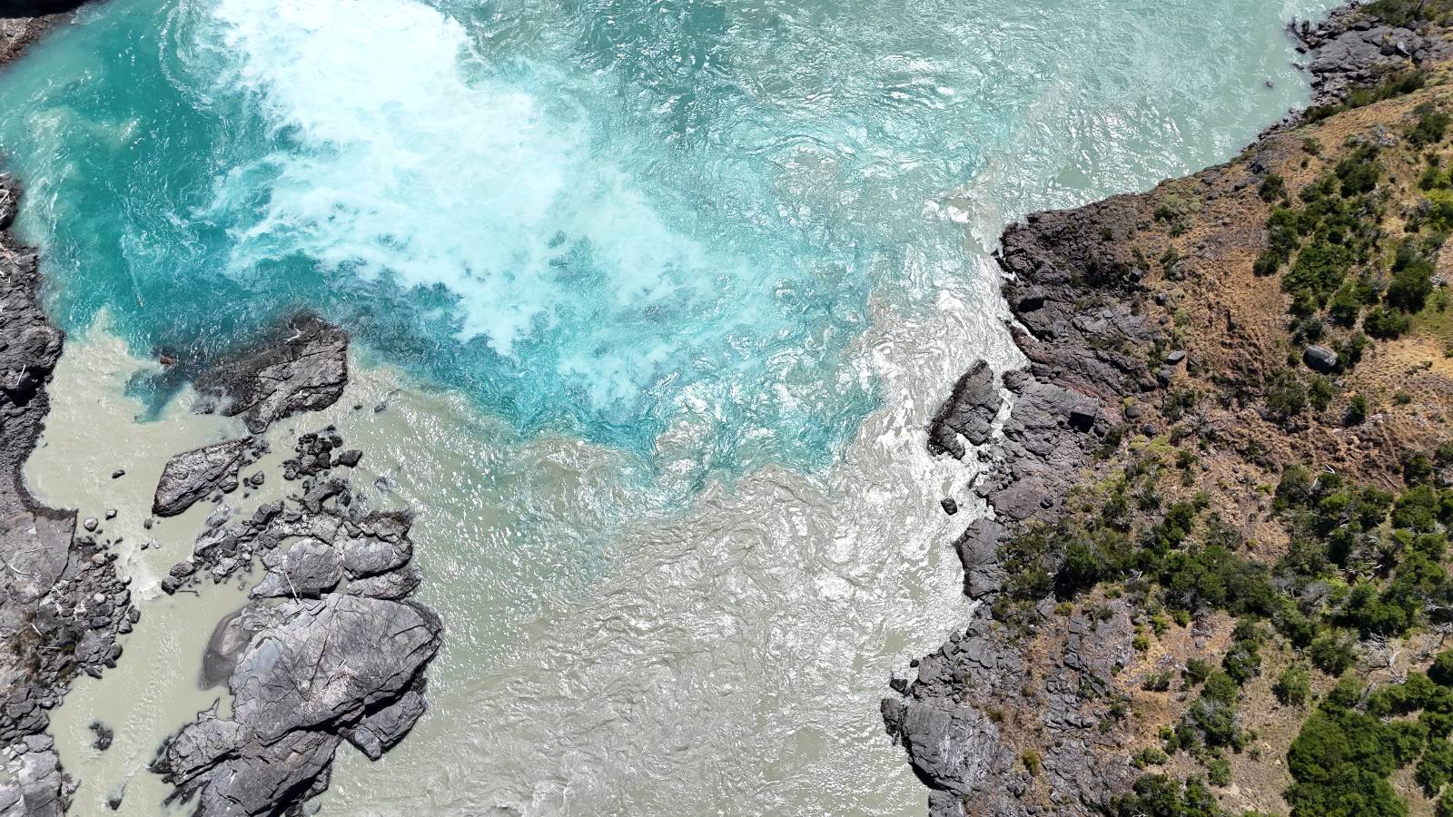 Schon bald fahre ich entlang des Rio Baker, der mit der selben blauen Farbe zu meiner Rechten dahinfließt. Ich zaudere anzuhalten oder nicht…, fahre aber durch, bis ich zum Parkplatz für die Confluencia von Rio Baker und Rio Neff komme. Ich muß ein Stückchen laufen aber es lohnt sich definitiv! Es ist eine wirklich große Stromschnelle, mit der sich der Rio Baker in den etwas schlammigeren Rio Neff ergießt aber gerade dieser Farbunterschied und die Wildheit des Flußßes macht das ganze Schauspiel unwahrscheinlich beeindruckend! Ich fotografiere wie wild, filme und lasse die Drohne fliegen und genieße natürlich auch so das Schauspiel. Die Sonne scheint und es ist ein herrlicher Tag, für den ich mal wieder sehr dankbar bin! An einer passenden Stelle etwas oberhalb erfrische ich mich im Rio Baker und trinke einen Schluck, auch auf die Gefahr hin Schlumpffarbe anzunehmen! Ein Ehepaar aus Argentinien fragt, wo ich her komme und so plauschen wir ein wenig und ich bekomme das Kompliment, das mein Spanisch sehr gut wäre. Hahaha! Ich nehme es gerne an als Motivation aber ich weiß, dass es nur sehr rudimenter taugt! Dafür kann der Herr tatsächlich ein paar Brocken Deutsch! Und so kann ich zurückloben. Der restliche Weg führt mich bis Cochrane, wiederum mit tollen Ausblicken und ein paar doofen Baustellen wo man schon mal 10-15min stehen muß. Das macht es nicht unbedingt gemütlich bei der Wärme und dem Staub, der von den Entgegenkommern aufgewirbelt wird. Vor mir steht ein Paar aus Argentinien mit ihrer R1000 und füllt Dichtmittel in den Hinterreifen und pump ihn noch weitestgehen auf. Ich frage, ob ich helfen kann aber sie wollen es so bis Cochrane schaffen. Ich bleibe eine Weile hinten dran, fallls es doch nötig wäre aber kurz vor Cochrane lasse ich sie ziehen und genieße noch einmal einen herrlichen Aussichtspunkt. Cochrane ist nicht wirklich spannend aber in guter Distanz als Zwischenstop mittendrin. Am ersten Hostal, wo ich anfrage ist alles belegt. lustigerweise sehe ich dort das Motorrad von Matthias stehen. Im Hostal schräg gegenüber werde ich fündig und quartiere mich ein.