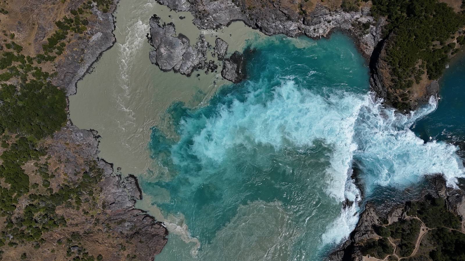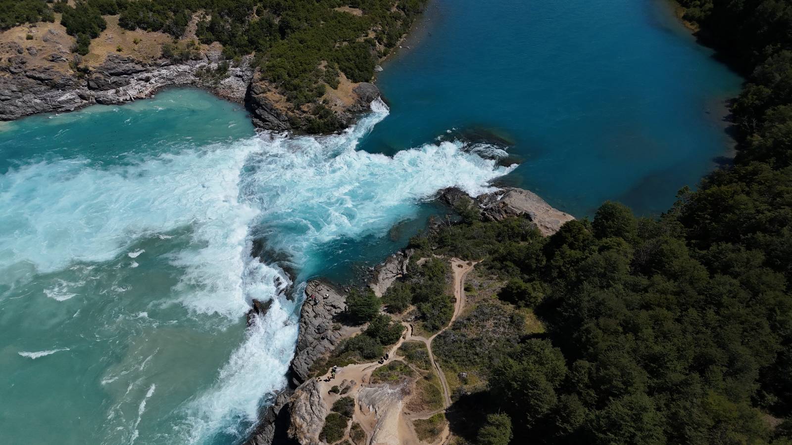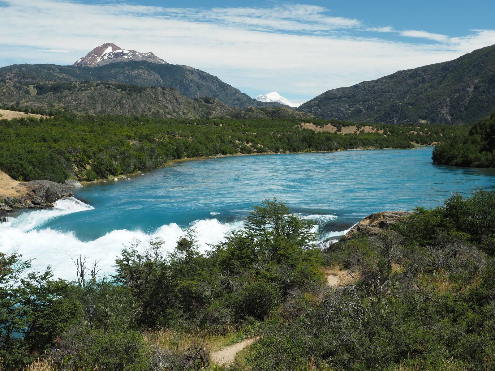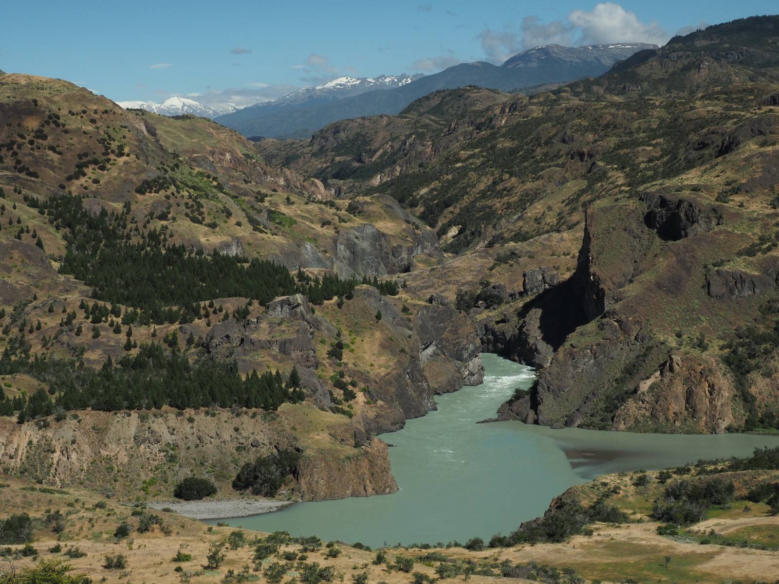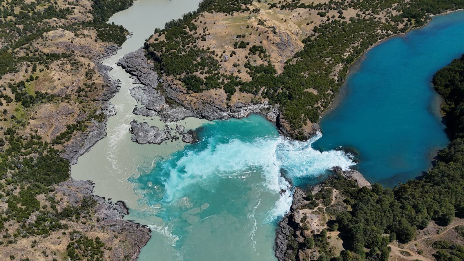 Schon bald fahre ich entlang des Rio Baker, der mit der selben blauen Farbe zu meiner Rechten dahinfließt. Ich zaudere anzuhalten oder nicht…, fahre aber durch, bis ich zum Parkplatz für die Confluencia von Rio Baker und Rio Neff komme. Ich muß ein Stückchen laufen aber es lohnt sich definitiv! Es ist eine wirklich große Stromschnelle, mit der sich der Rio Baker in den etwas schlammigeren Rio Neff ergießt aber gerade dieser Farbunterschied und die Wildheit des Flußßes macht das ganze Schauspiel unwahrscheinlich beeindruckend! Ich fotografiere wie wild, filme und lasse die Drohne fliegen und genieße natürlich auch so das Schauspiel. Die Sonne scheint und es ist ein herrlicher Tag, für den ich mal wieder sehr dankbar bin! An einer passenden Stelle etwas oberhalb erfrische ich mich im Rio Baker und trinke einen Schluck, auch auf die Gefahr hin Schlumpffarbe anzunehmen! Ein Ehepaar aus Argentinien fragt, wo ich her komme und so plauschen wir ein wenig und ich bekomme das Kompliment, das mein Spanisch sehr gut wäre. Hahaha! Ich nehme es gerne an als Motivation aber ich weiß, dass es nur sehr rudimenter taugt! Dafür kann der Herr tatsächlich ein paar Brocken Deutsch! Und so kann ich zurückloben. Der restliche Weg führt mich bis Cochrane, wiederum mit tollen Ausblicken und ein paar doofen Baustellen wo man schon mal 10-15min stehen muß. Das macht es nicht unbedingt gemütlich bei der Wärme und dem Staub, der von den Entgegenkommern aufgewirbelt wird. Vor mir steht ein Paar aus Argentinien mit ihrer R1000 und füllt Dichtmittel in den Hinterreifen und pump ihn noch weitestgehen auf. Ich frage, ob ich helfen kann aber sie wollen es so bis Cochrane schaffen. Ich bleibe eine Weile hinten dran, fallls es doch nötig wäre aber kurz vor Cochrane lasse ich sie ziehen und genieße noch einmal einen herrlichen Aussichtspunkt. Cochrane ist nicht wirklich spannend aber in guter Distanz als Zwischenstop mittendrin. Am ersten Hostal, wo ich anfrage ist alles belegt. lustigerweise sehe ich dort das Motorrad von Matthias stehen. Im Hostal schräg gegenüber werde ich fündig und quartiere mich ein.